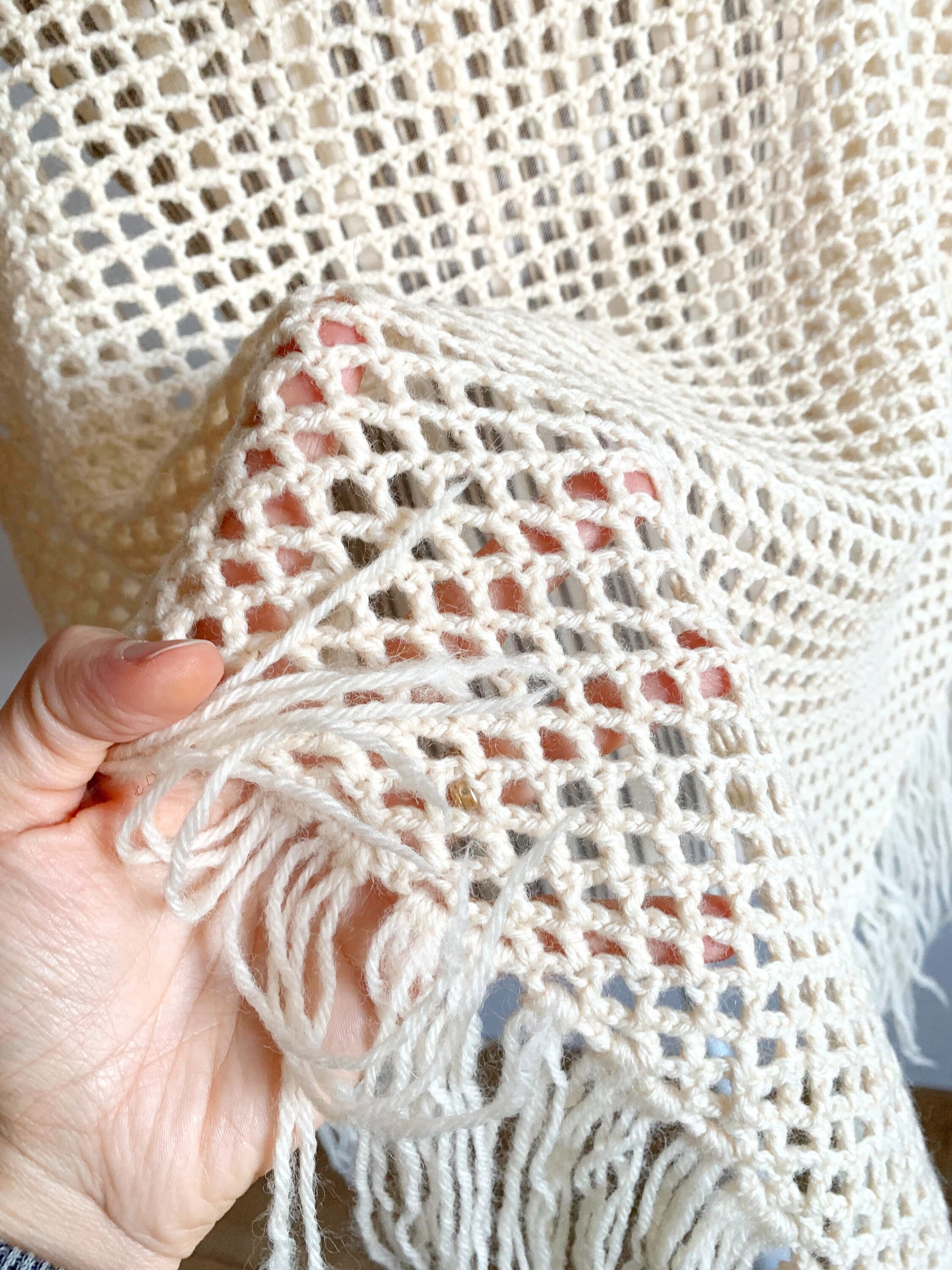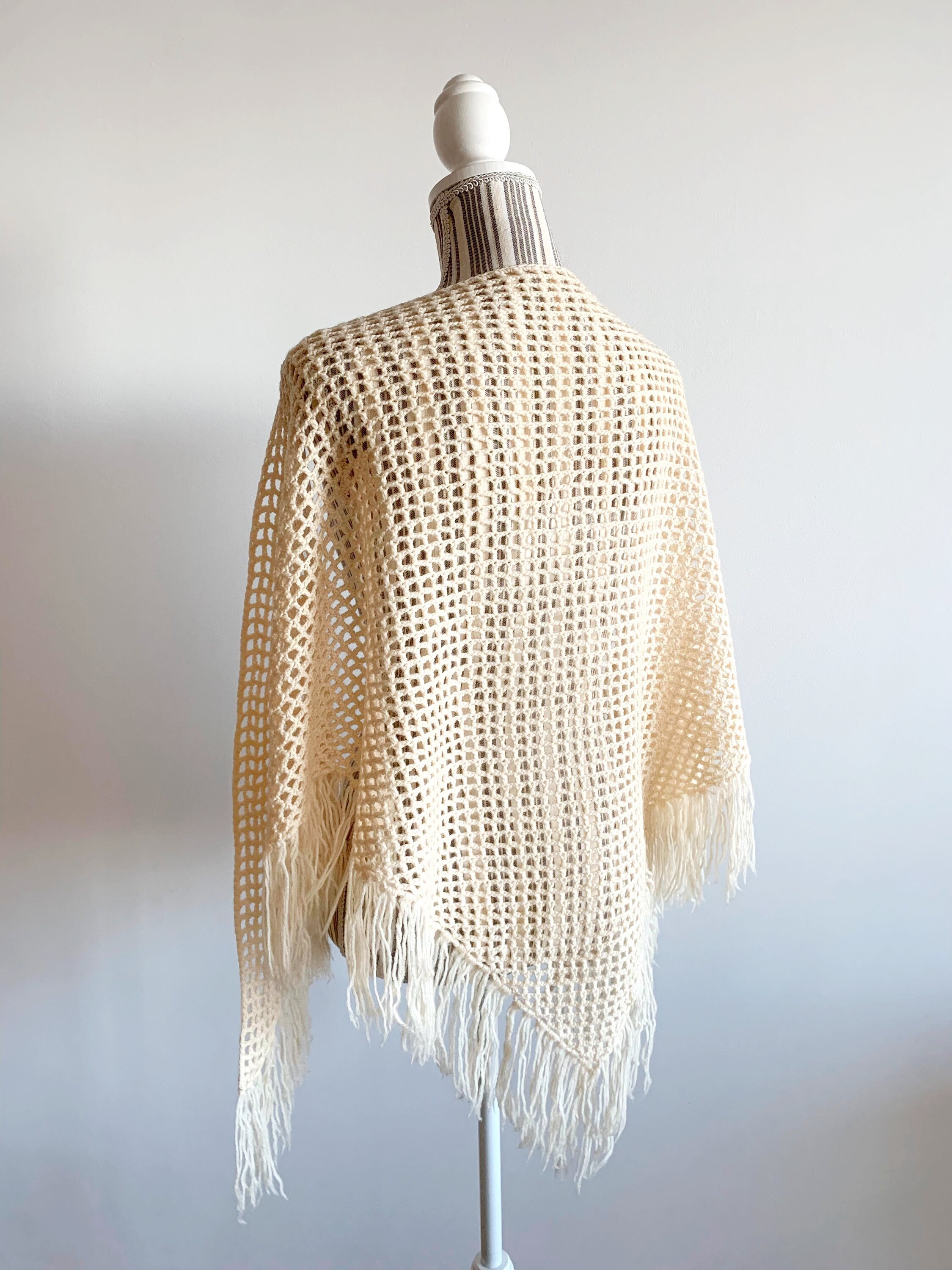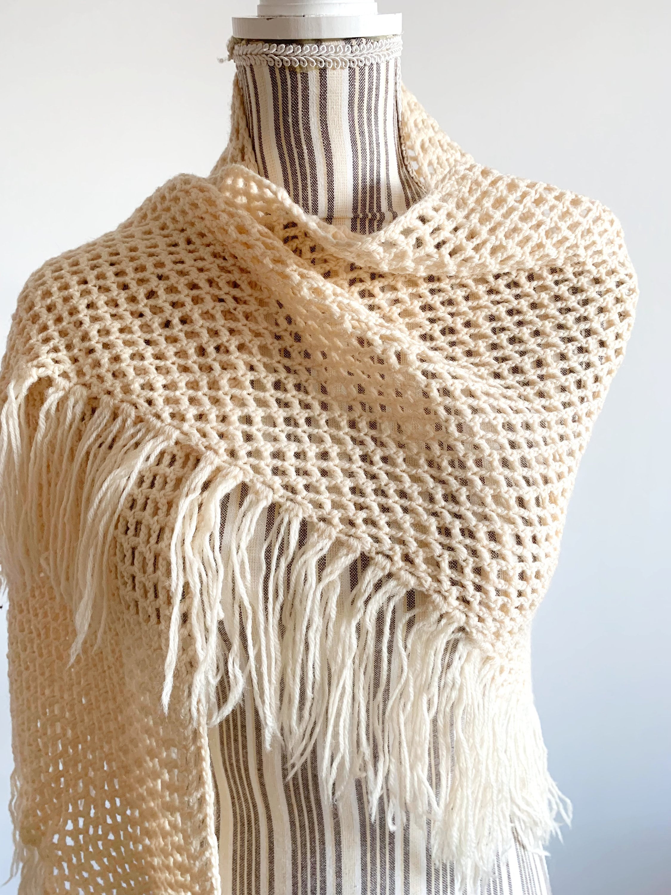 This is a vintage ecru bohemian lace shawl with fishnet pattern and lovely tassels. It is in cream off white color. This see through scarf has a triangular shape with basic net crochet pattern and delicate fringe at the ends. It is very delicate and super basic, so you can wear it with shirts and jeans, boho dresses and tunics. You can wear this triangle piano shawl in so many different ways - wear it as a long neck scarf, as a shoulder shawl, or wrap it around as a shrug. Perfect to wear over a dress, a solid color blouse or turtleneck. This cream beige lace shawl will add a pop a style to your outfit.