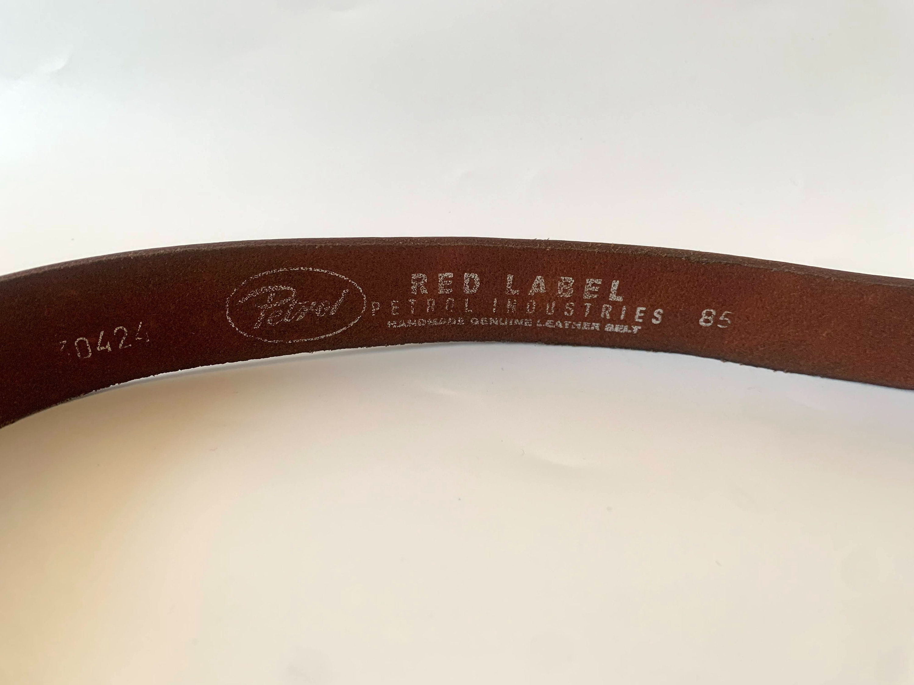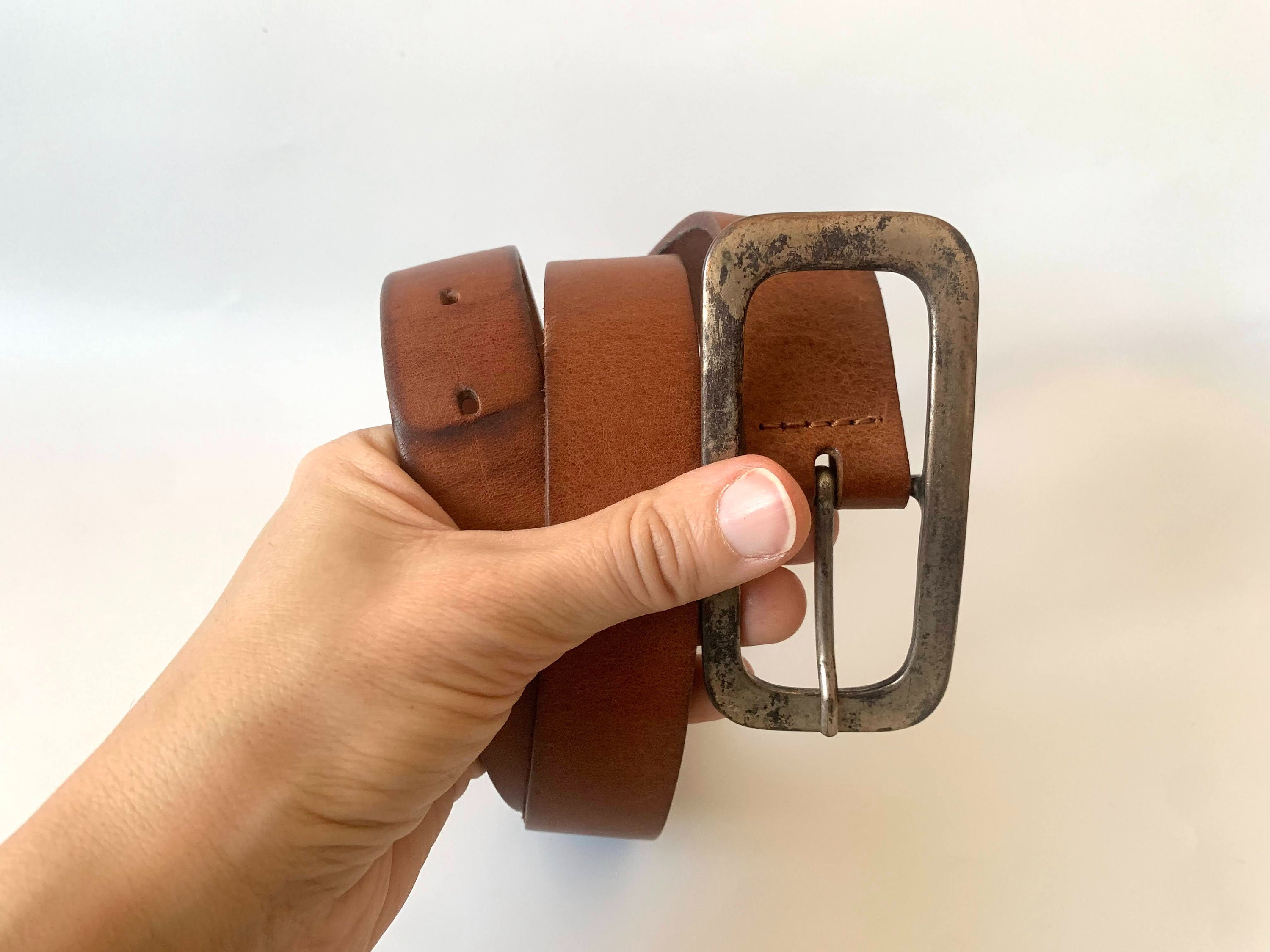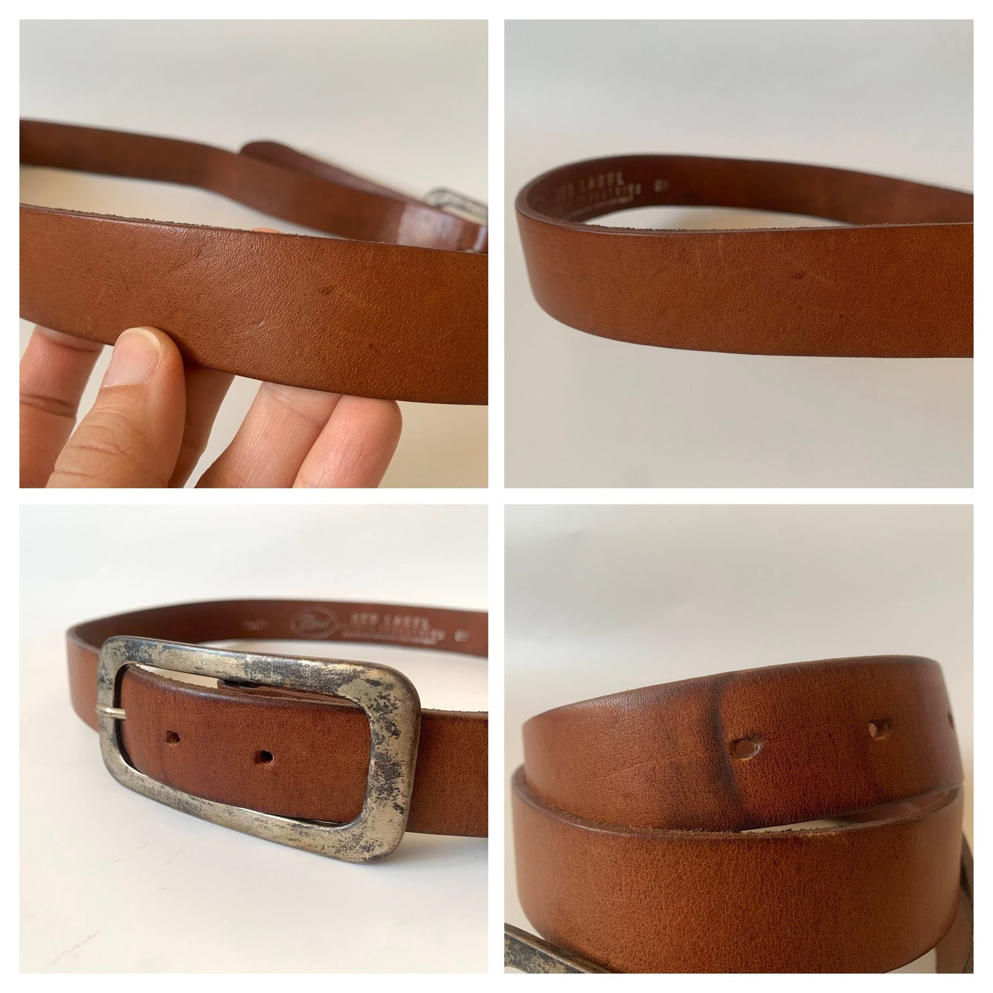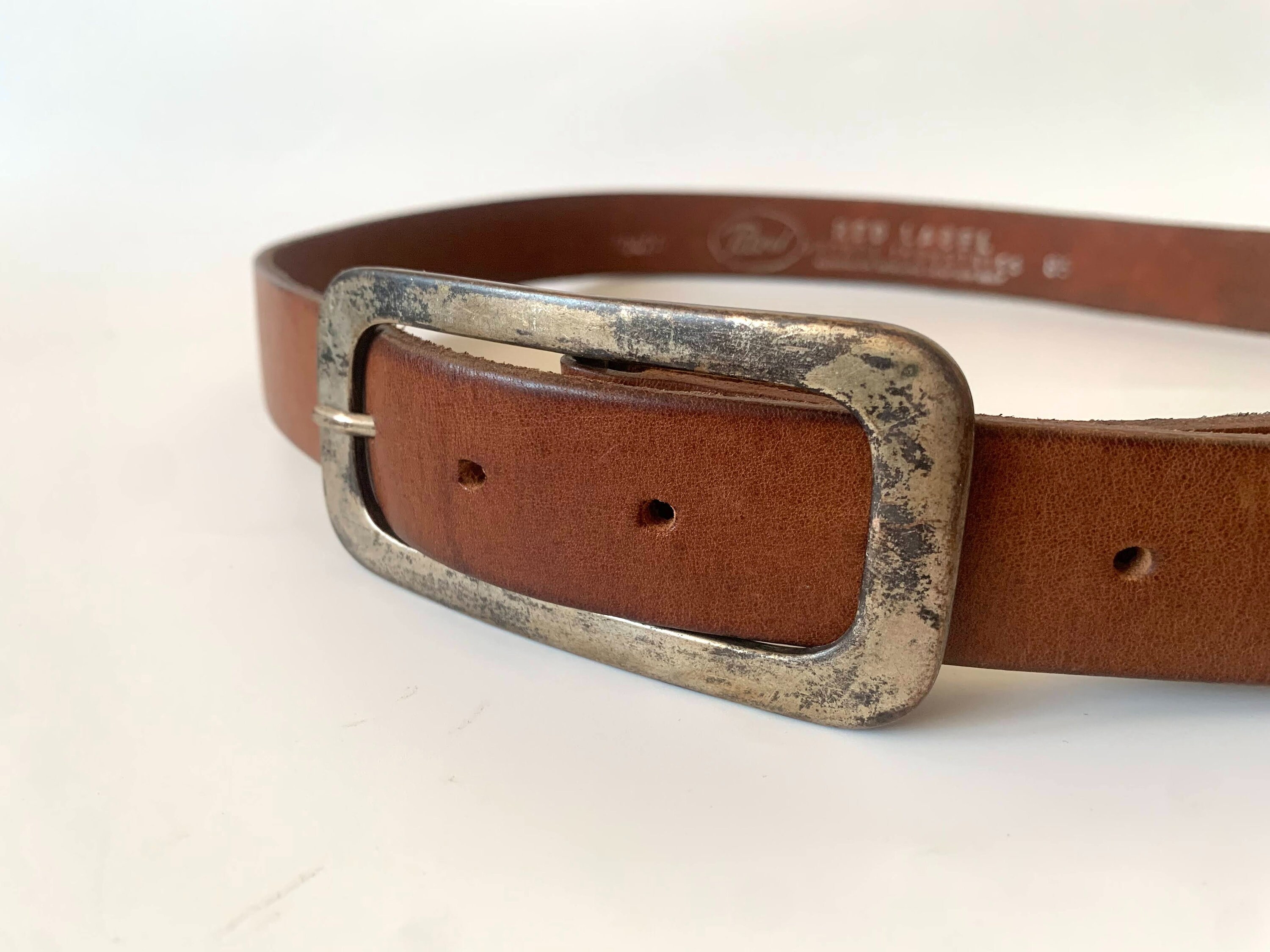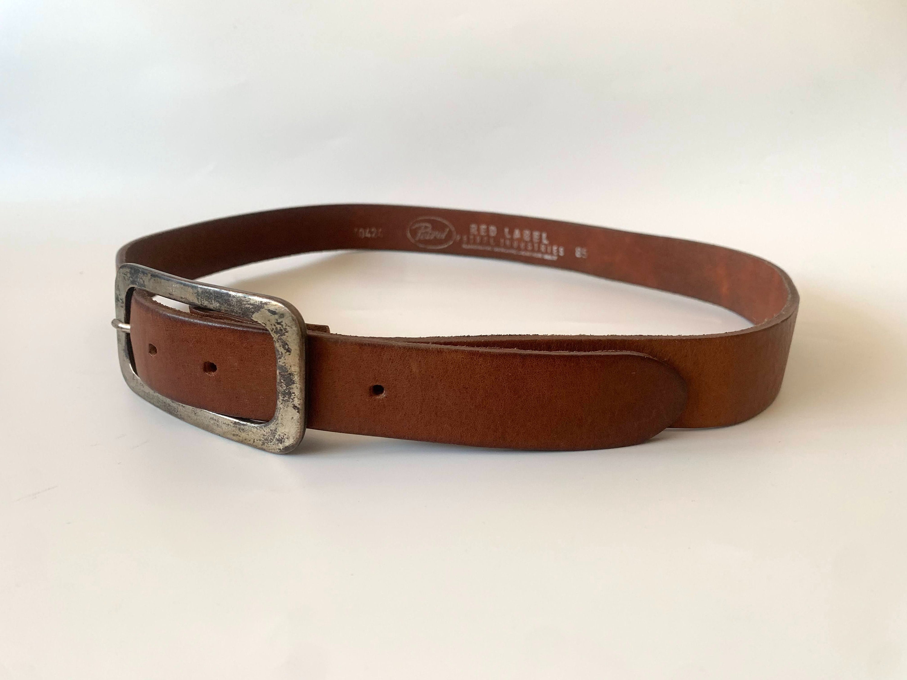 This is a simple brown leather belt by the brand Red Label. This simple jeans belt is made of sturdy genuine leather with rectangular silver tone buckle. This minimalist leather belt is perfect to pair with jeans, skirts and pants. The size marked on this distressed leather preppy belt is 33.5" / 85 cm. Great plain leather belt that you can incorporate in your minimalist wardrobe