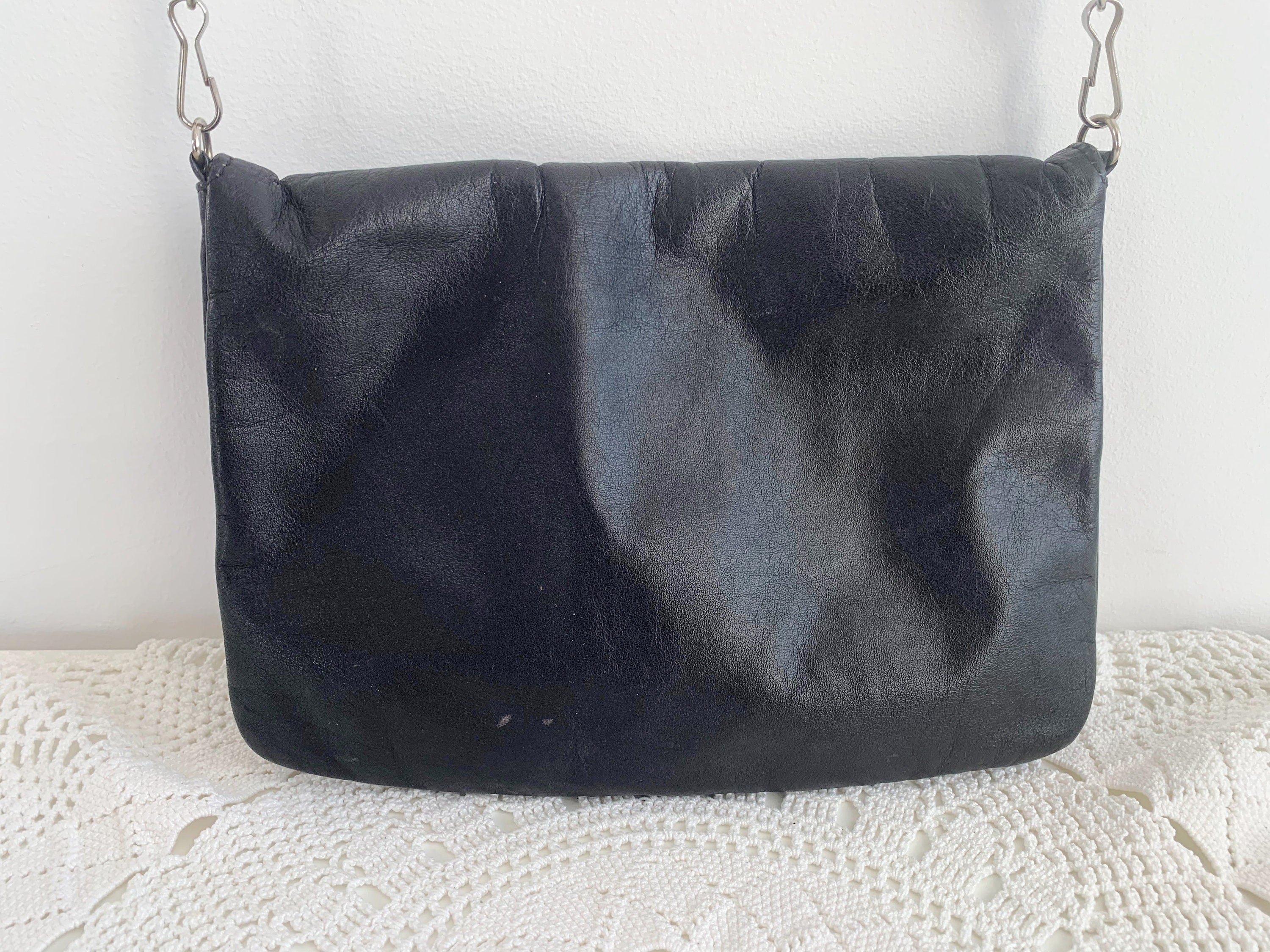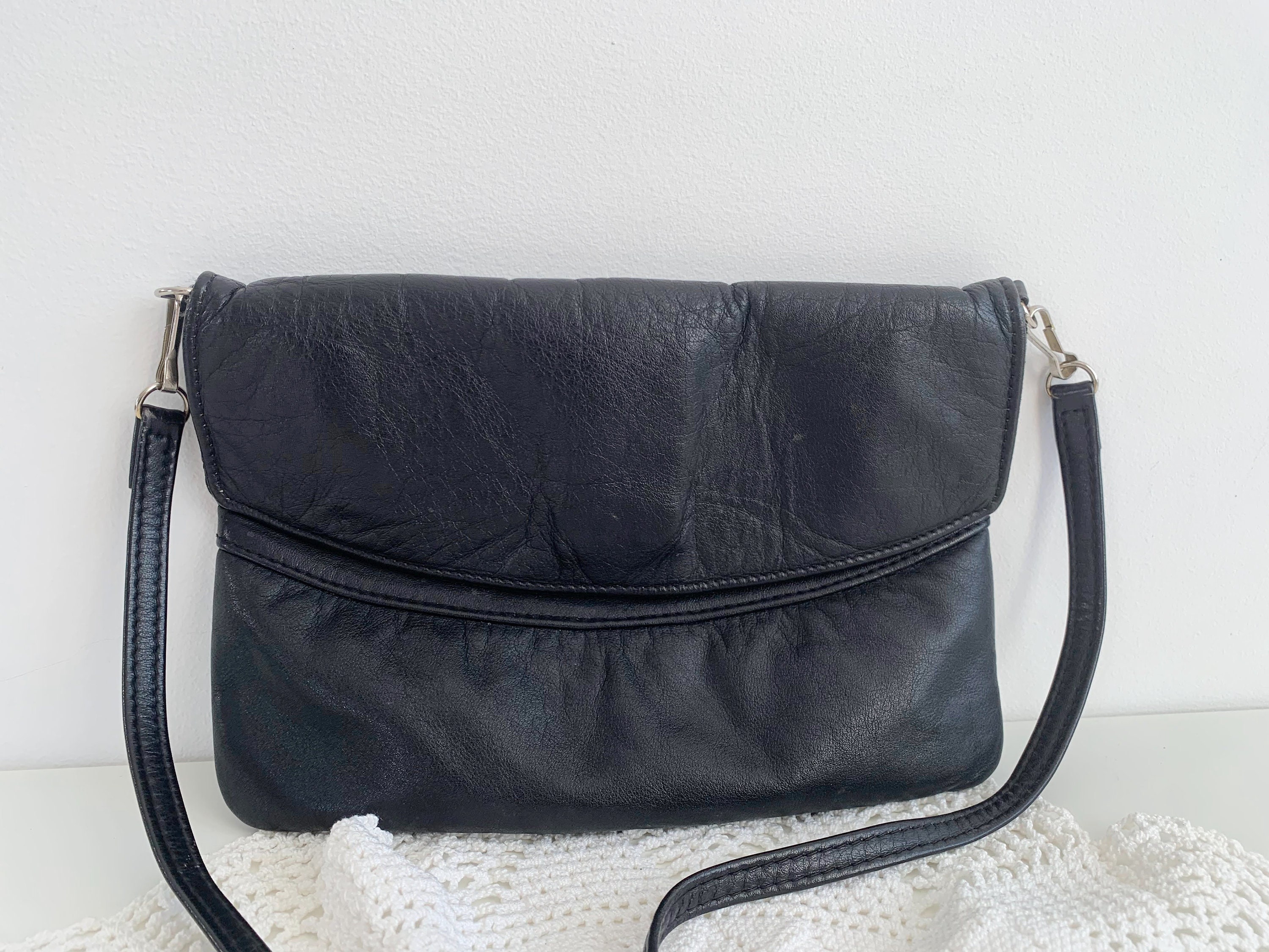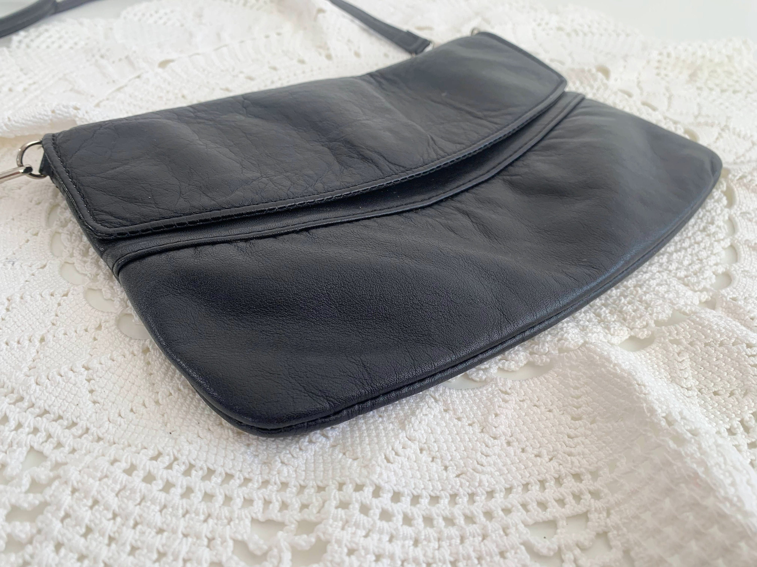 This is a vintage 80s small crossbody bag made of super soft genuine leather in jet black color. This black crossbody bag has slim detachable shoulder strap. This small envelope purse can be worn as a shoulder purse or as a clutch wallet. This black leather satchel has flap over lid and click clasp closure. There are is one compartment with a small zipper pocket inside.