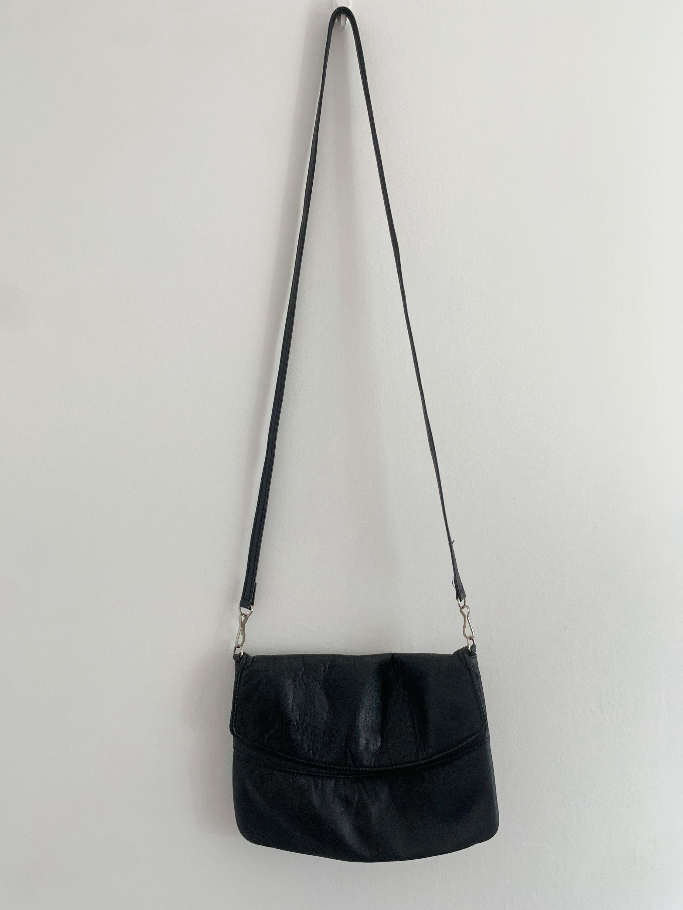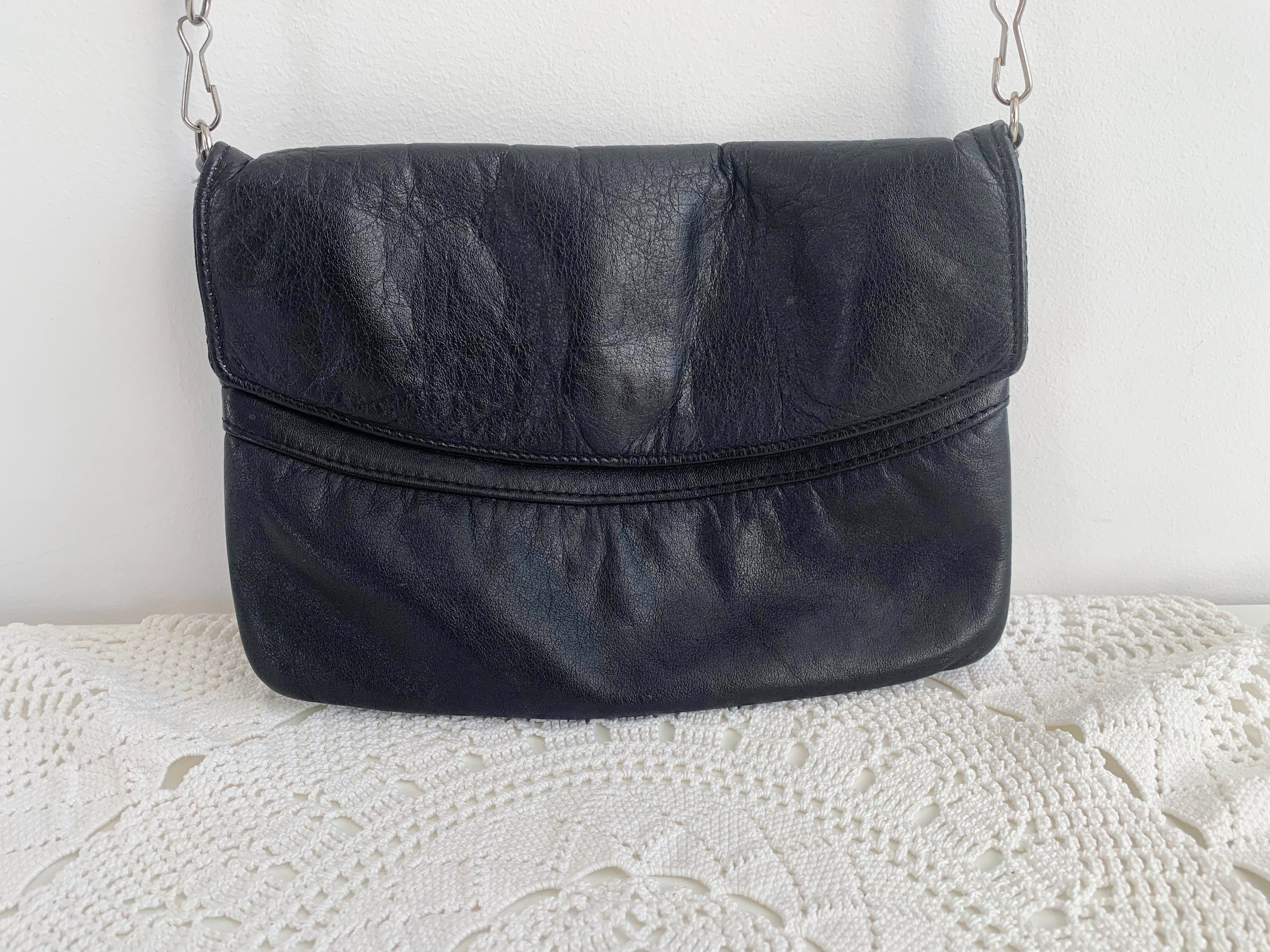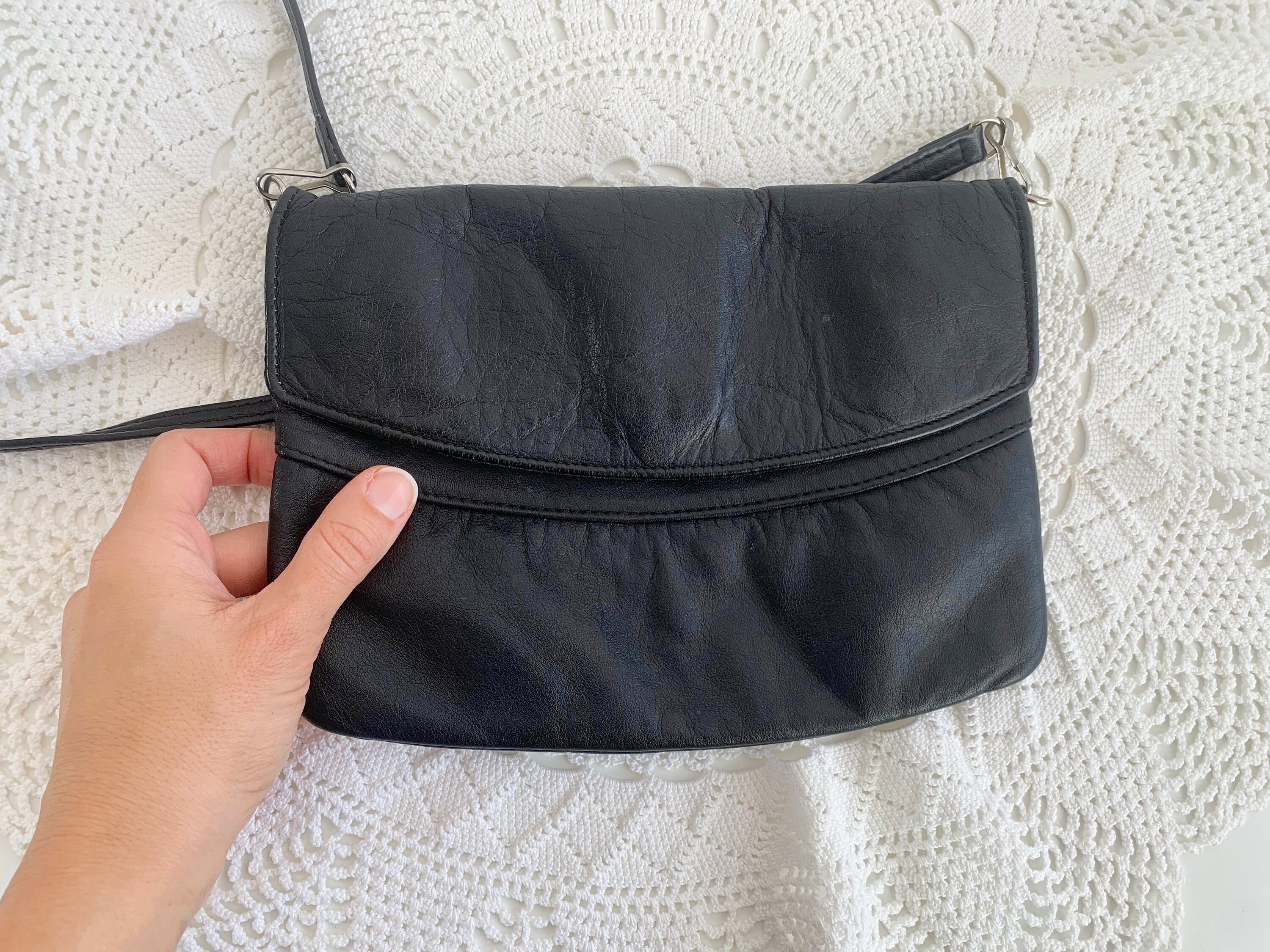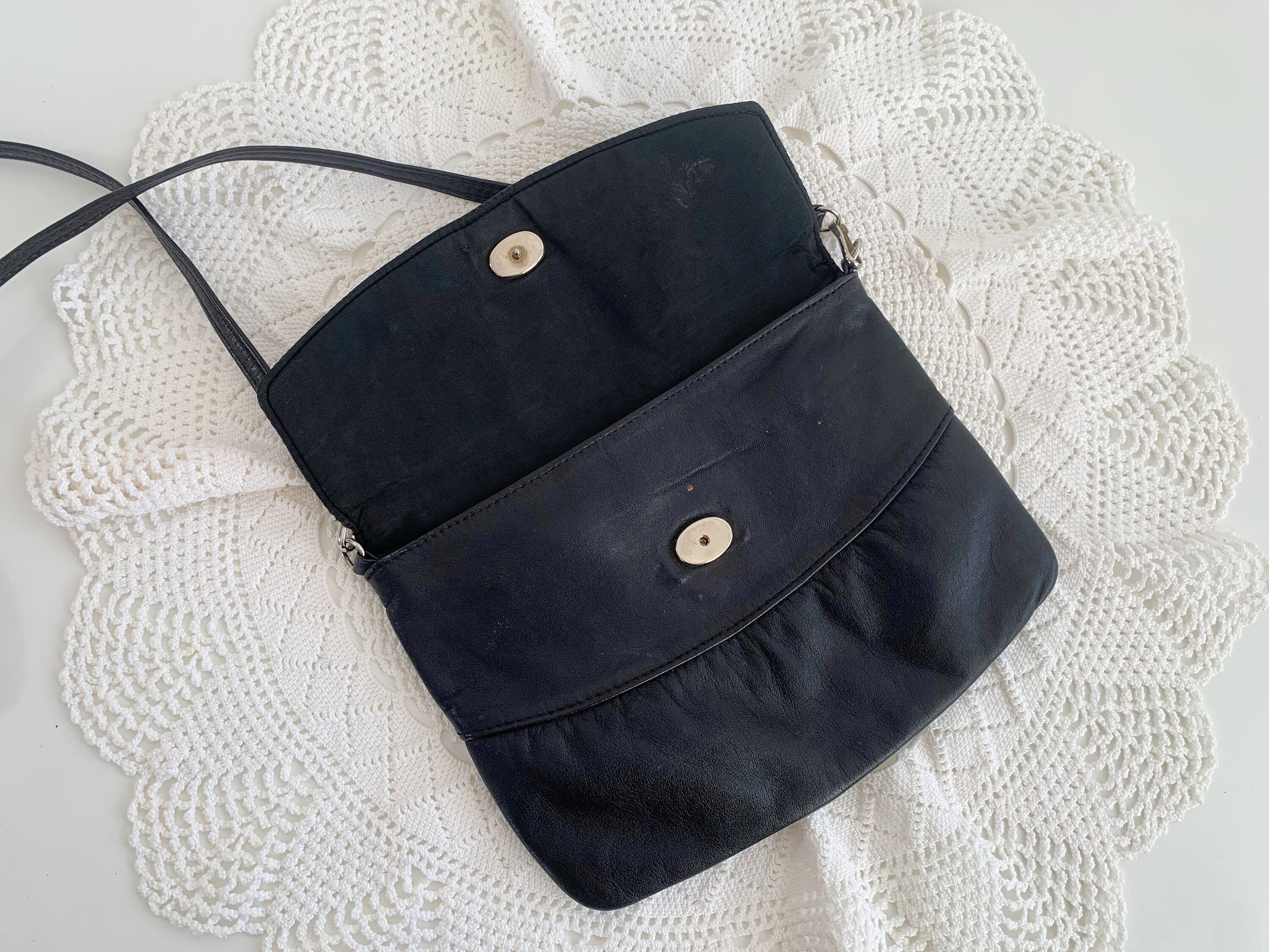 This is a vintage 80s small crossbody bag made of super soft genuine leather in jet black color. This black crossbody bag has slim detachable shoulder strap. This small envelope purse can be worn as a shoulder purse or as a clutch wallet. This black leather satchel has flap over lid and click clasp closure. There are is one compartment with a small zipper pocket inside.