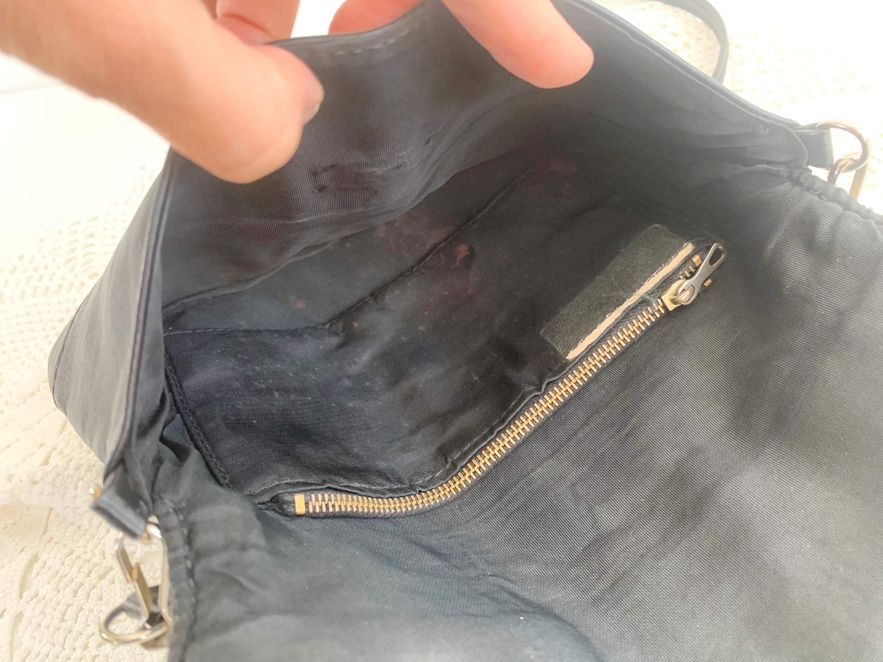 Condition: this small crossbody bag has a distressed leather look with some scratches on the leather surface. The leather has become much softer with the wear. There is some wear on the fabric lining too - there are some red spots and a tiny bit of tear on the linings around the edges where the click clasp is attached.