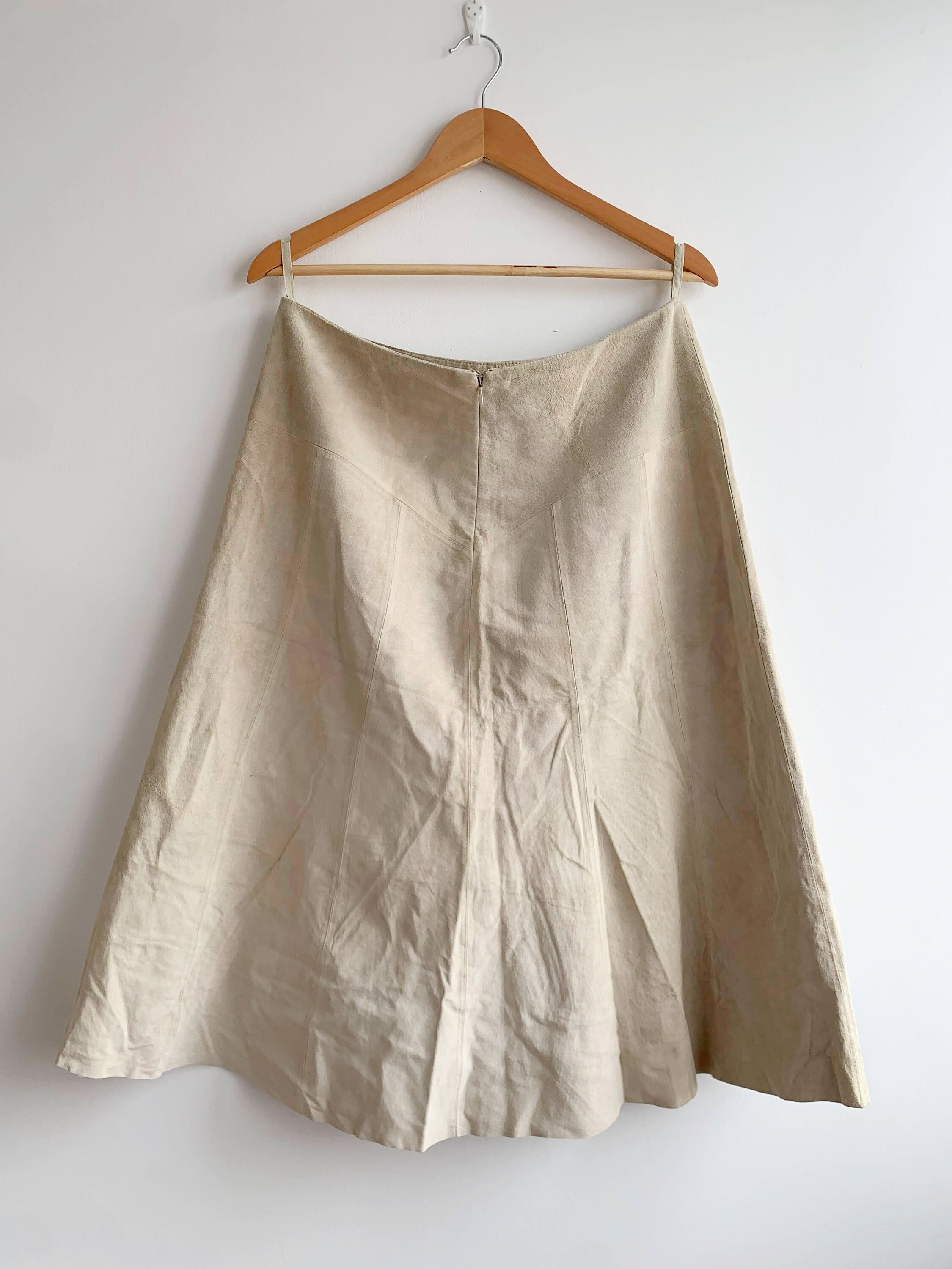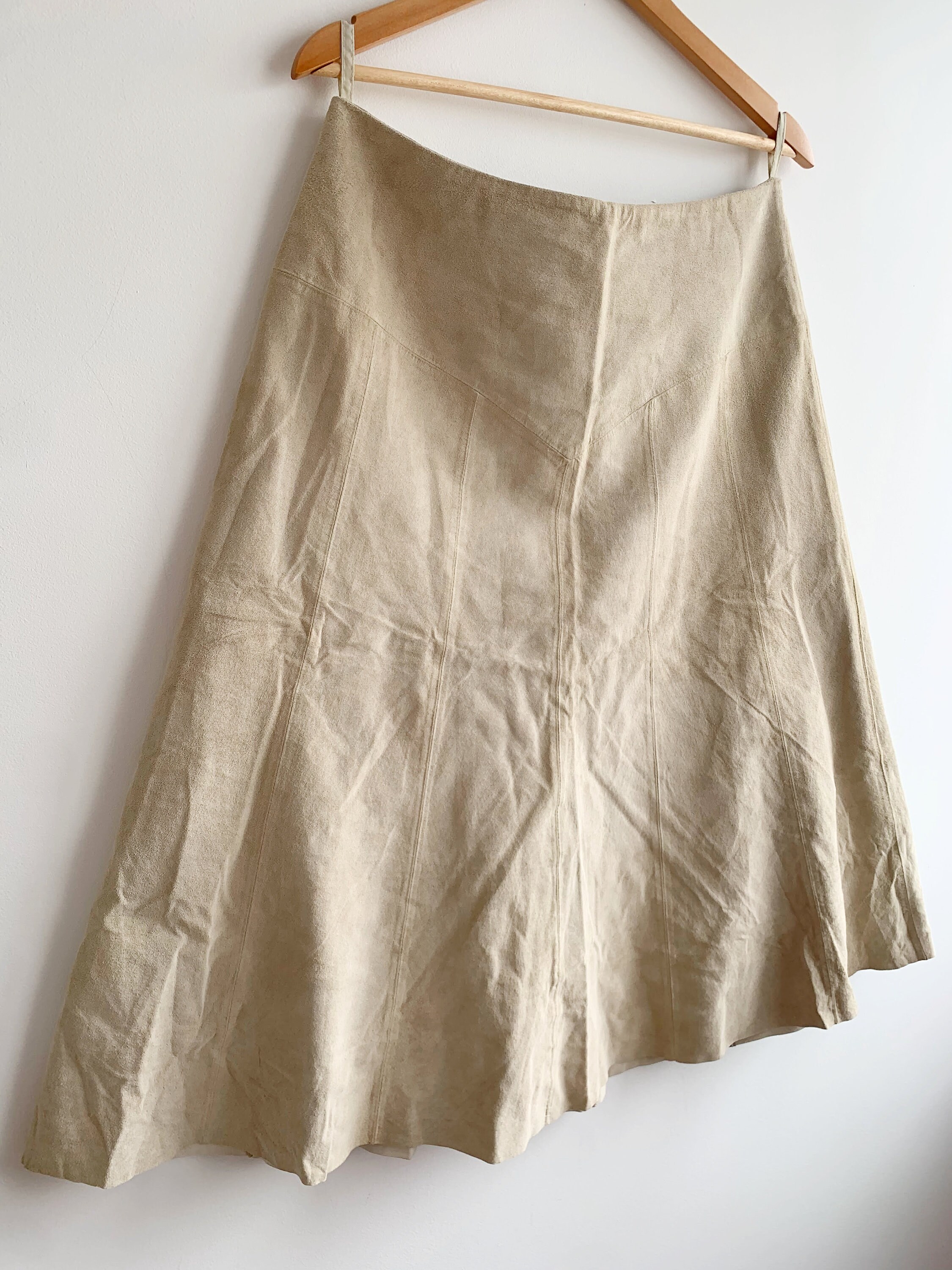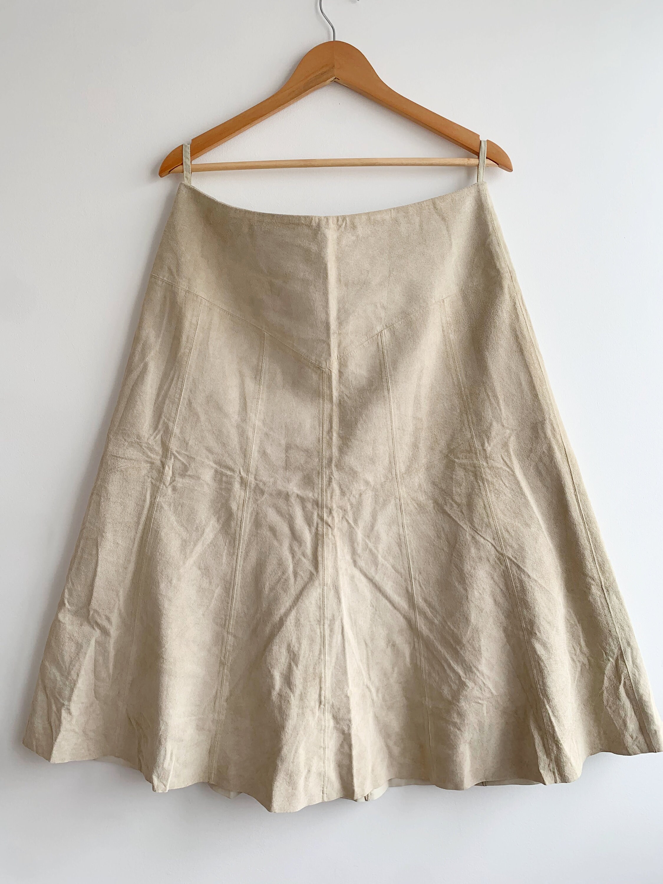 This is a vintage Y2K tan beige soft suede leather A Line midi skirt wit back sip closure and half lining. This flared real suede skirt is made of super soft 100% natural suede leather in light beige color which has become softer with the wear. The size marked is 42. It fits like size L.