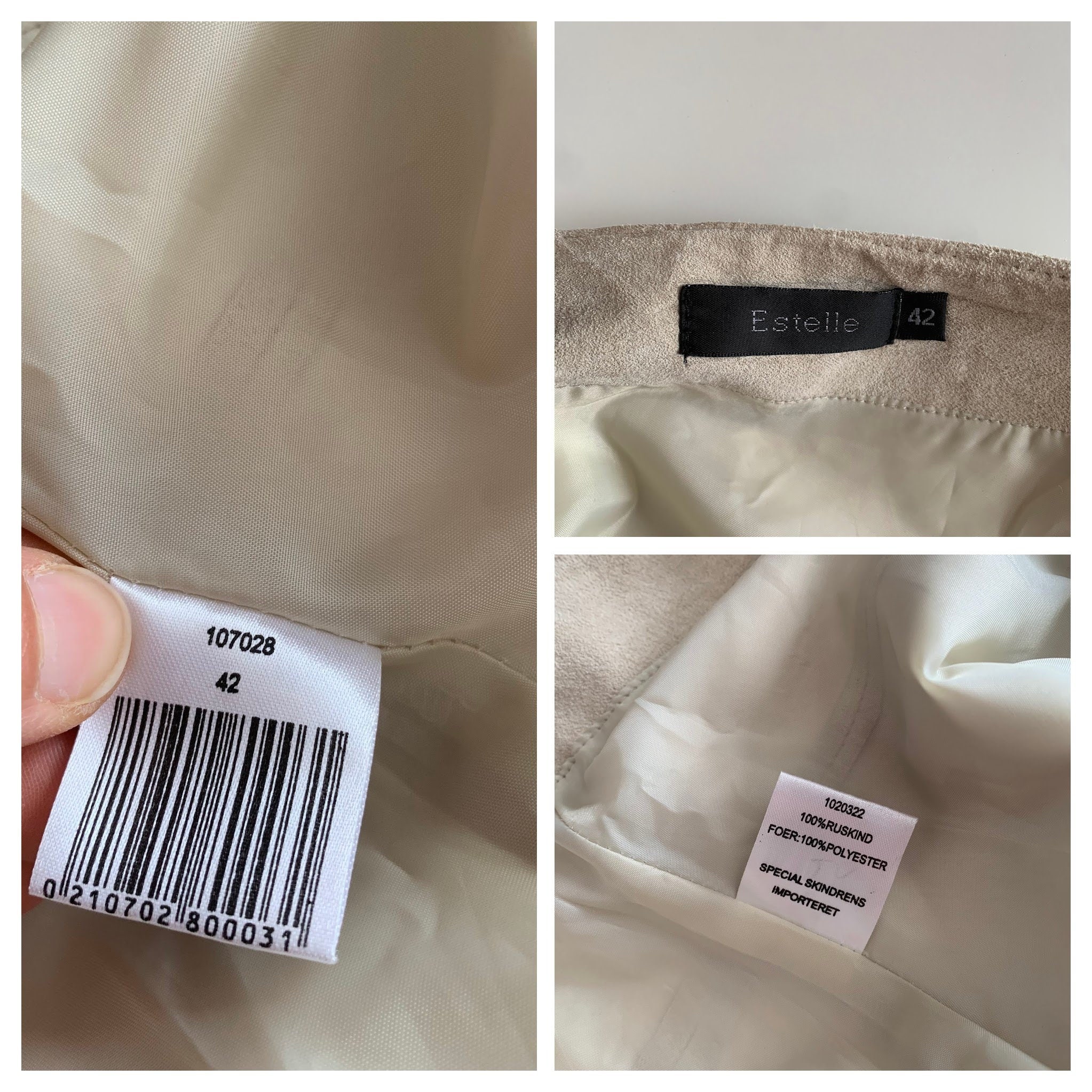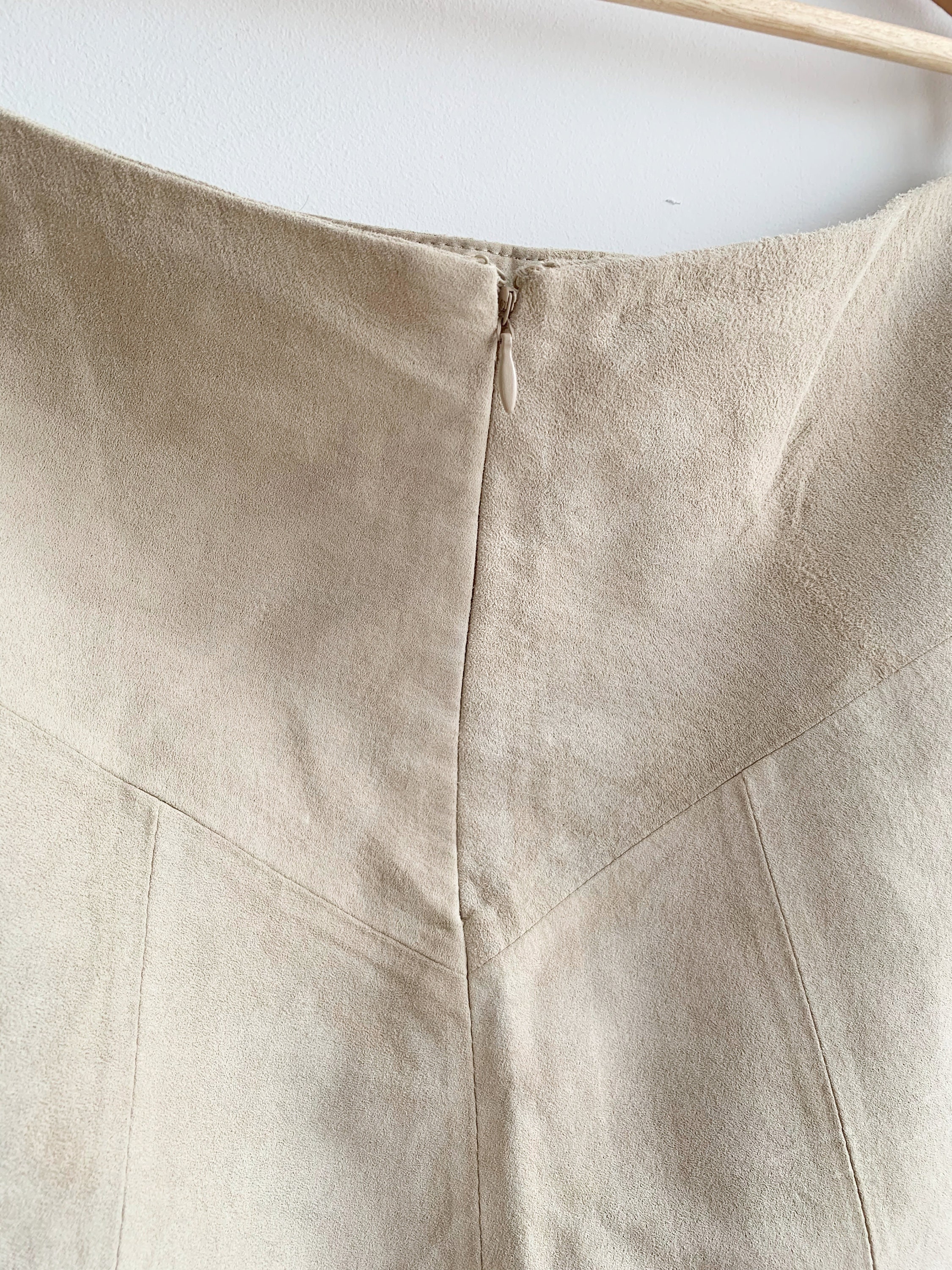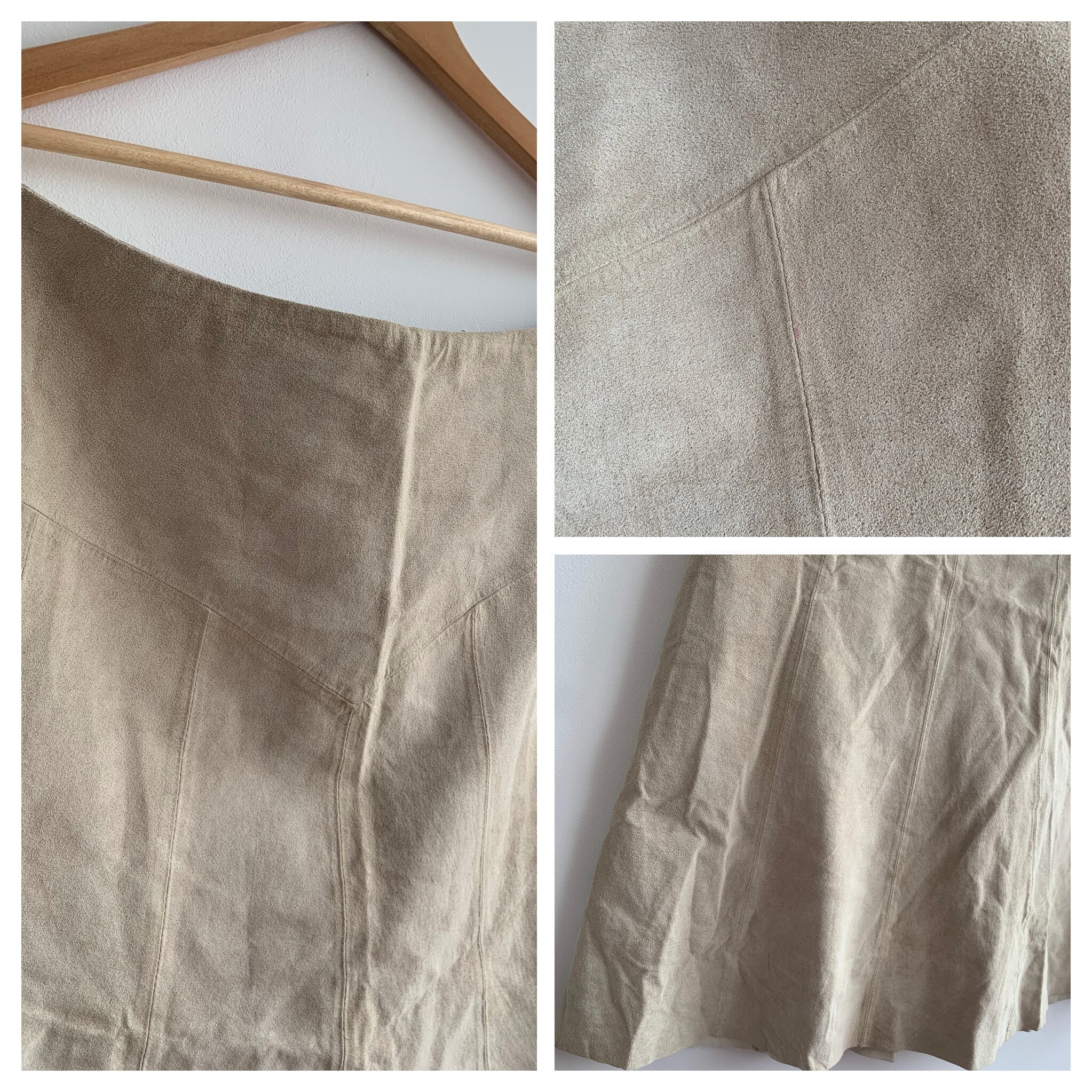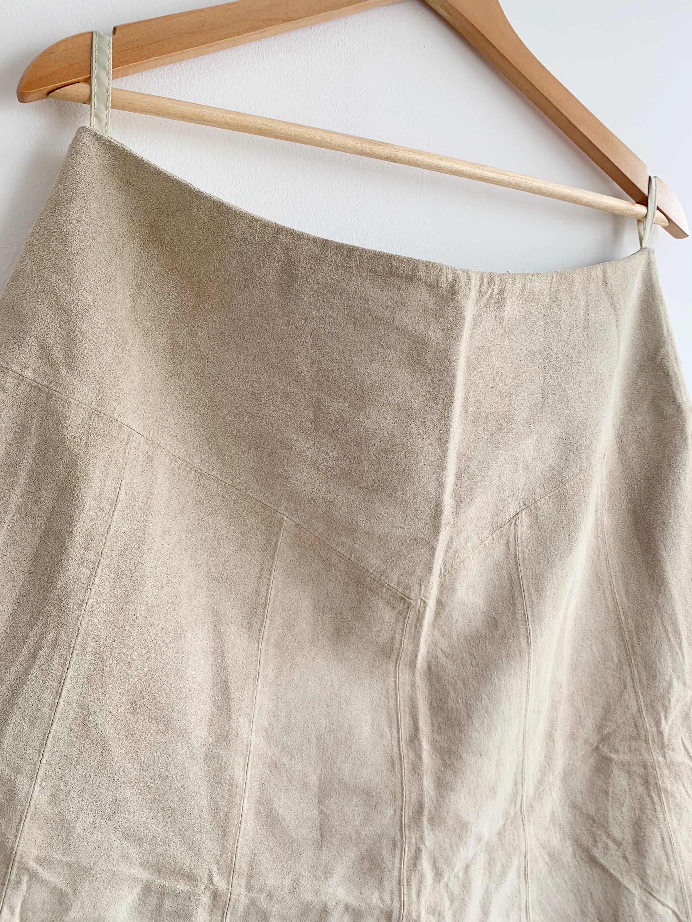 This is a vintage Y2K tan beige soft suede leather A Line midi skirt wit back sip closure and half lining. This flared real suede skirt is made of super soft 100% natural suede leather in light beige color which has become softer with the wear. The size marked is 42. It fits like size L.