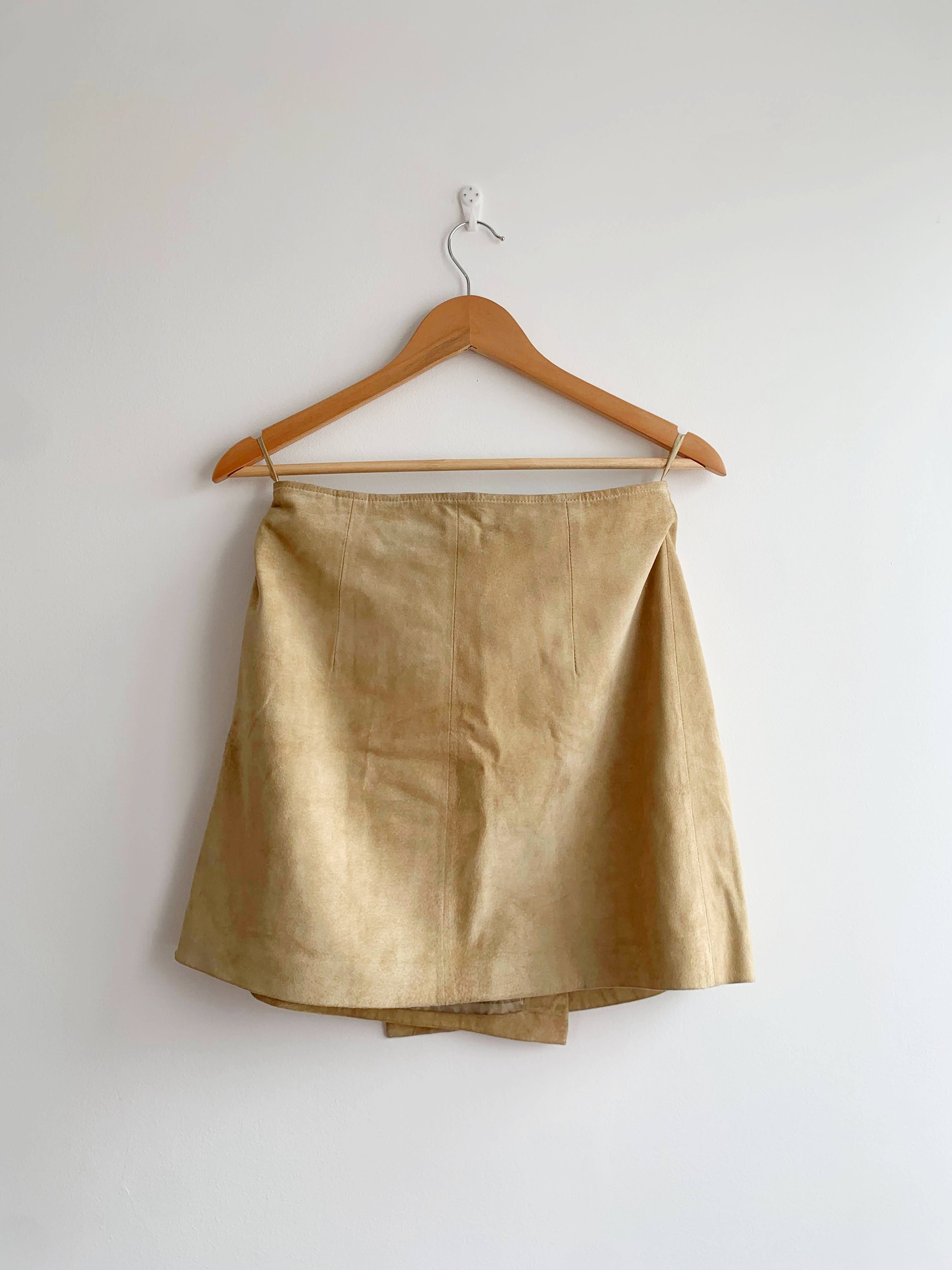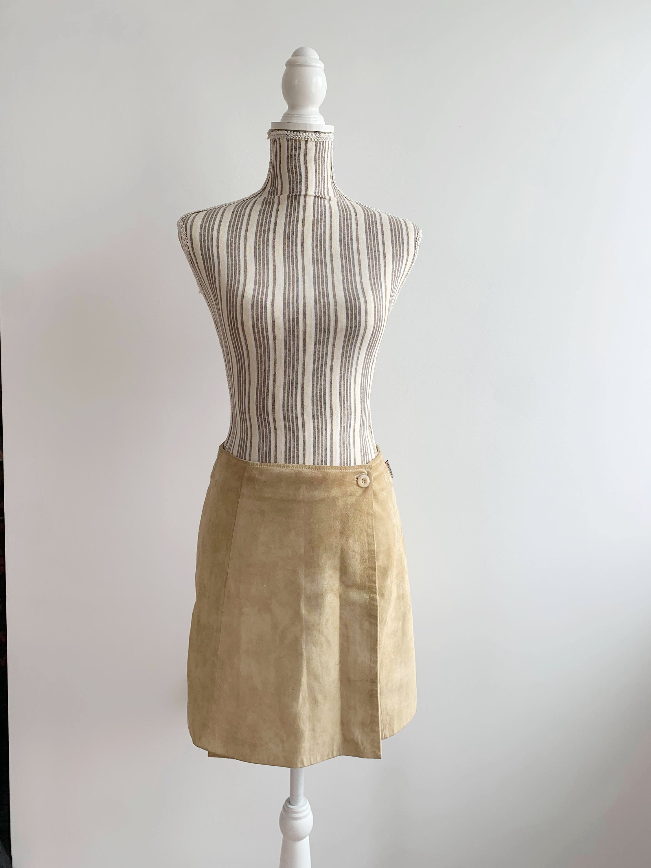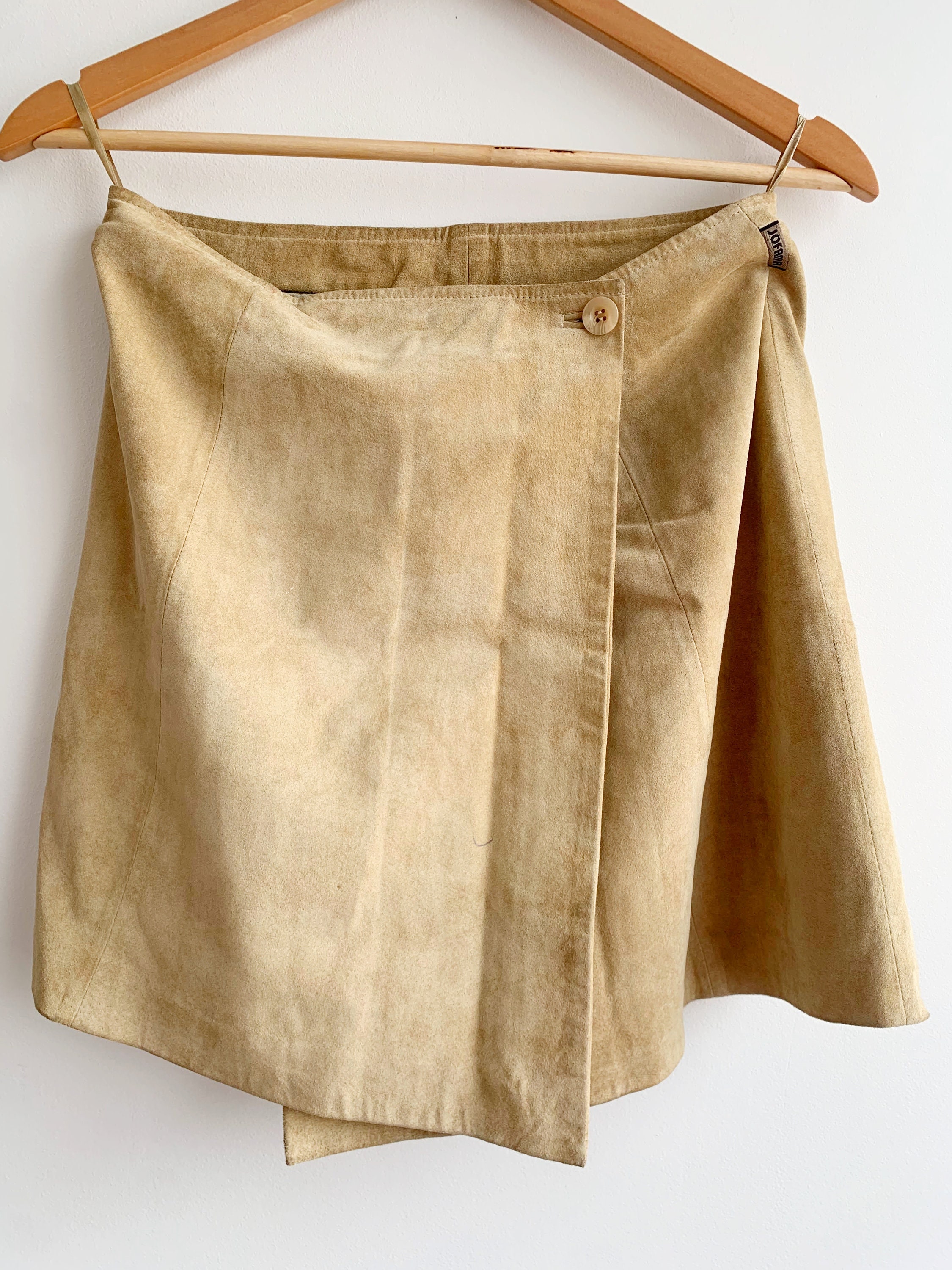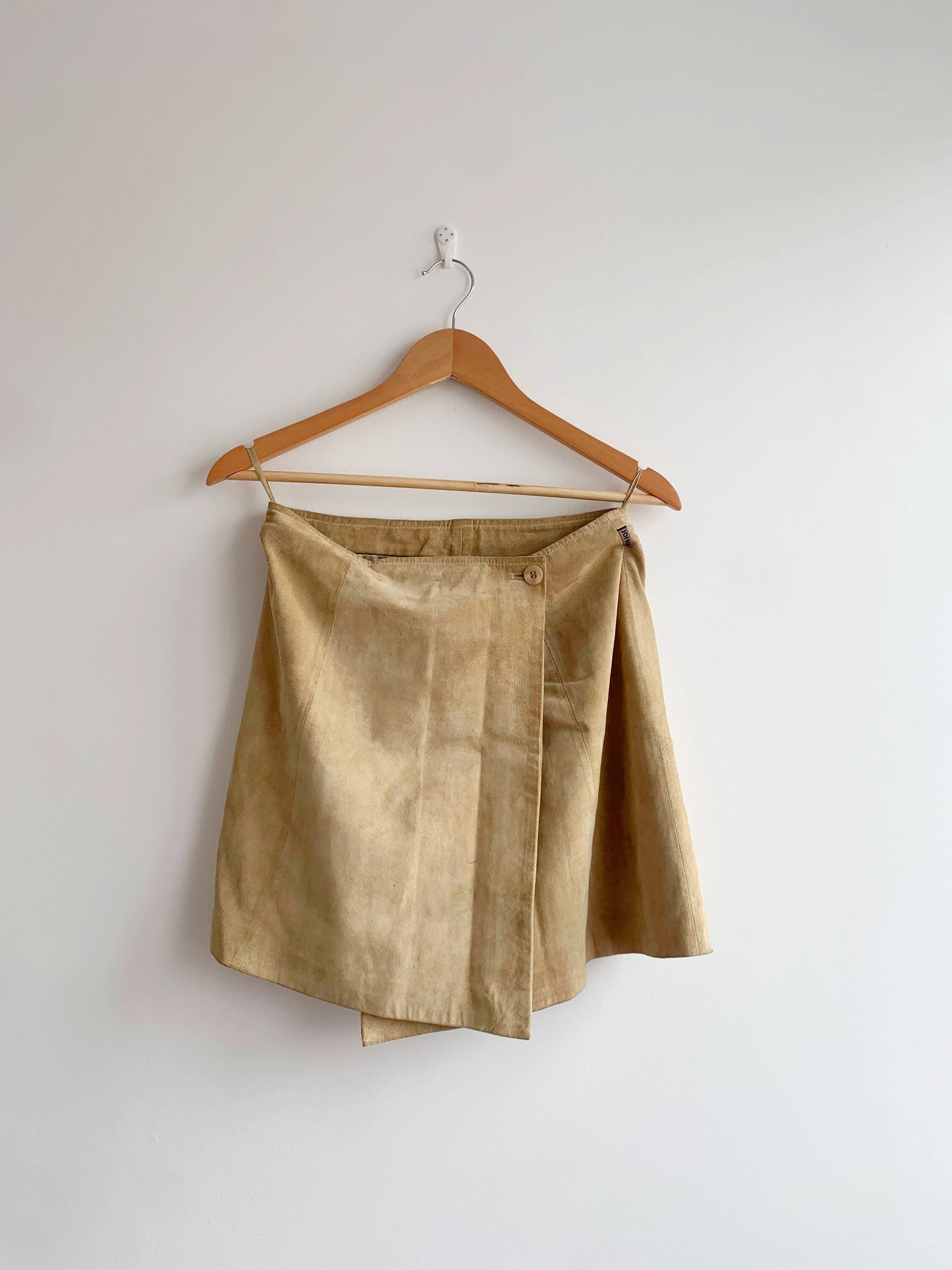 This is a vintage 90s suede mini skirt with button up closure at the side. This suede wrap skirt is made of super soft genuine suede leather and polyester lining. This genuine leather mini skirt is by the brand Jofama. The size marked is 38 M , it fits like size S/M. The button was moved by half an inch from it's original place to make the skirt smaller. Please check the measurements below.