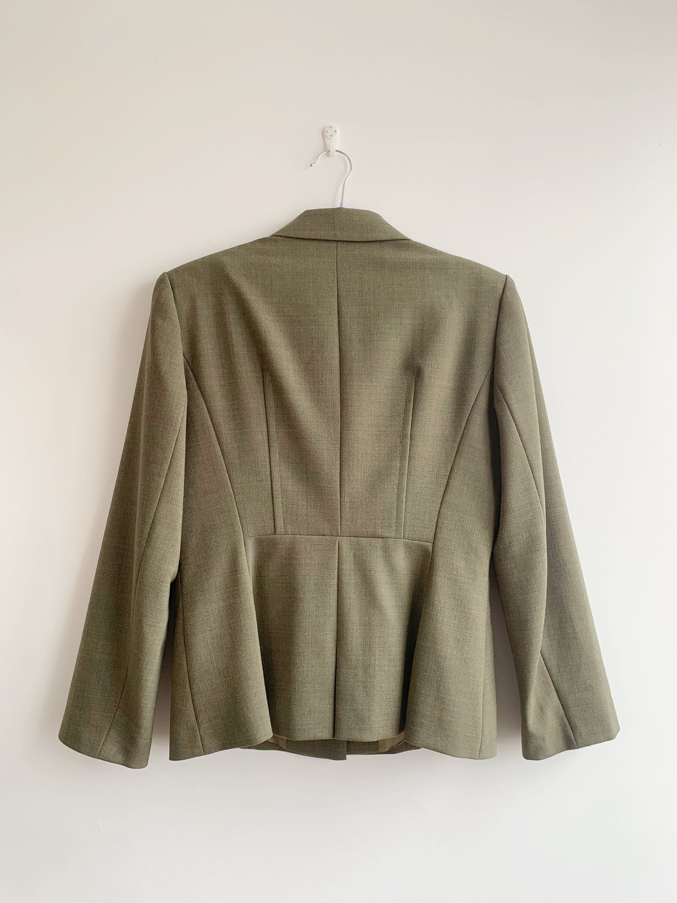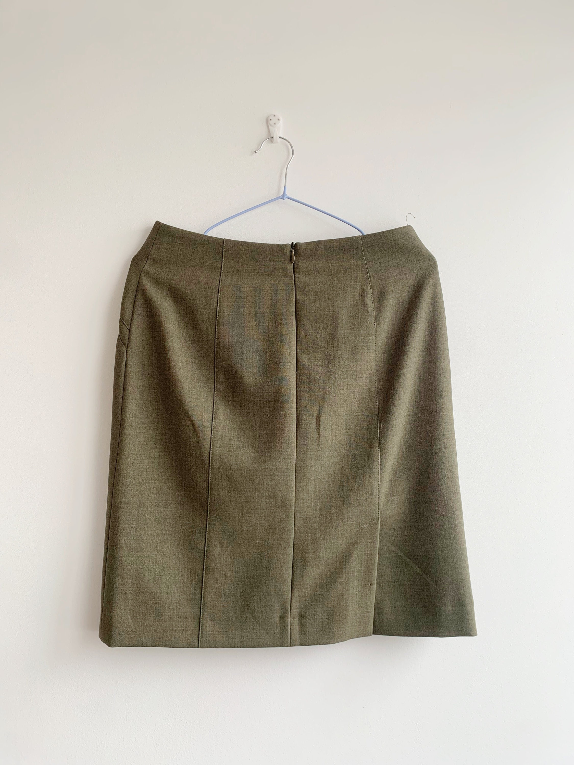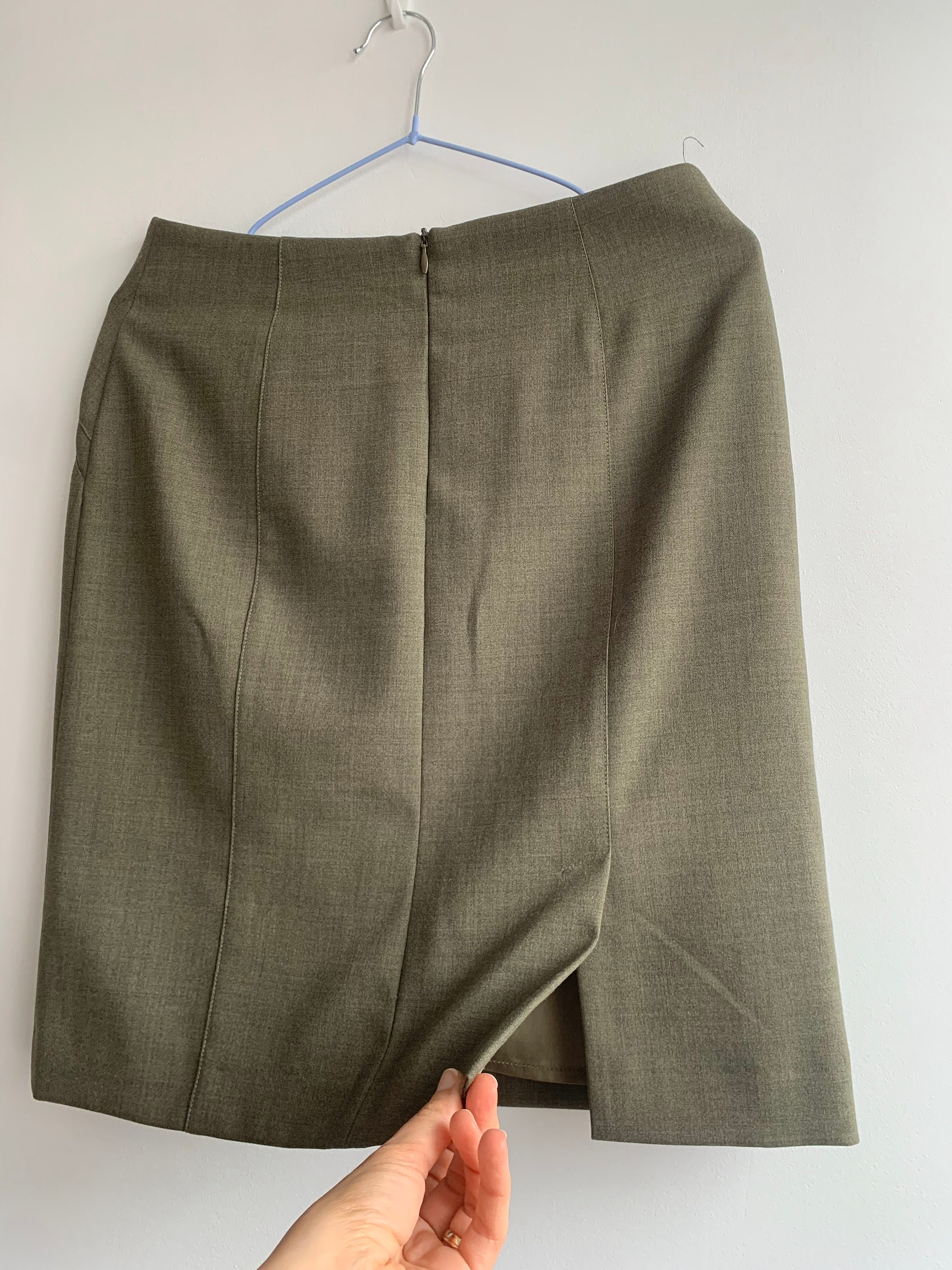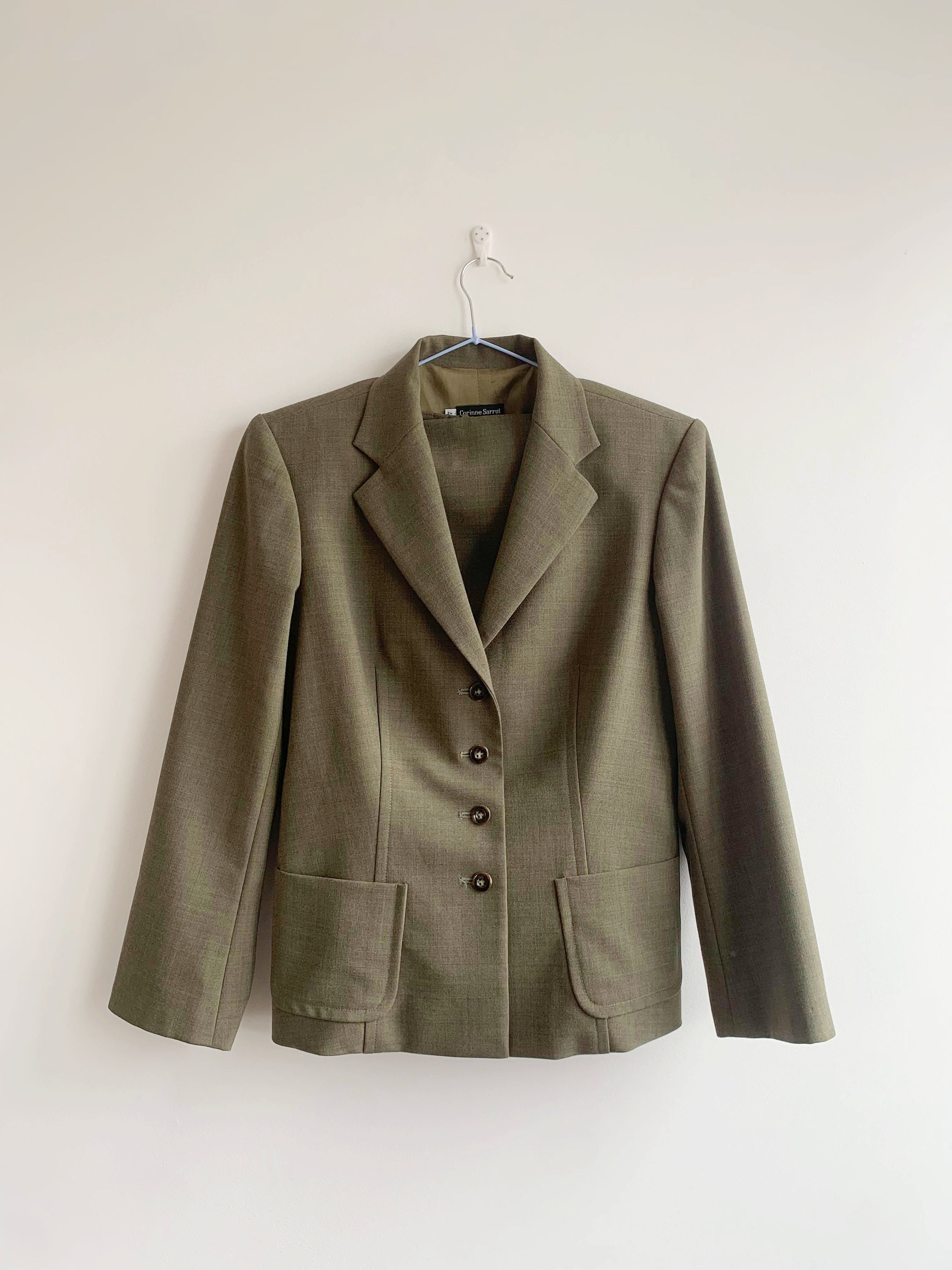 This is a wonderful 90s women's suit set which consists of a blazer and a mini skirt in olive green color. The fabric is fine wool blend (54% polyester, 44% wool, 2% elastane, lining: 59% acetate, 41% viscose). This matching blazer and skirt set fits like size S/M. The blazer is by Corinne Sarrut. The skirt is by Cacharel, however, they are made of exactly the same fabric with the same fabric/care labels stitches inside just the brand label is different.