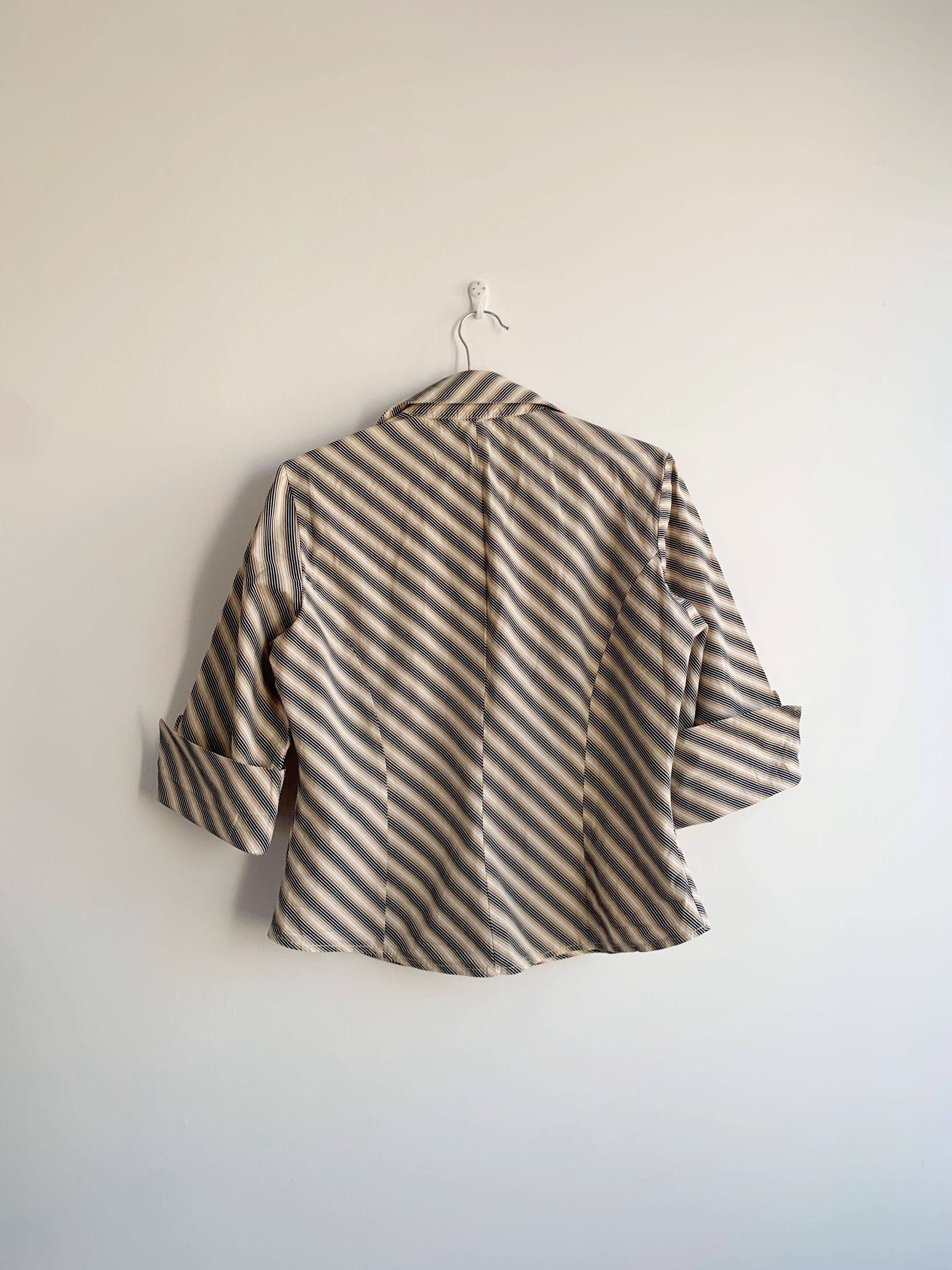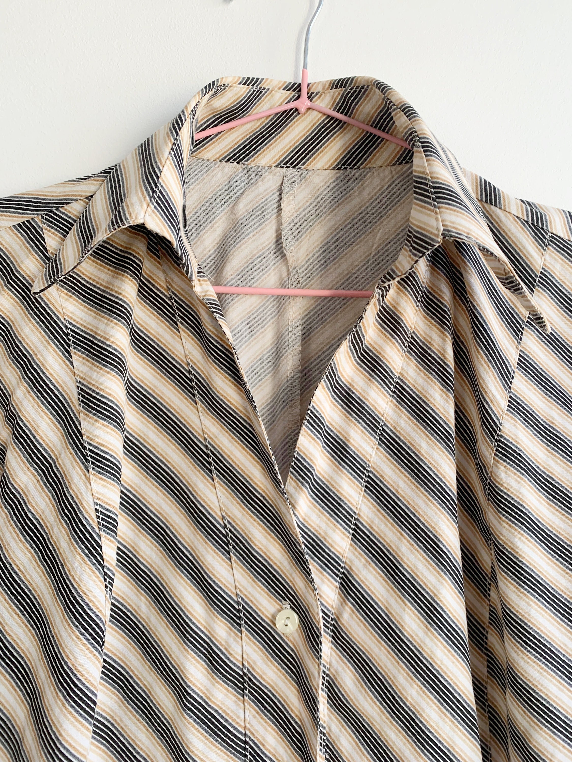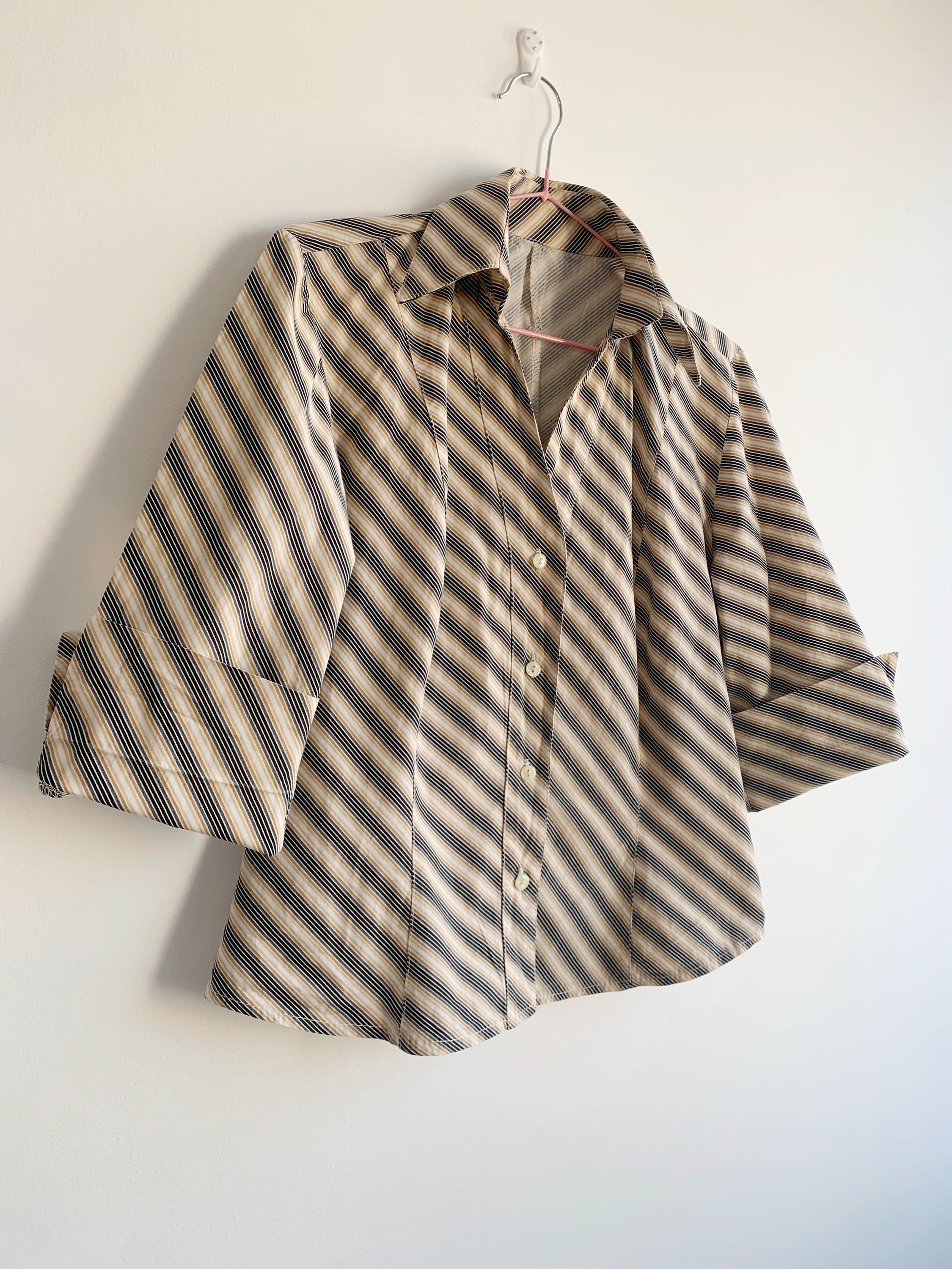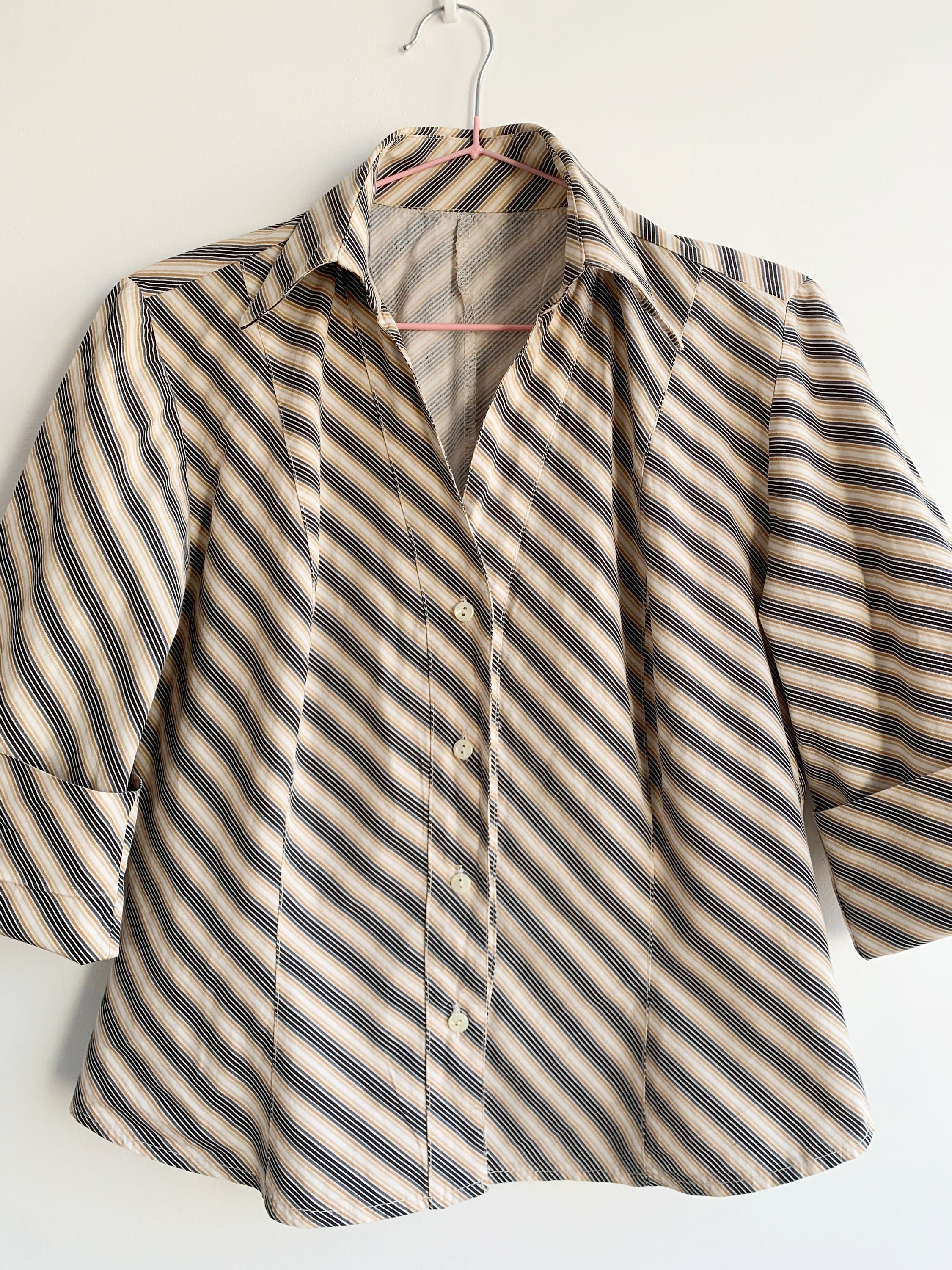 This is a vintage 90s preppy button up shirt for women with notched collar and fitted silhouette. This retro shirt was made in Italy of pure cotton fabric with diagonal stripes. This vintage button up has half sleeves and classic business casual design. The size marked is L. Please check the measurements below.