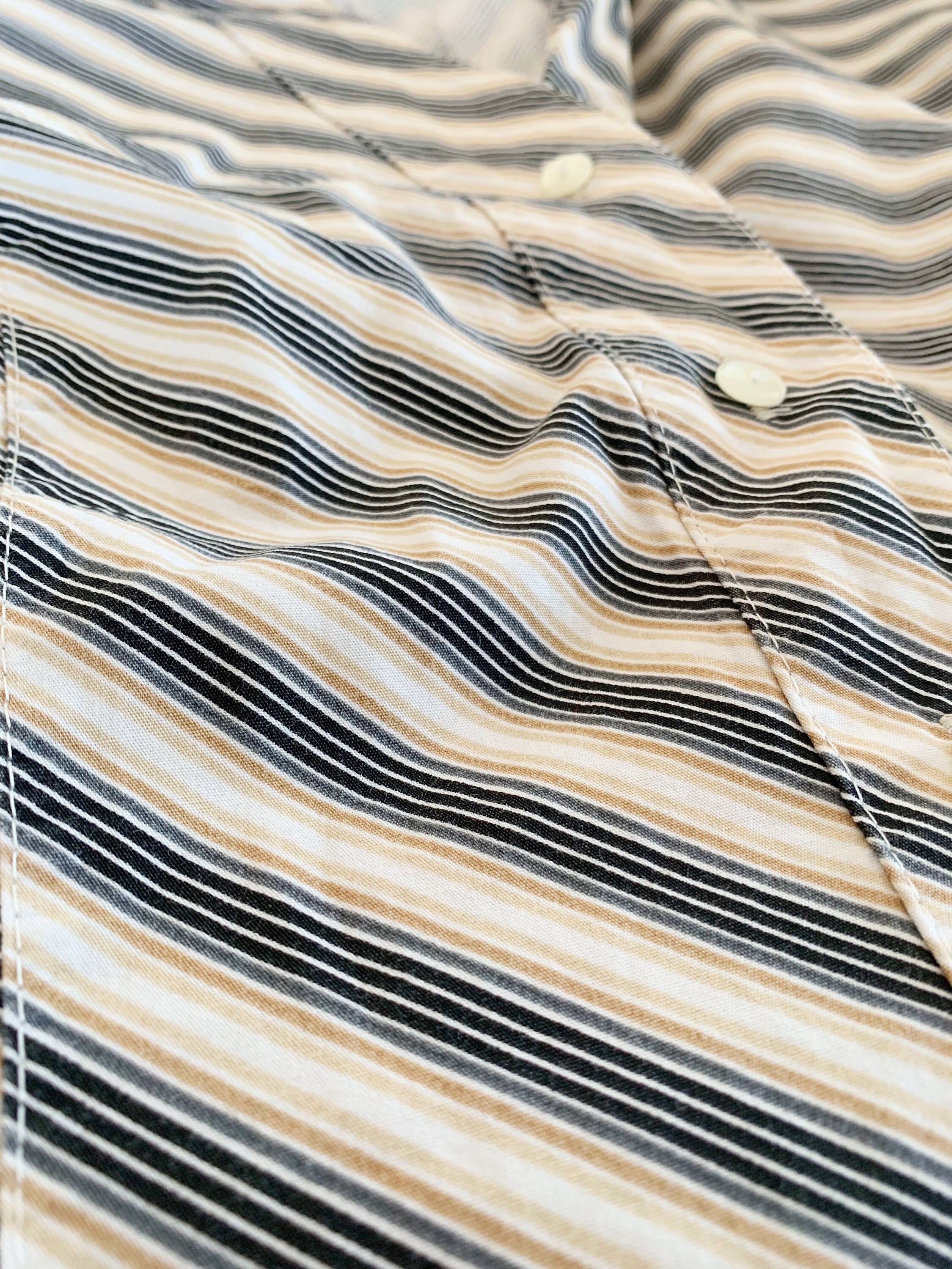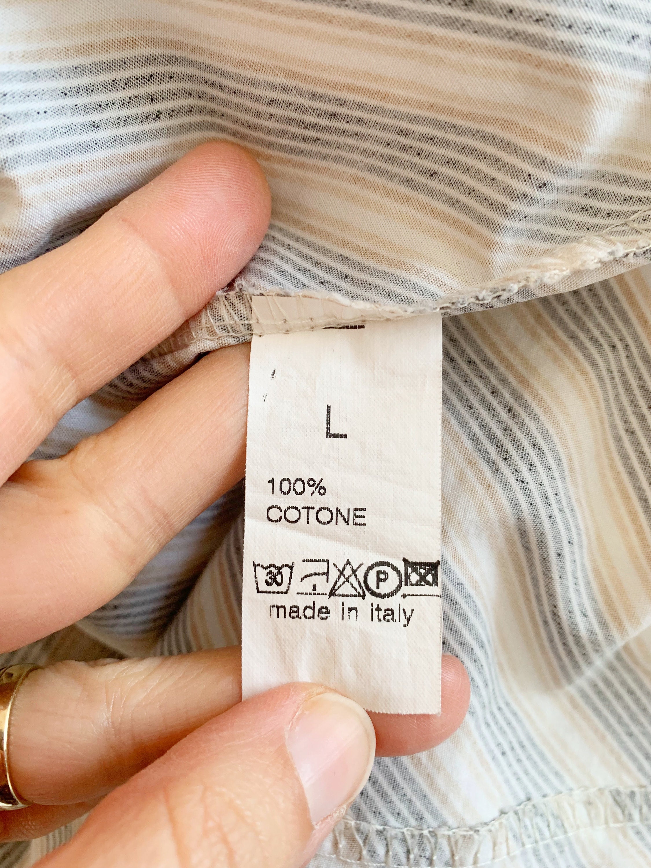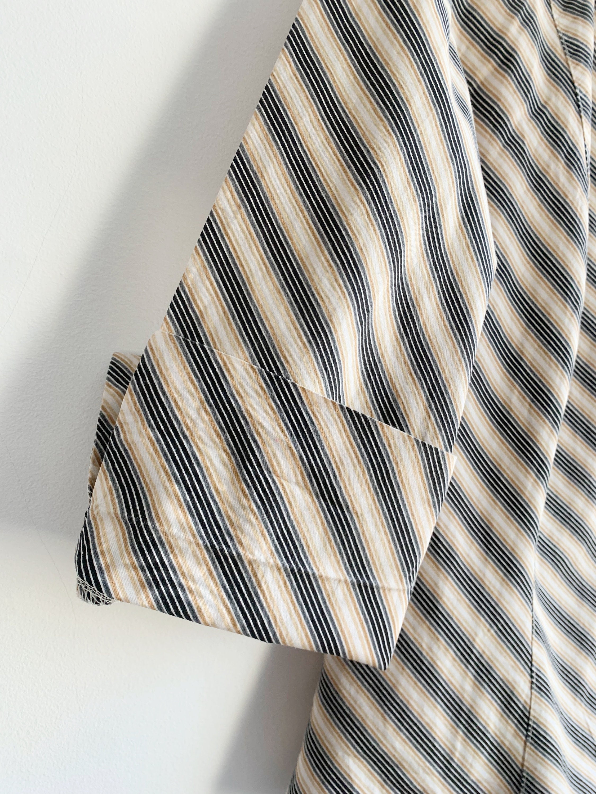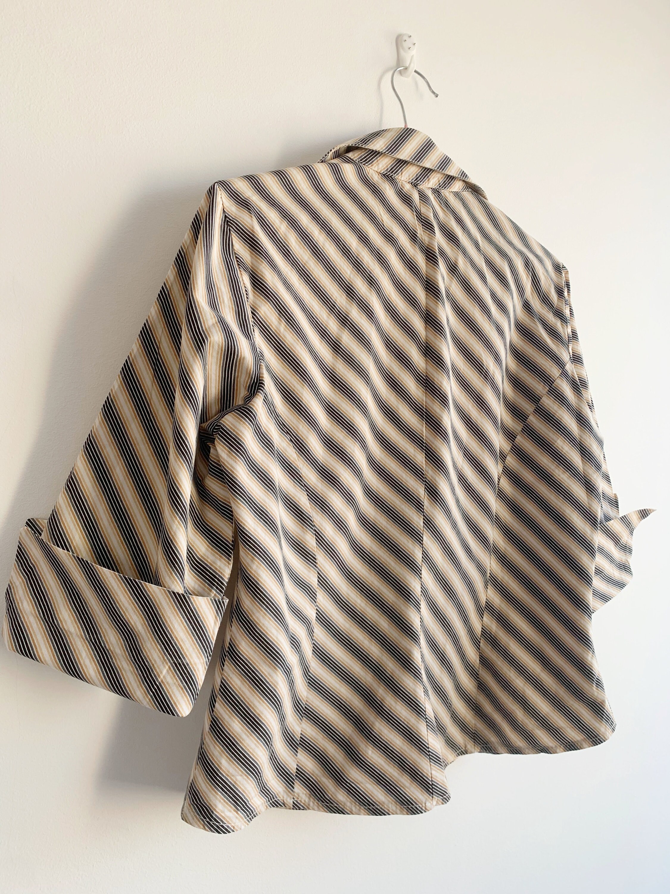 This is a vintage 90s preppy button up shirt for women with notched collar and fitted silhouette. This retro shirt was made in Italy of pure cotton fabric with diagonal stripes. This vintage button up has half sleeves and classic business casual design. The size marked is L. Please check the measurements below.