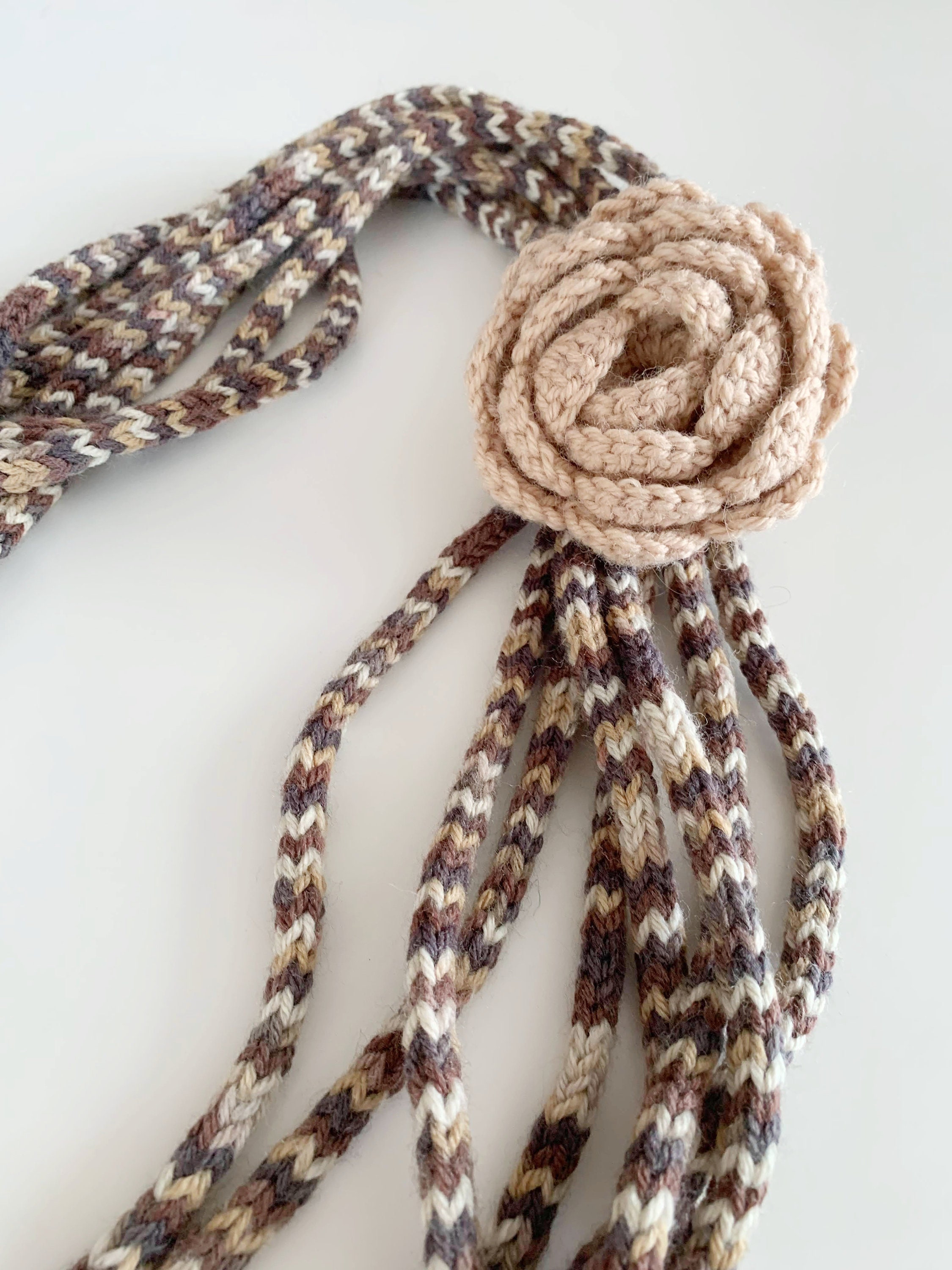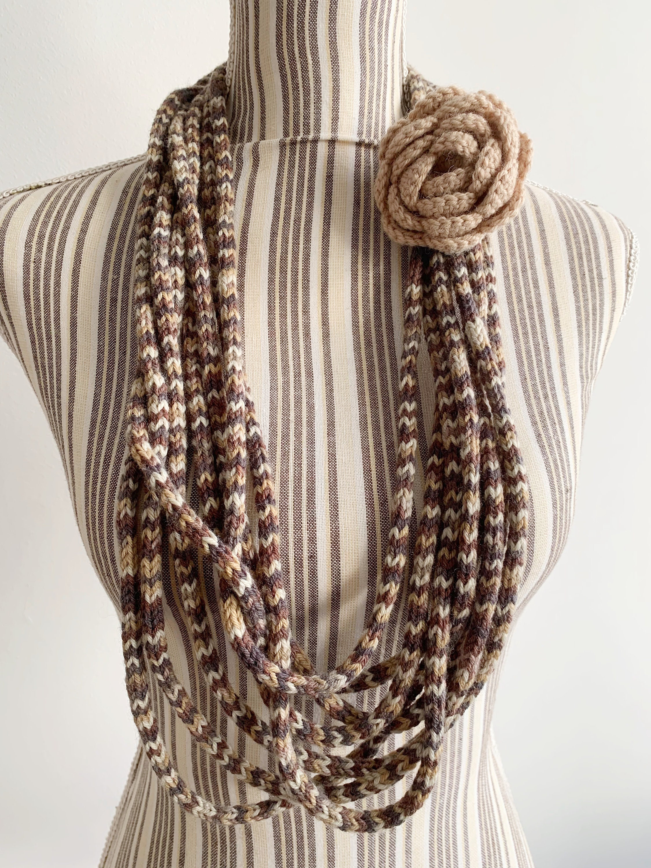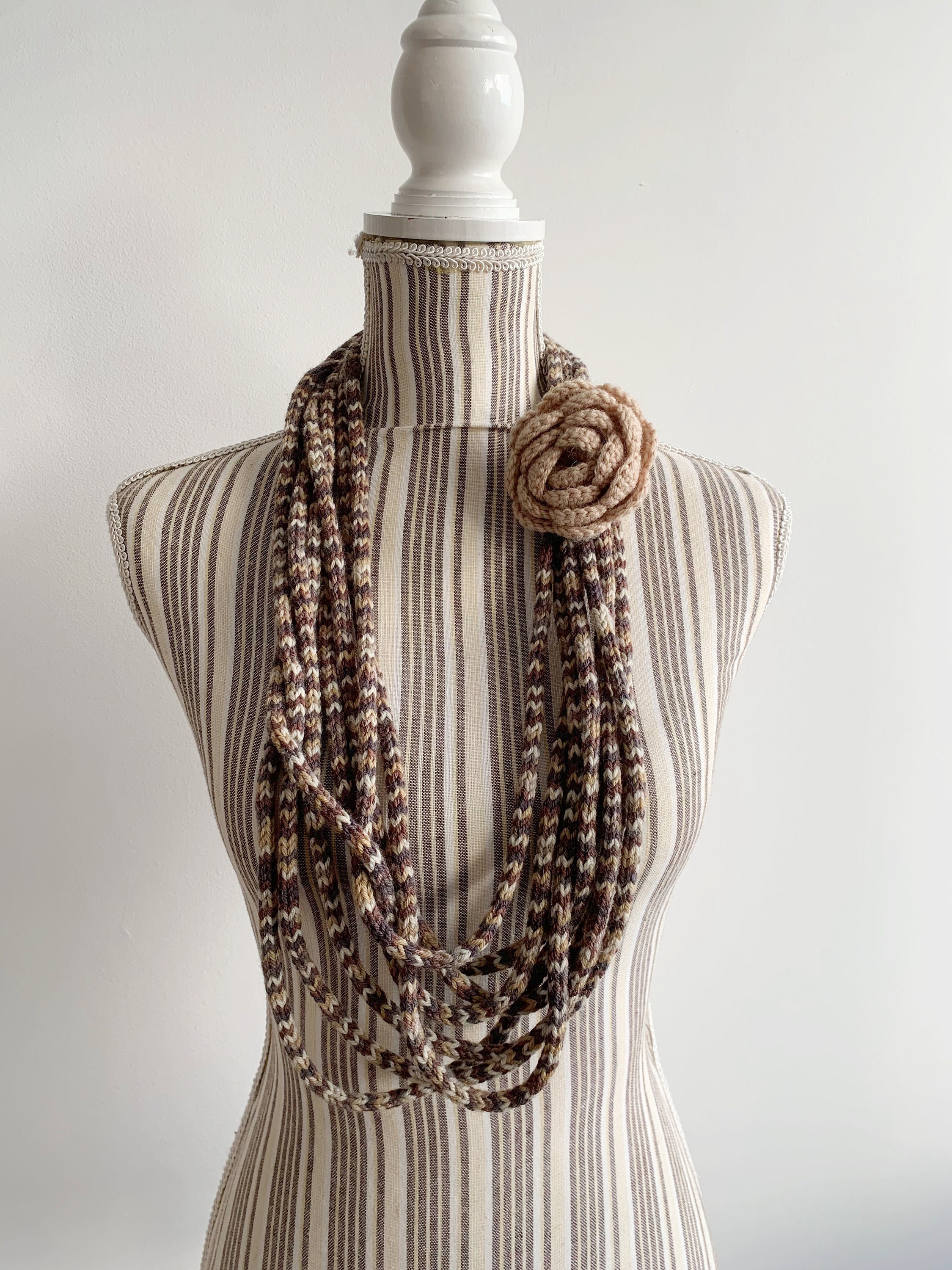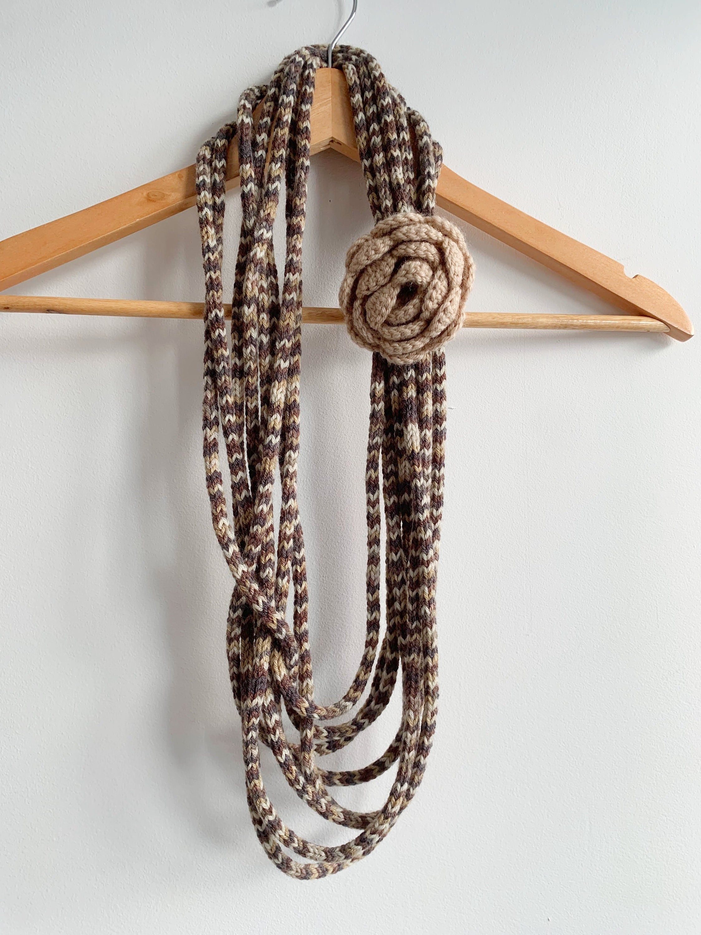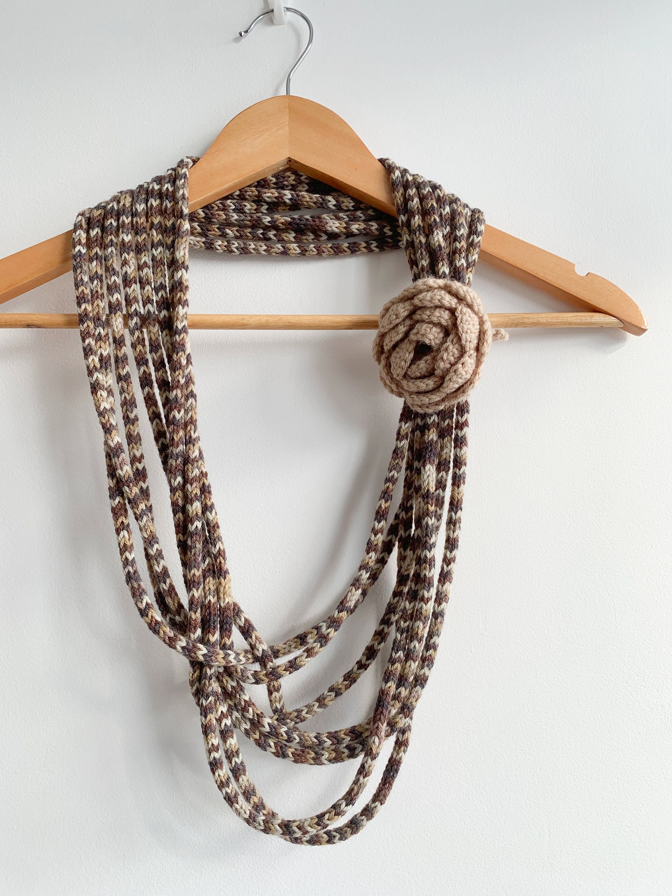 Lovely handmade layered knit necklace in nude beige, taupe brown and grey colors with crochet flower.