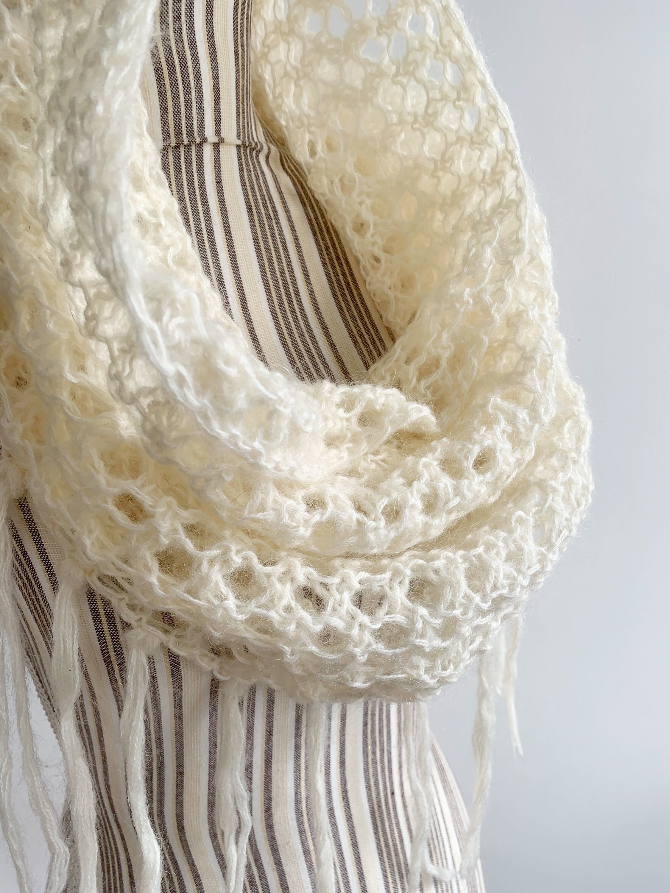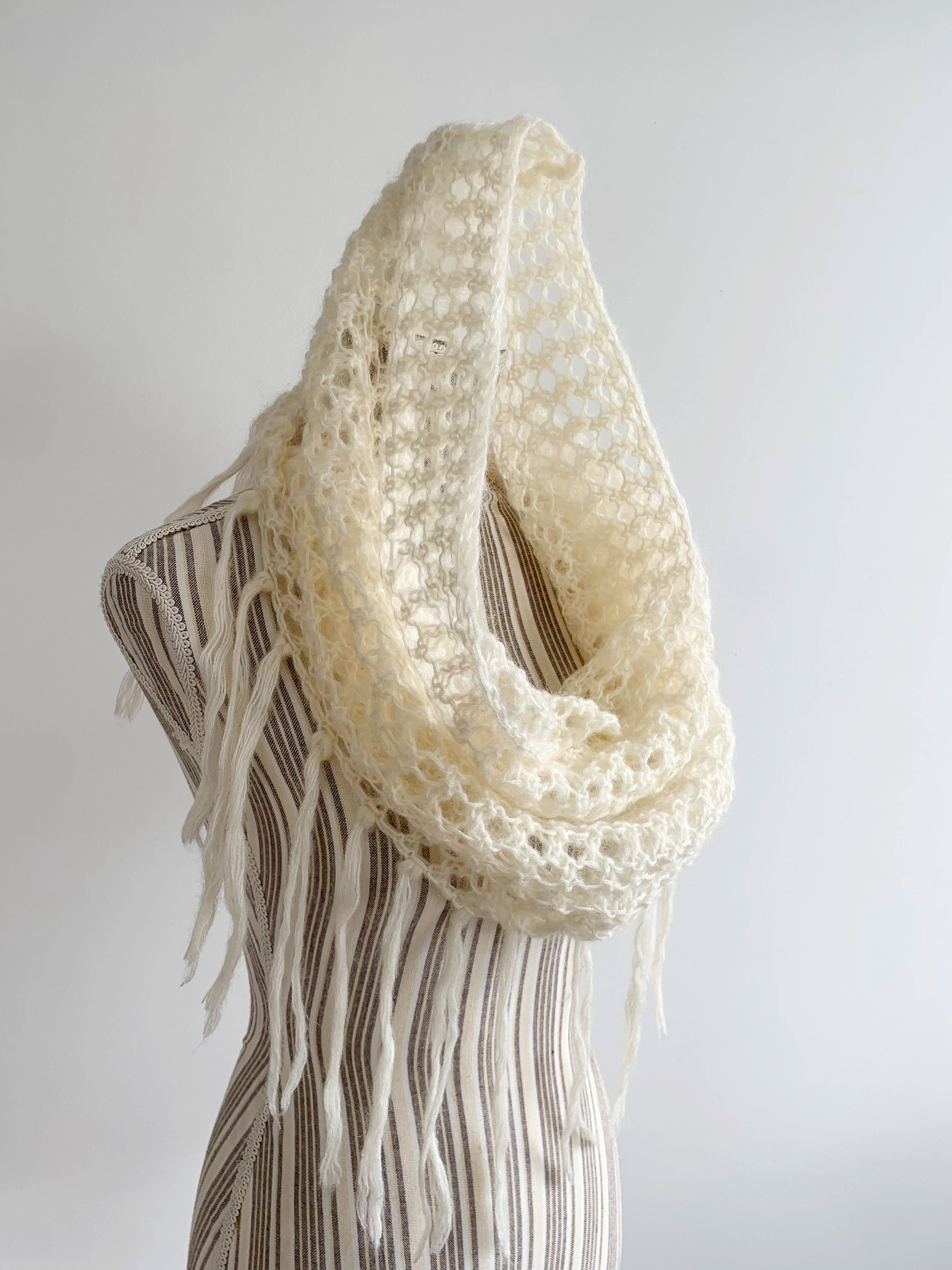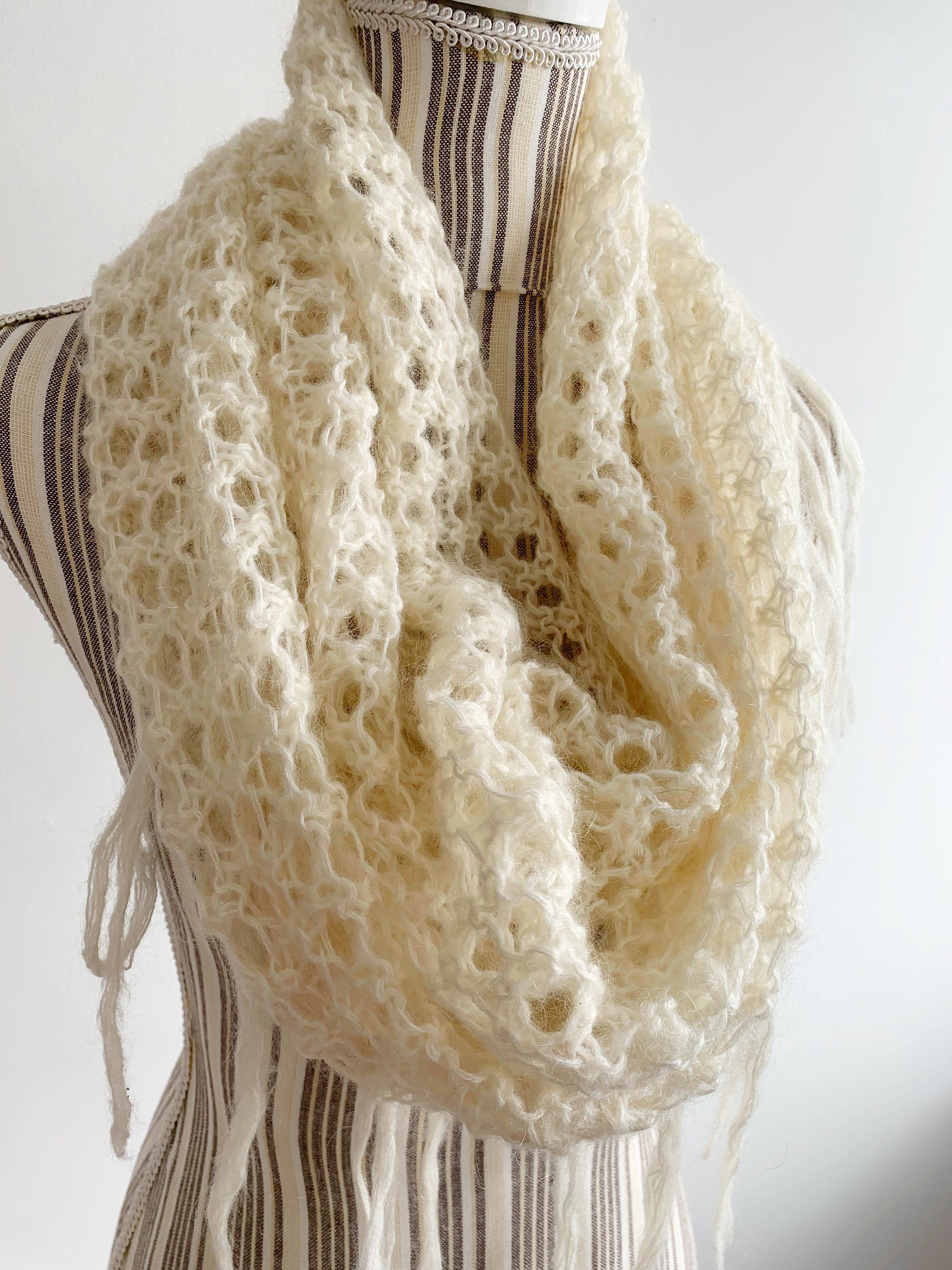 This is a beautiful vintage crochet neck collar in neutral off white color with lace detailing and fringe at the bottom. This adorable fluffy floral lace crochet turtleneck scarf is made of soft warm yarn which is a blend of 50% mohair, 50% acrylic. This pullover turtleneck scarf is perfect for the spring or fall season. It will keep you warm and stylish. This crochet cowl will add a pop of boho chic look to your outfits.