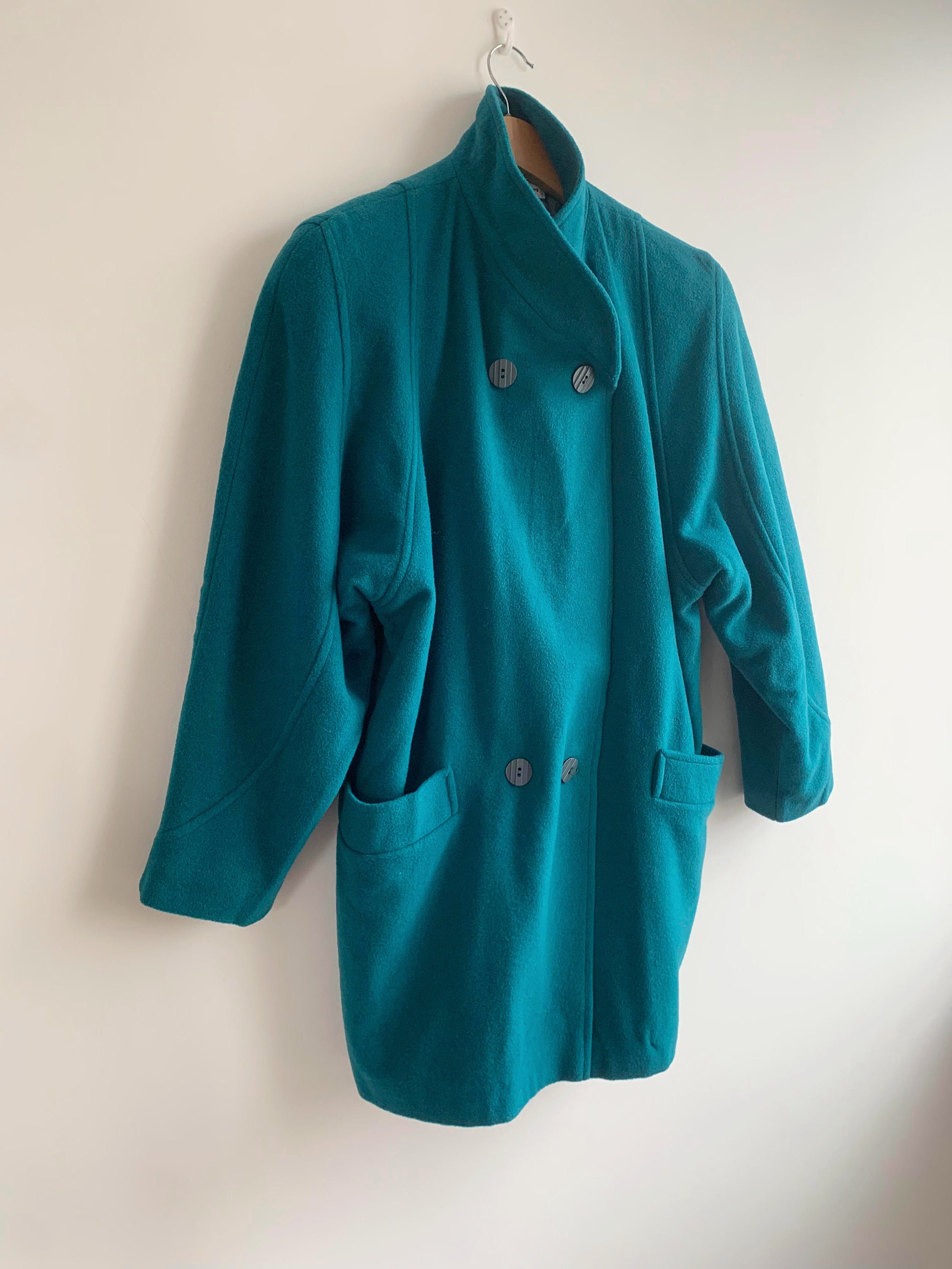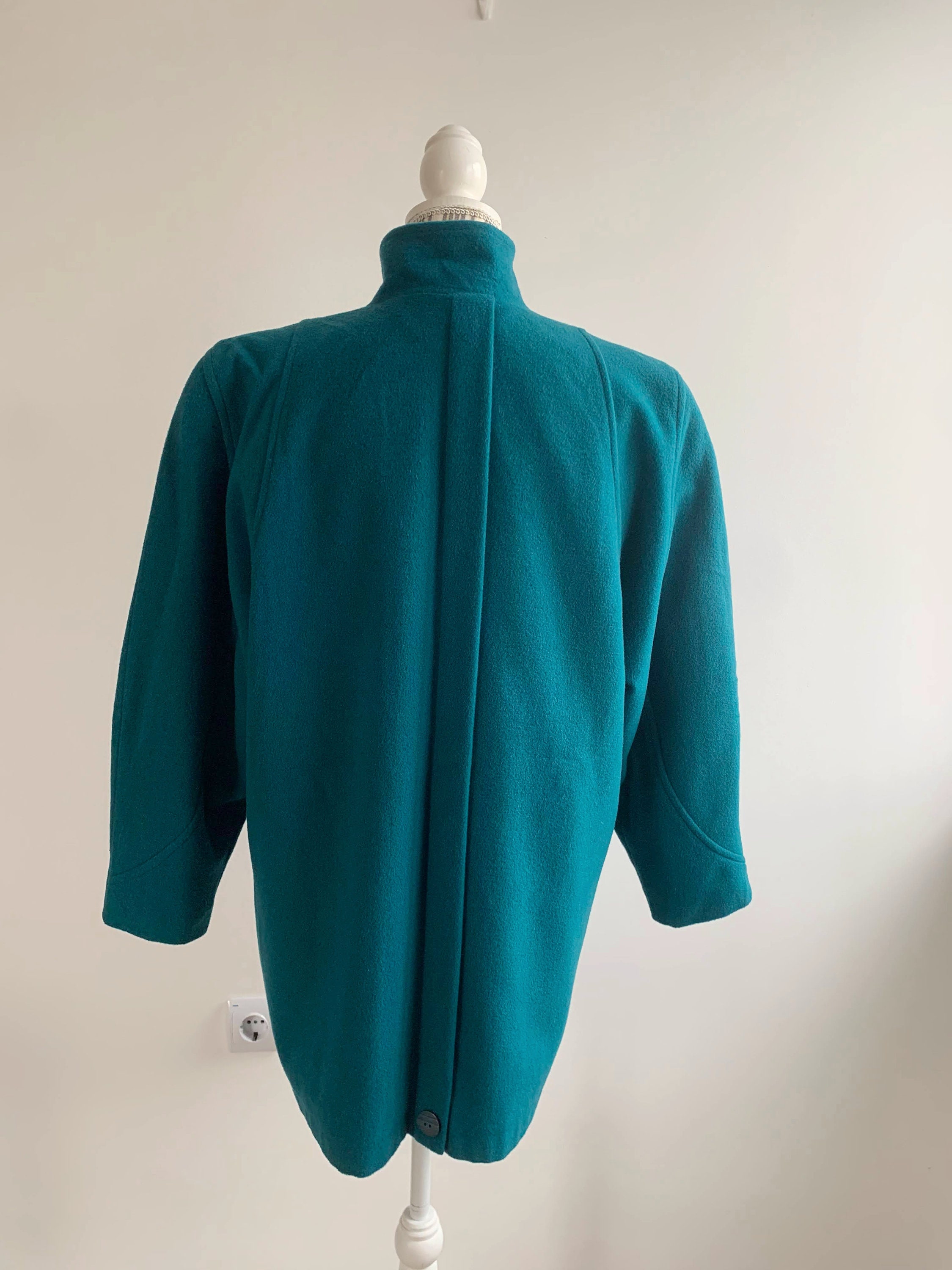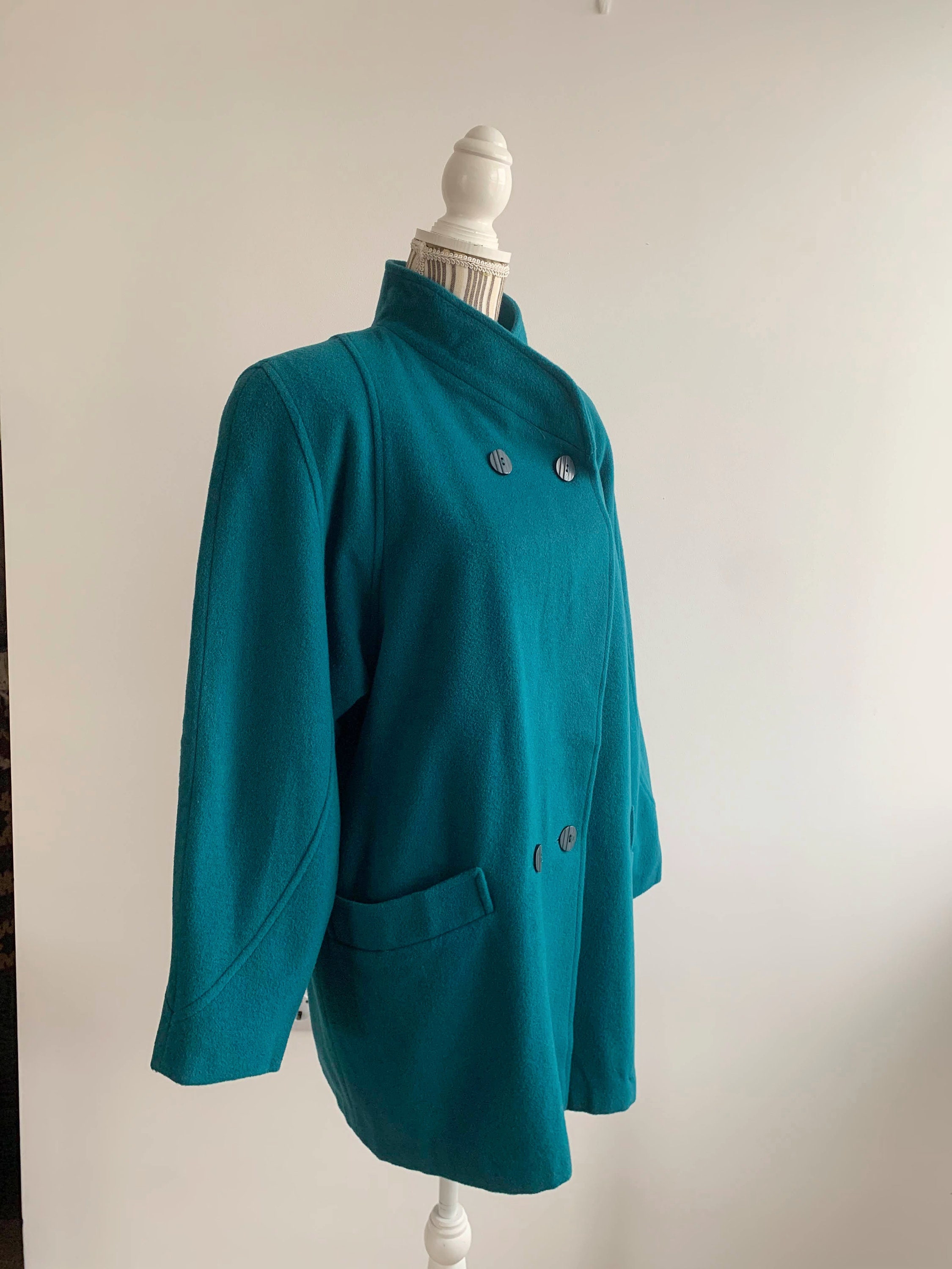 This is s beautiful vintage 90s wool blend coat for women by the brand Electre. This wool coat is in beautiful blue green turquoise color. This classic oversized jacket is made of 80% wool and 20% polyamide. The size marked on this slouchy loose fit coat is 36, which usually fits like size small, however this relaxed hight neck coat is quire baggy and oversized and it fits like size L or XL. Please check the measurements below.