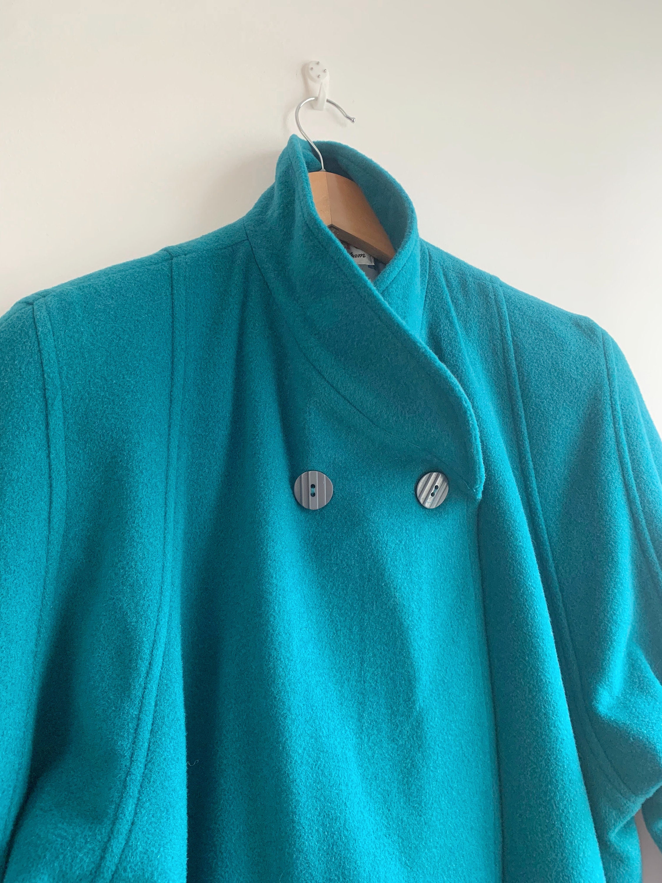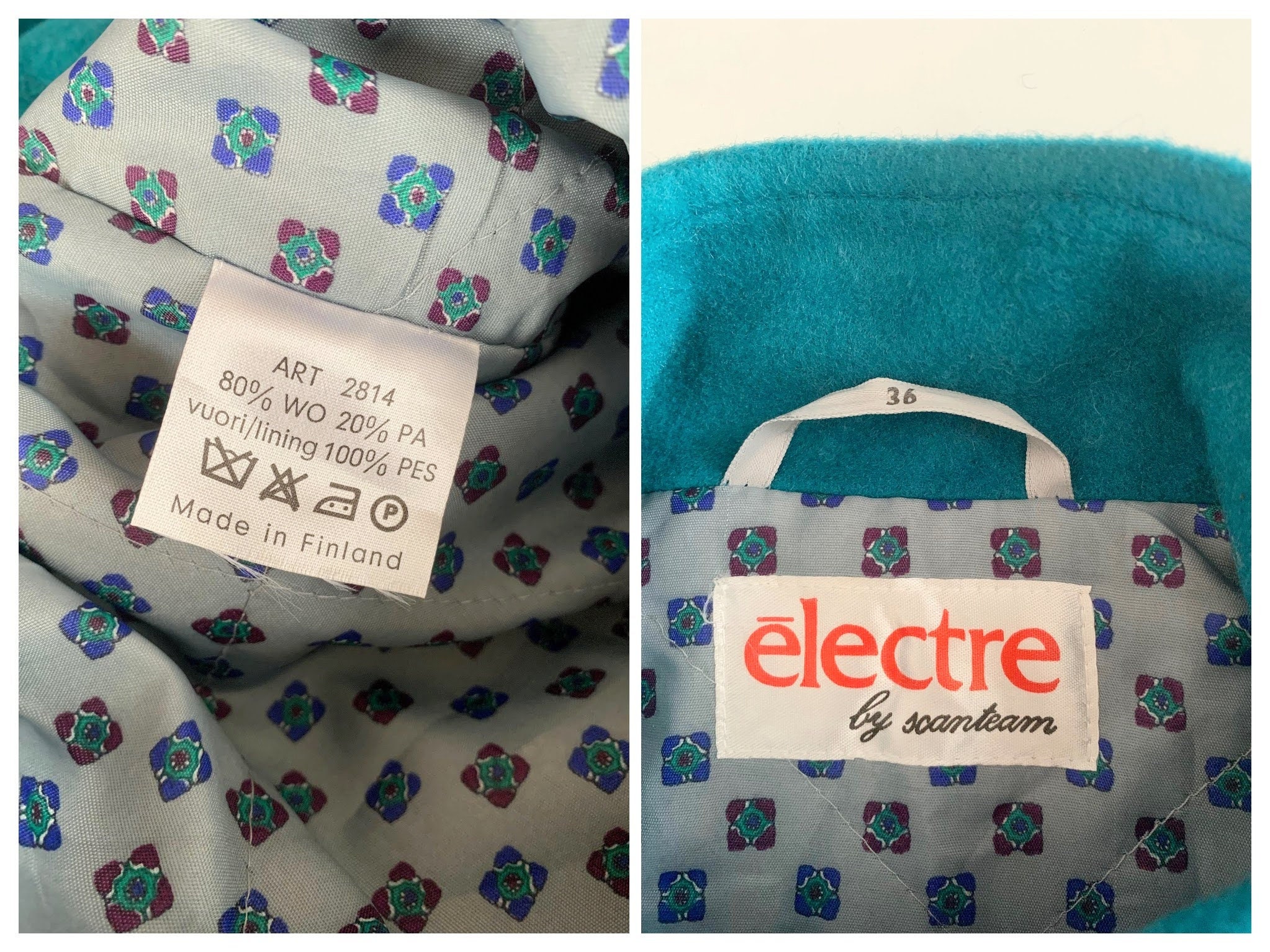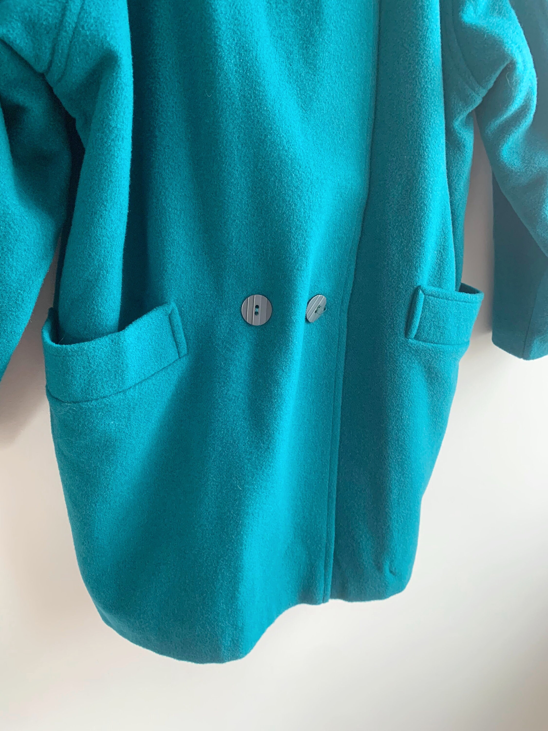 This is s beautiful vintage 90s wool blend coat for women by the brand Electre. This wool coat is in beautiful blue green turquoise color. This classic oversized jacket is made of 80% wool and 20% polyamide. The size marked on this slouchy loose fit coat is 36, which usually fits like size small, however this relaxed hight neck coat is quire baggy and oversized and it fits like size L or XL. Please check the measurements below.