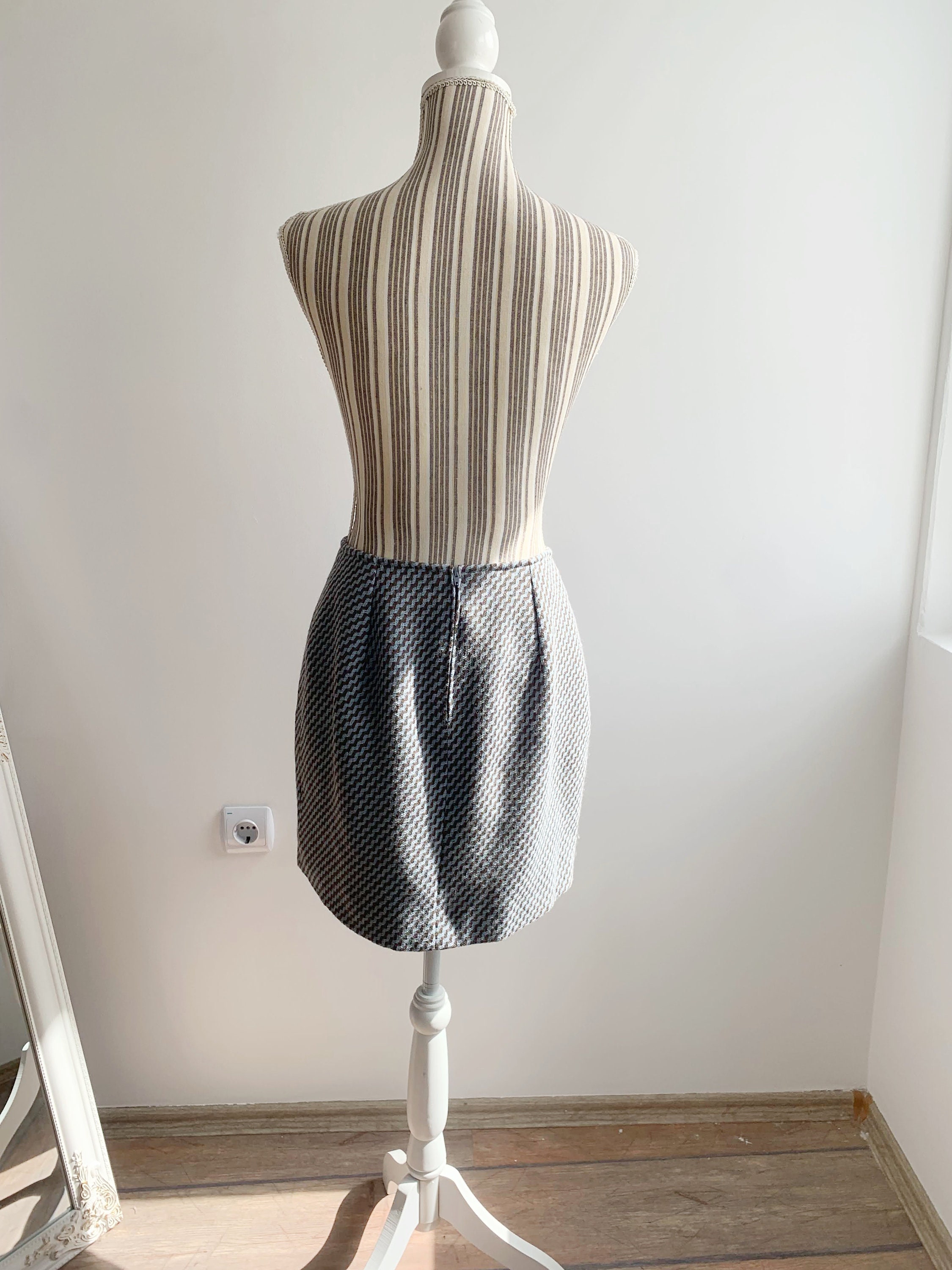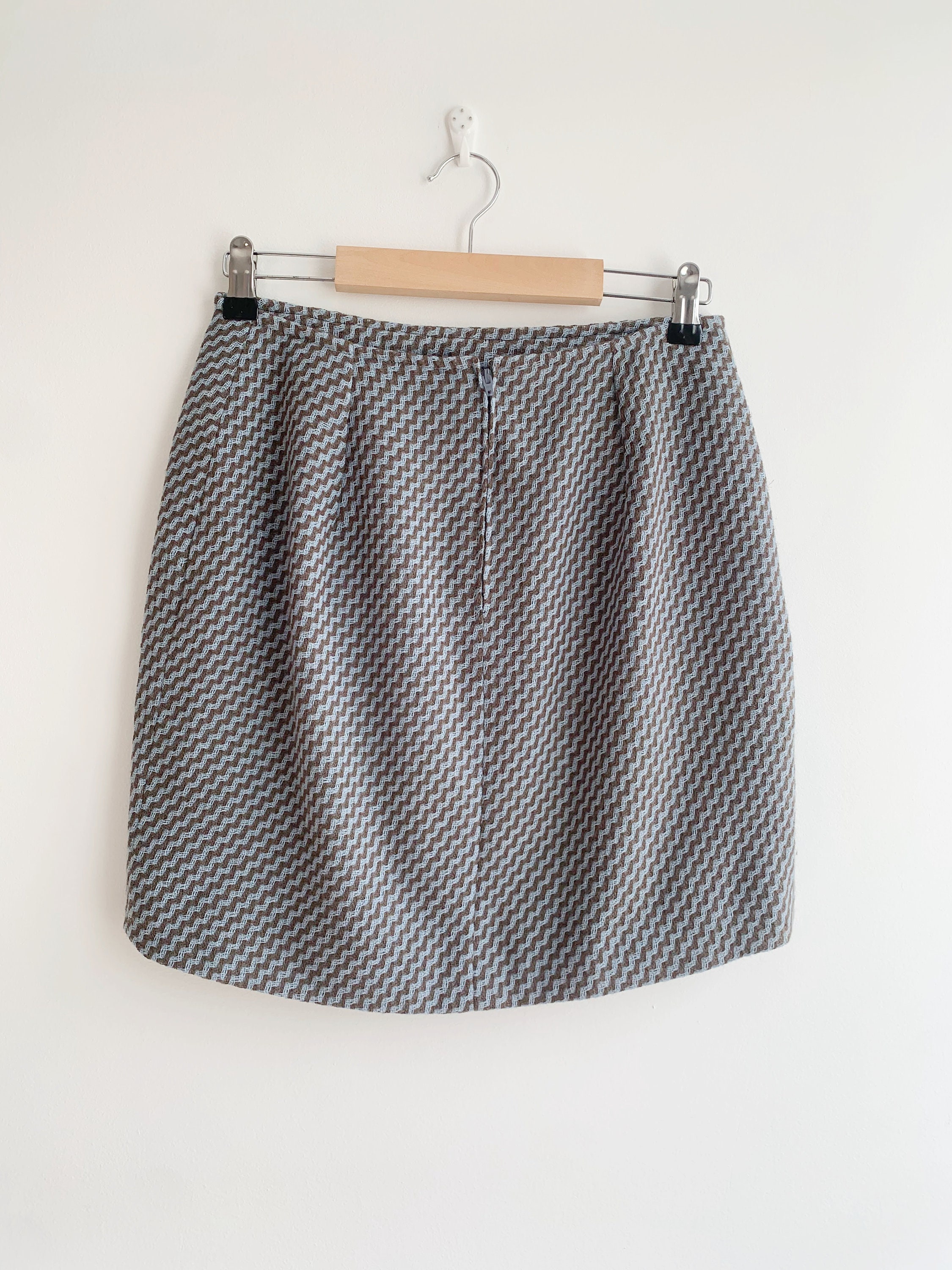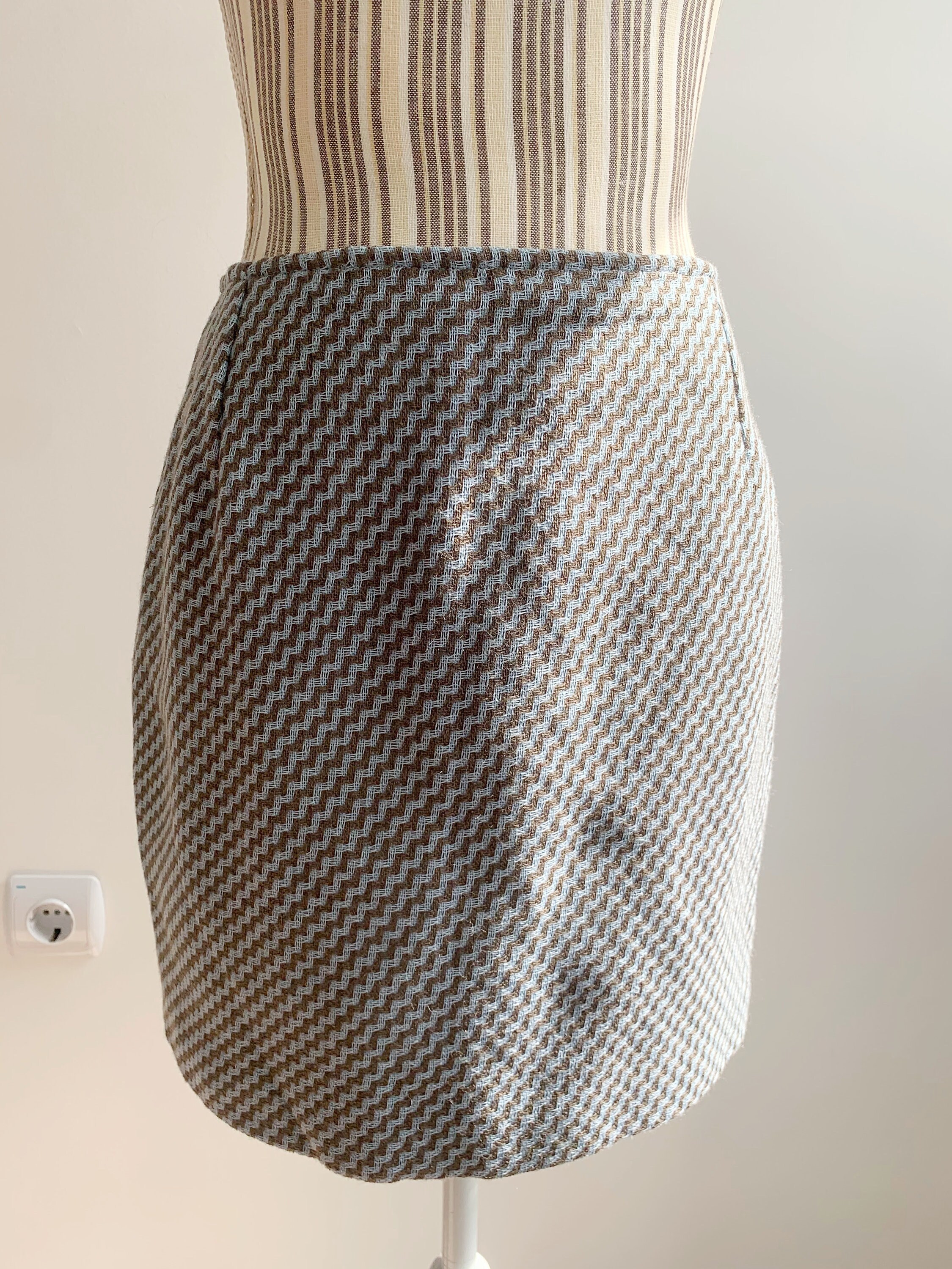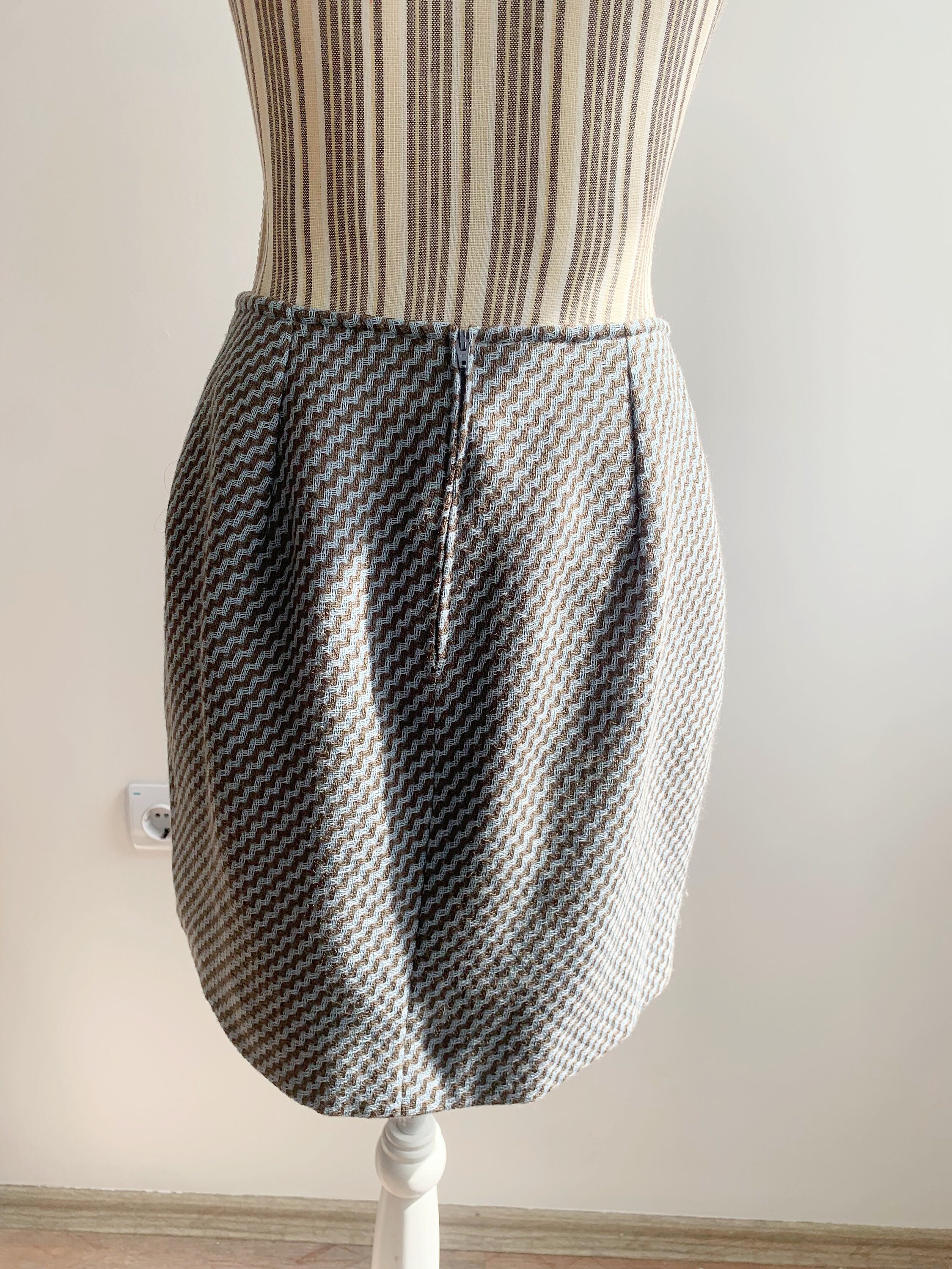 Beautiful vintage handmade short wool skirt, made of beautiful woven wool fabric in taupe brown and light blue. This short wool skirt has polyester lining underneath. As this short wool skirt was handmade, there is no size marked. It fits like size S M. Please check the measurements below:
