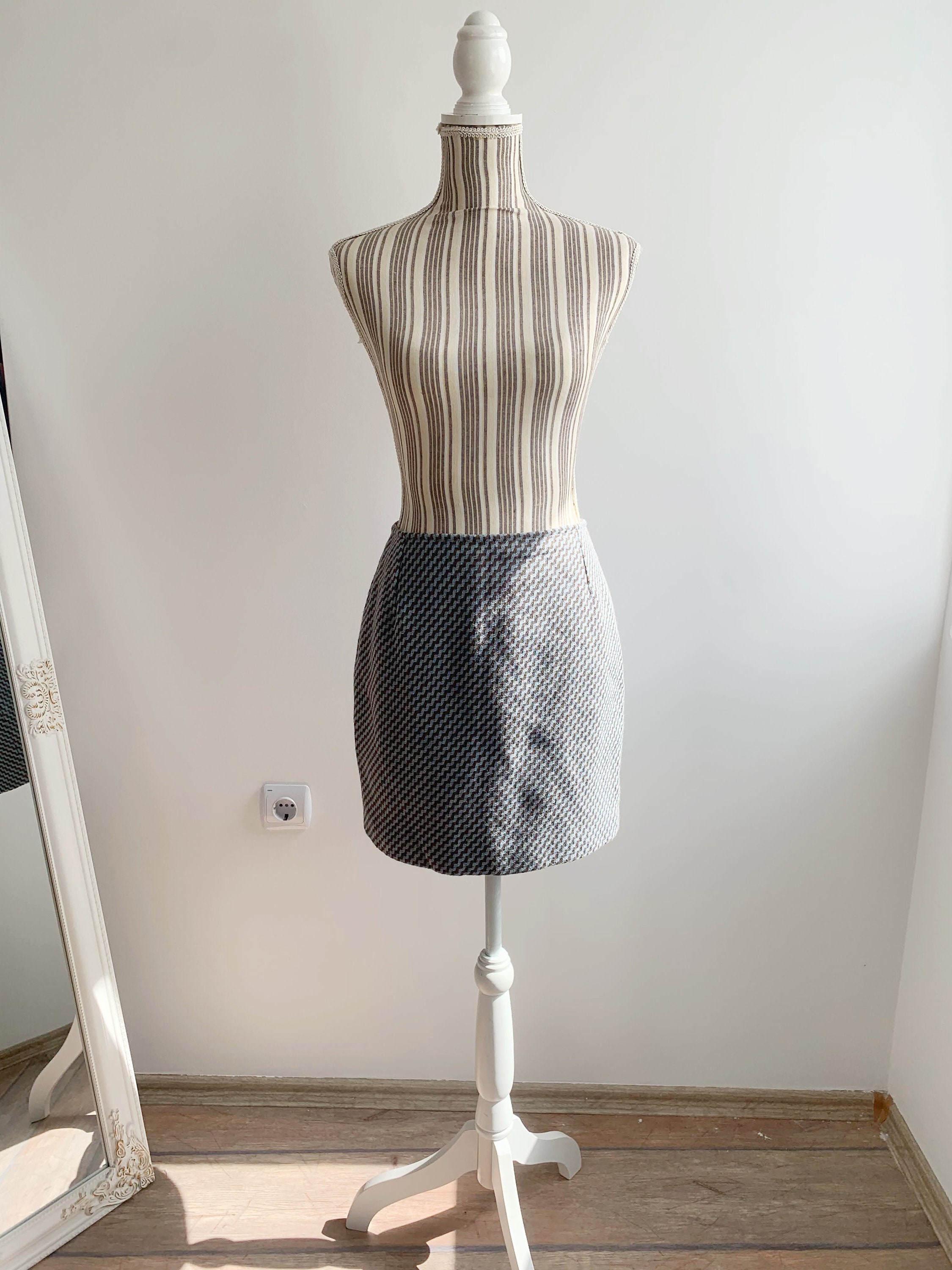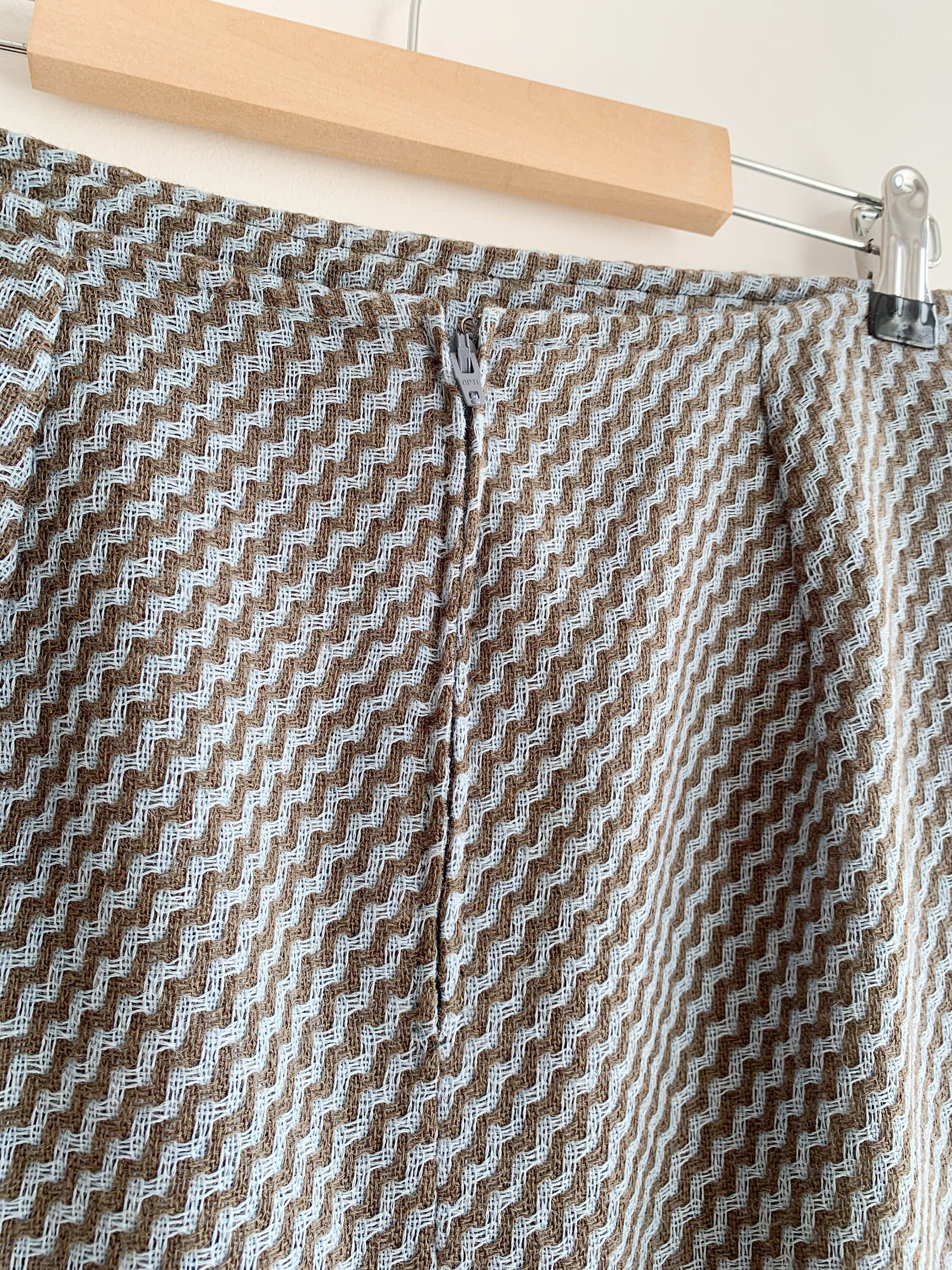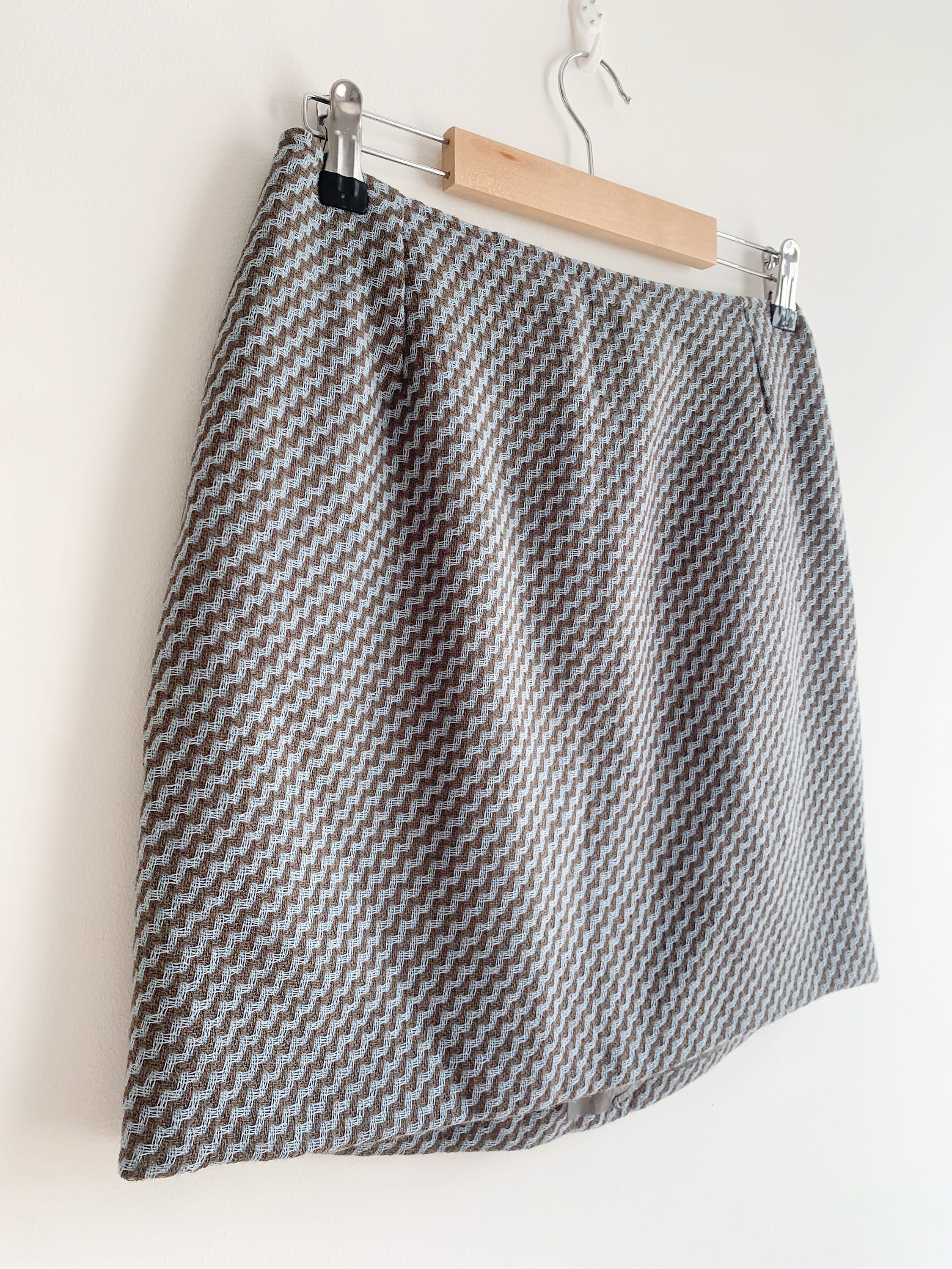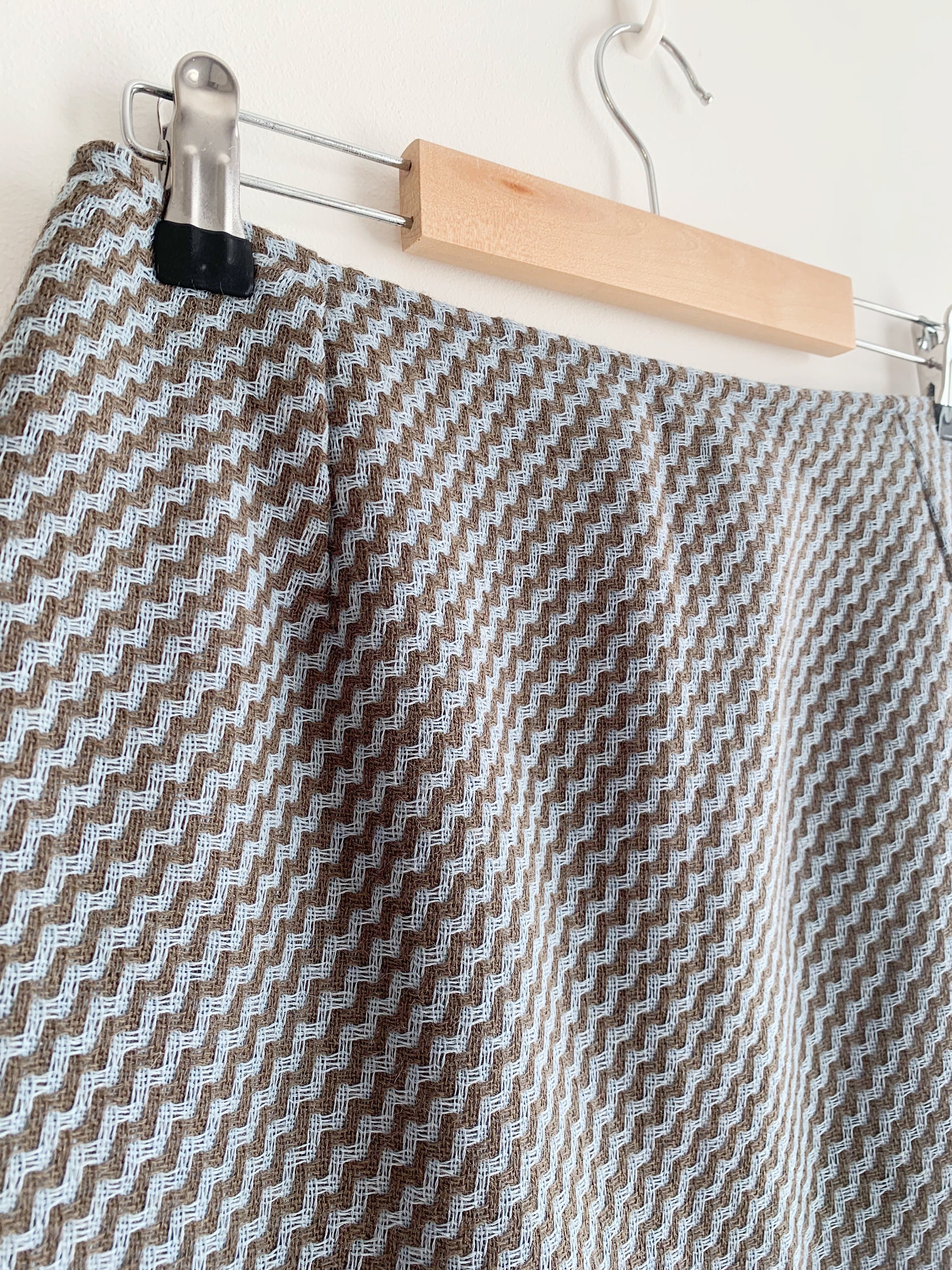 Beautiful vintage handmade short wool skirt, made of beautiful woven wool fabric in taupe brown and light blue. This short wool skirt has polyester lining underneath. As this short wool skirt was handmade, there is no size marked. It fits like size S M. Please check the measurements below: