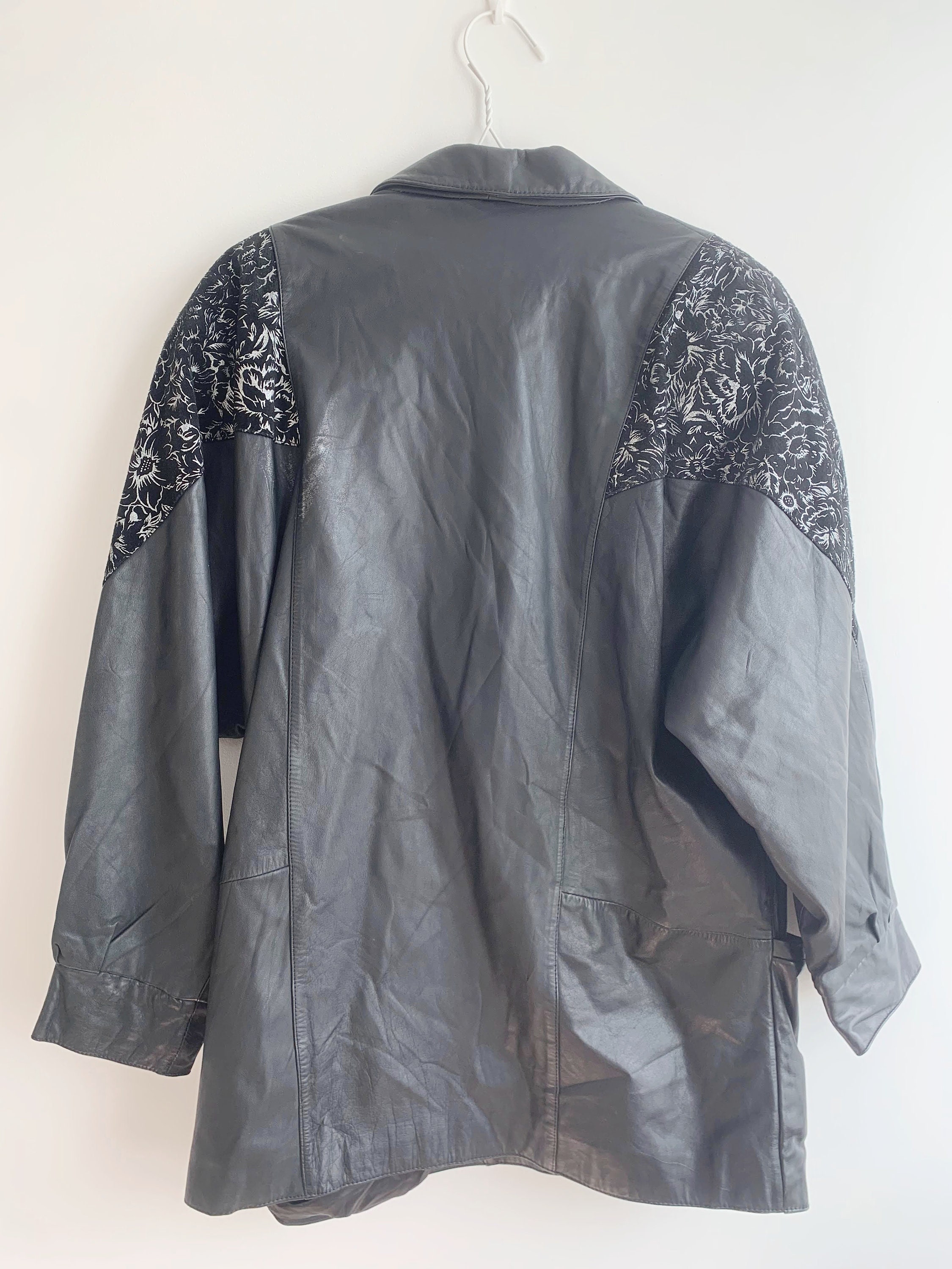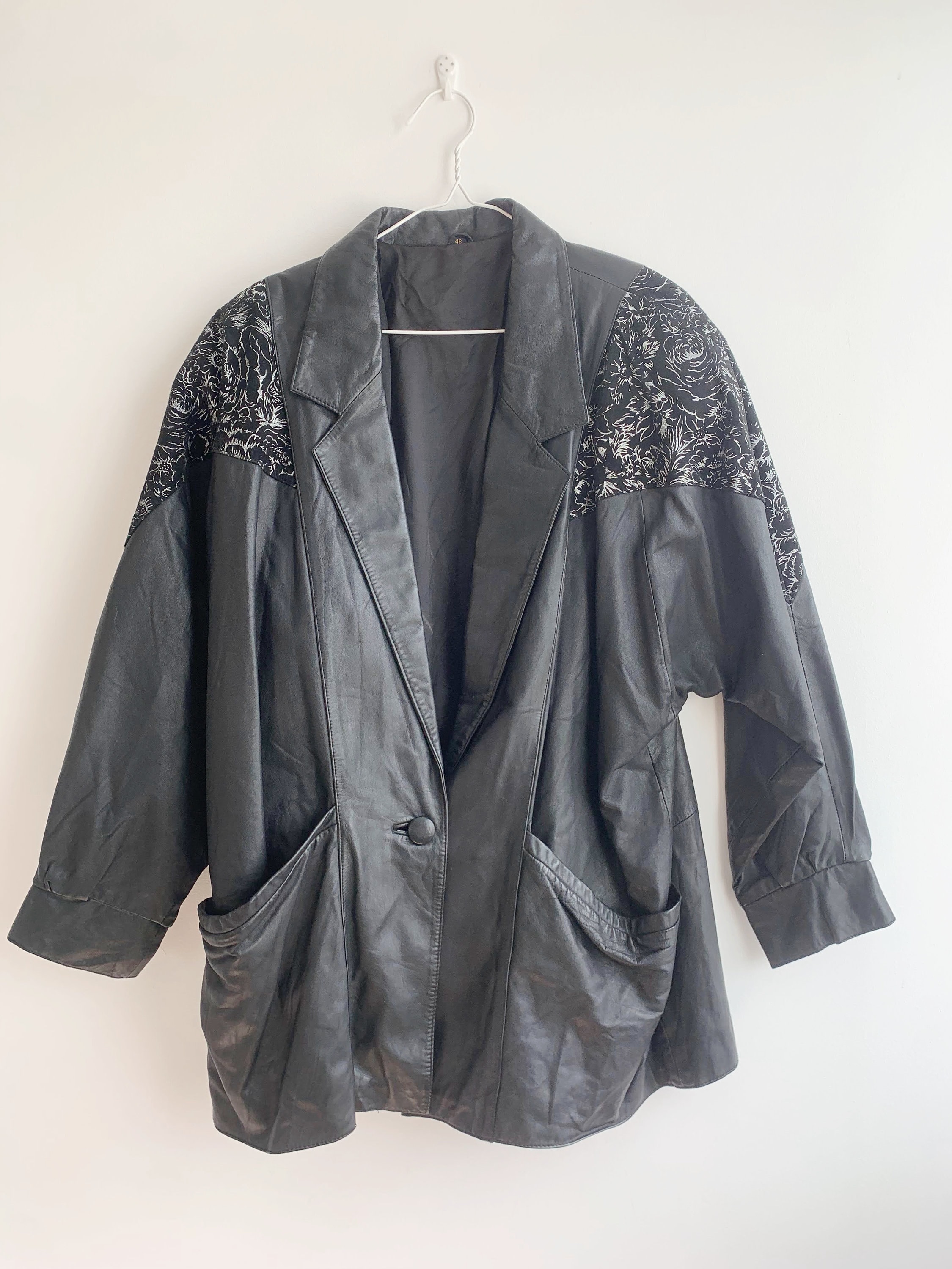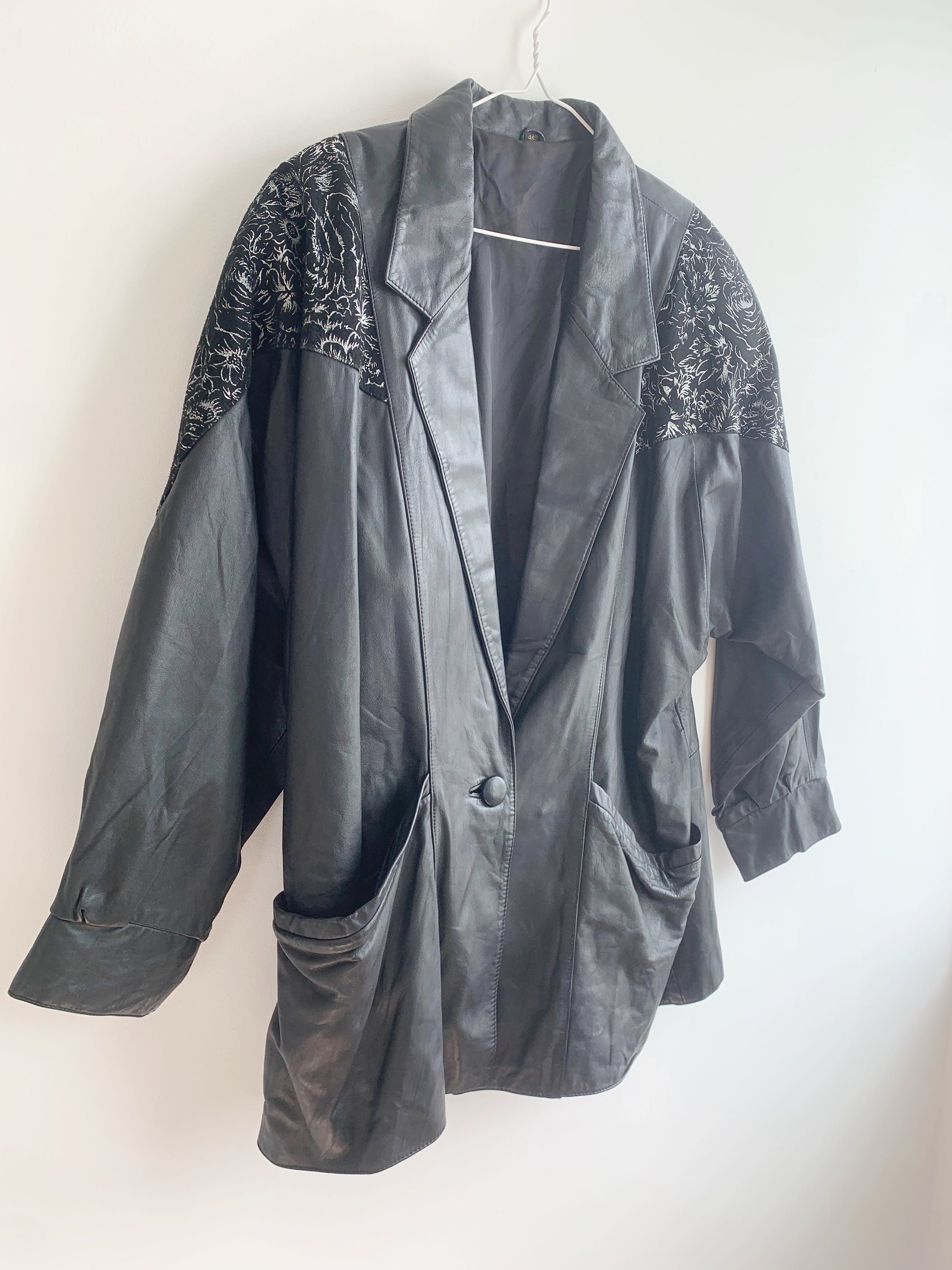 This is a vintage 90s oversized leather jacket for women size 46 L. This relaxed fit baggy natural leather jacket has wide shoulders and statement silver floral detailing around the shoulders. It has wide sleeves and loose fit silhouette. This long oversized leather jacket has button front closure and two front pockets. This black leather jacket has polyester lining. This plus size leather jacket is size 46, it fits like size L. Please check the measurements below.
