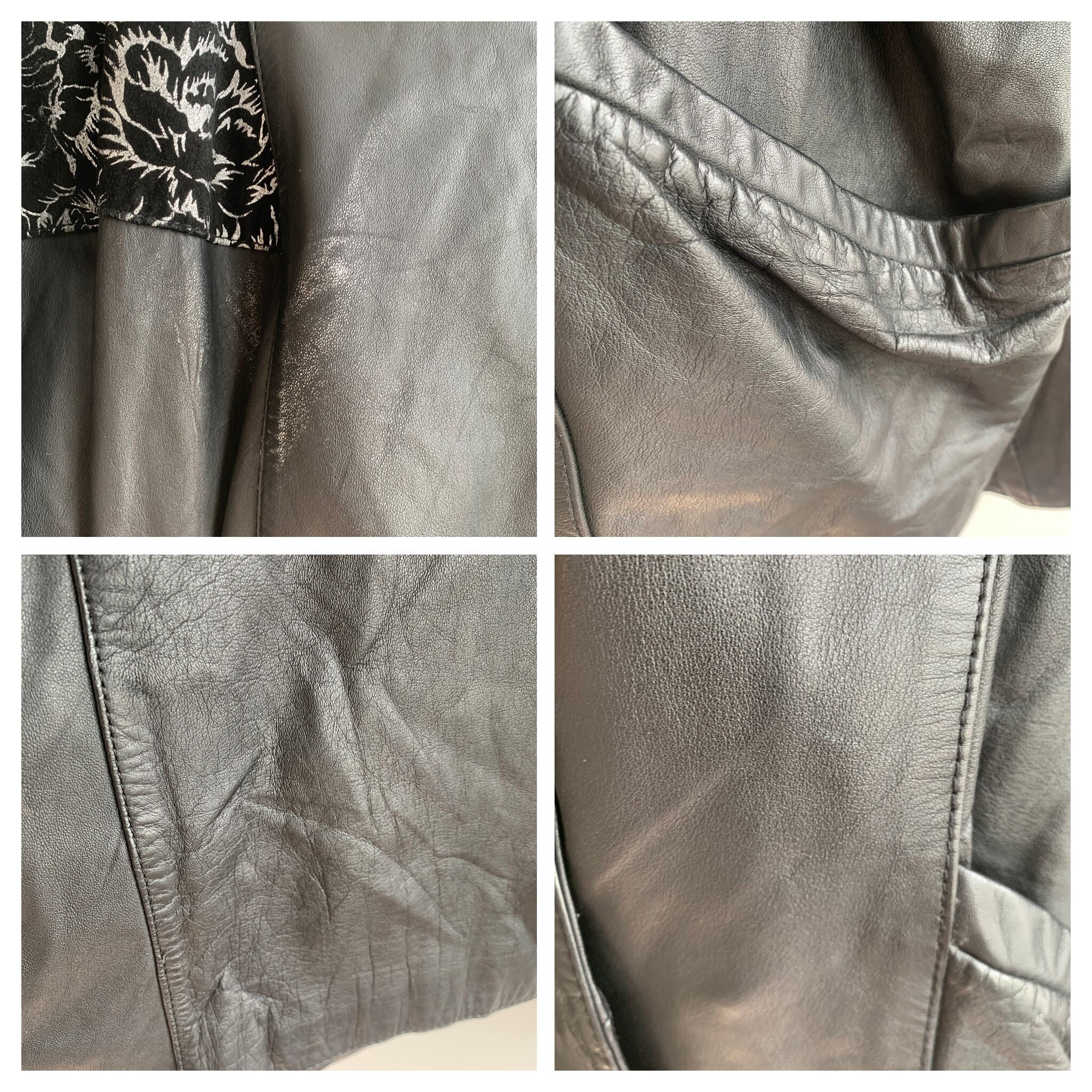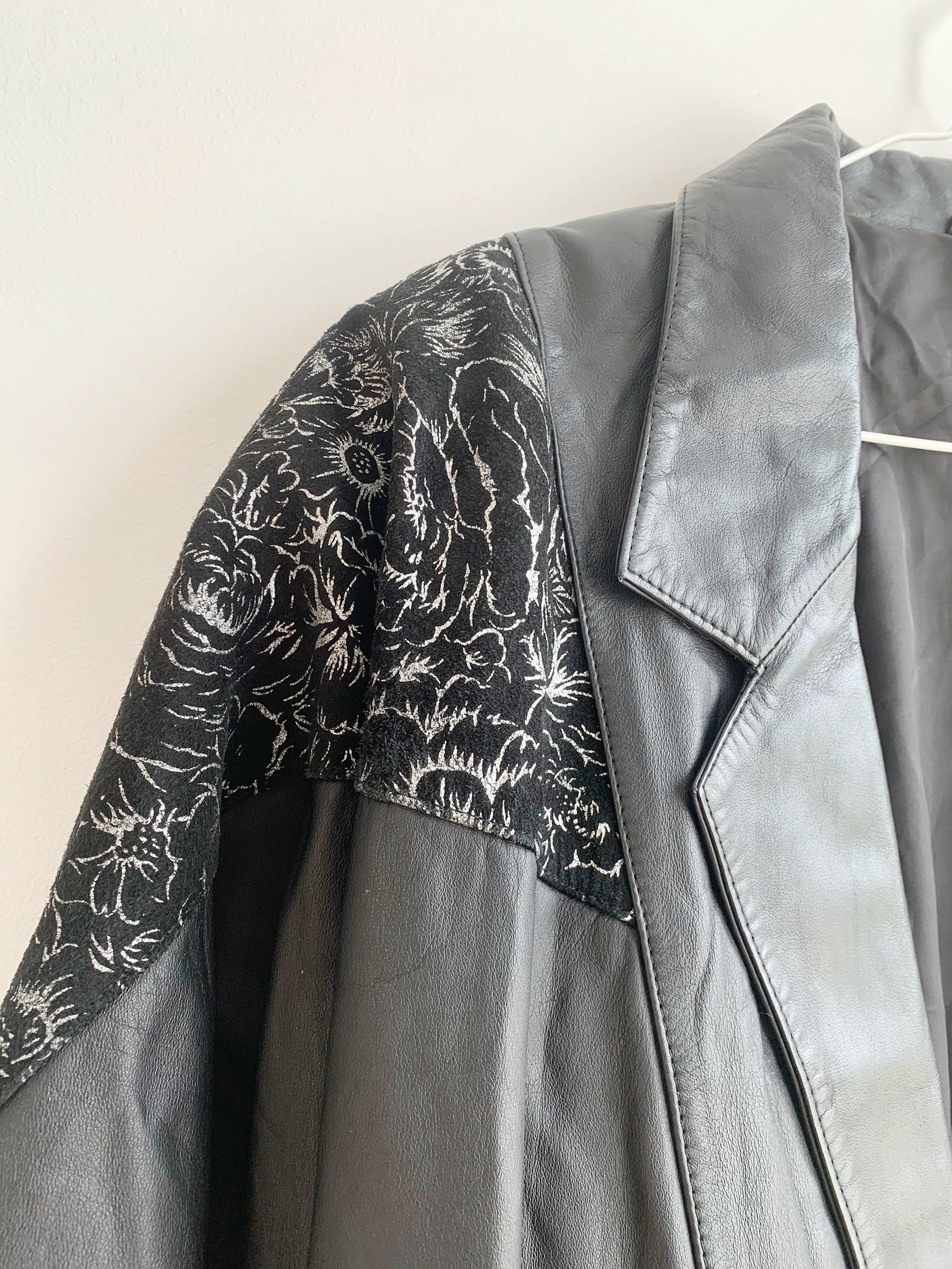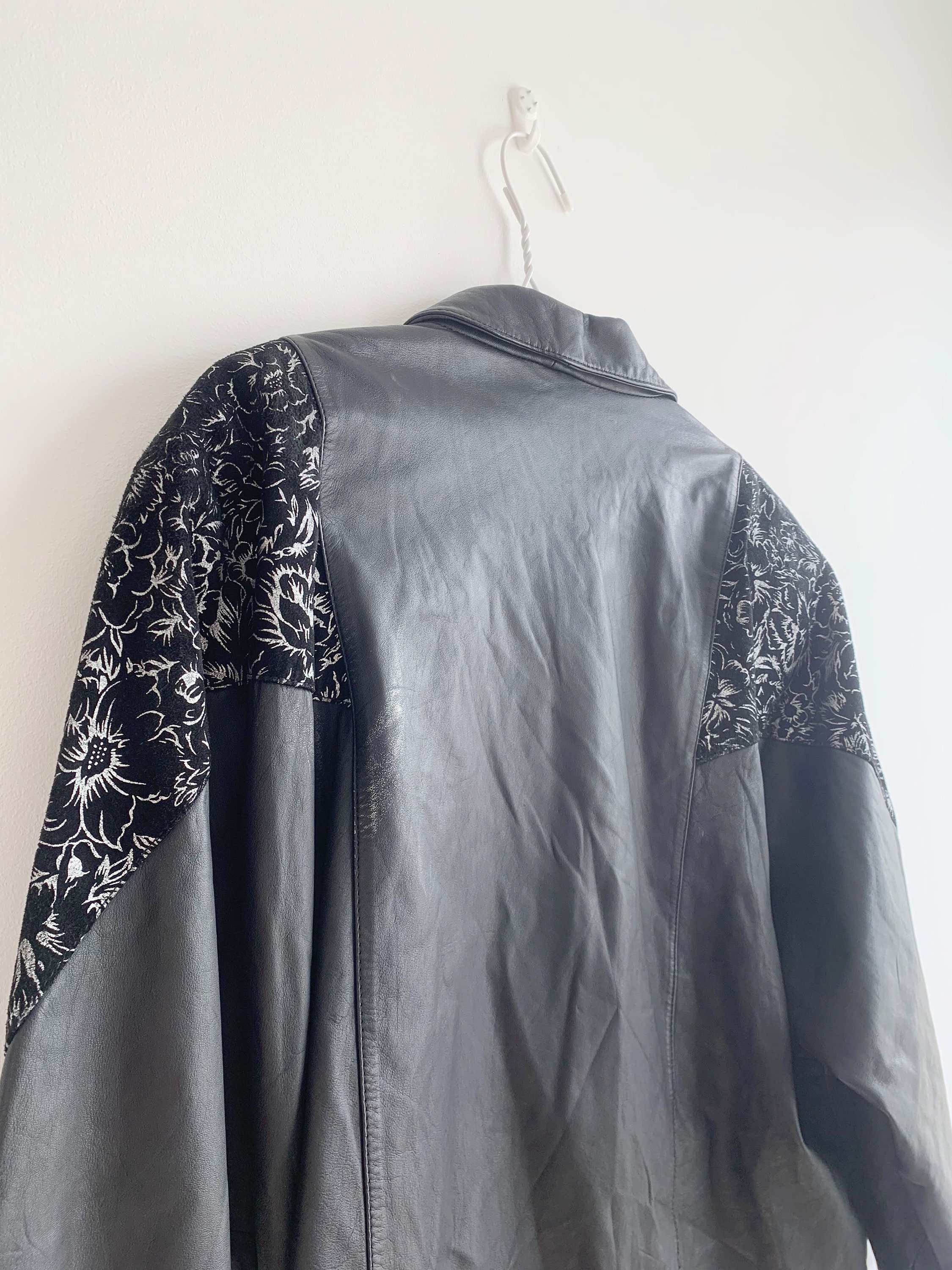 This is a vintage 90s oversized leather jacket for women size 46 L. This relaxed fit baggy natural leather jacket has wide shoulders and statement silver floral detailing around the shoulders. It has wide sleeves and loose fit silhouette. This long oversized leather jacket has button front closure and two front pockets. This black leather jacket has polyester lining. This plus size leather jacket is size 46, it fits like size L. Please check the measurements below.