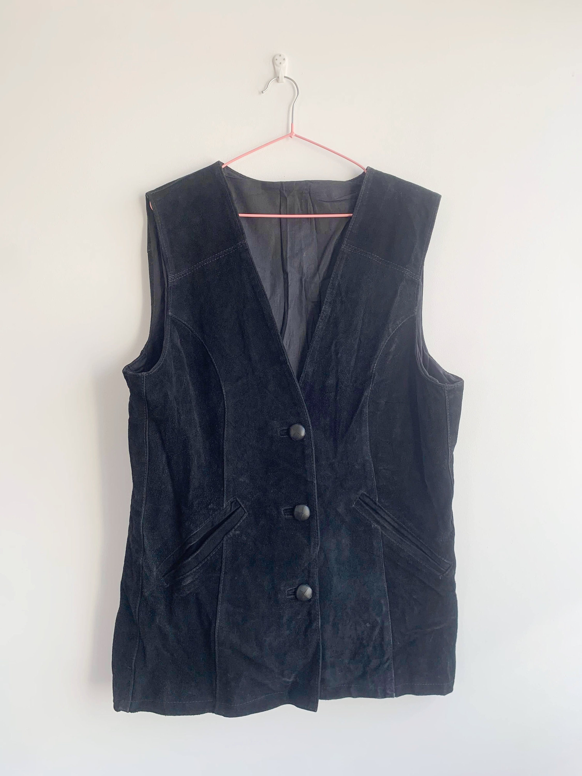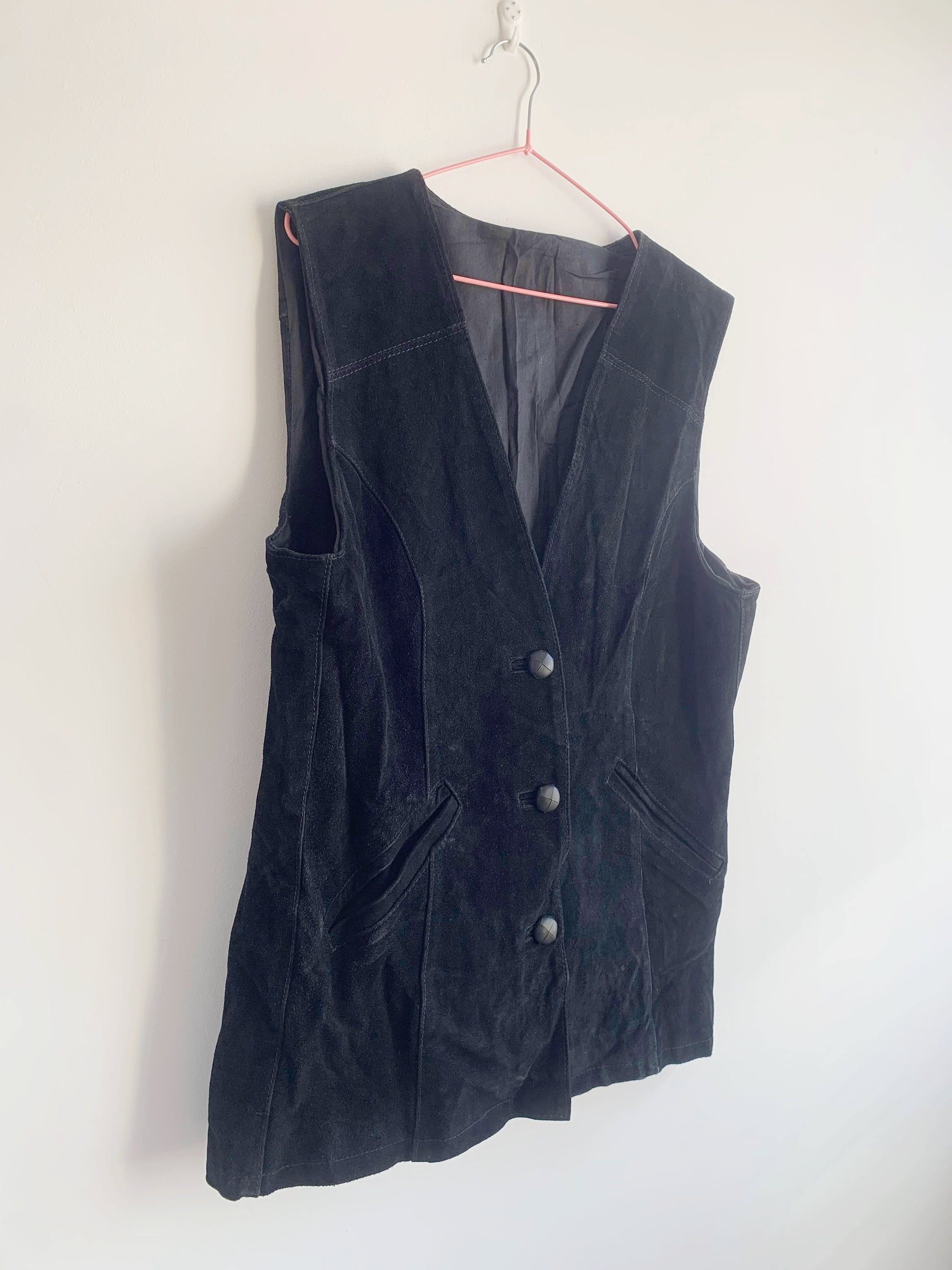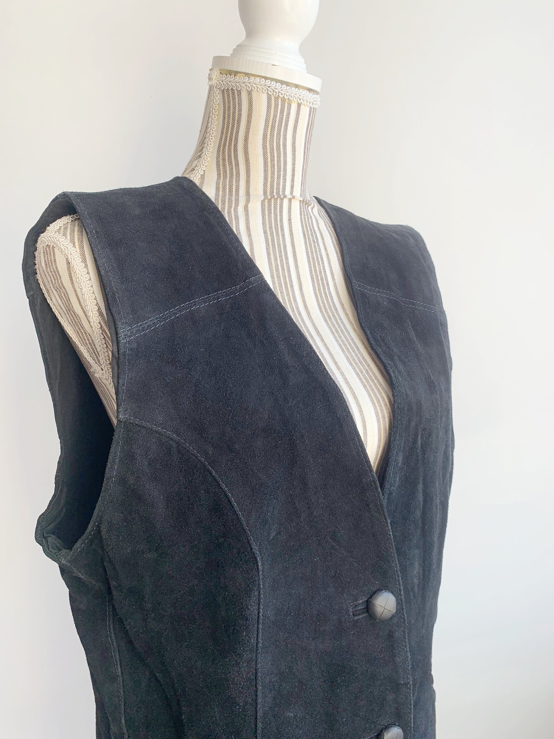This is a vintage 80s black heavy real suede leather vest for women with button front closure with leather buttons. This black suede vest has black cotton lining. There is no tag or label. It fits like sizer L/ XL women's. Please check the measurements below.