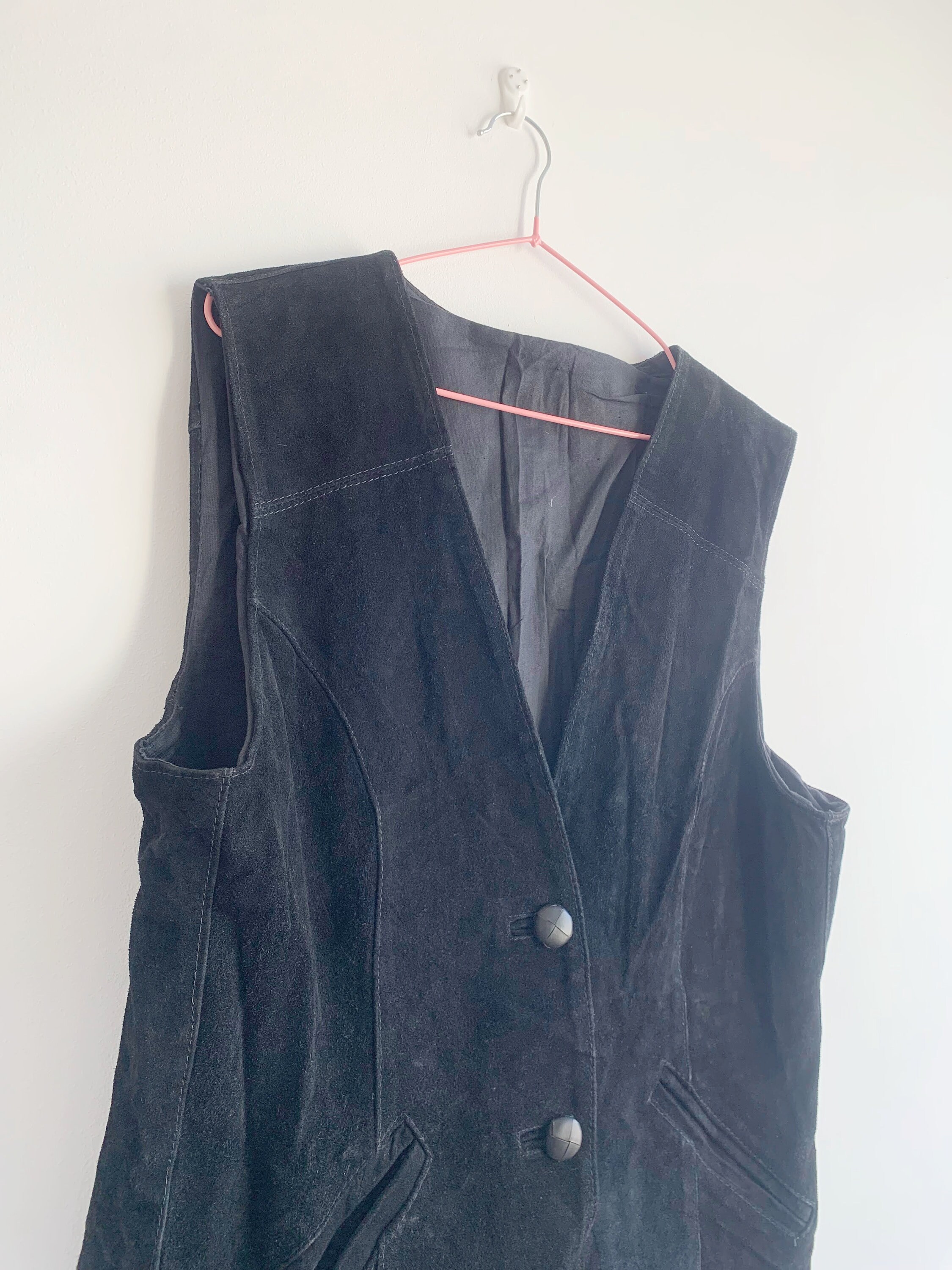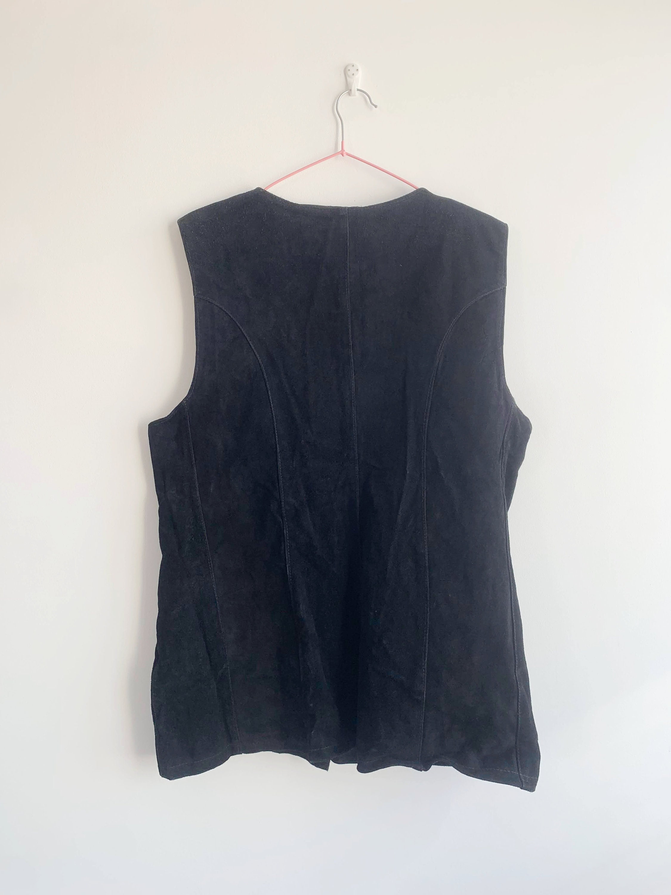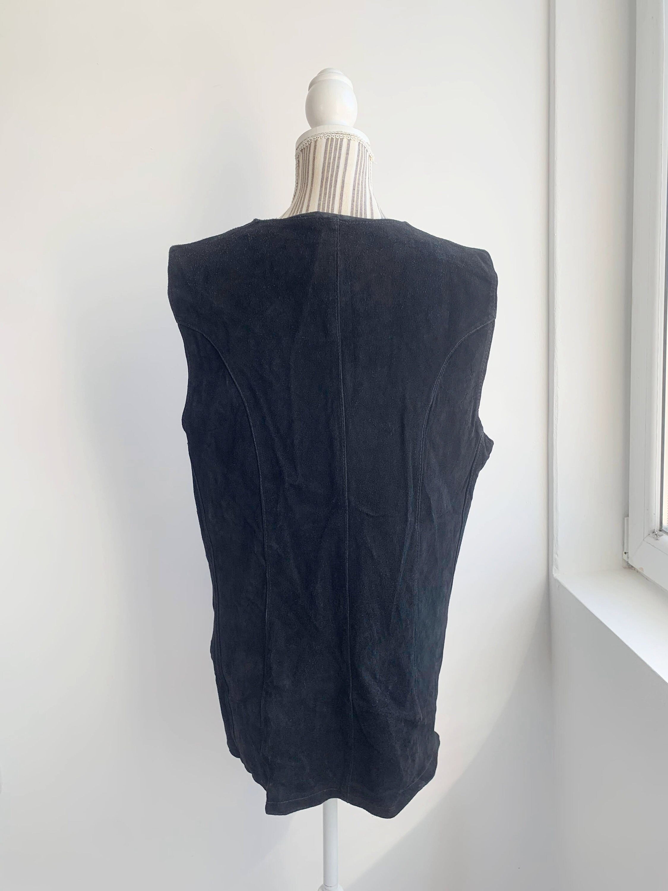 This is a vintage 80s black heavy real suede leather vest for women with button front closure with leather buttons. This black suede vest has black cotton lining. There is no tag or label. It fits like sizer L/ XL women's. Please check the measurements below.
