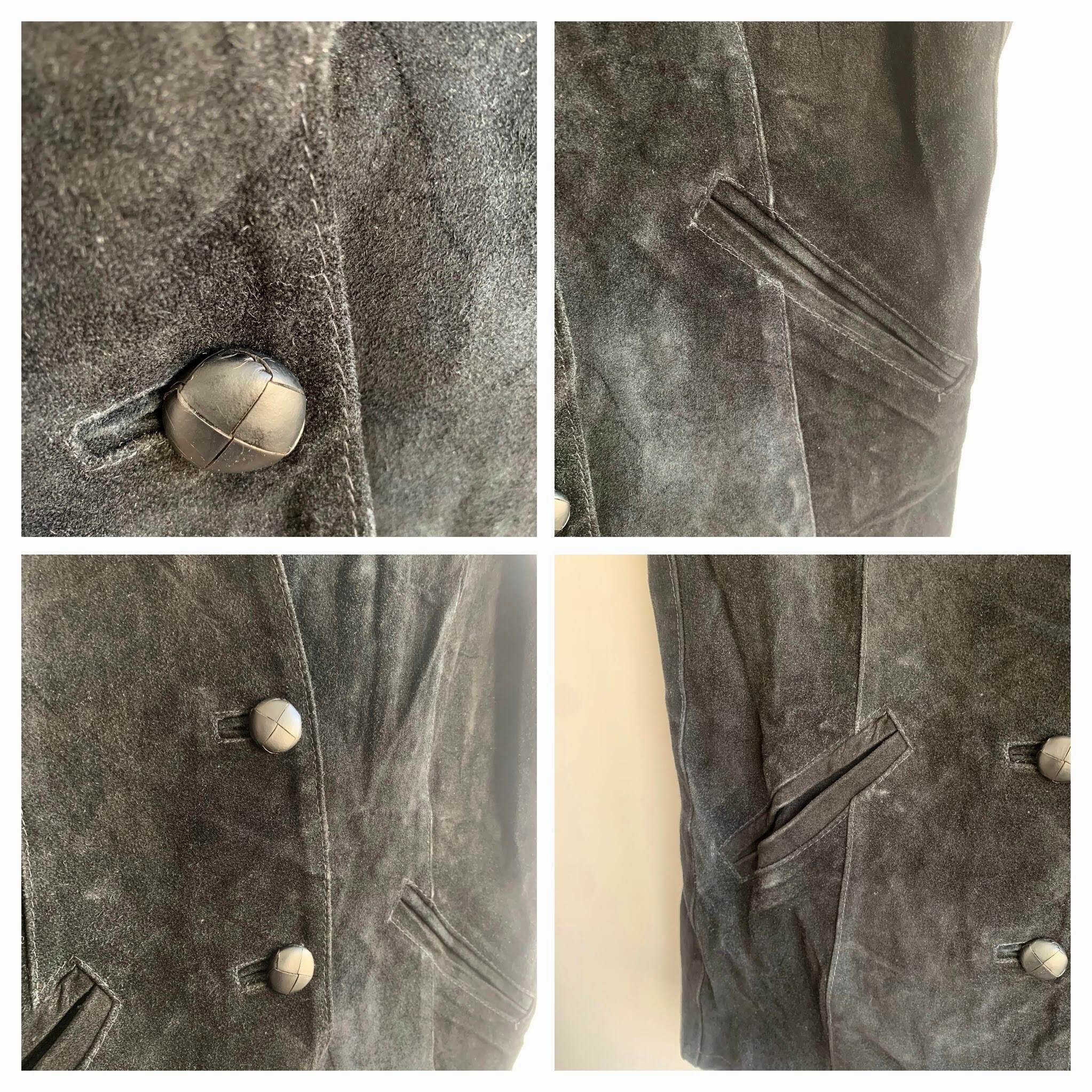 Condition: the real suede leather has a distressed look with come creases and marks on the suede leather surface. The leather buttons how some cracks around the edges, which I have tried to capture in the close up photos.