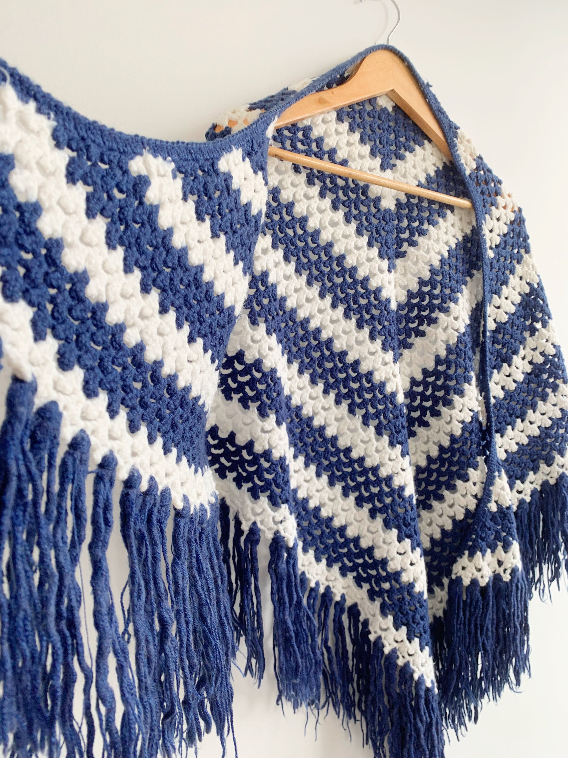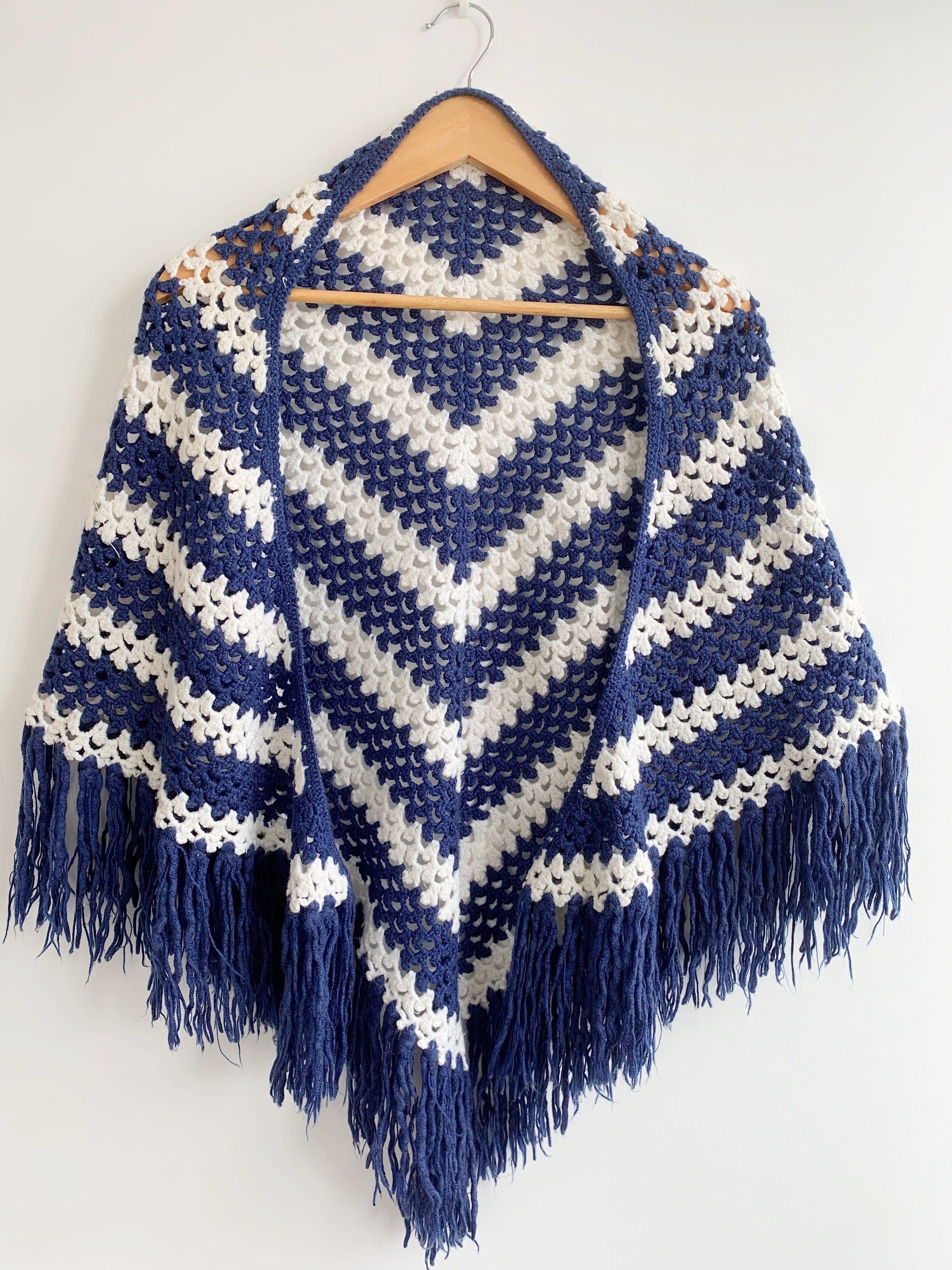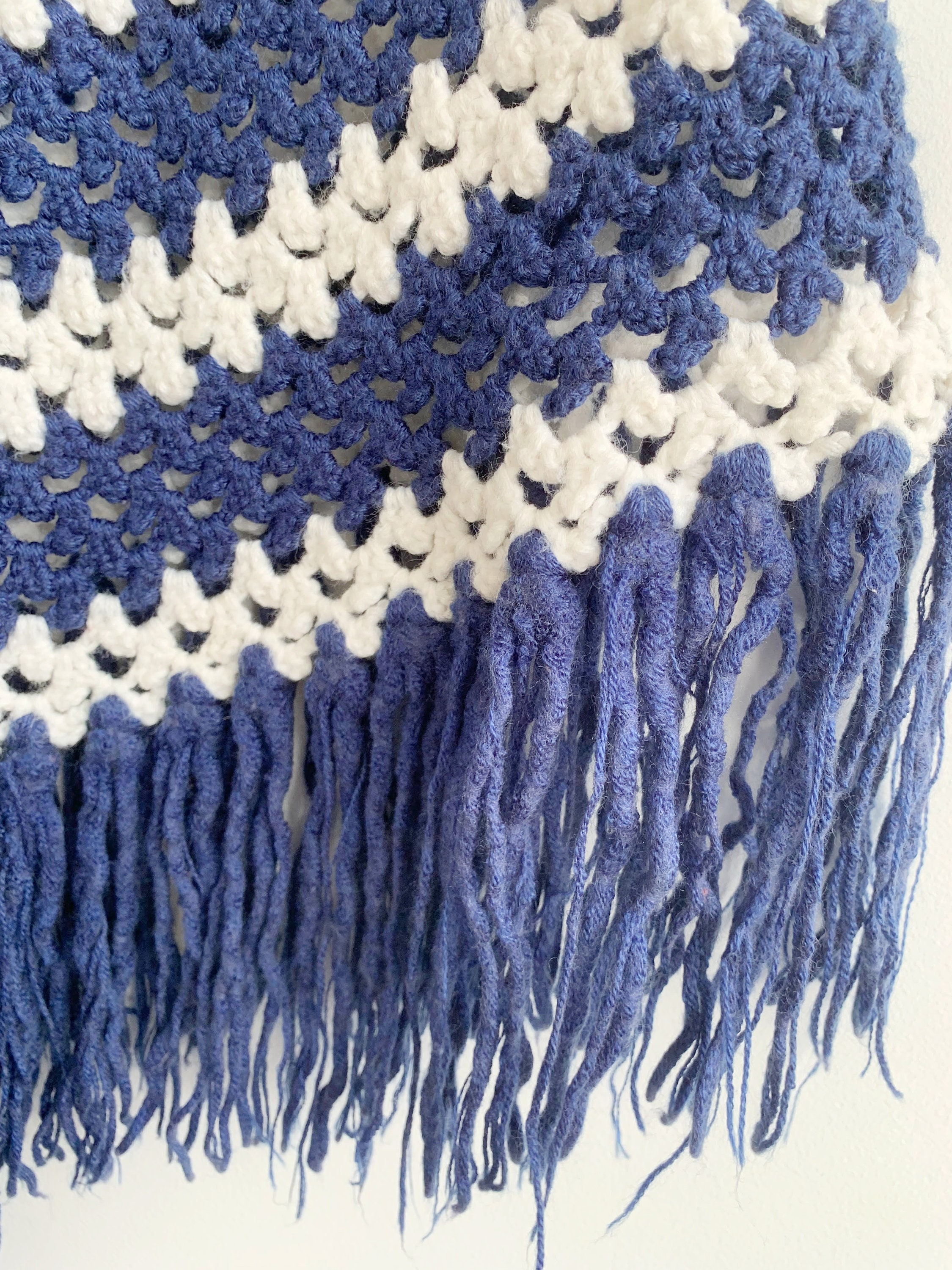 This is a vintage 80s handmade crochet lace shawl with tassels in navy blue and white color. This fringed shawl is made of chunky cozy warm yarn which feels like acrylic wool blend. This boho triangle shawl can be worn as a shoulder wrap shawl or as a bib scarf. Beautiful striped piano shawl that will be the perfect retro accessory for your outfit. Amazing sustainable gift for a vintage lover.