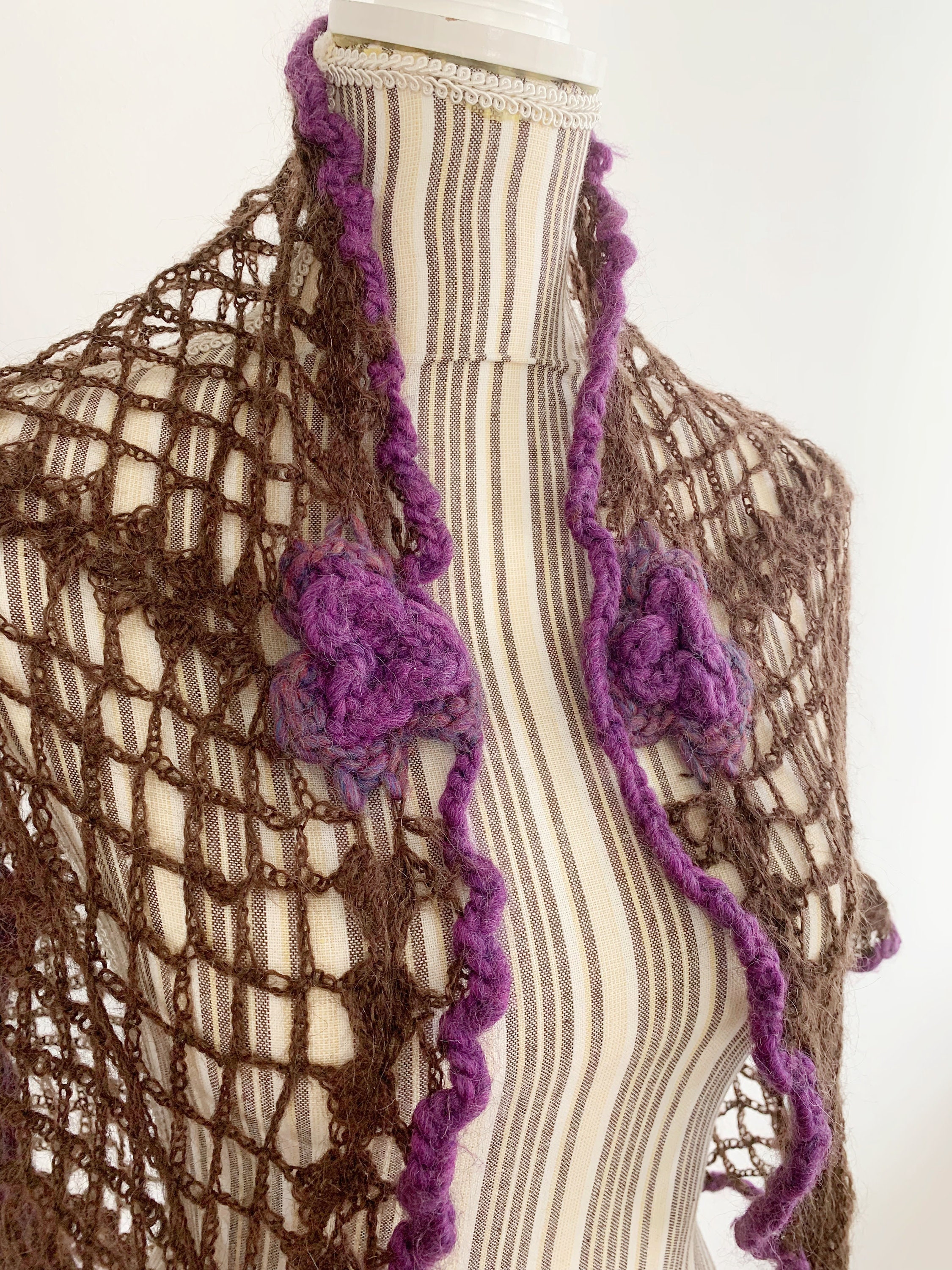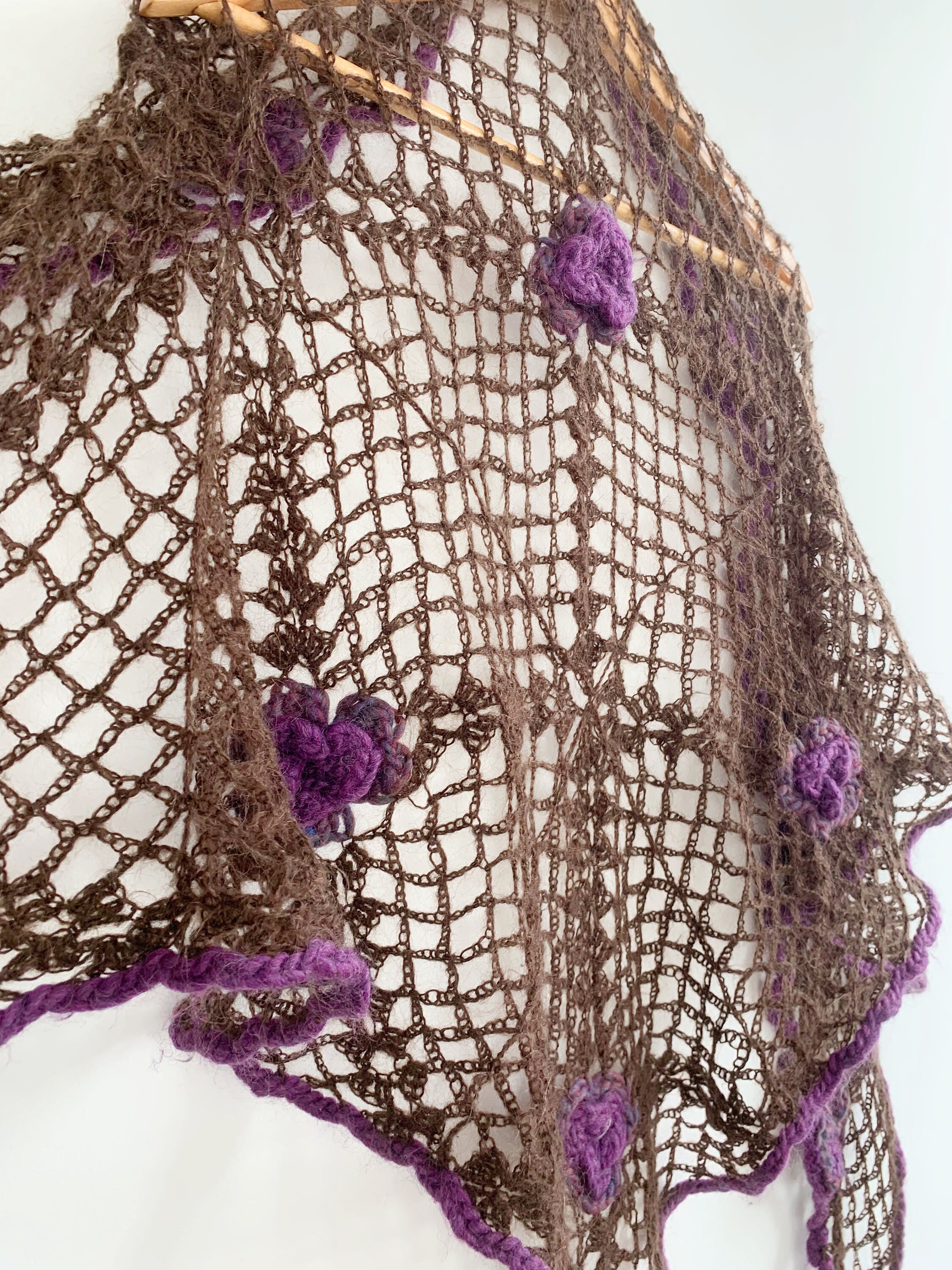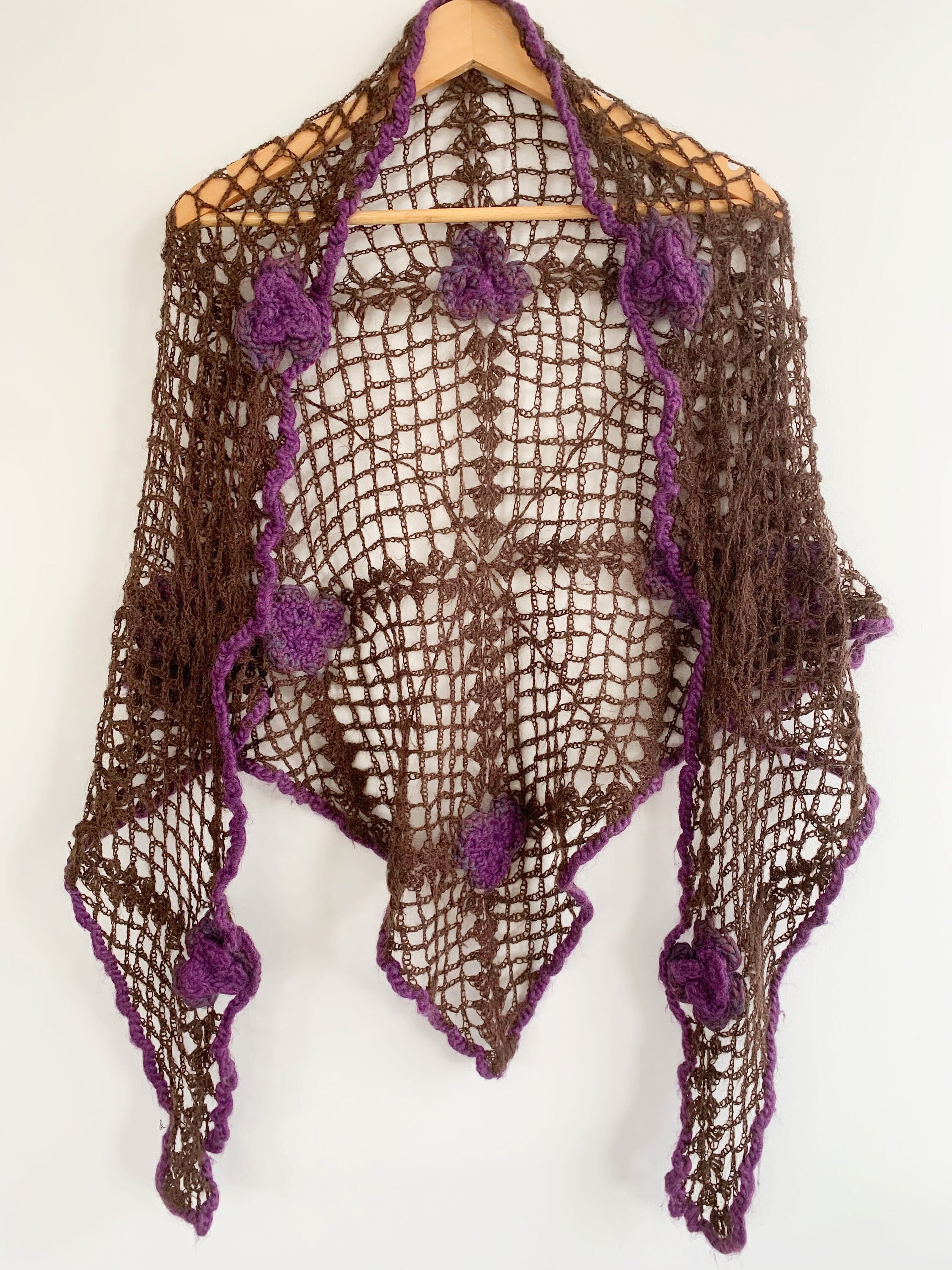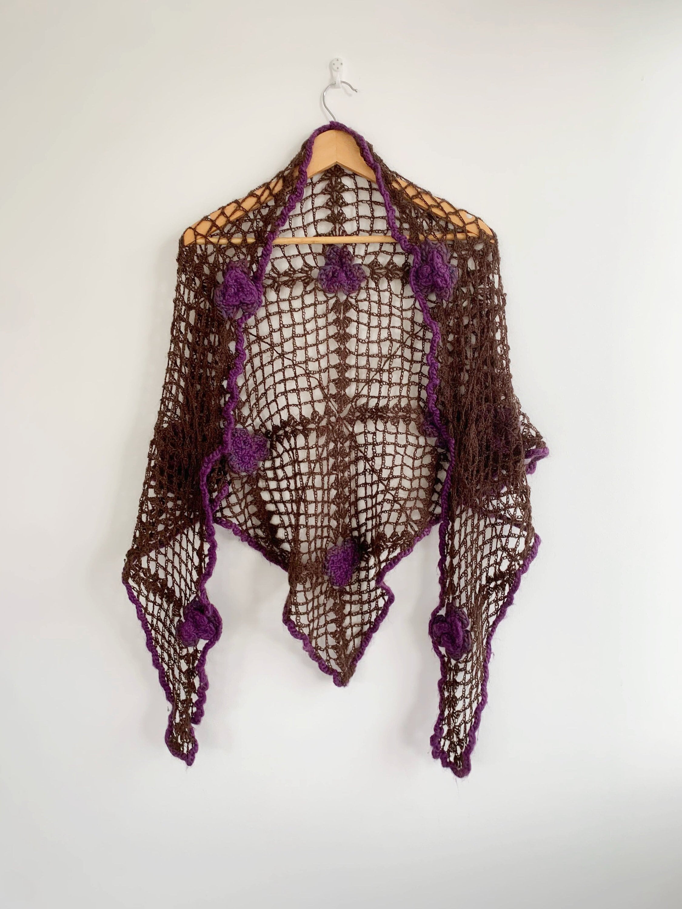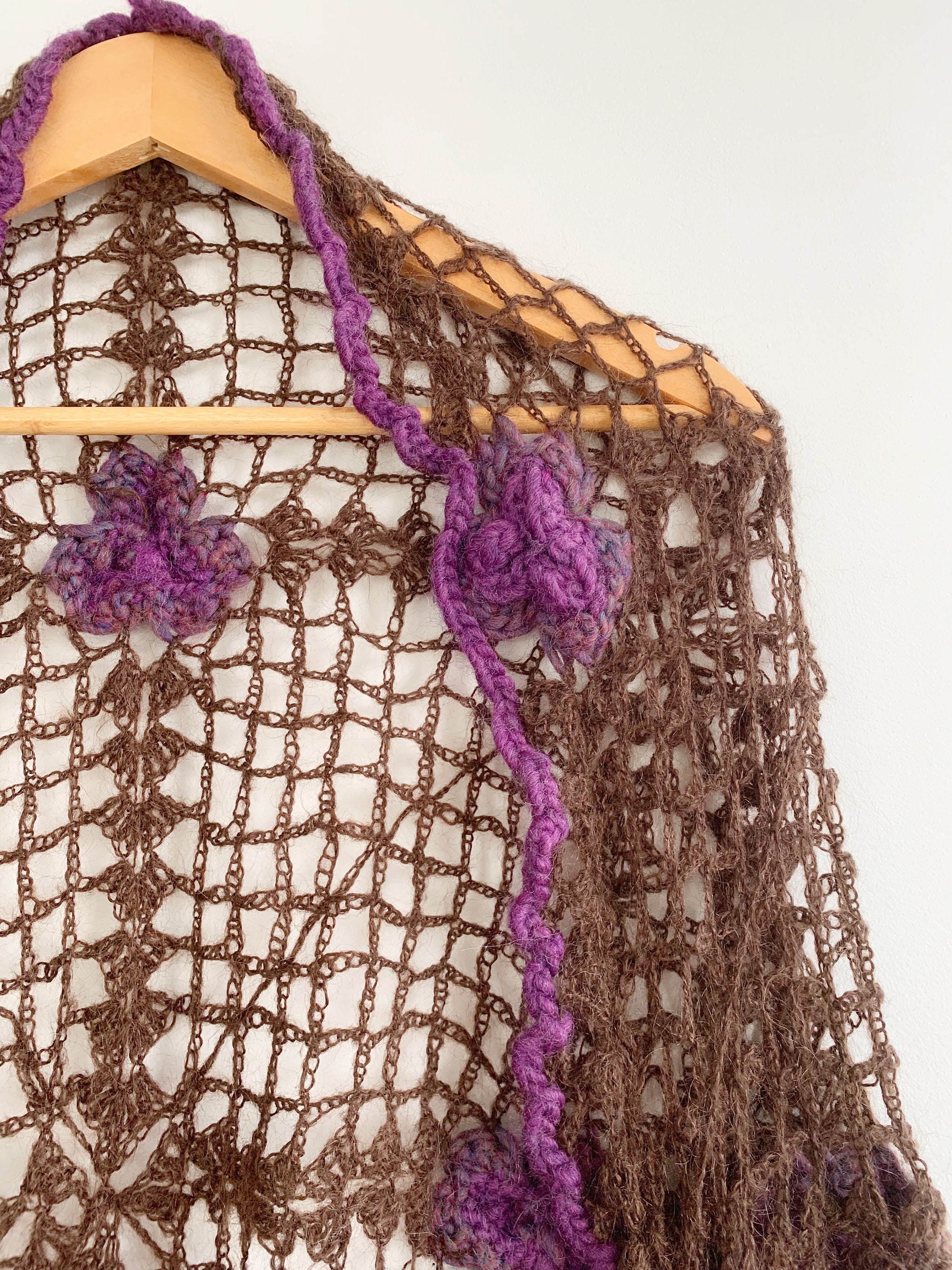This is a beautiful vintage soft crochet shawl for women made of soft fluffy mohair yarn. This brown lace shawl is super lightweight and yet cosy and warm. This boho chic triangle shawl has delicate crochet flowers in purple colors all over it. This lovely bohemian lace shawl is the perfect shawl wrap to keep you warm and yet so romantic.