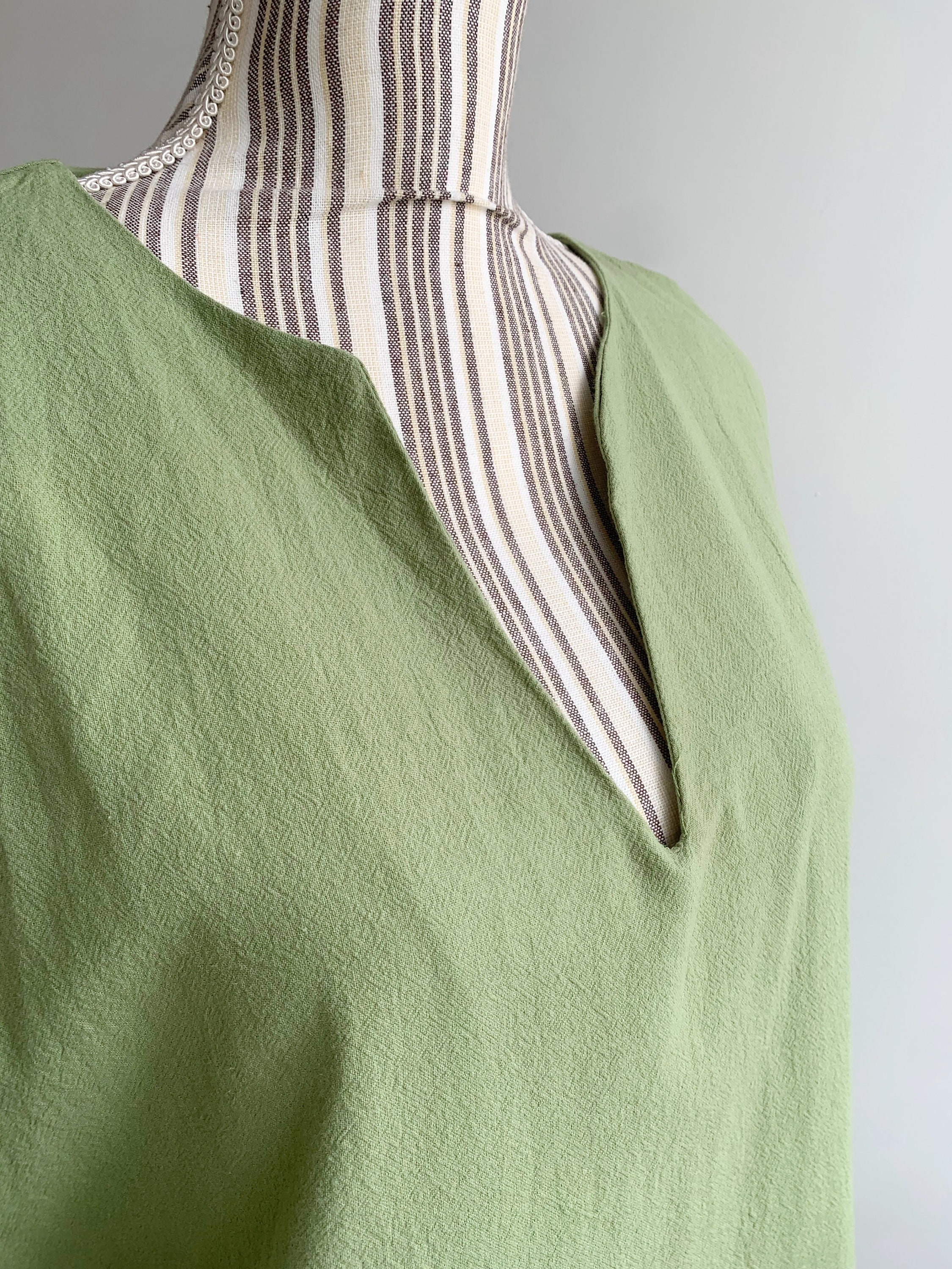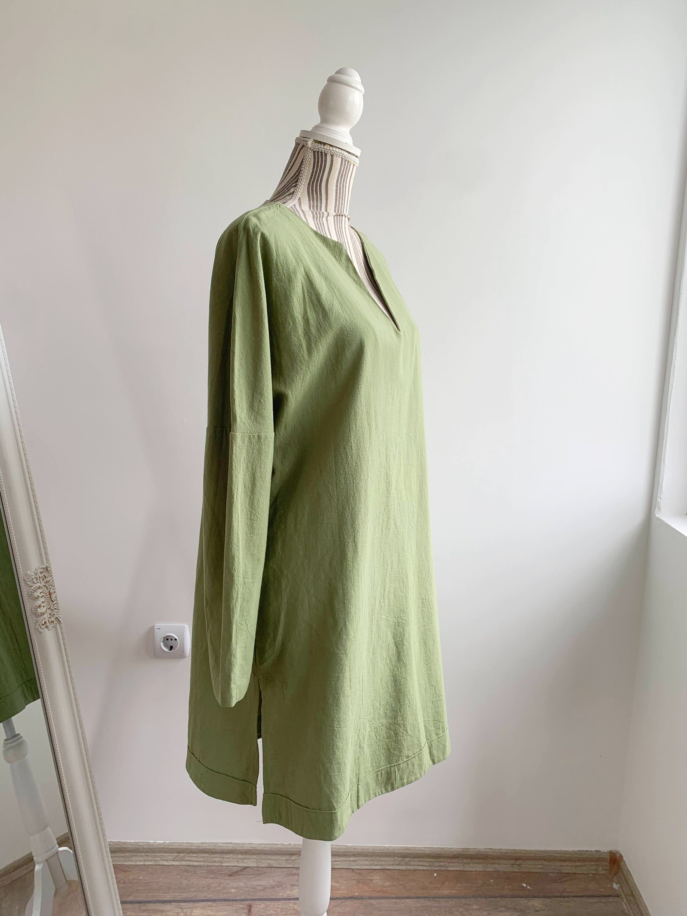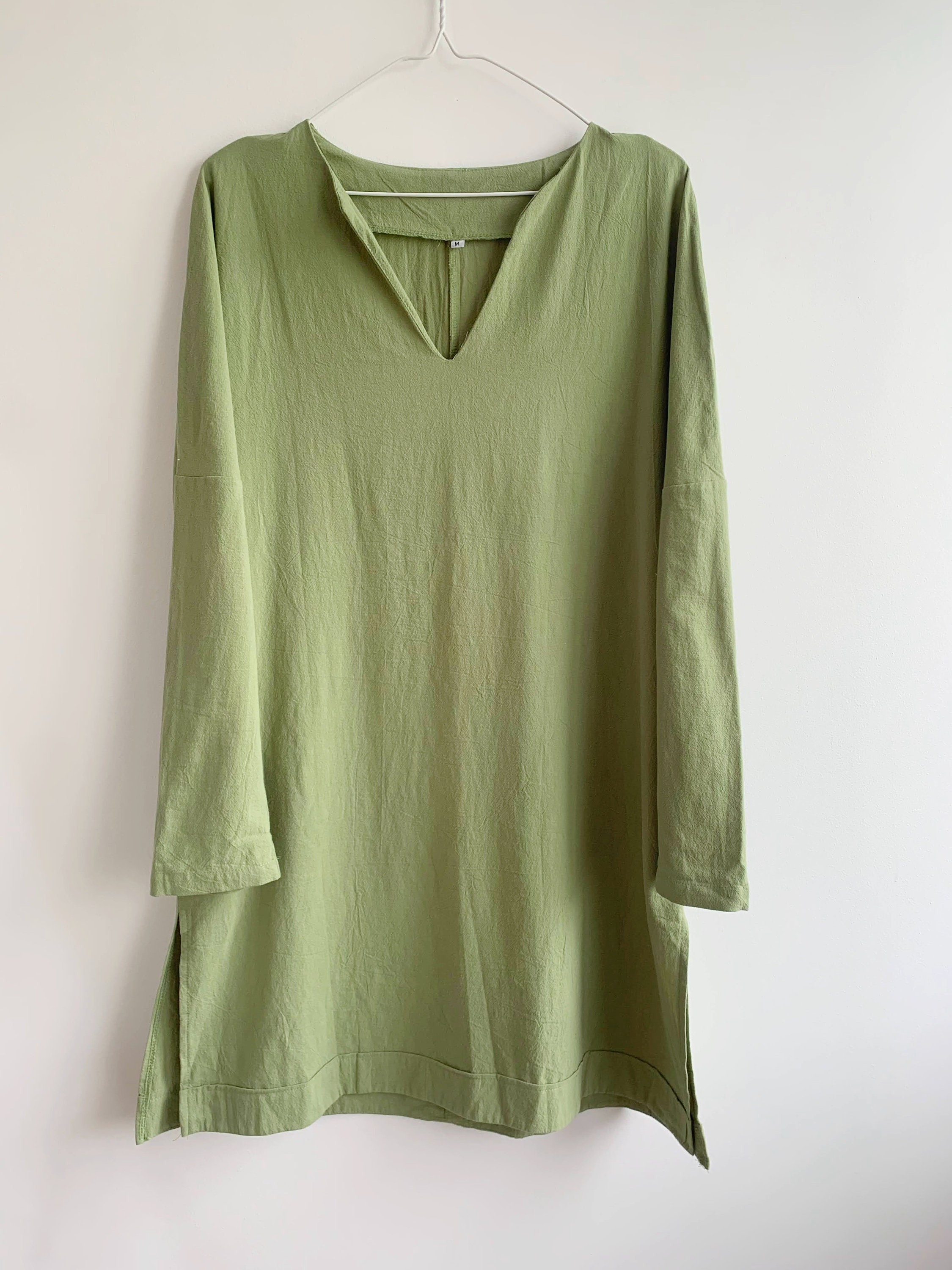 This is a vintage sage green cotton kaftan tunic with v neck and long sleeves. This boho tunic top has side slits and relaxed fit silhouette. You can wear this cotton tunic top a beach cover up, lounge wear or sleepwear. This boho chic kaftan shirt is so comfortable to wear. It has a comfy loose fit. This bohemian shirt is size M. Please check the measurements below.