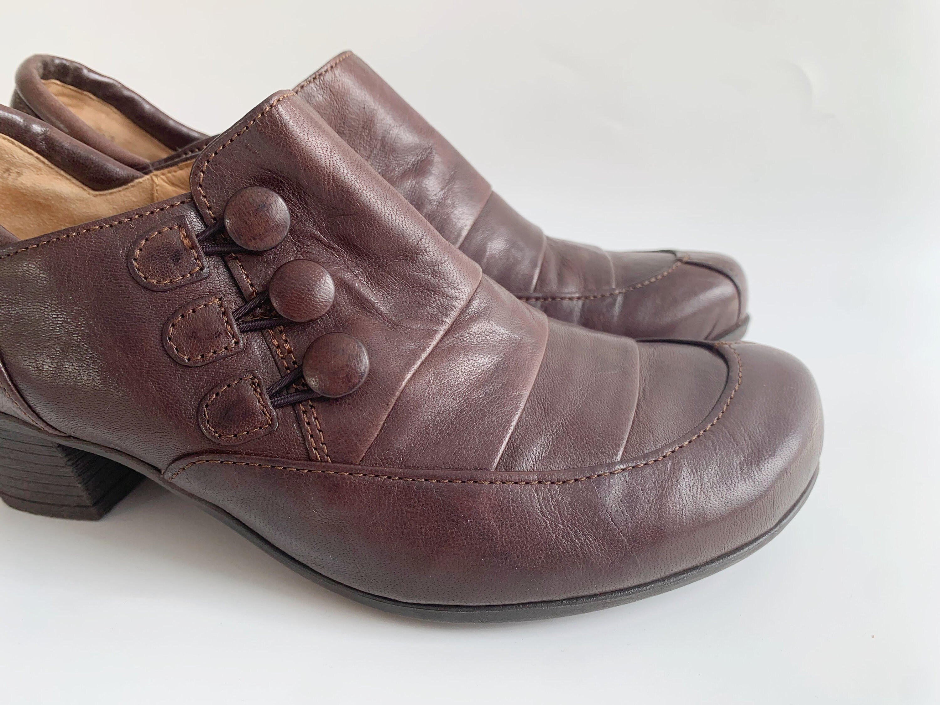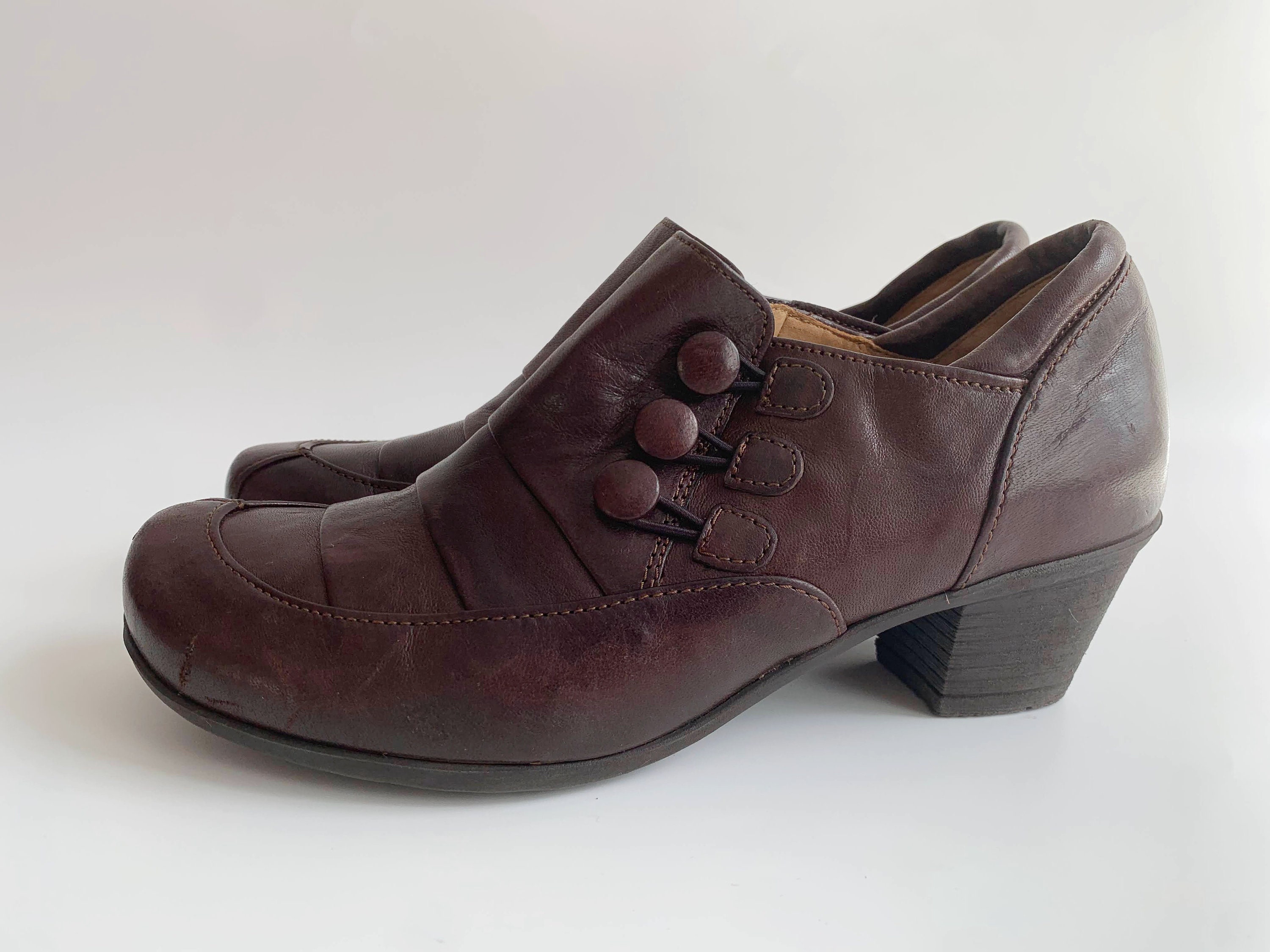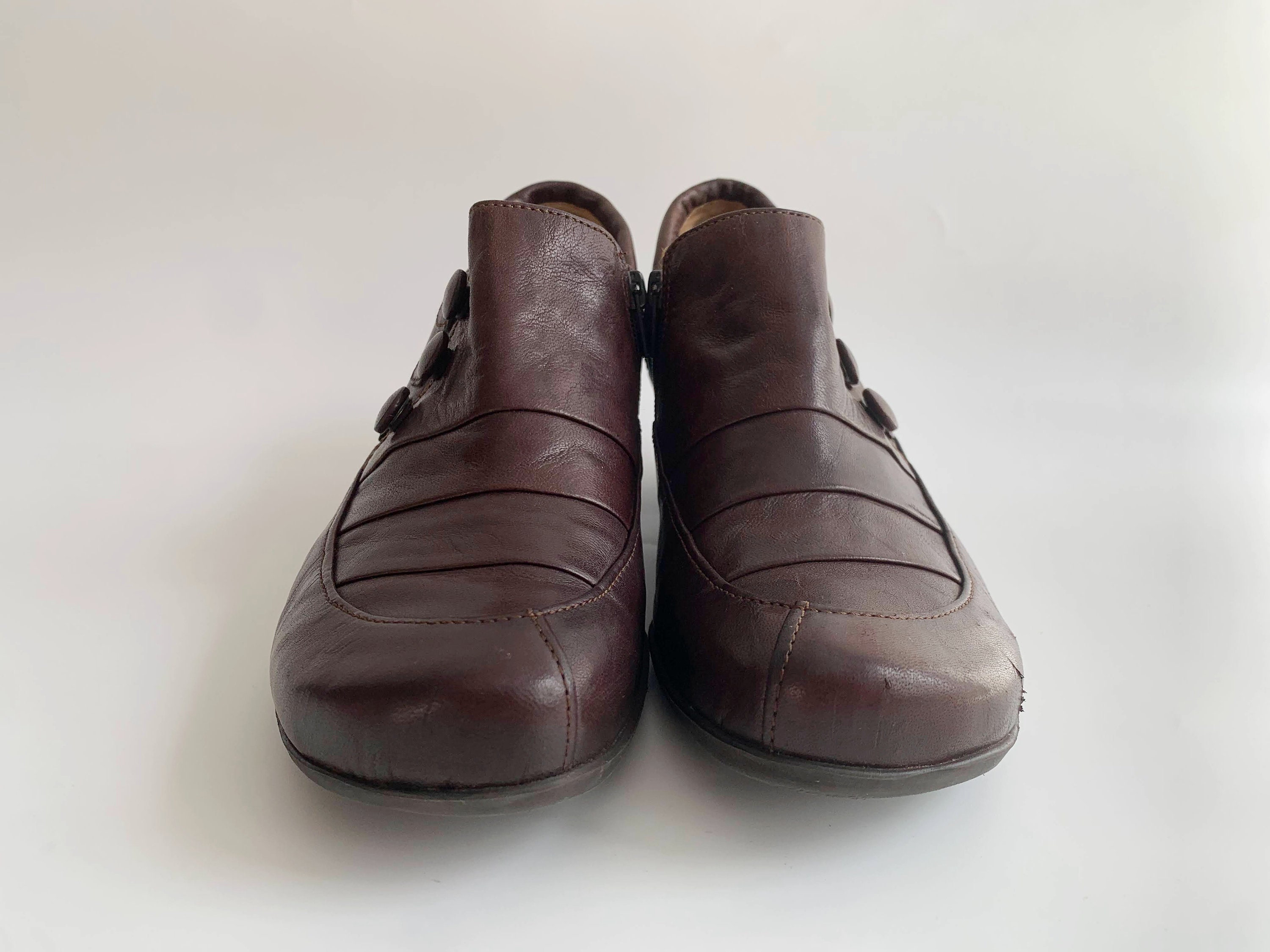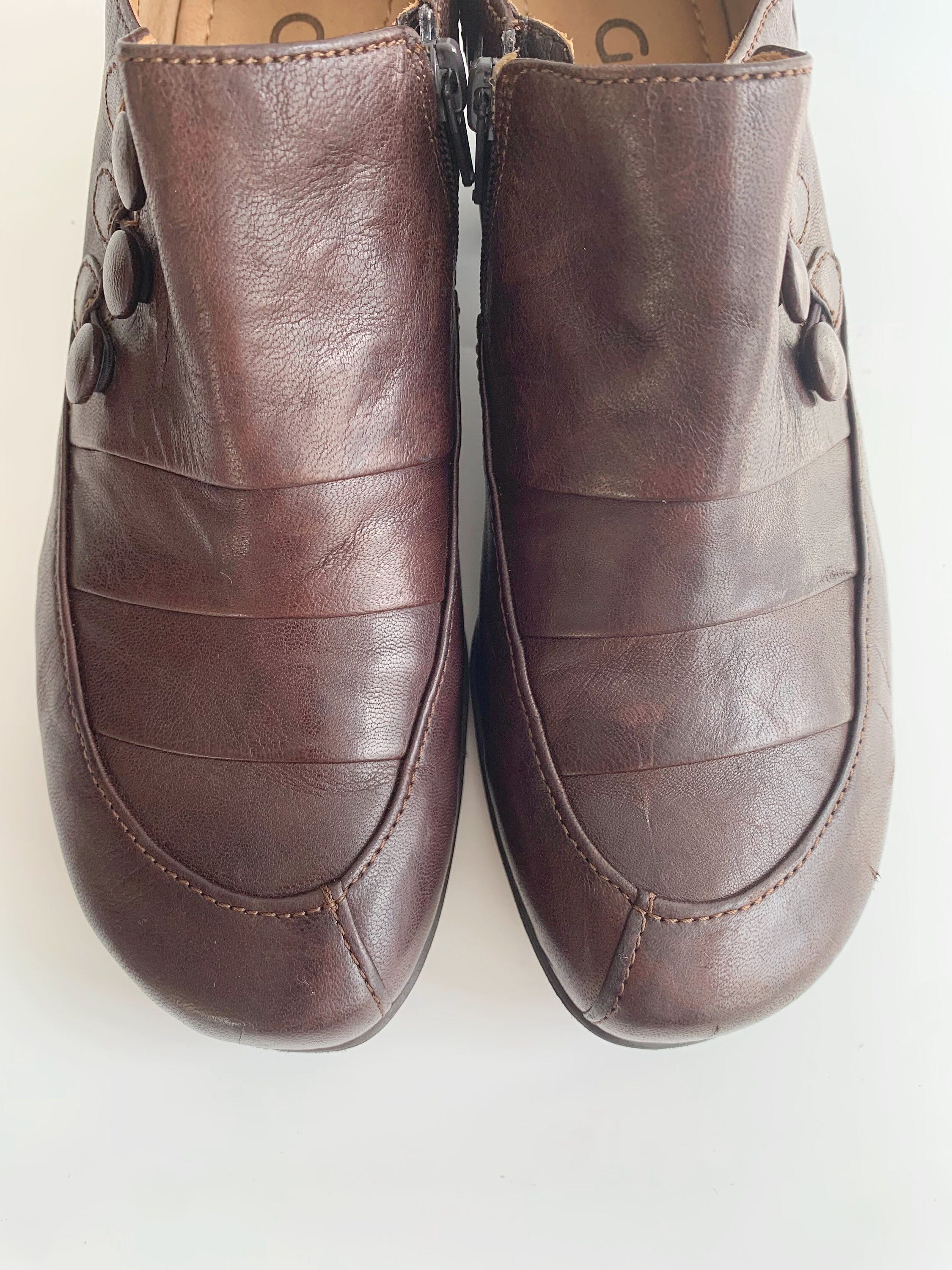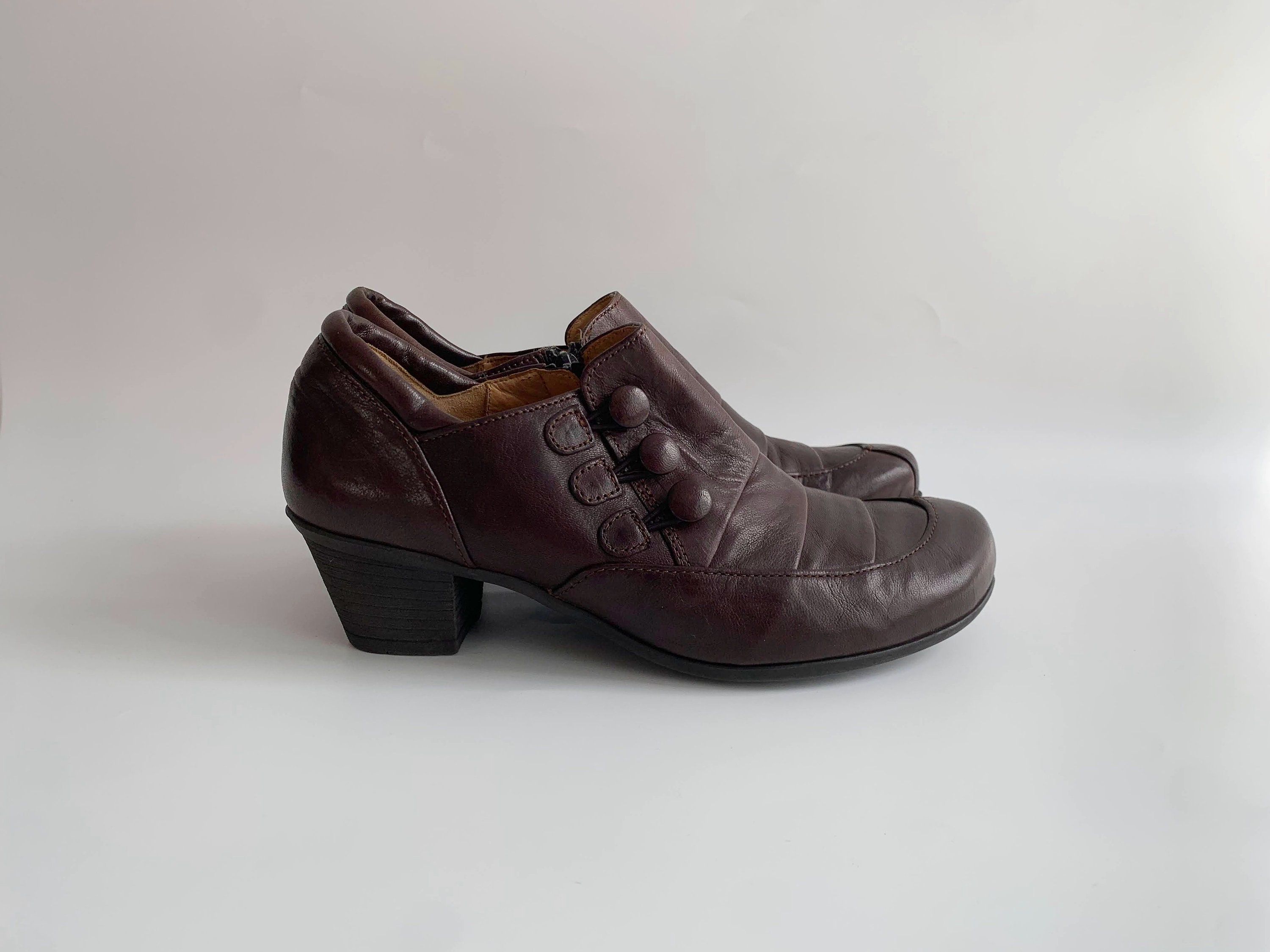 These are vintage Y2K dark brown leather low heeled boots for women by Gabor. These real leather zip up boots have low comfortable heels and round toes with decorative buttons and zip up closure. These low heel booties are made of genuine leather with rubber soles and leather lining. Perfect ankle boots for the spring fall season. The size marked on these leather ankle boots is UK 4, which fits like EUR 37, US 6. Please check the measurements below.