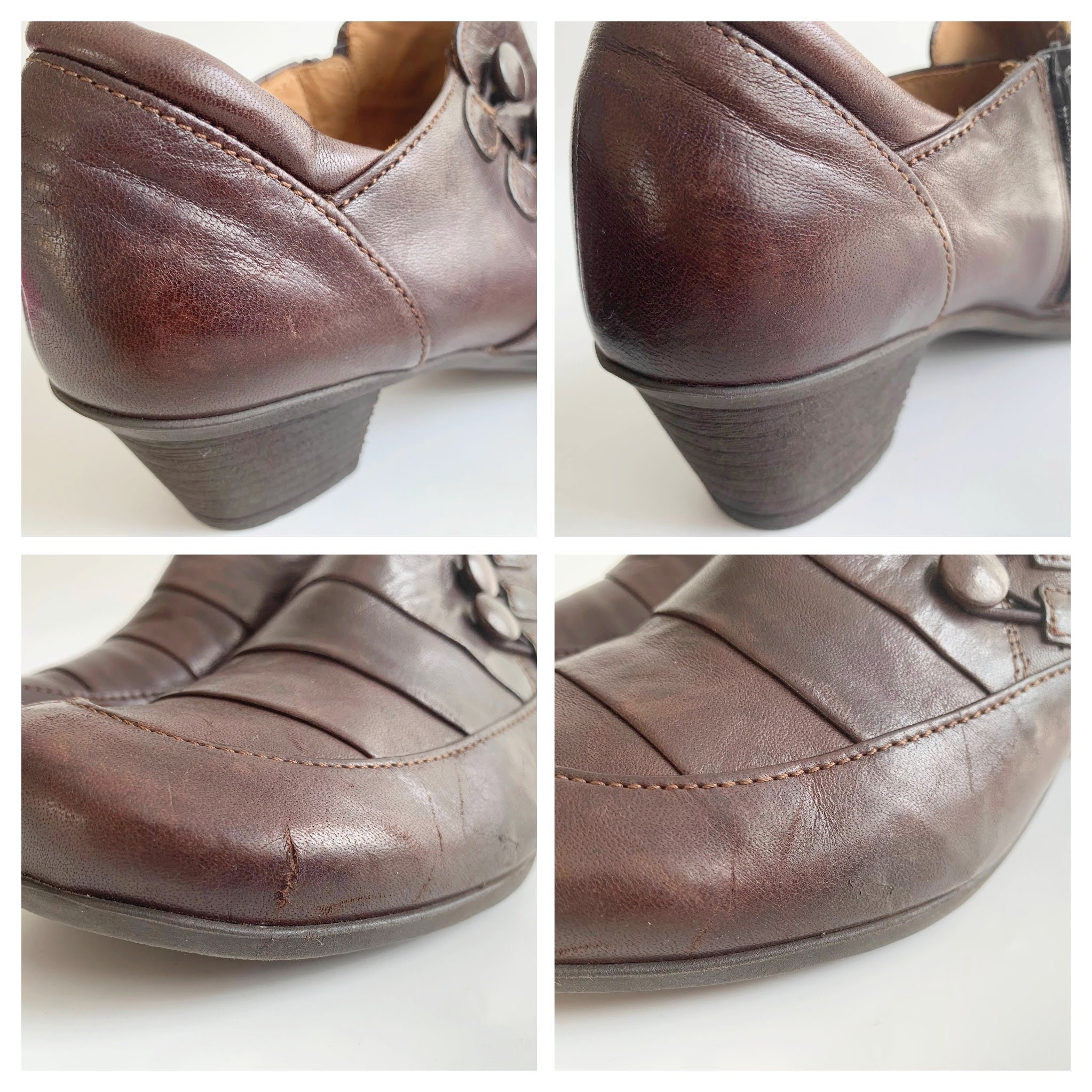 Condition: The brown leather boots were pre-loved and show some signs of wear. There are some scratches abd marks on the genuine leather surface, which I have tried to capture in the close up photos.