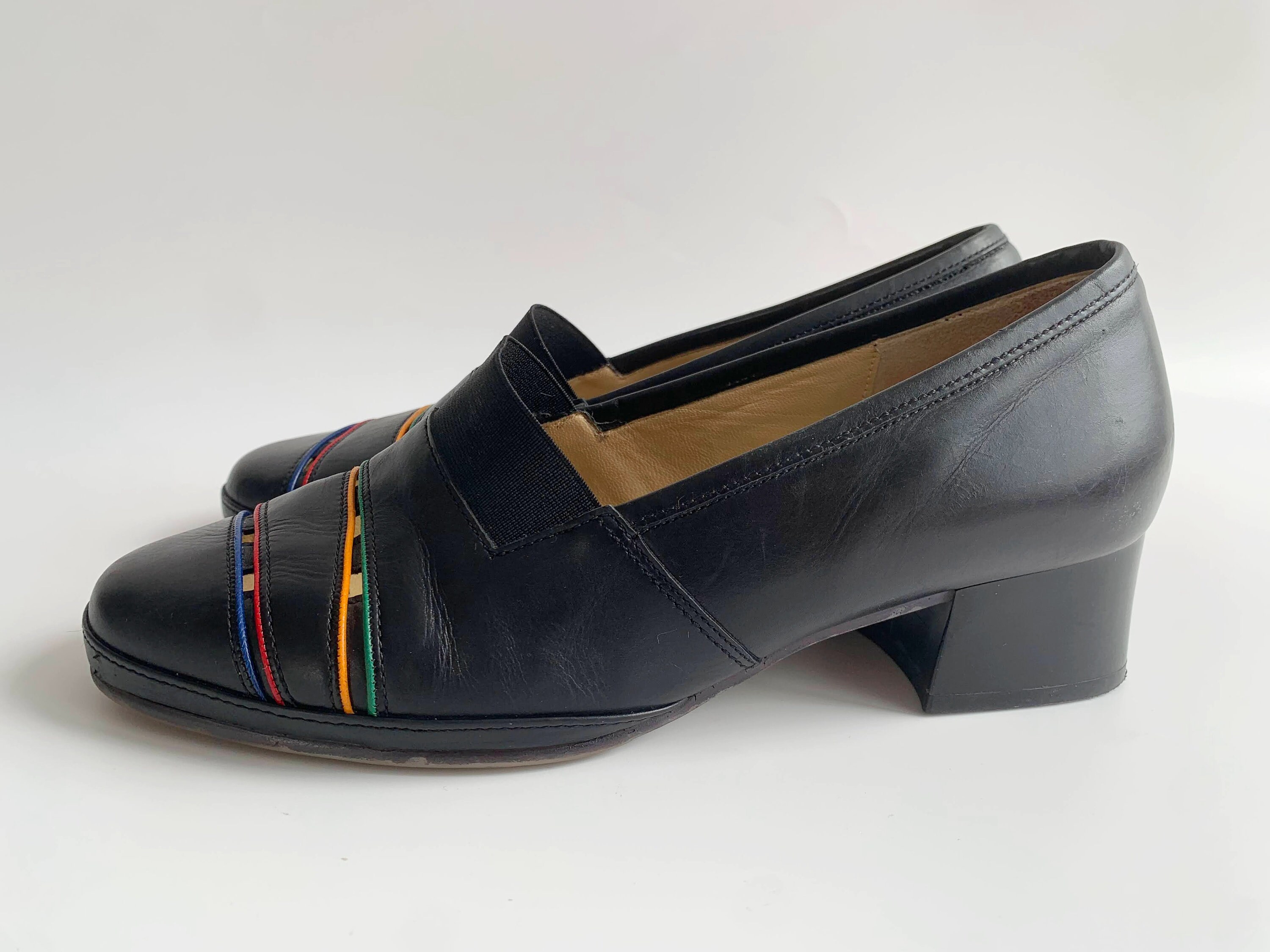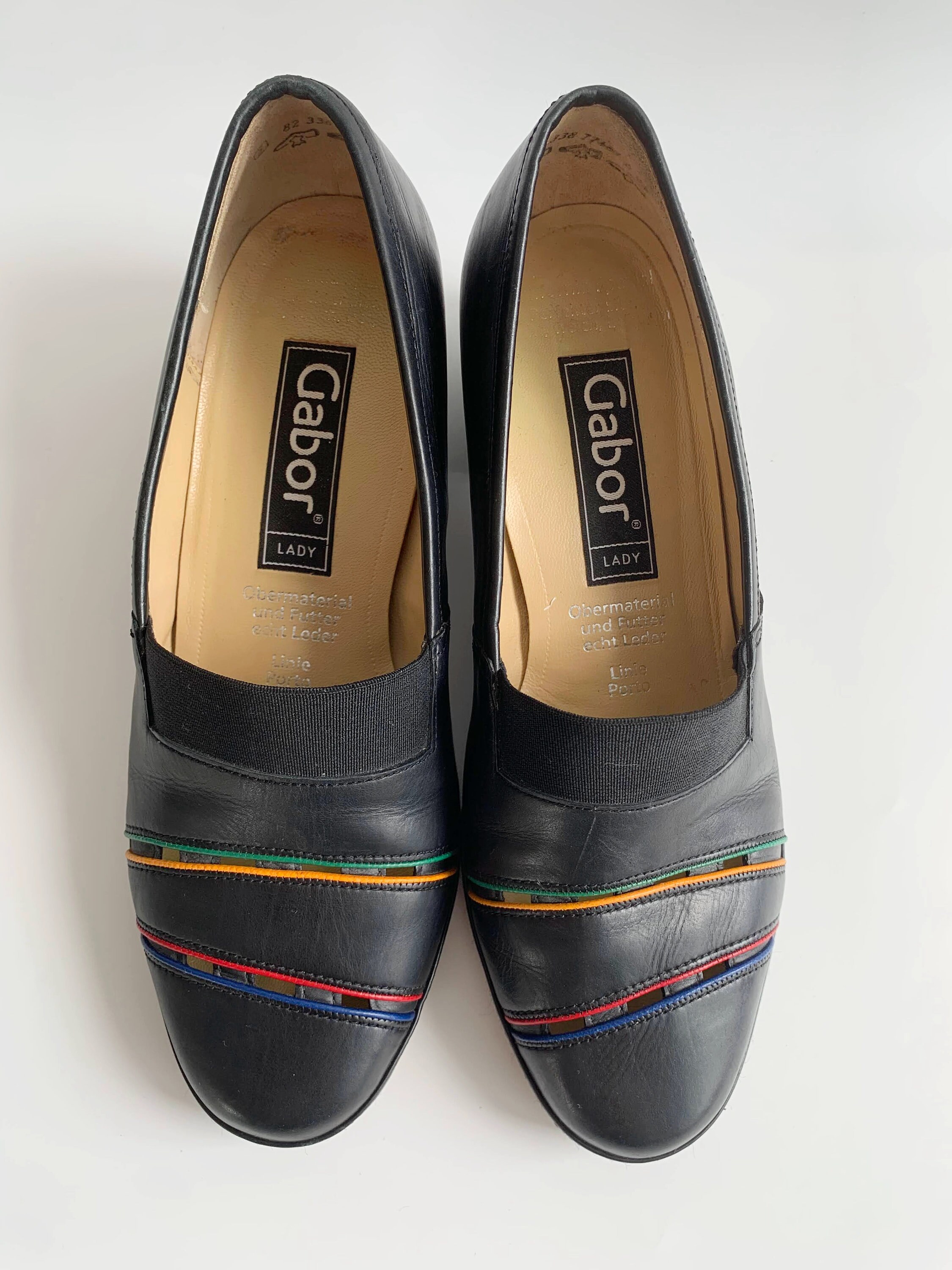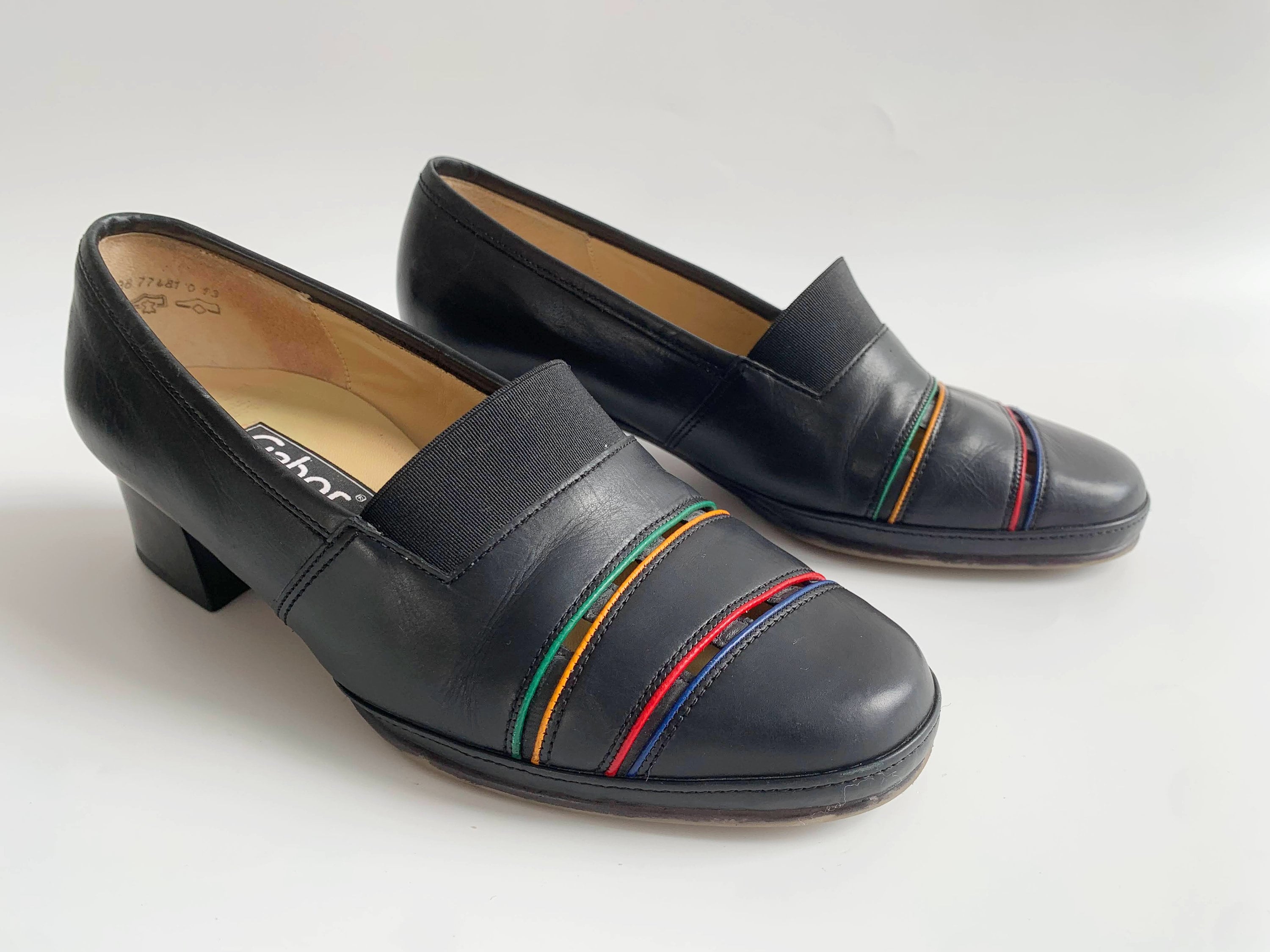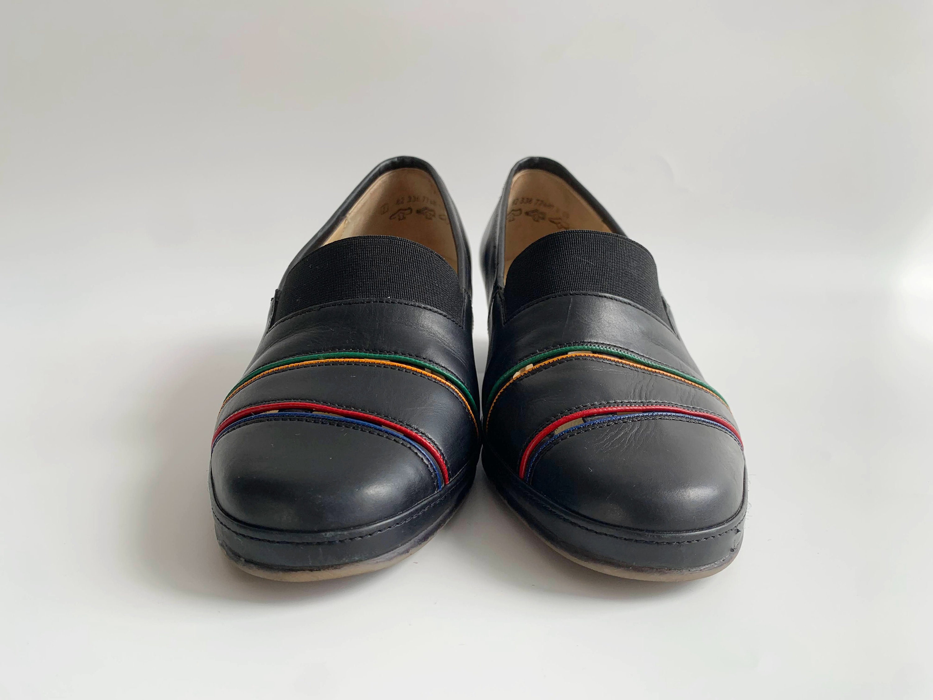 These are vintage 90s comfortable black leather loafer shoes with elastic band at the front and colorful striped in green, yellow, red and blue. These cut out leather slip on shoes are made of genuine leather in and out and rubber non slip soles. These casual loafer shoes are by the brand Gabor. The size marked is UK5, which fits like US 7 1/2, EUR 38. Please check the measurements below.