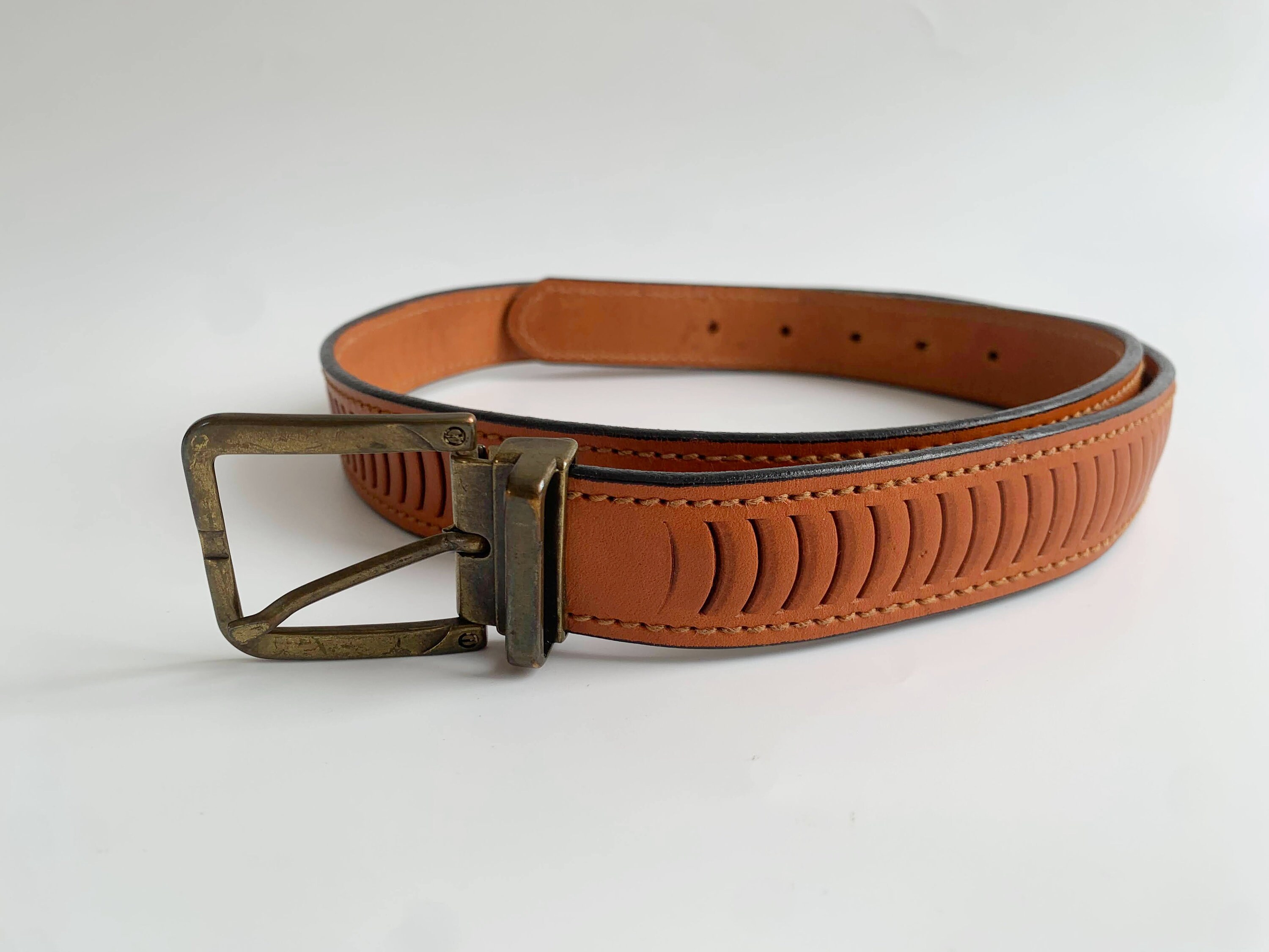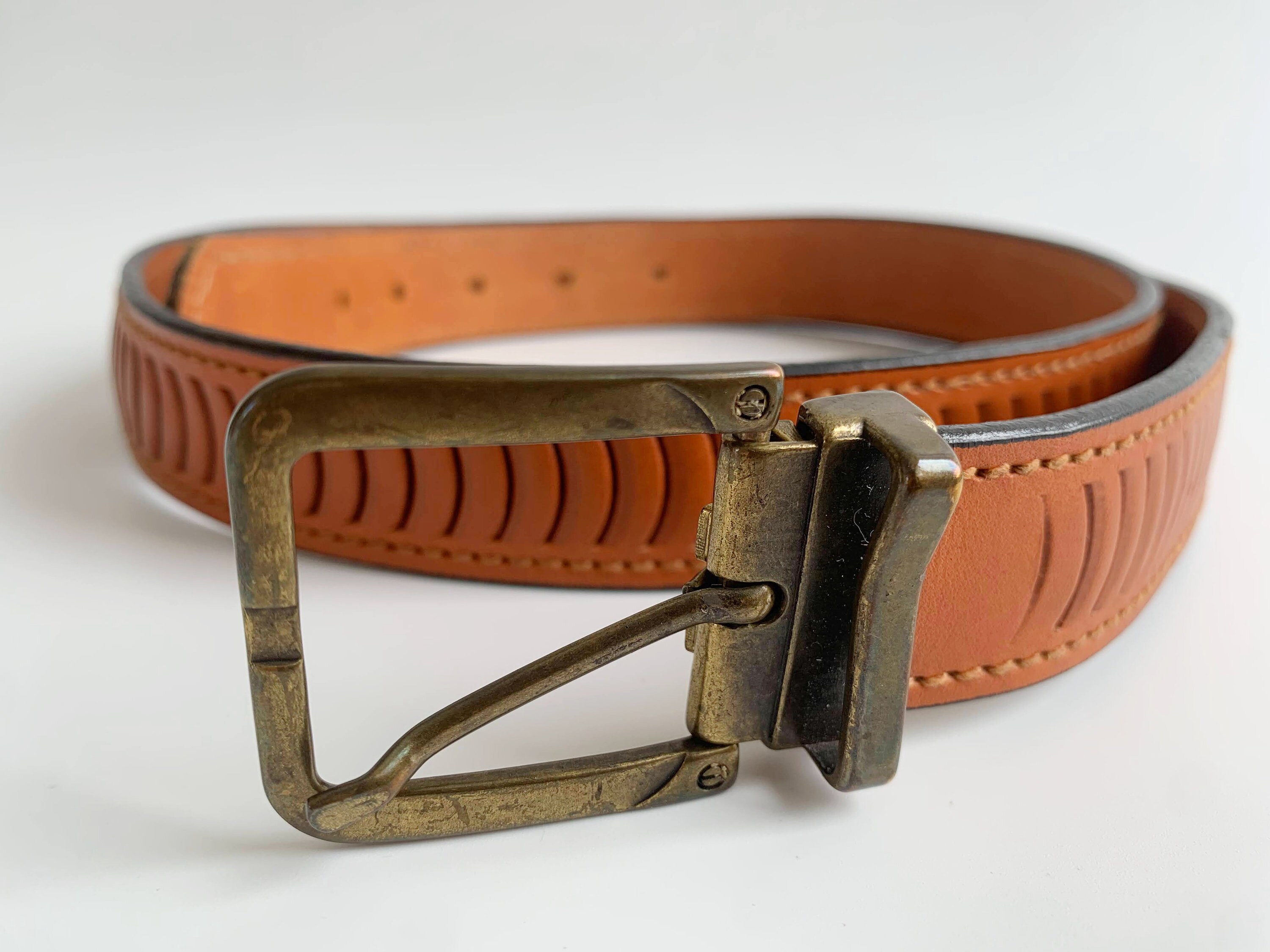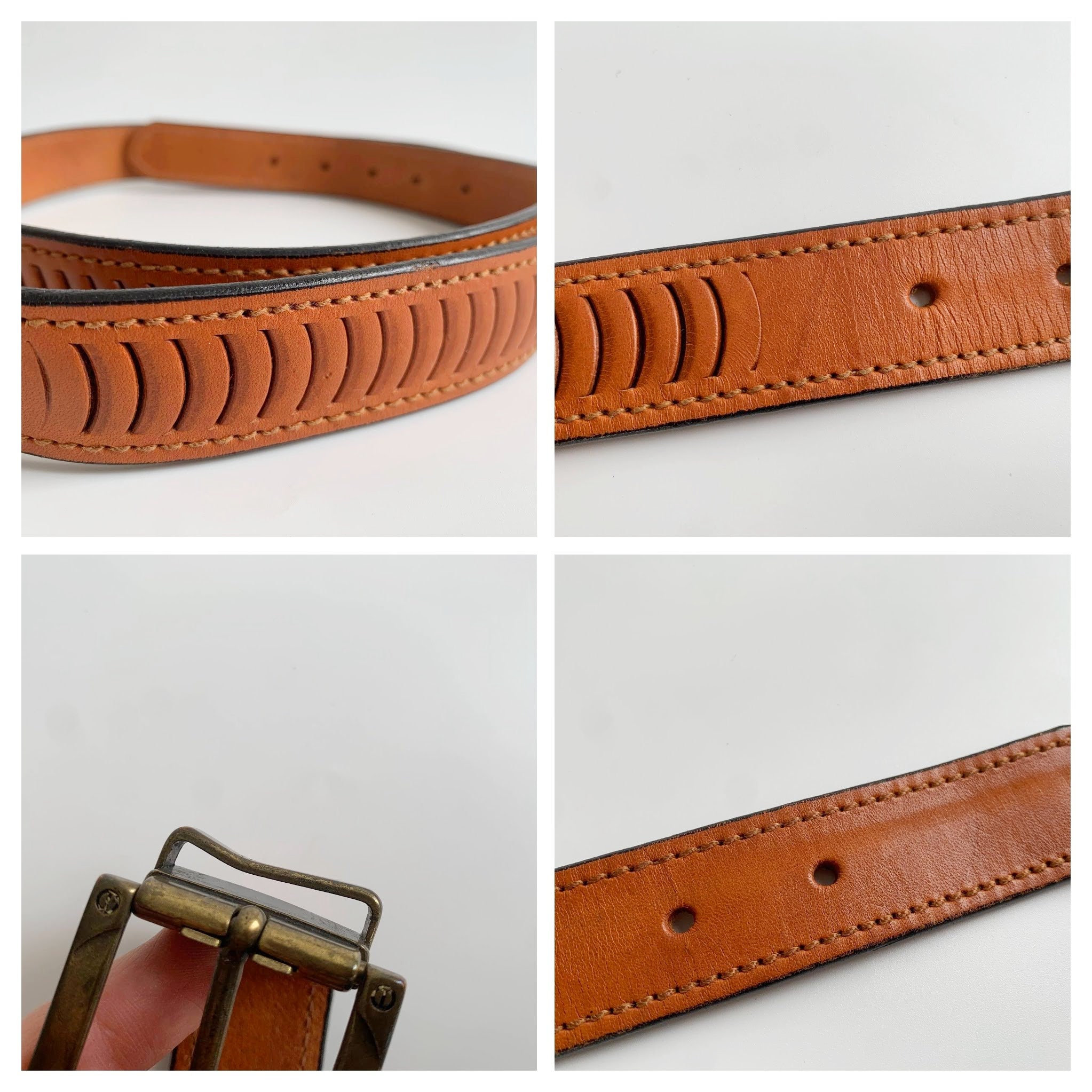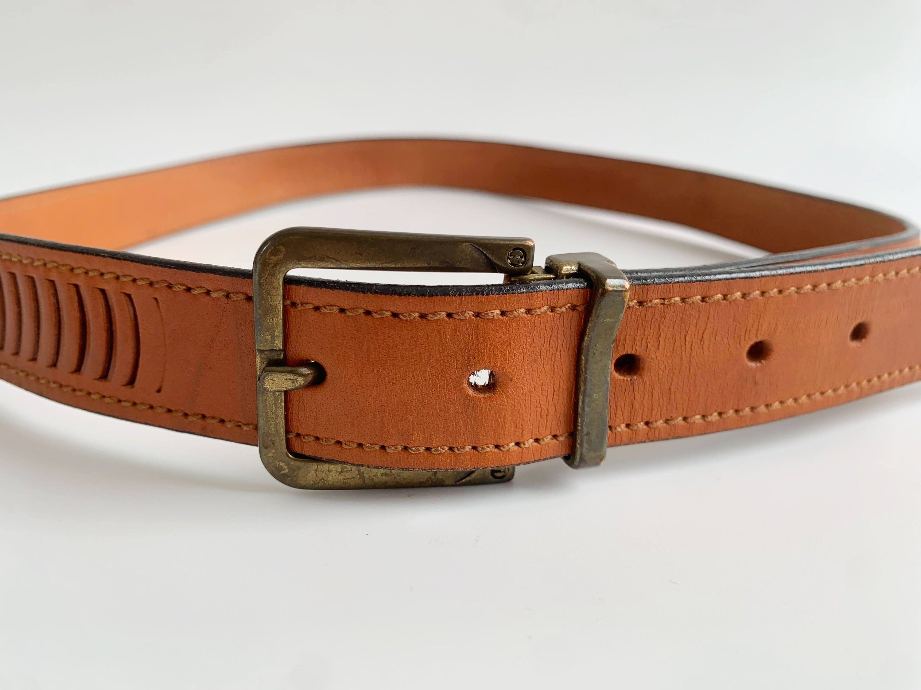 Condition: The brass belt loop is bent inwards which has caused scratches on the leather surface where the belt slides underneath. The brass buckle shows some scratches too.