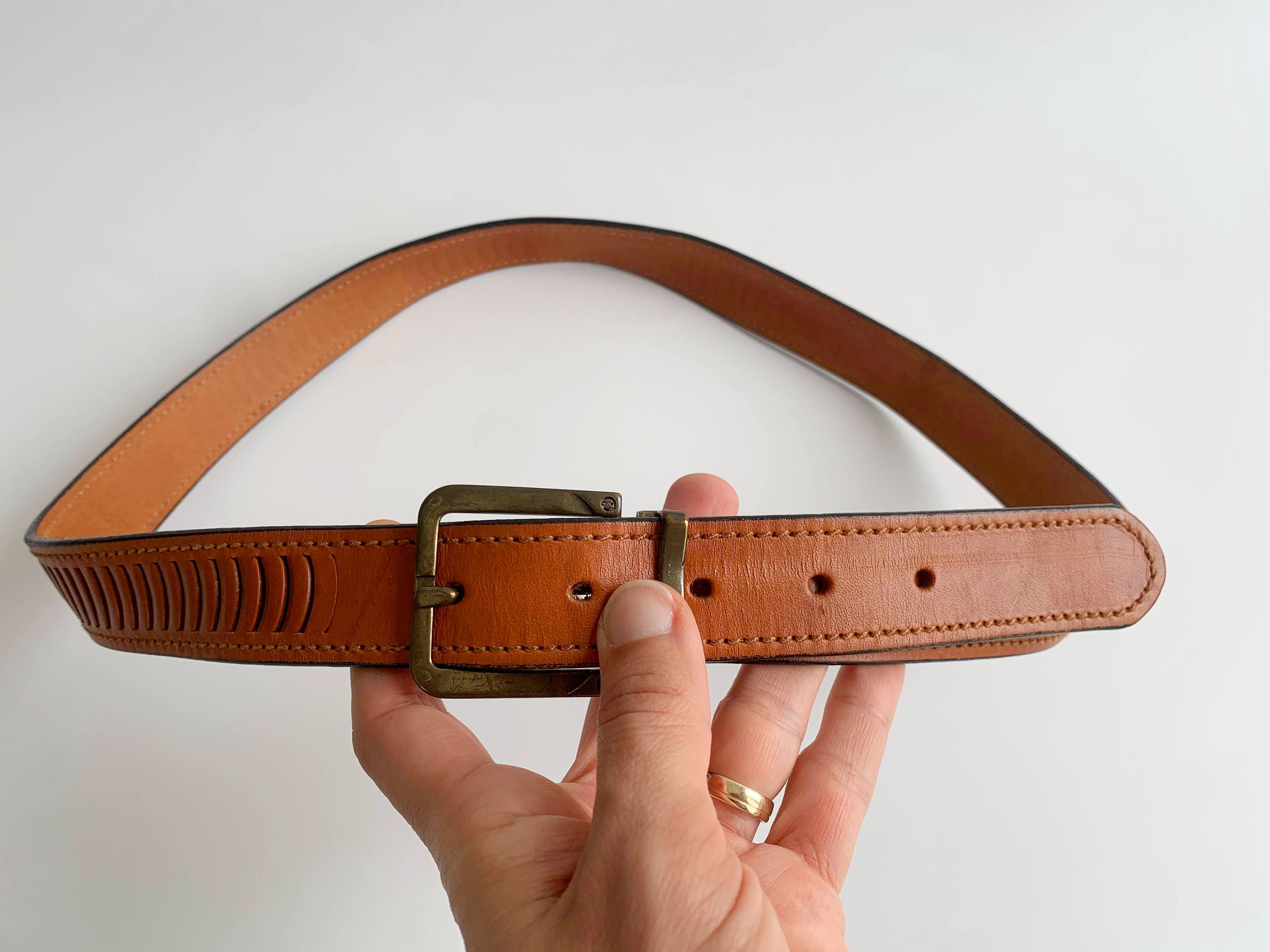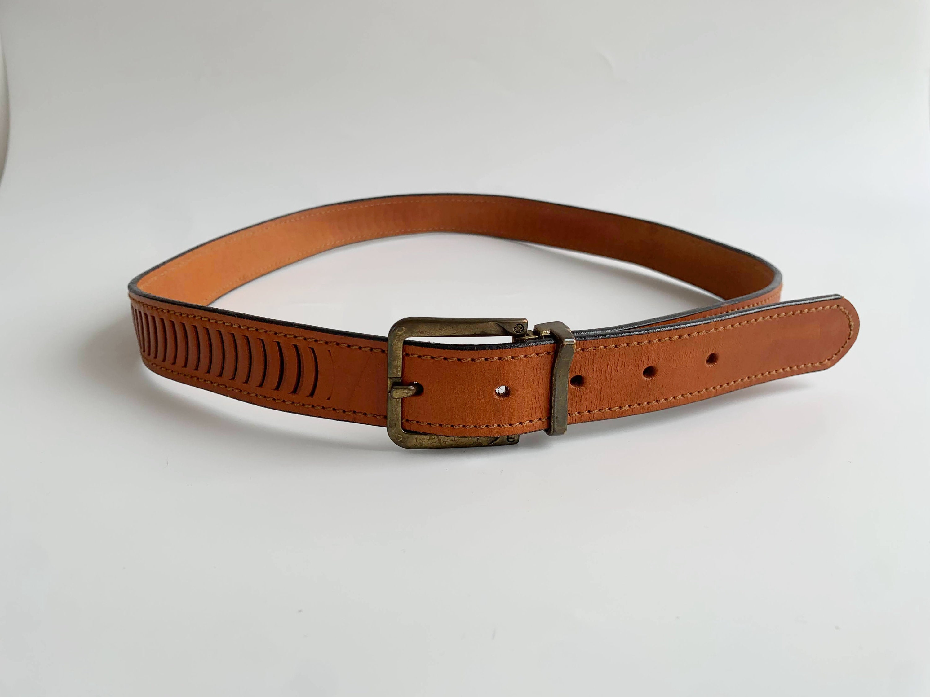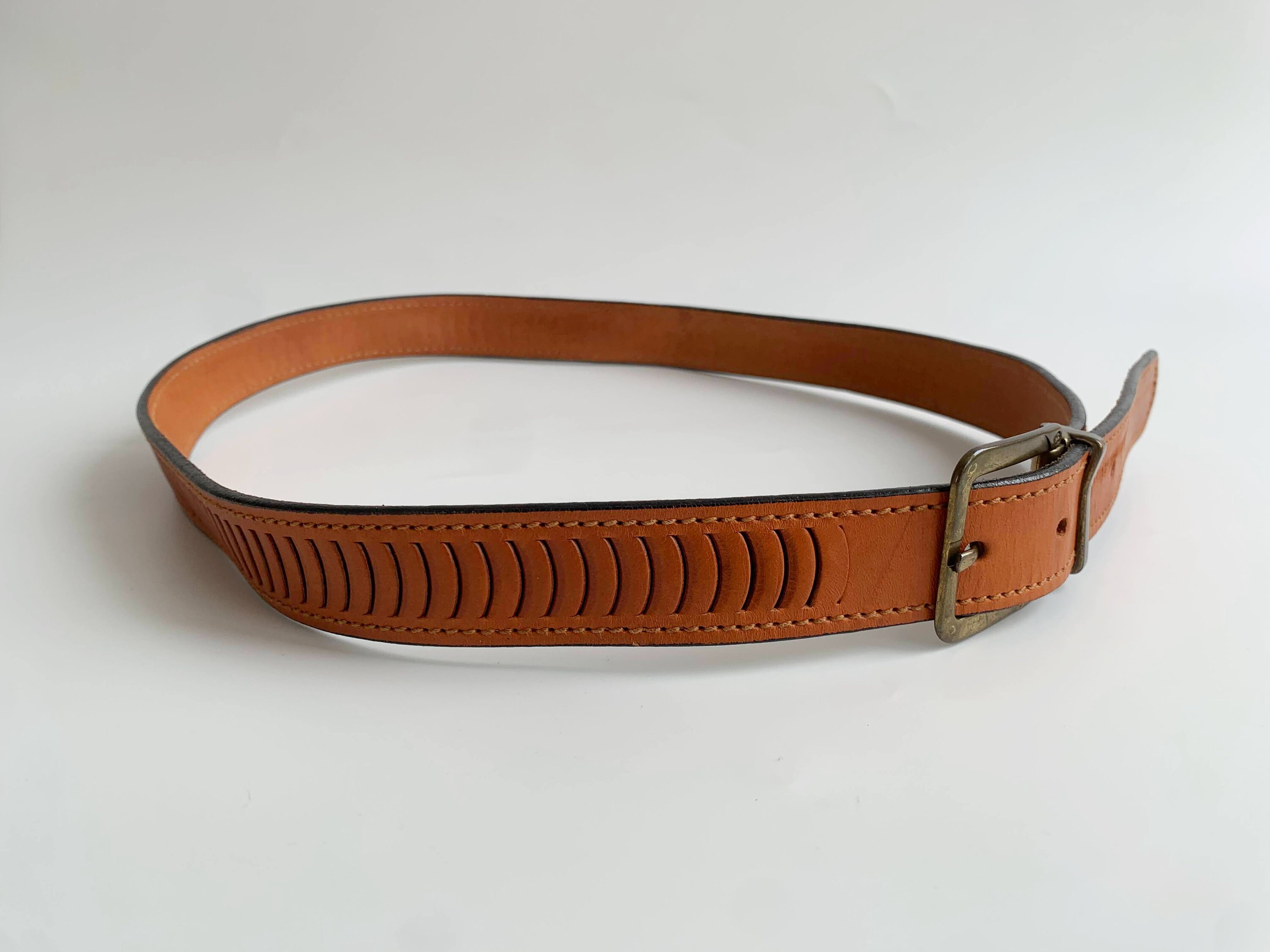 This is vintage 90s distressed tooled leather belt for women with slim brass buckle. This slim leather belt is in neutral camel brown color ideal for your boho chic outfits. It is made of sturdy genuine leather which has decorative cuts on the leather. This boho chic belt has slim brass buckle. This camel leather belt can adjust from 34.6" / 88 cm to 38.6" / 98 cm .