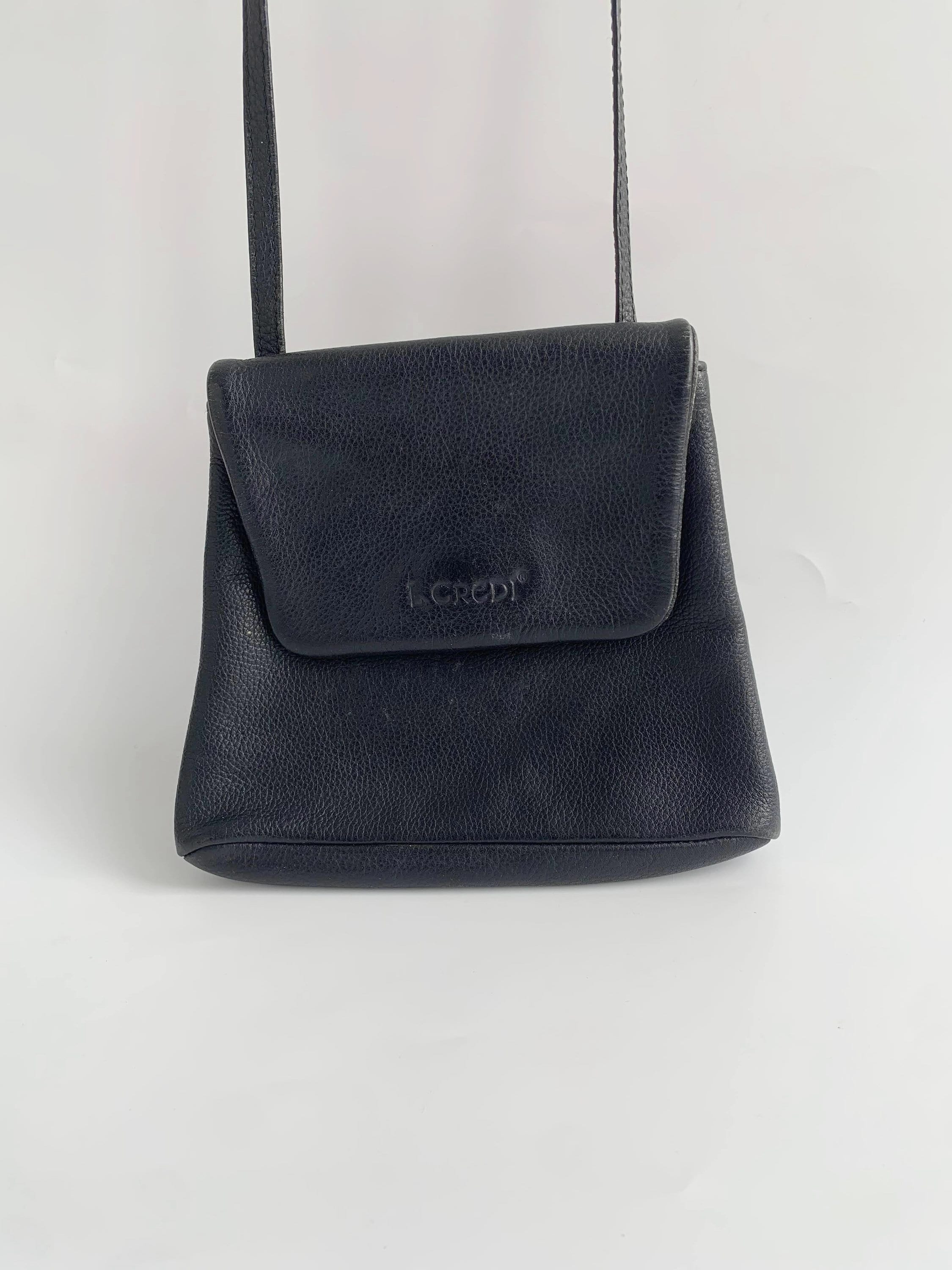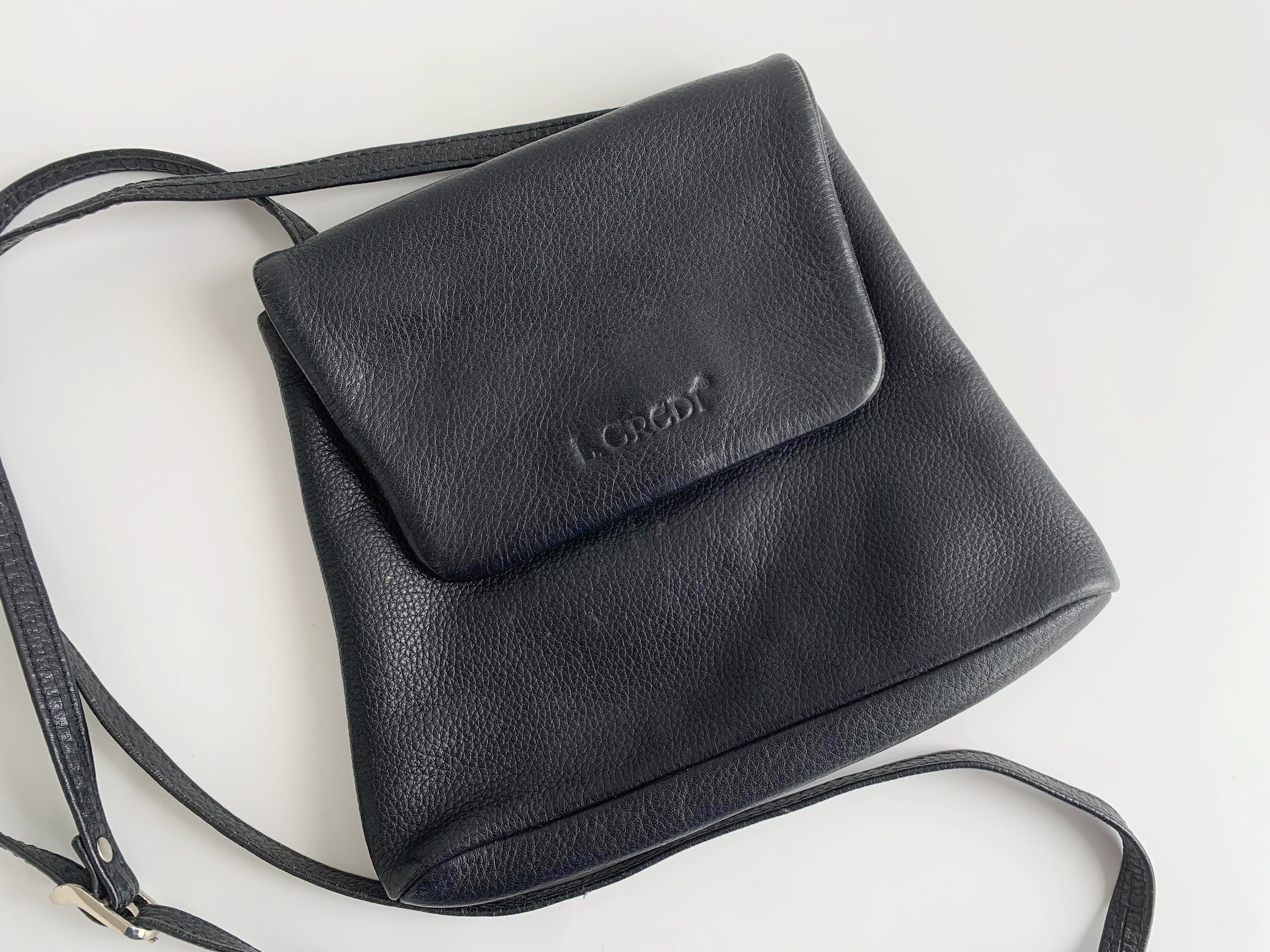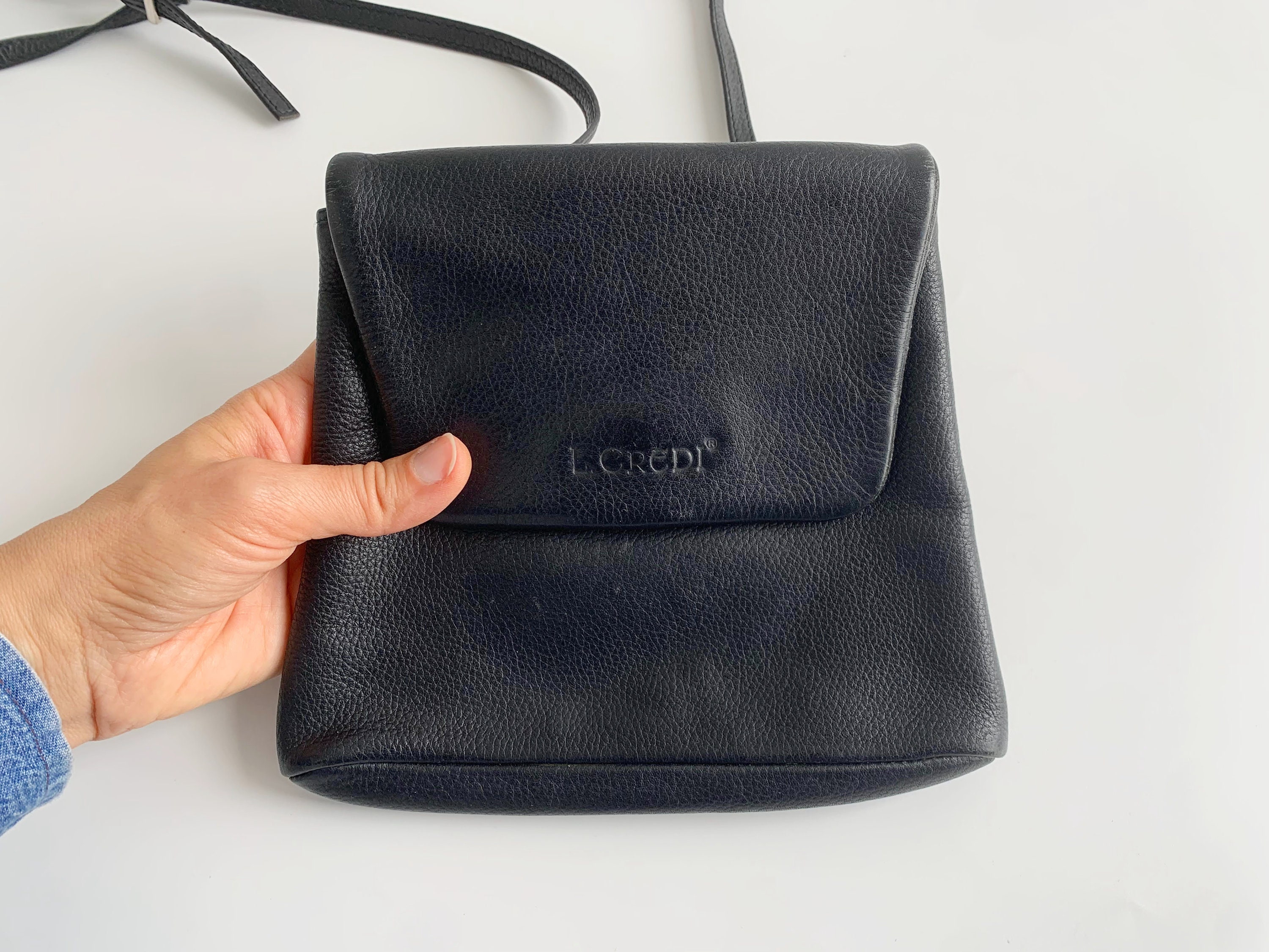 This is a vintage 80s cute and simple black leather crossbody purse by the brand L. Credi. This black leather satchel has vertical shape and flap over lid with magnetic closure. This small distressed leather satchel purse is made of genuine pebbled leather and cotton lining inside. It has a slim shoulder strap which can be adjusted so you can wear it as a shoulder or as a crossbody bag. There is one compartments with one zipper pocket inside.