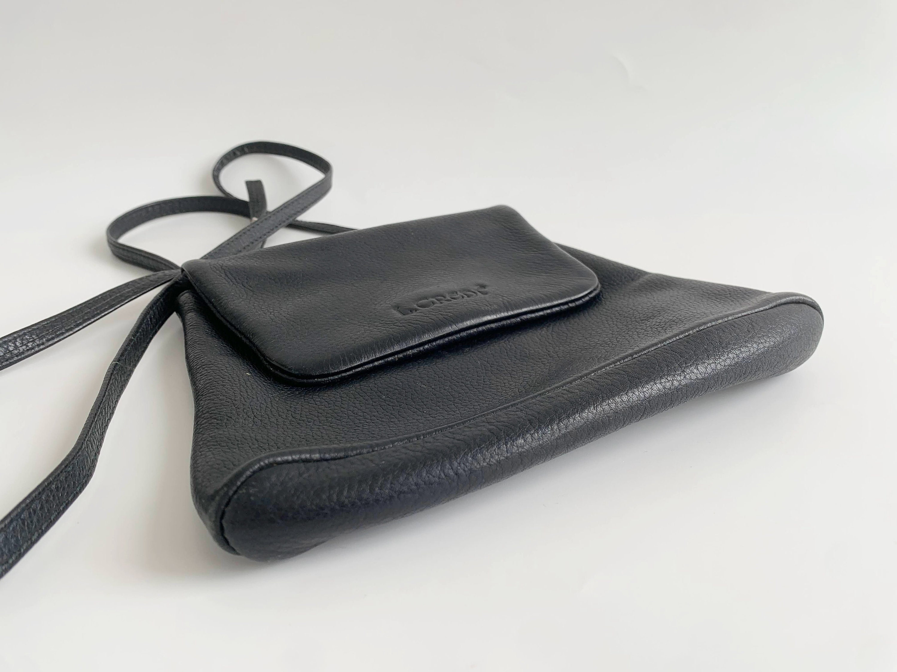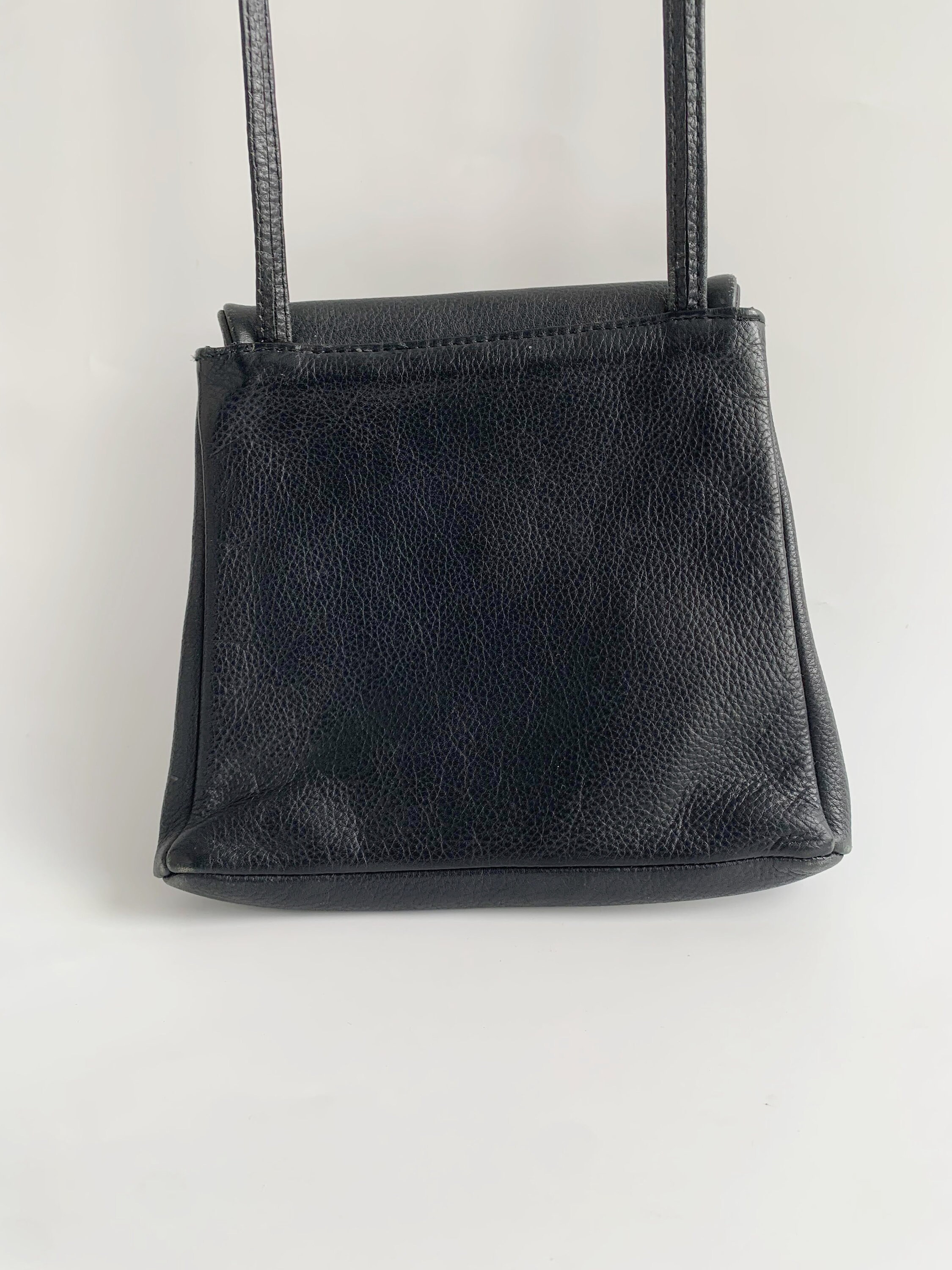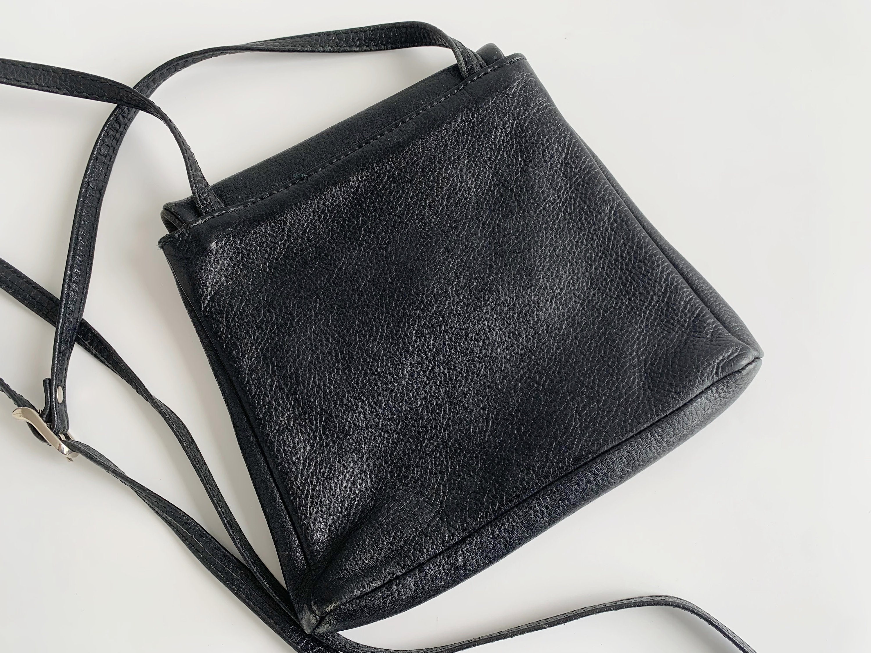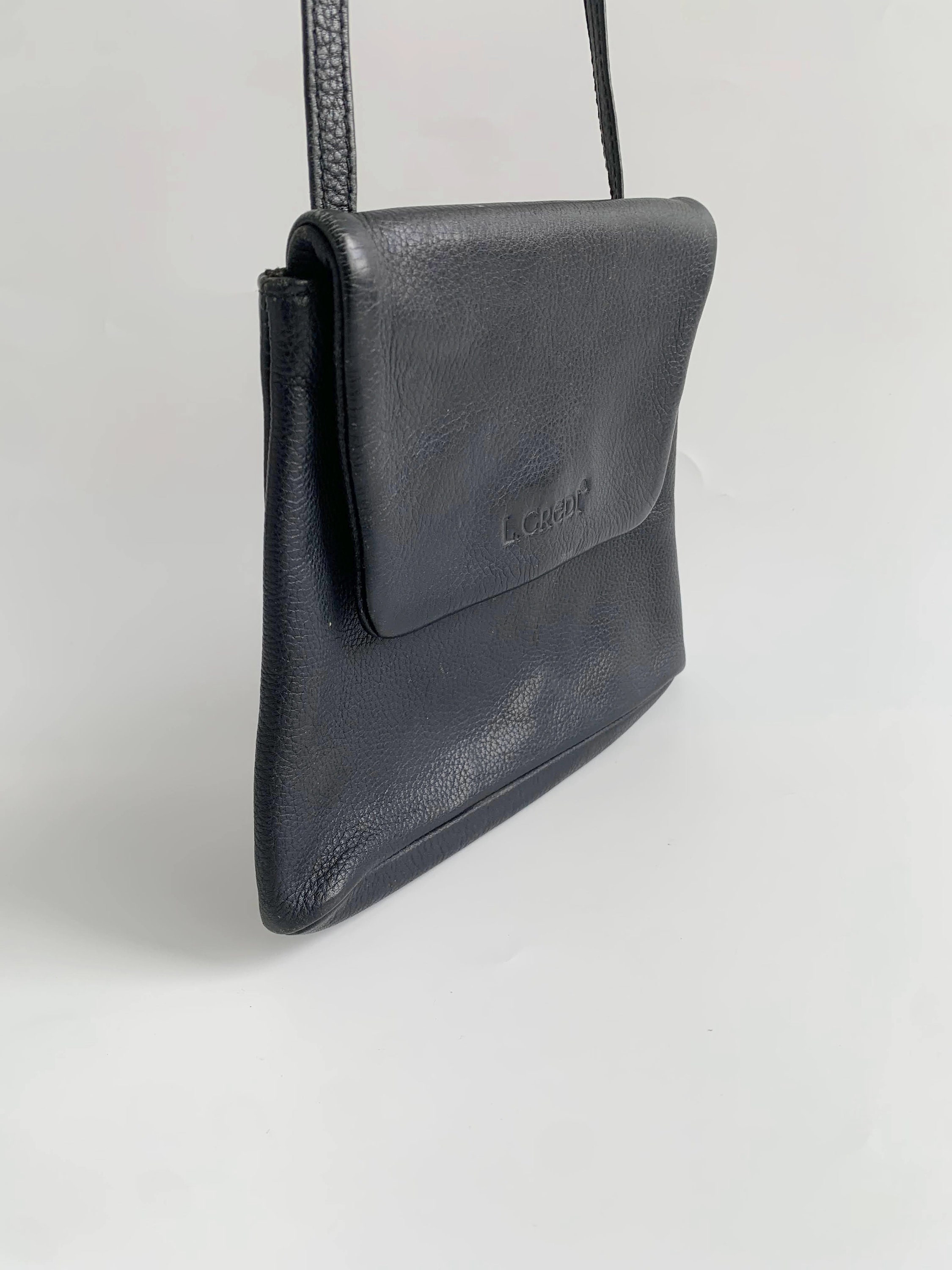 This is a vintage 80s cute and simple black leather crossbody purse by the brand L. Credi. This black leather satchel has vertical shape and flap over lid with magnetic closure. This small distressed leather satchel purse is made of genuine pebbled leather and cotton lining inside. It has a slim shoulder strap which can be adjusted so you can wear it as a shoulder or as a crossbody bag. There is one compartments with one zipper pocket inside.