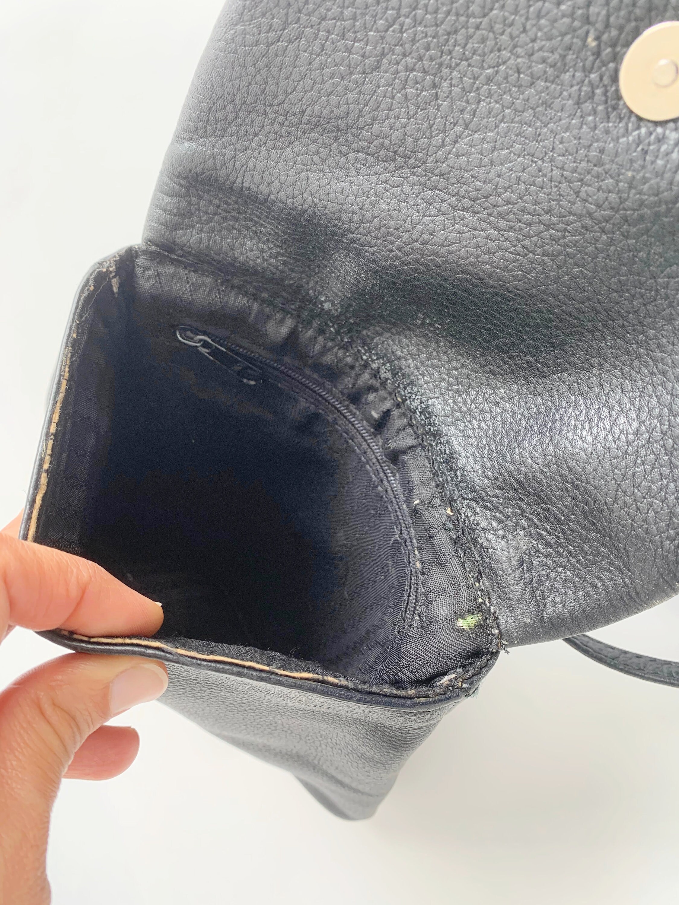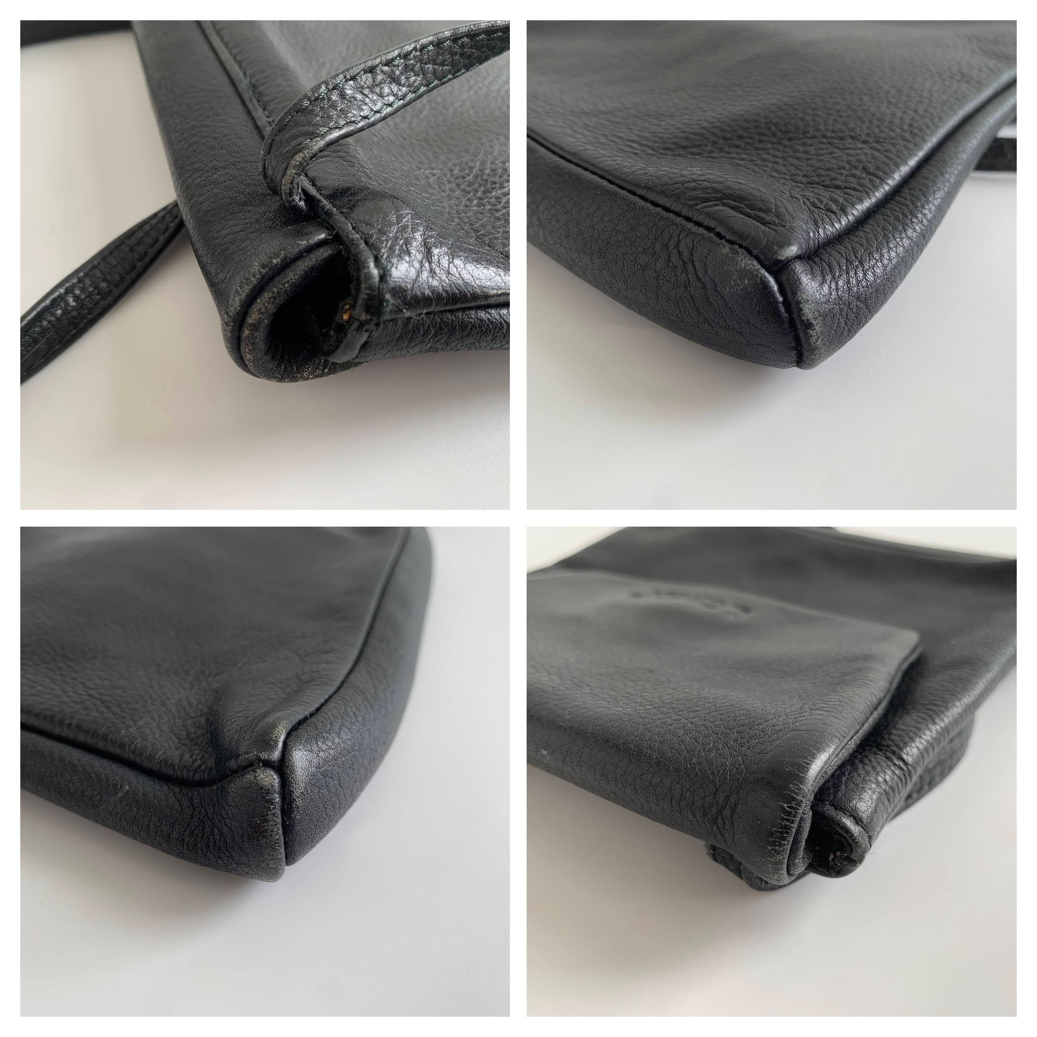 Condition: This small black crossbody purse has a distressed look as it was much loved. The leather shows some fading and has become lighter around the edges. There are scratches on the leather surface