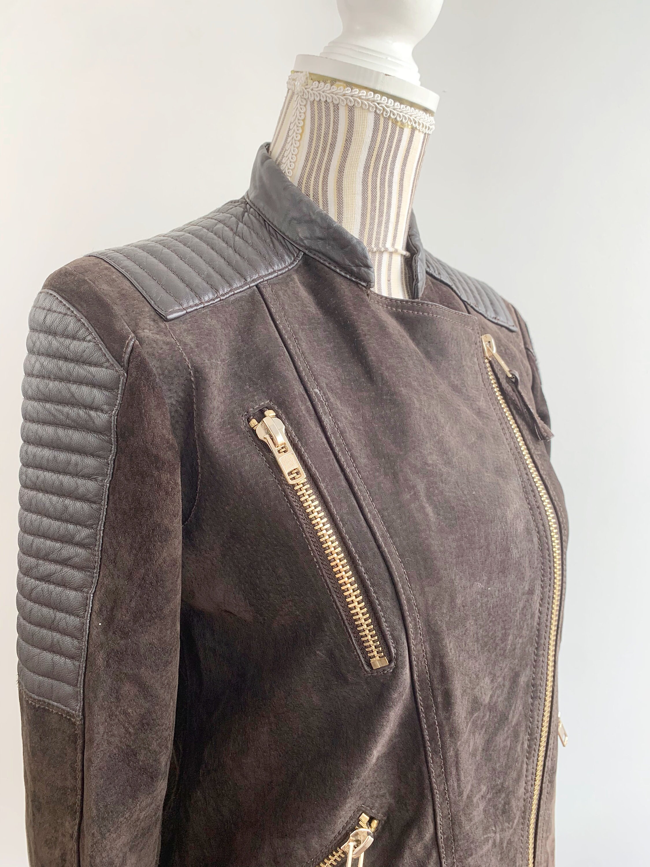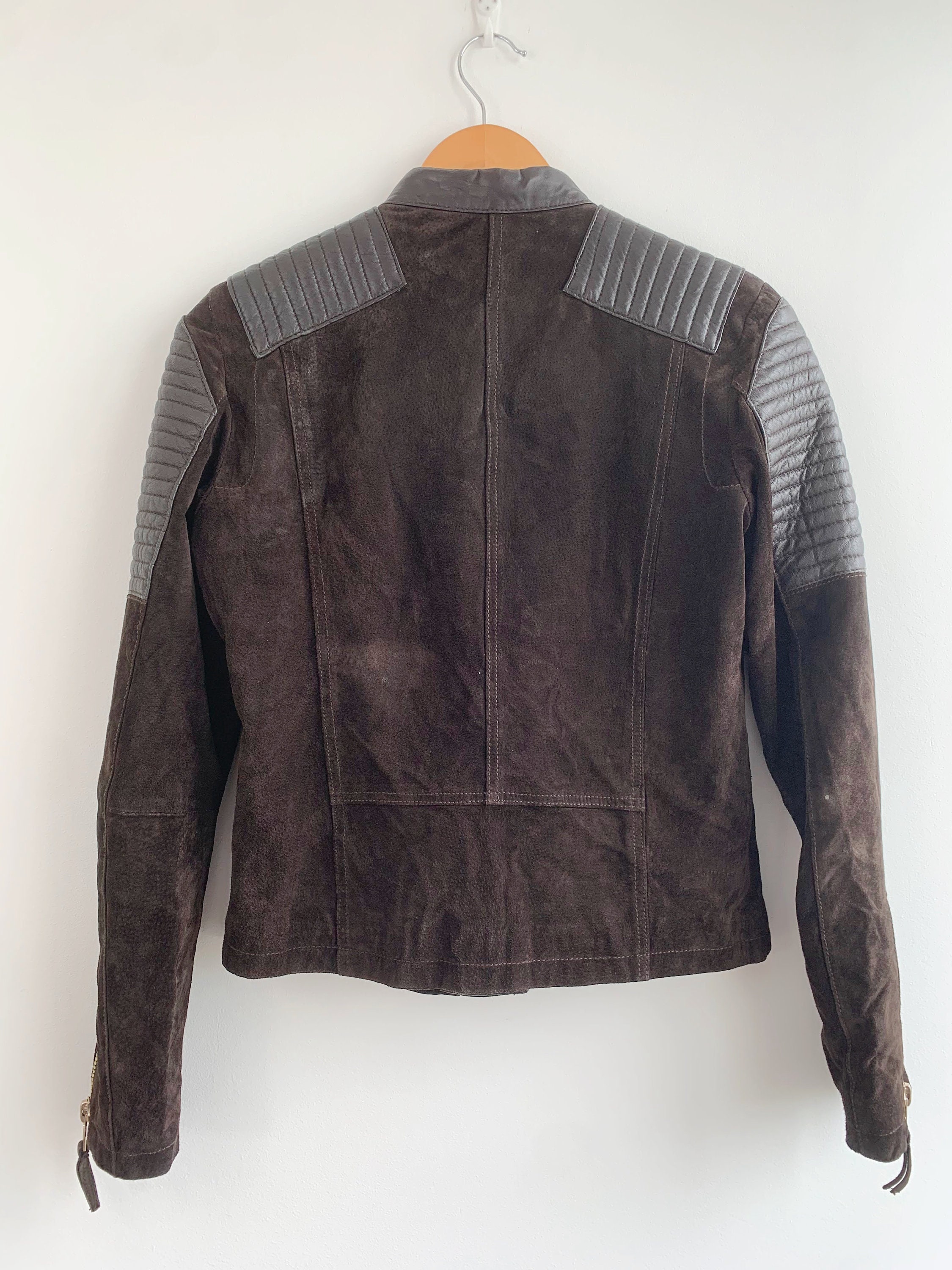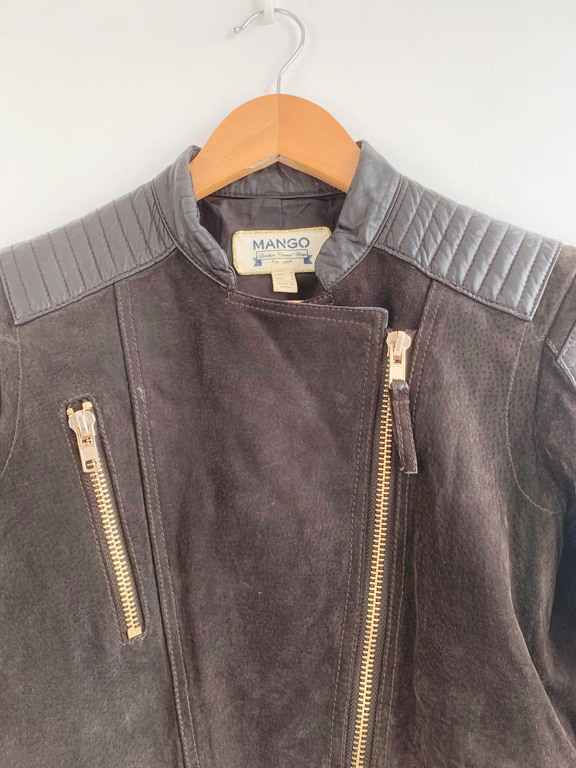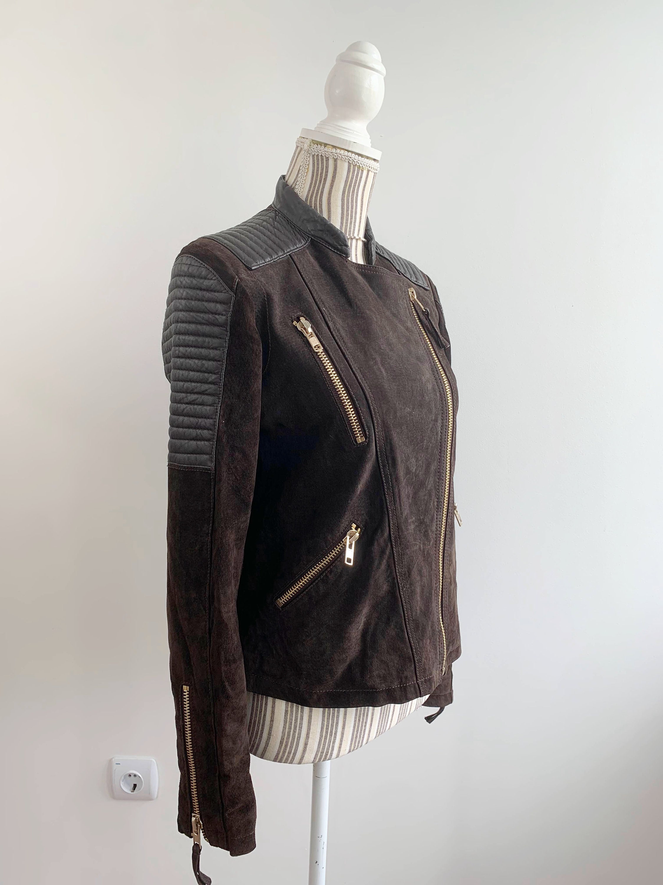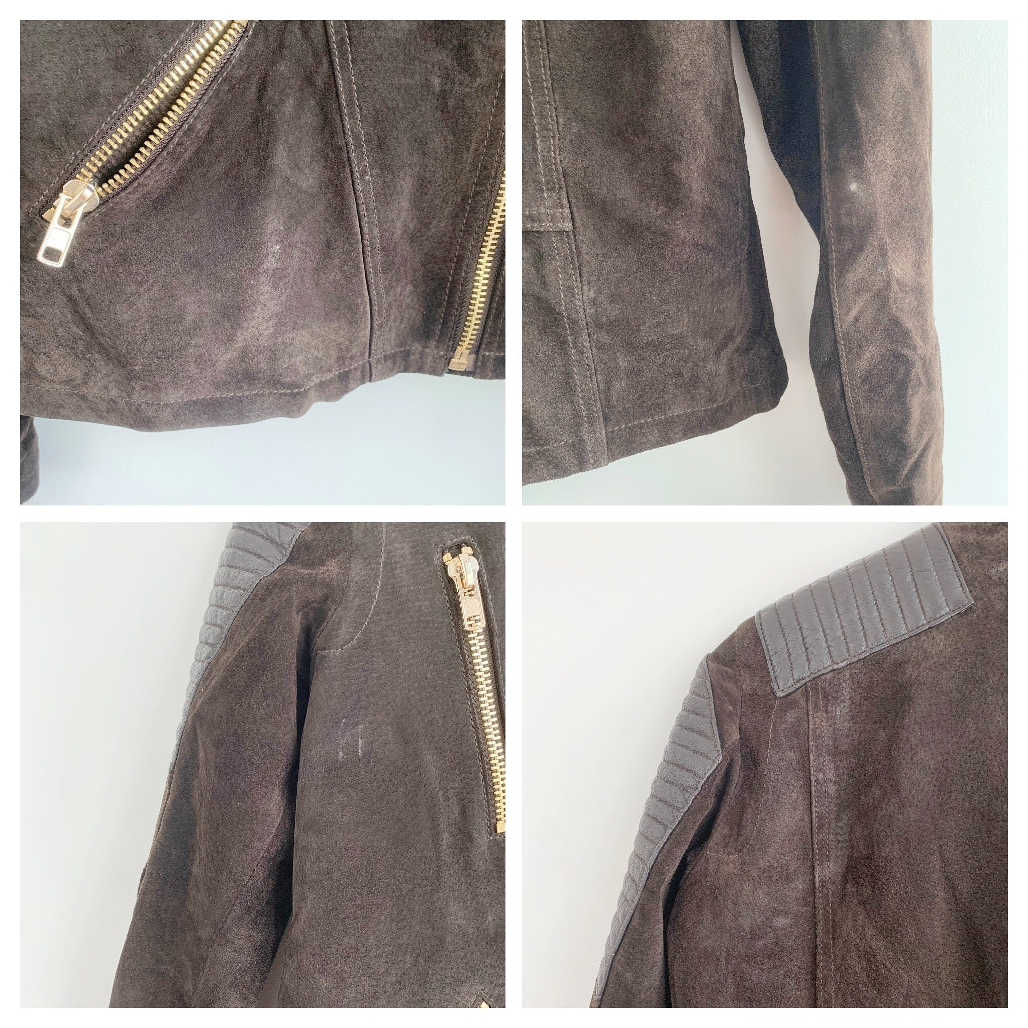 This is a vintage Y2K dark brown suede leather zip up jacket for women with asymmetrical front zipper and zip up pockets. This brown leather jacket is made of soft genuine suede leather. This rocker style jacket for women has three side pockets and one chest pocket with zip closure. It has polyester lining. This suede leather jacket is size S. Please check the measurements below.
