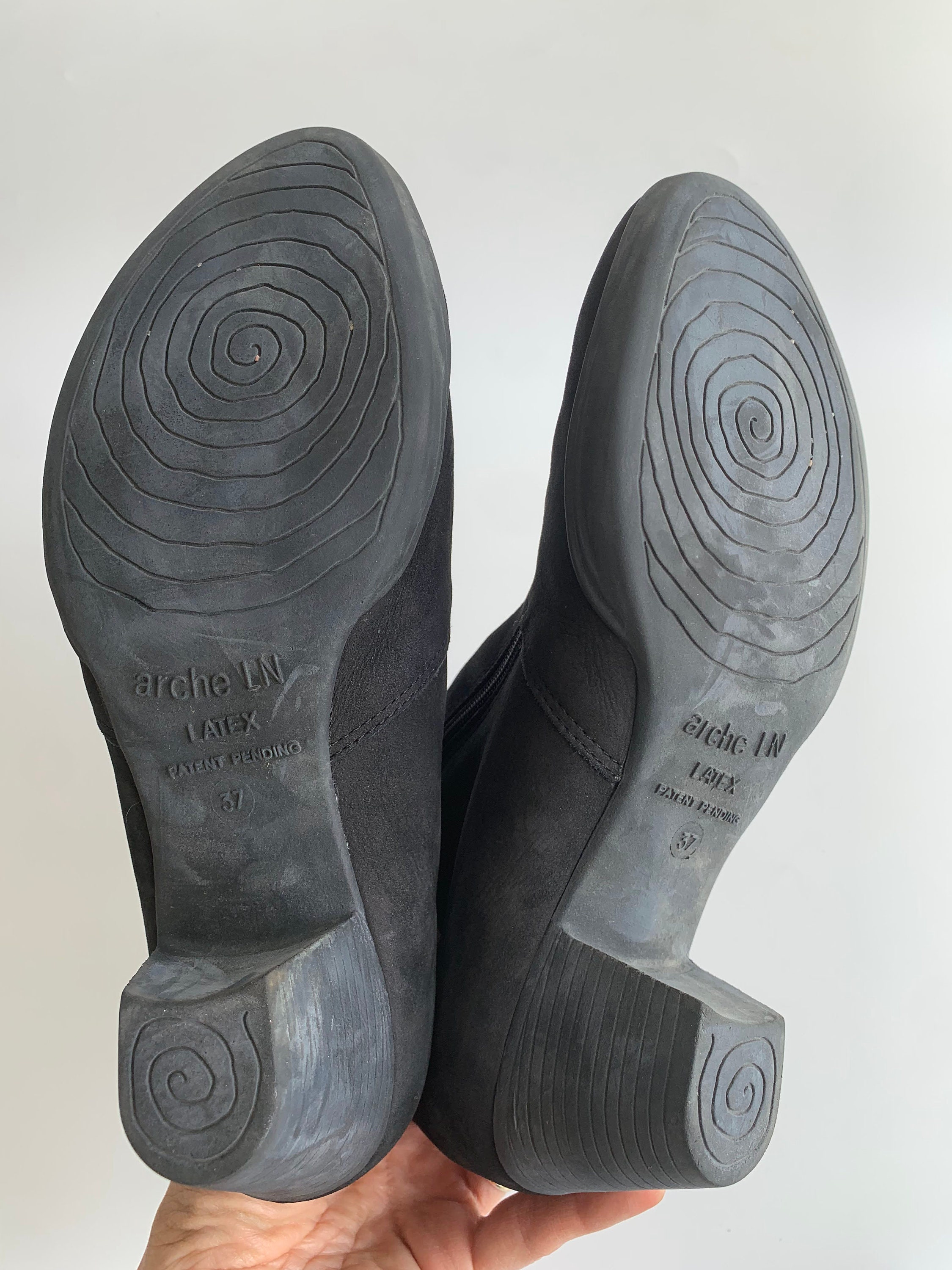 These are beautiful black mat leather ankle boots by the French brand Arche. The leather is very soft and mat, it almost feels like suede. These black leather boots are make of super soft leather and comfortable low heel rubber sole. These leather boots have two zippers on each side, so you can easily put them on and take them on. Super comfy walking boots for the spring / fall season. They have warm felt wool lining. These soft suede boots are size EUR 37, which corresponds to UK 4, US 6. Please check the measurements below.