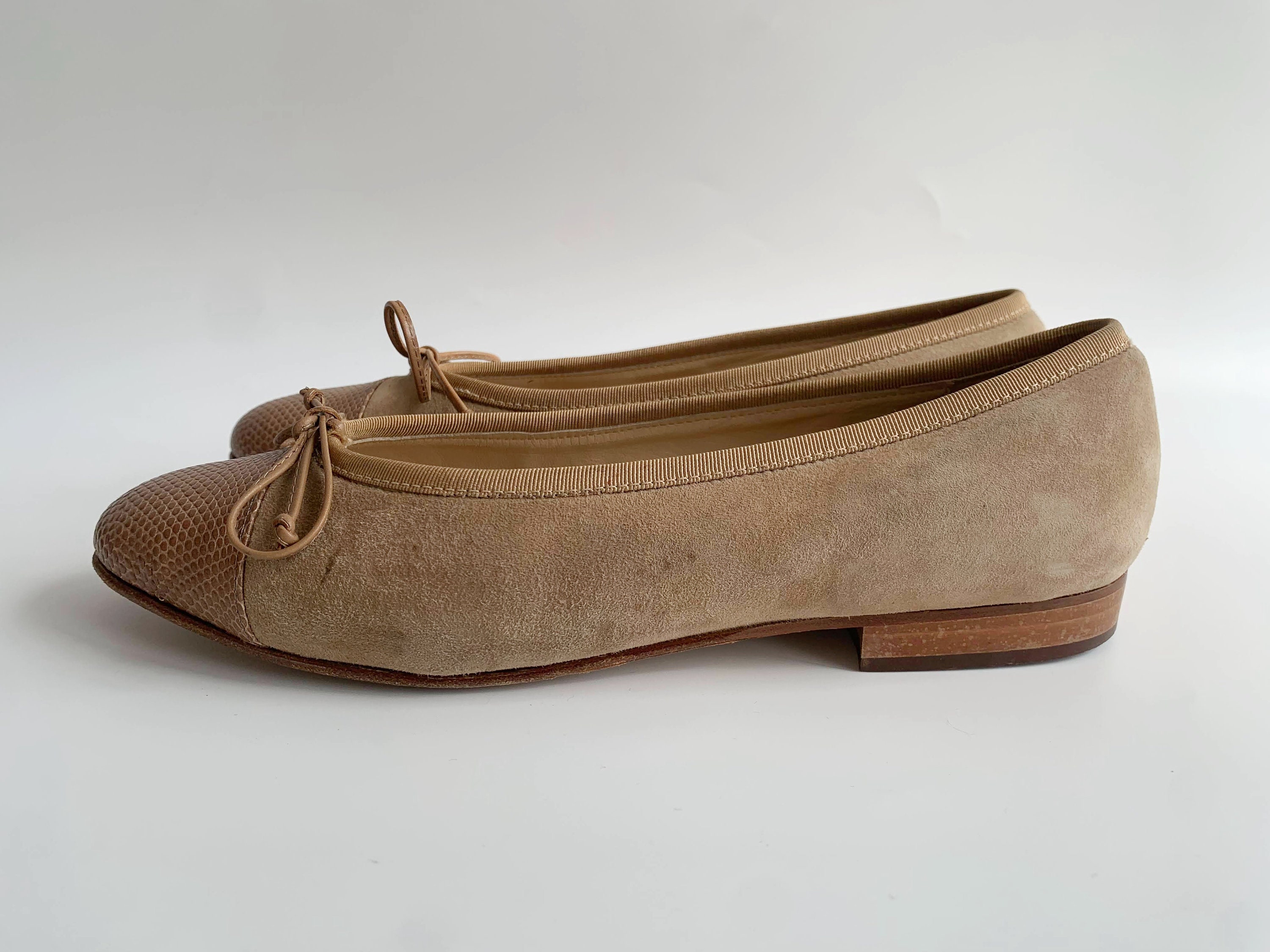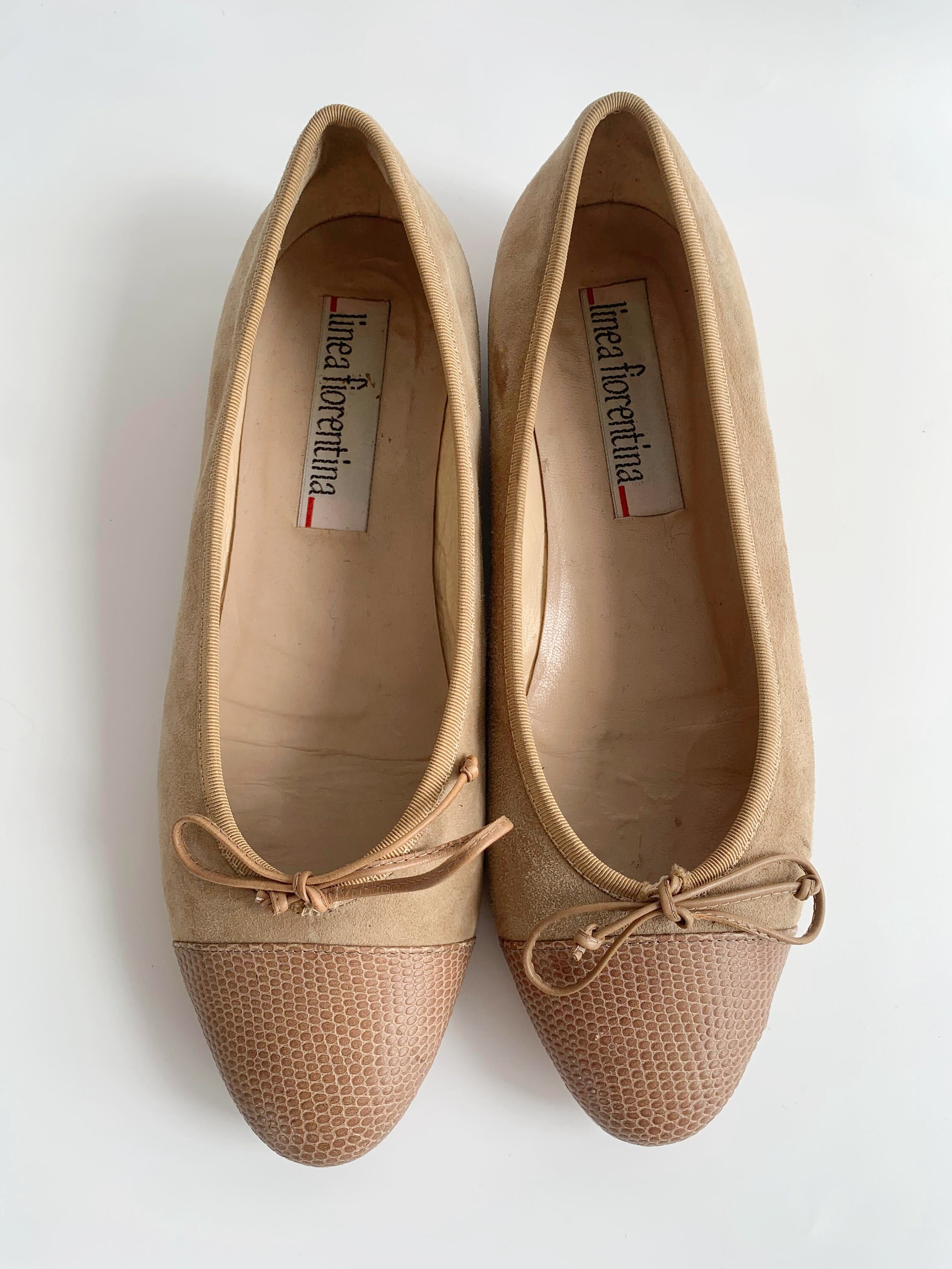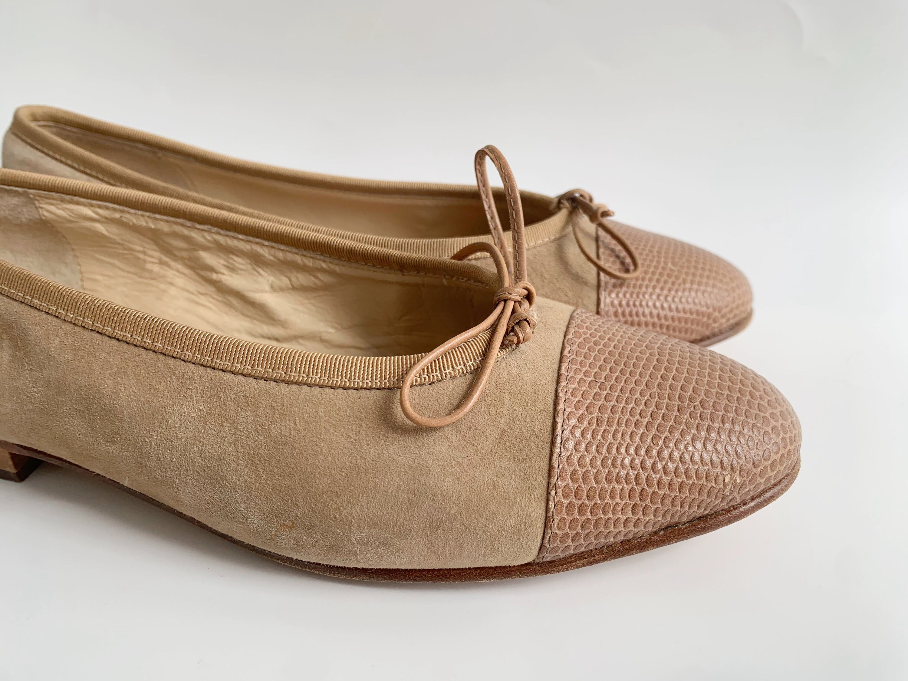 These are cute vintage 80s nude beige suede leather ballerina flats for women size EUR 38, which corresponds to UK 5, US 7.5. These nude suede bow flats are made of genuine suede leather with reptile embossed captoes, real leather interior and real leather soles. These neutral suede slip ons are super elegant and stylish. These suede loafers have round toes and low heels. Please check the measurements below.
