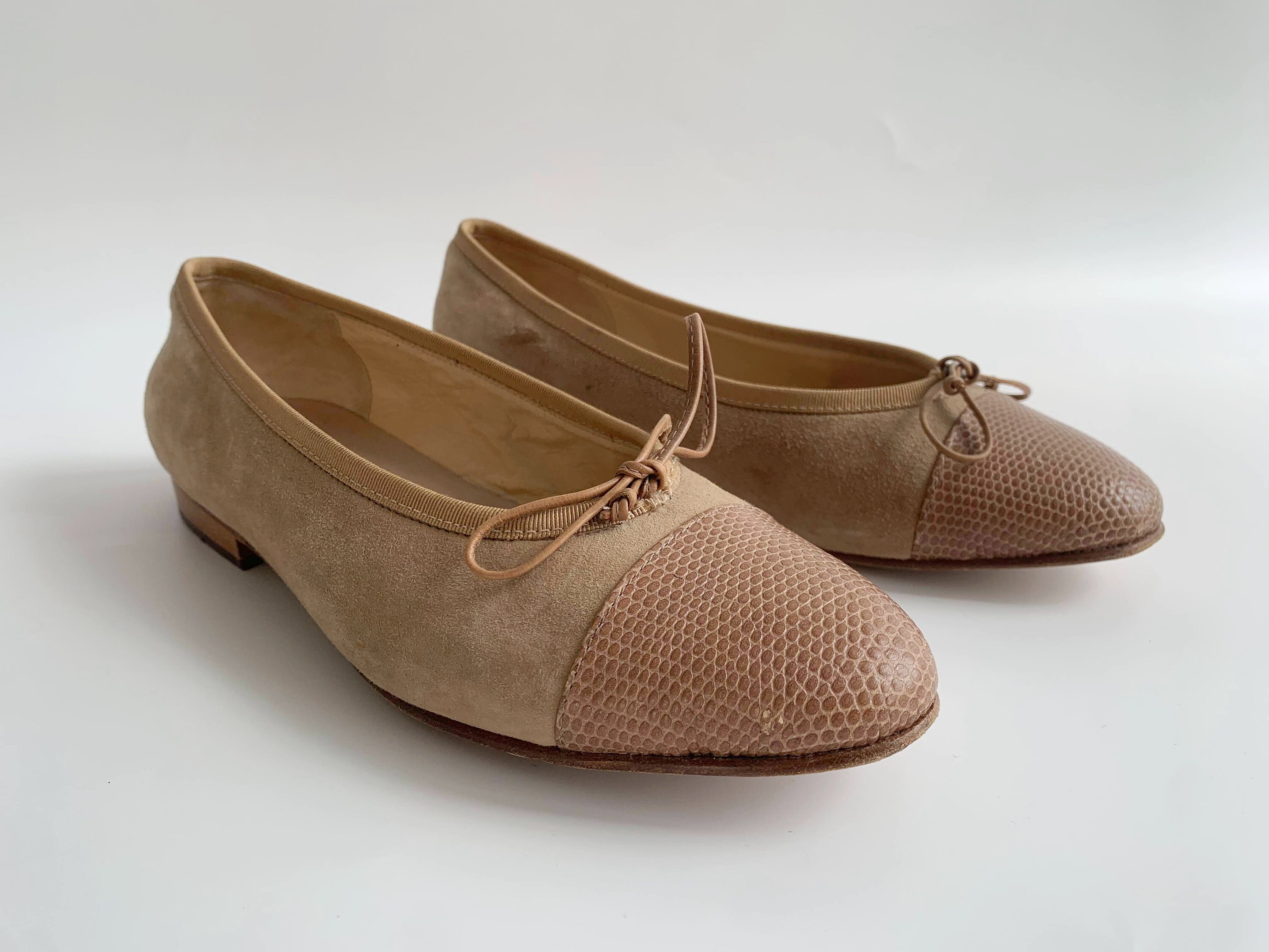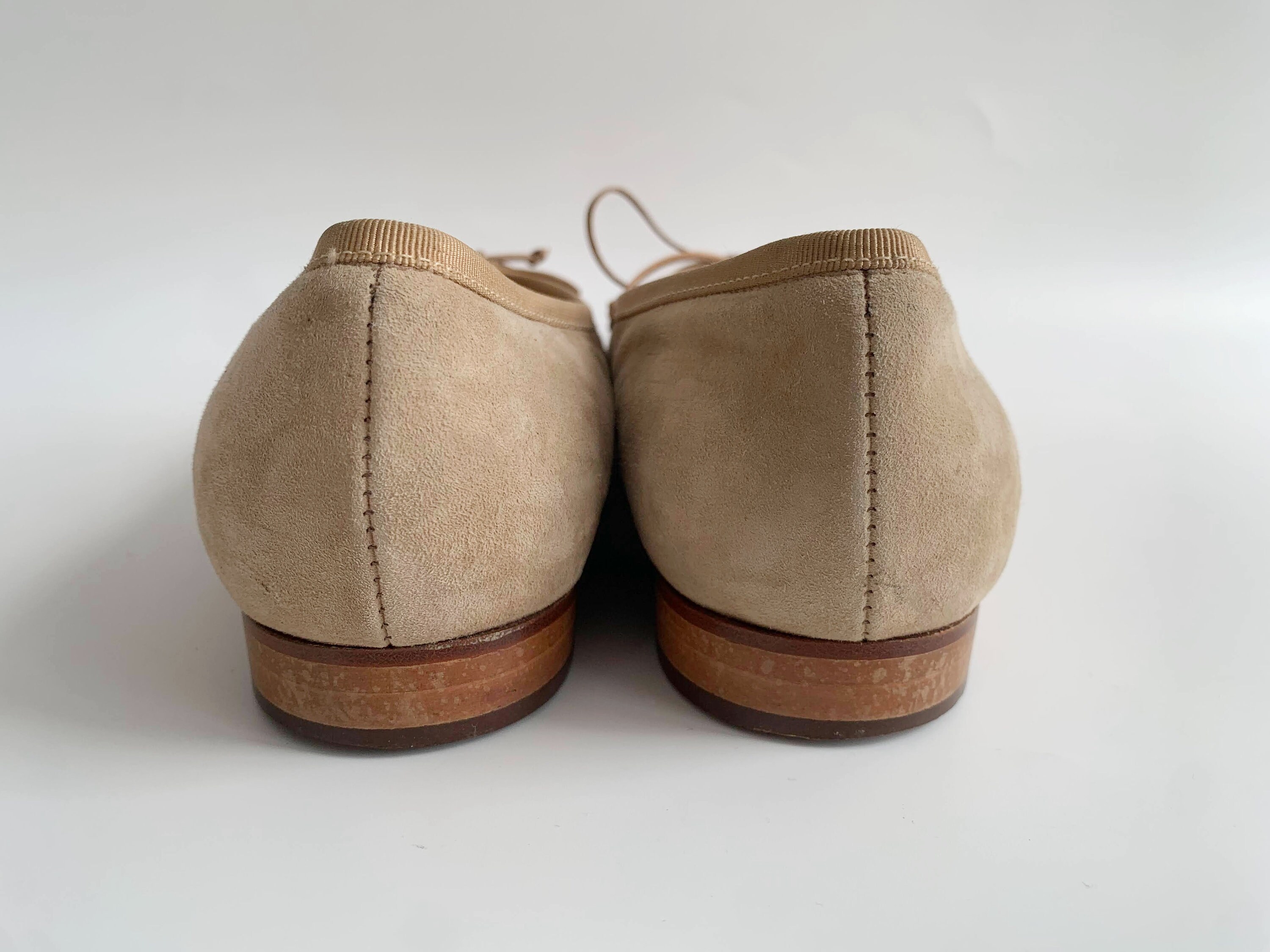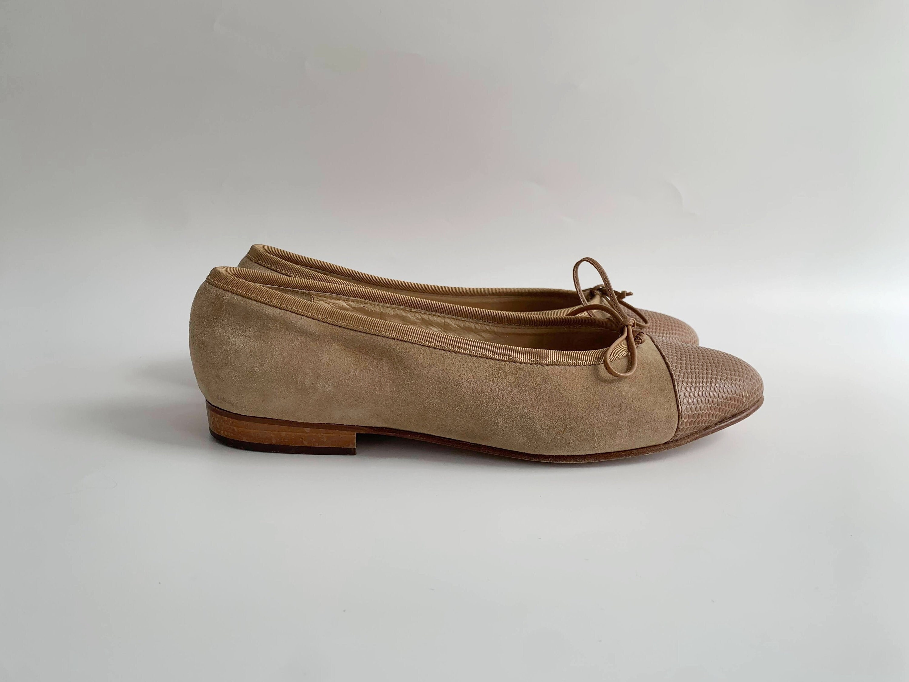 These are cute vintage 80s nude beige suede leather ballerina flats for women size EUR 38, which corresponds to UK 5, US 7.5. These nude suede bow flats are made of genuine suede leather with reptile embossed captoes, real leather interior and real leather soles. These neutral suede slip ons are super elegant and stylish. These suede loafers have round toes and low heels. Please check the measurements below.