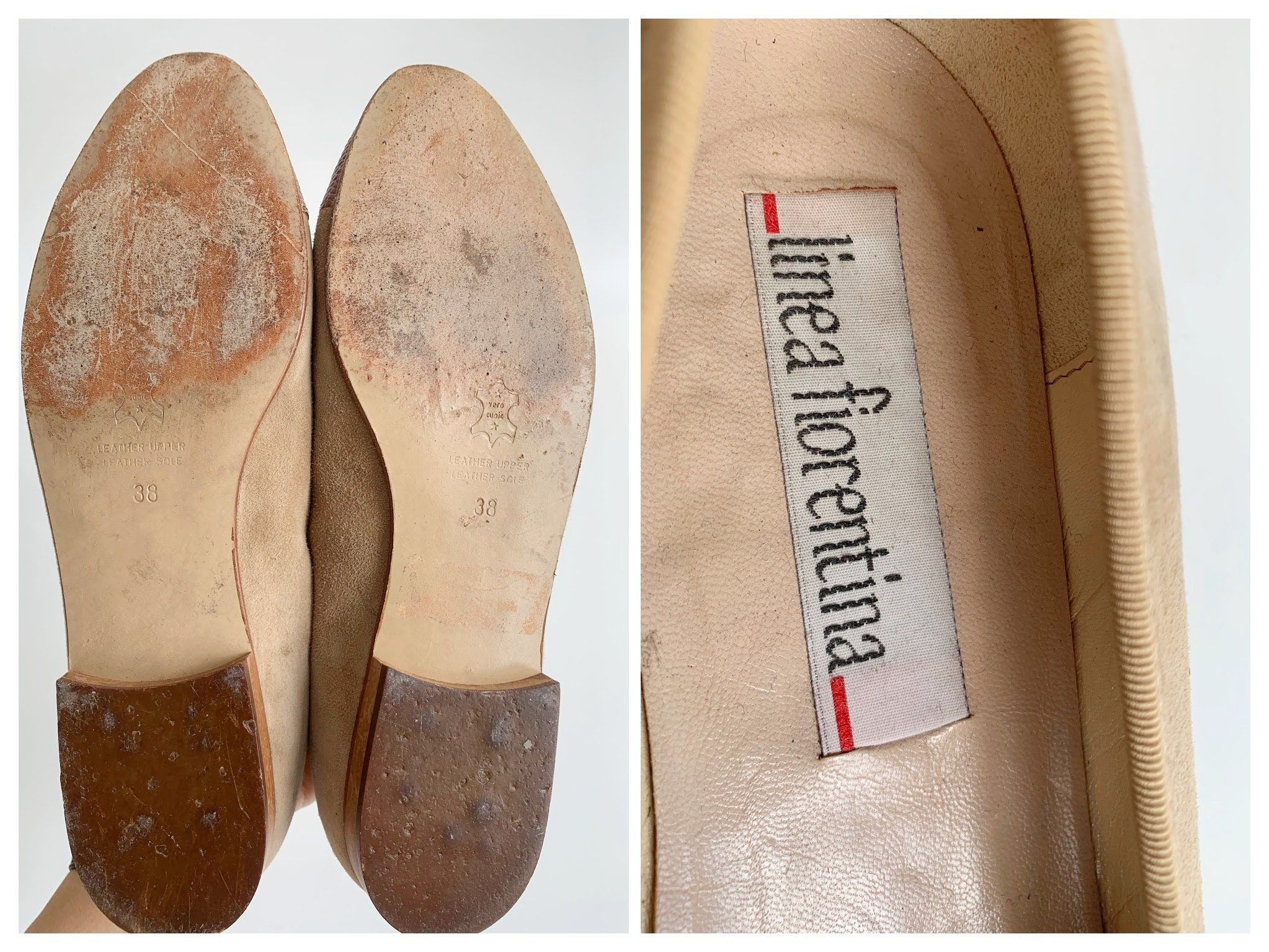 Condition: these suede leather loafers show some signs of wear typical for vintage suede leather items. There are some marks on the suede leather surface and on the real leather captoes, which I have tried to capture in the close up photos.