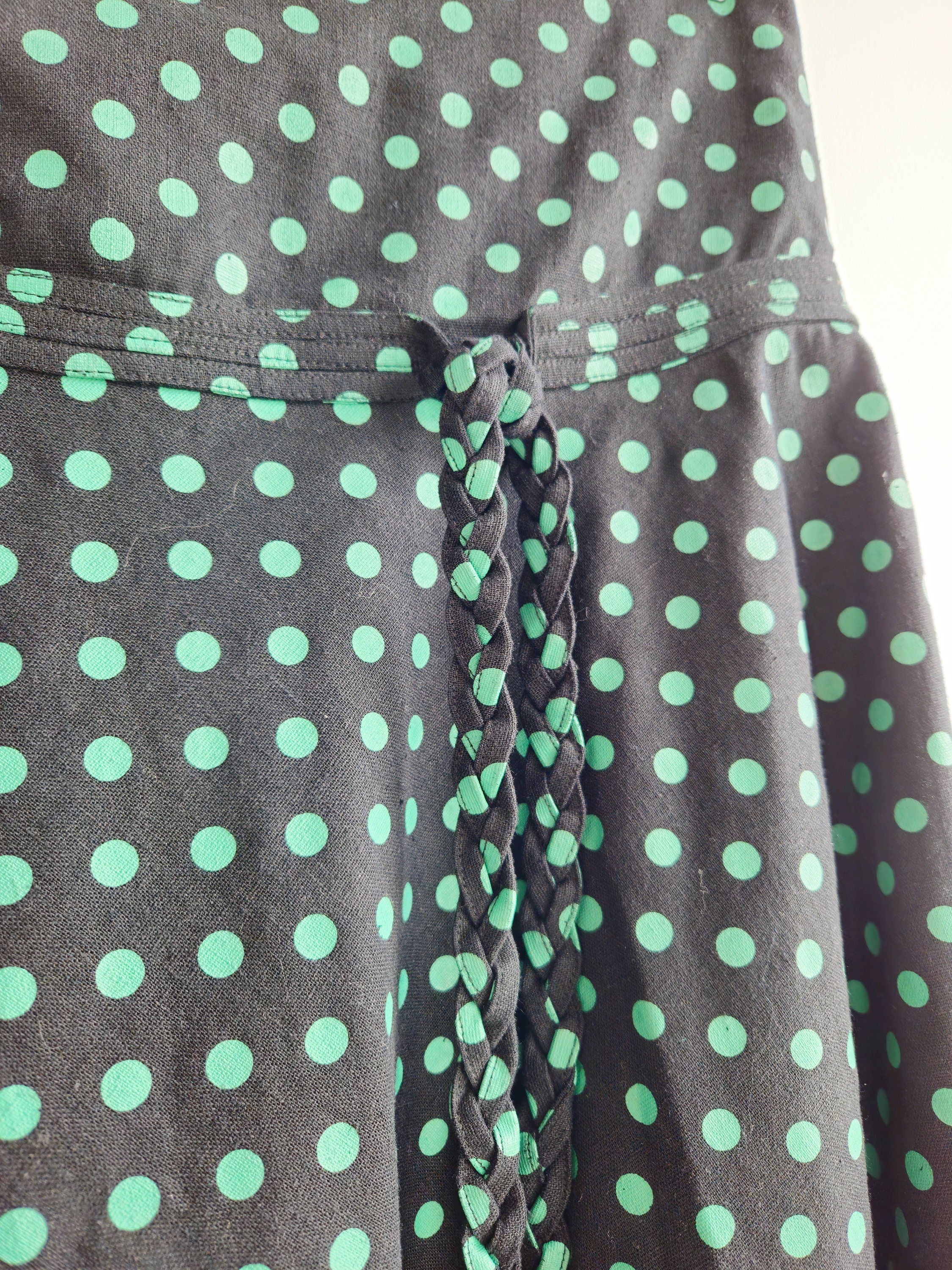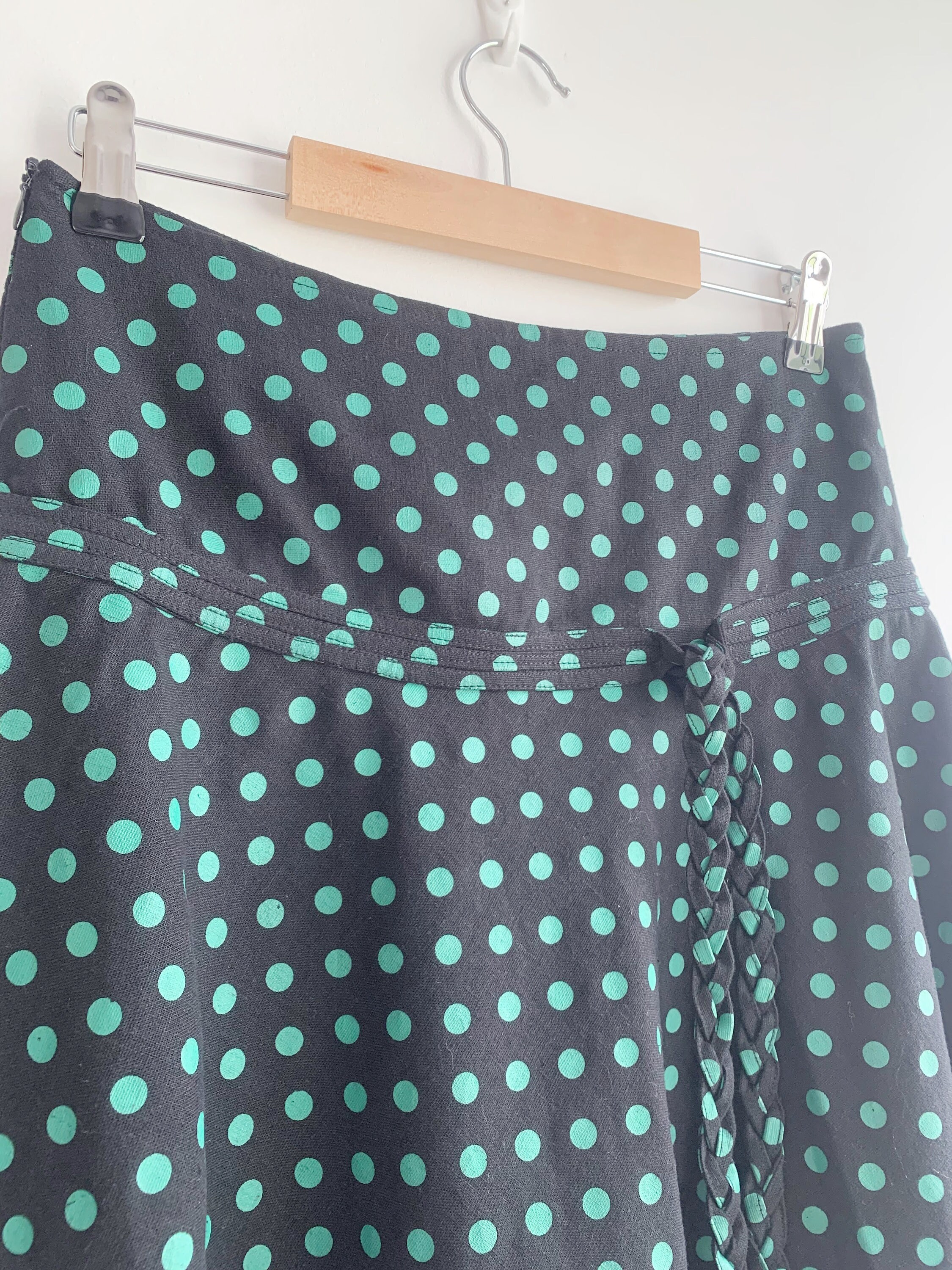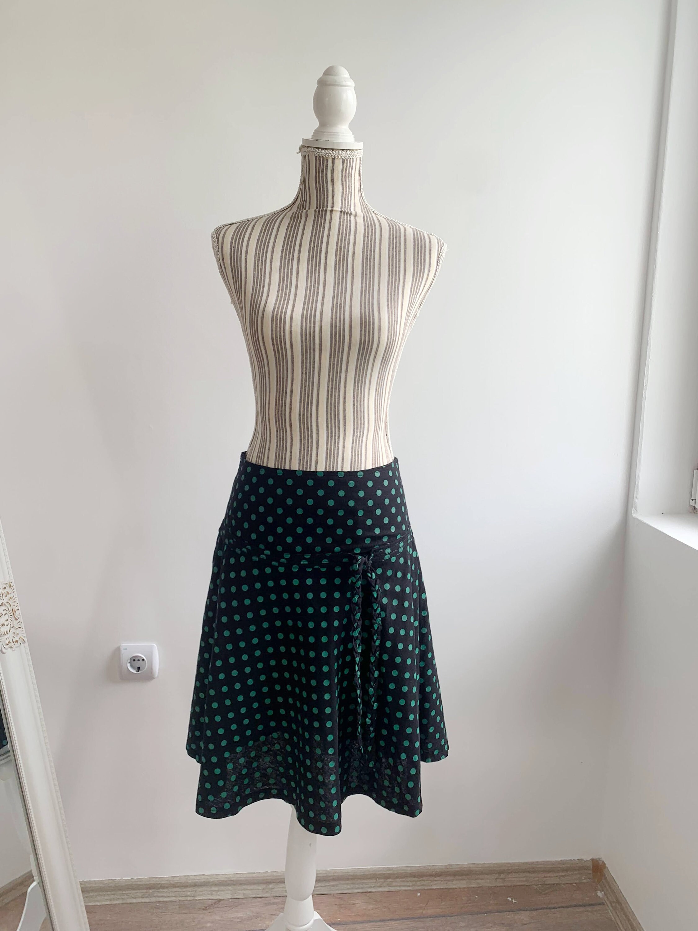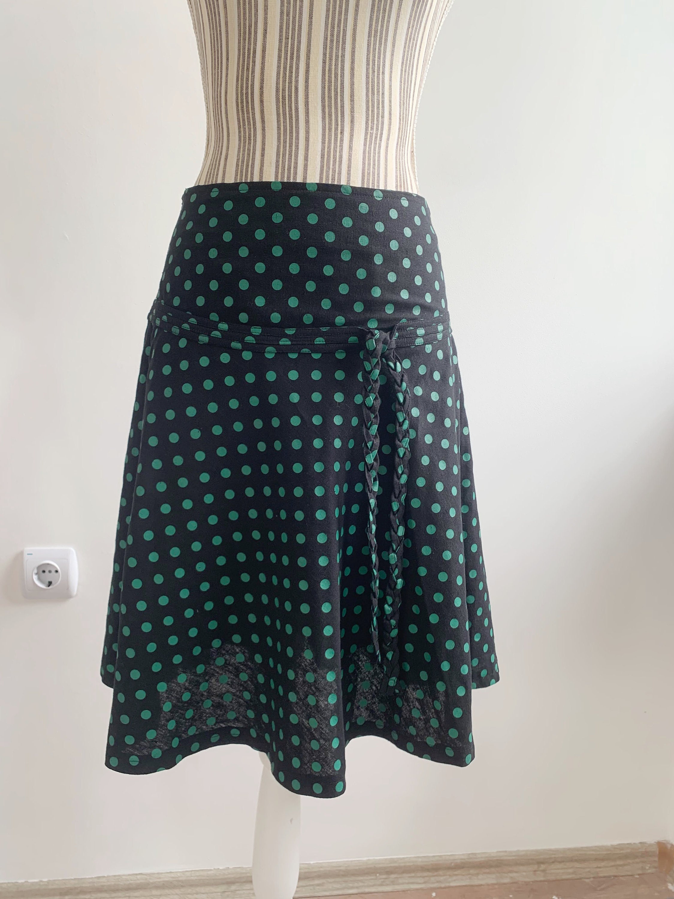 This is a vintage 90s Y2K black polka dot print mini skirt with side zip closure This short mini skirt has a beautiful knee length A line silhouette. The print is super cute and retro style. This summer mini skirt has no lining underneath so it's perfect for the warmer days. No size is marked, it fits like size S. Please check the measurements below.