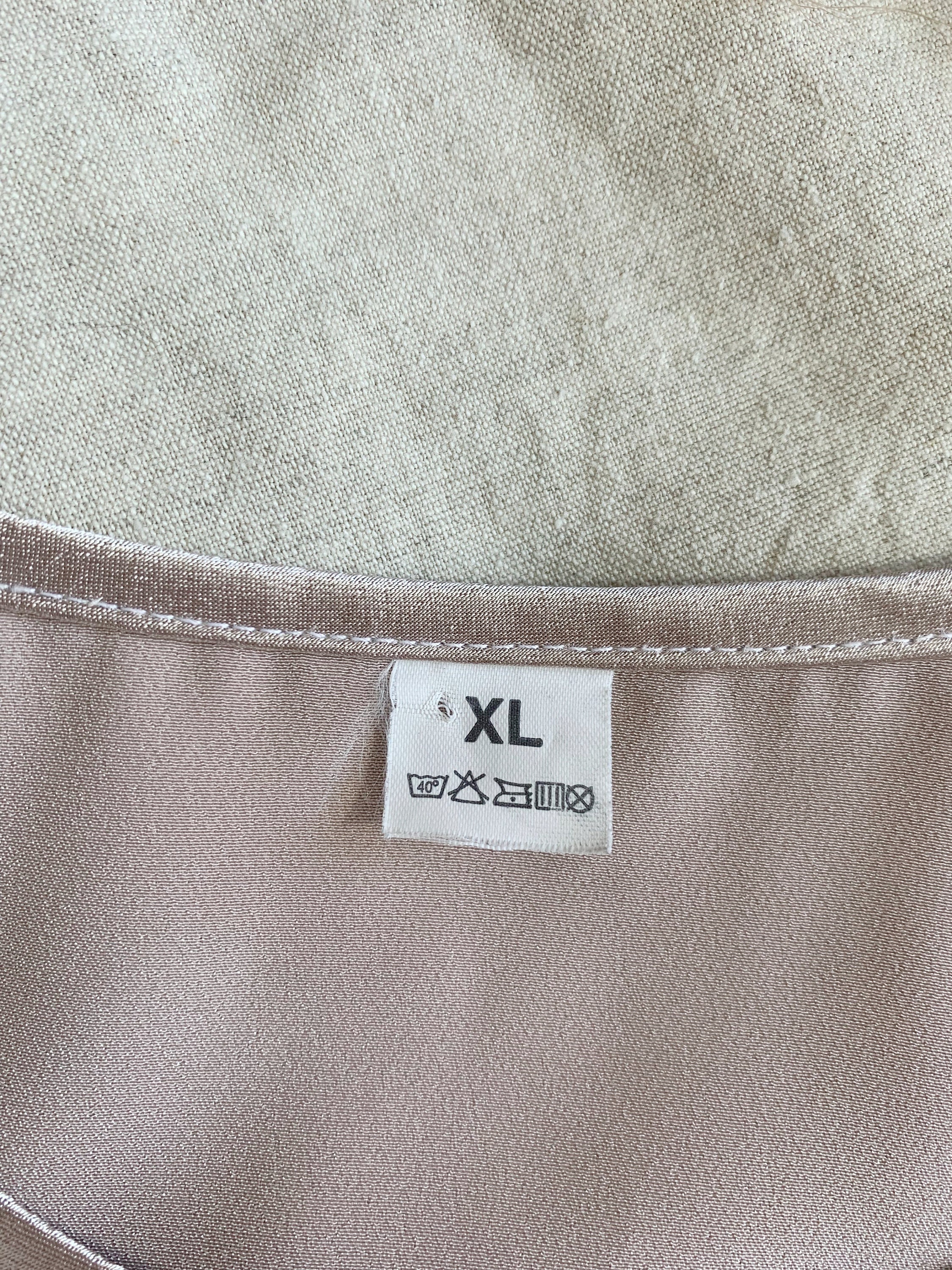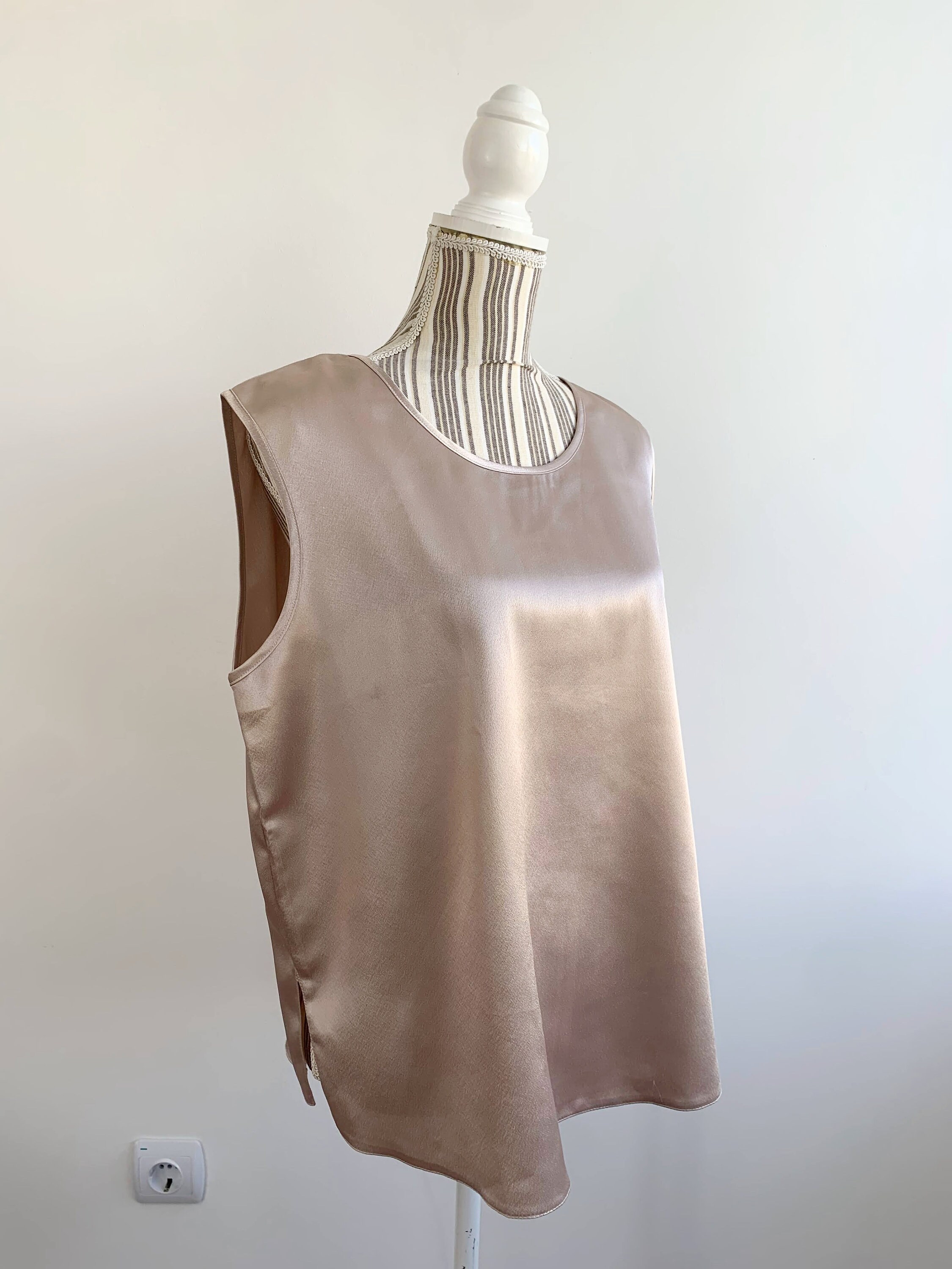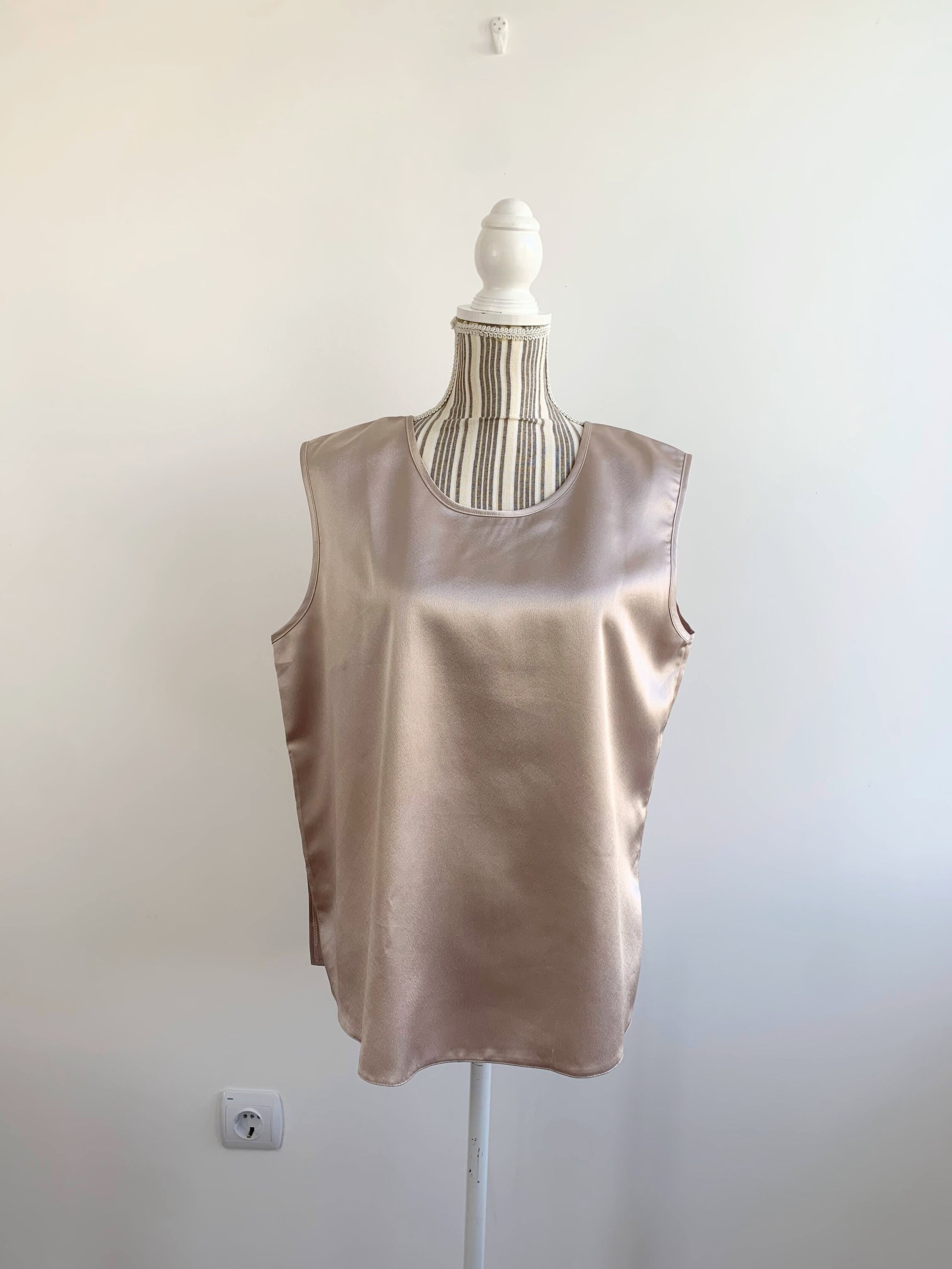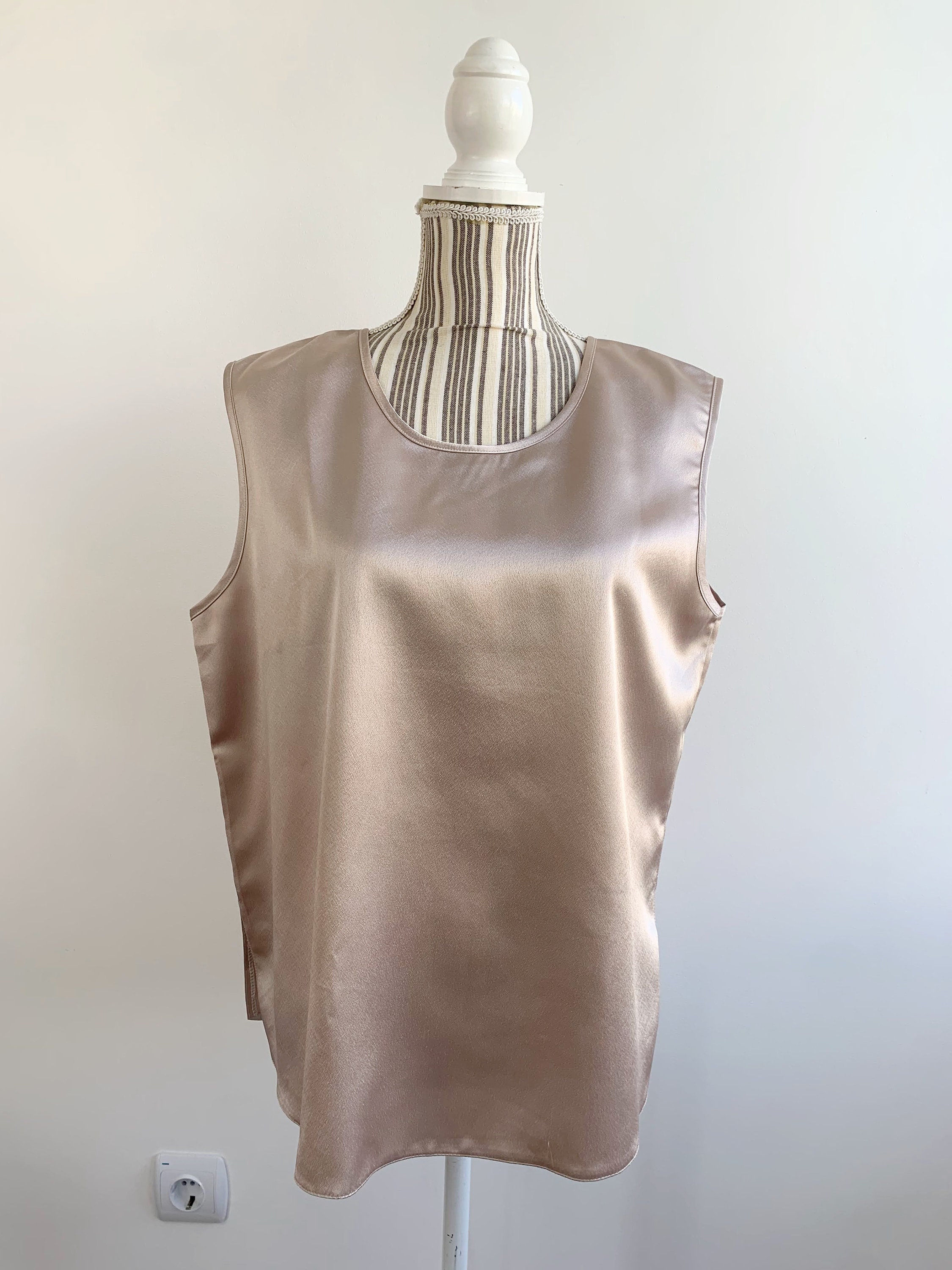 This is a silky satin top, made of smooth shiny fabric which feels like polyester. This vintage cami top is in champagne beige color, perfect to wear as an office shirt, sleepwear or as a cami top. The satin fabric has beautiful shine when exposed to light
