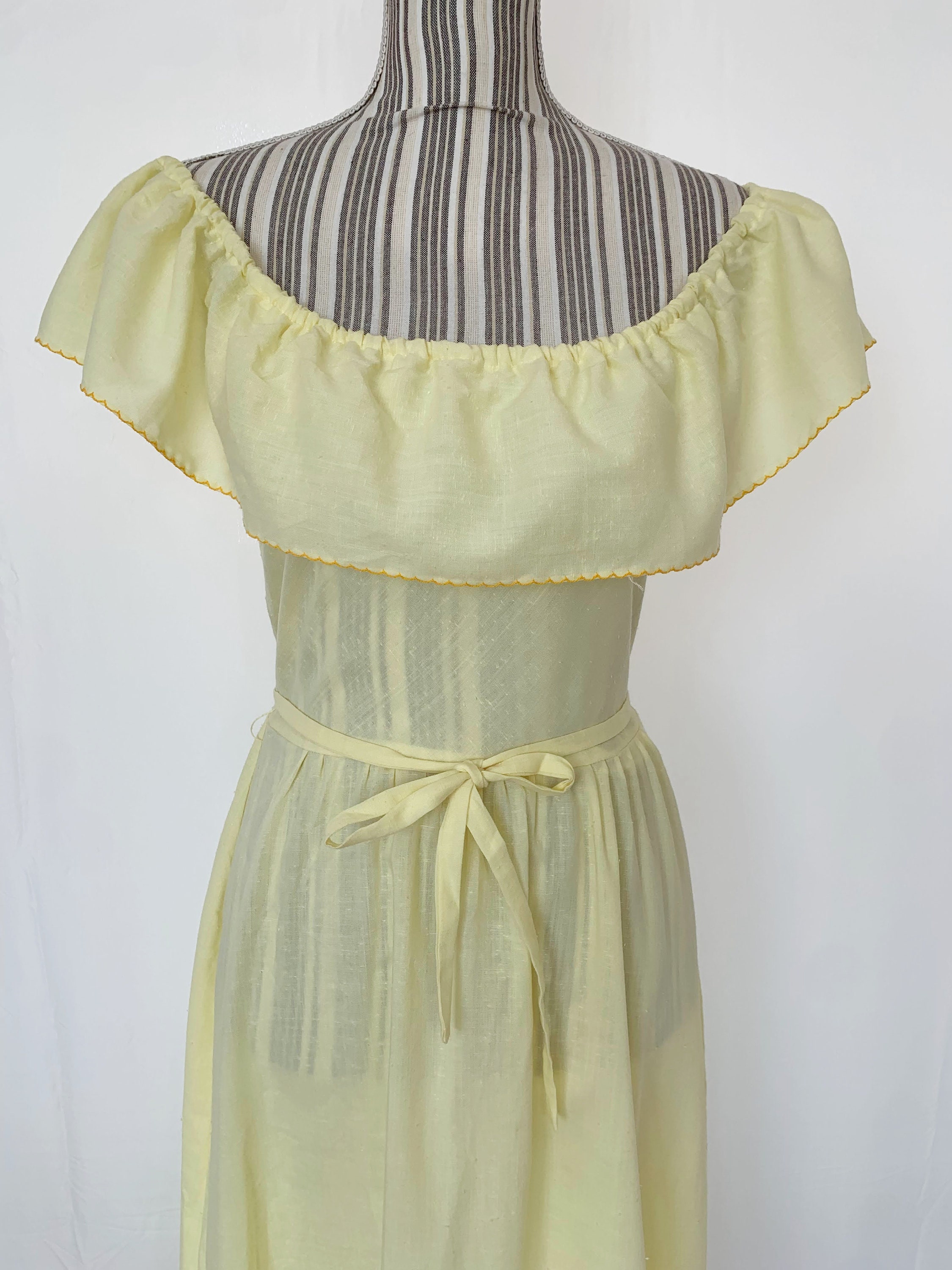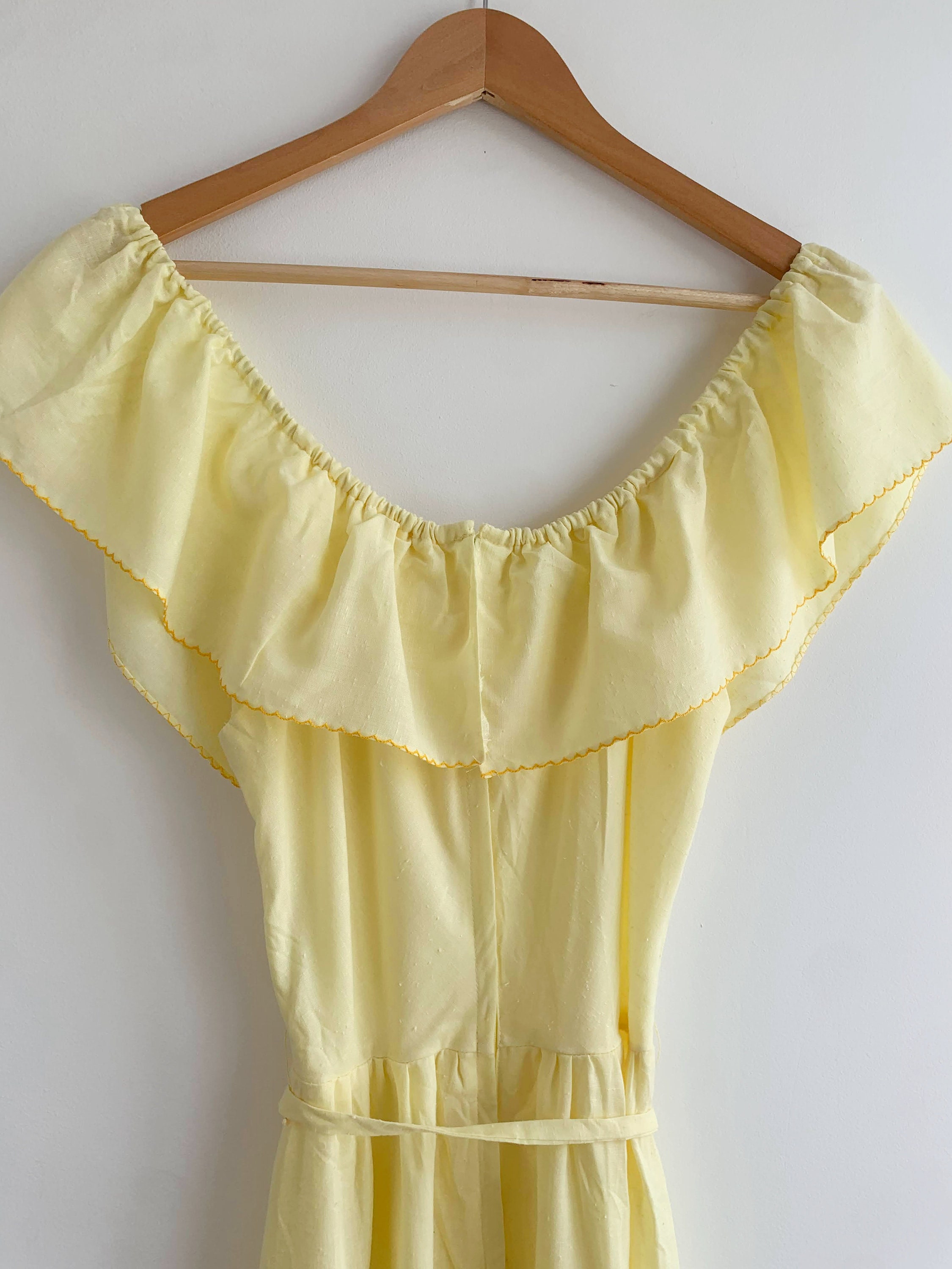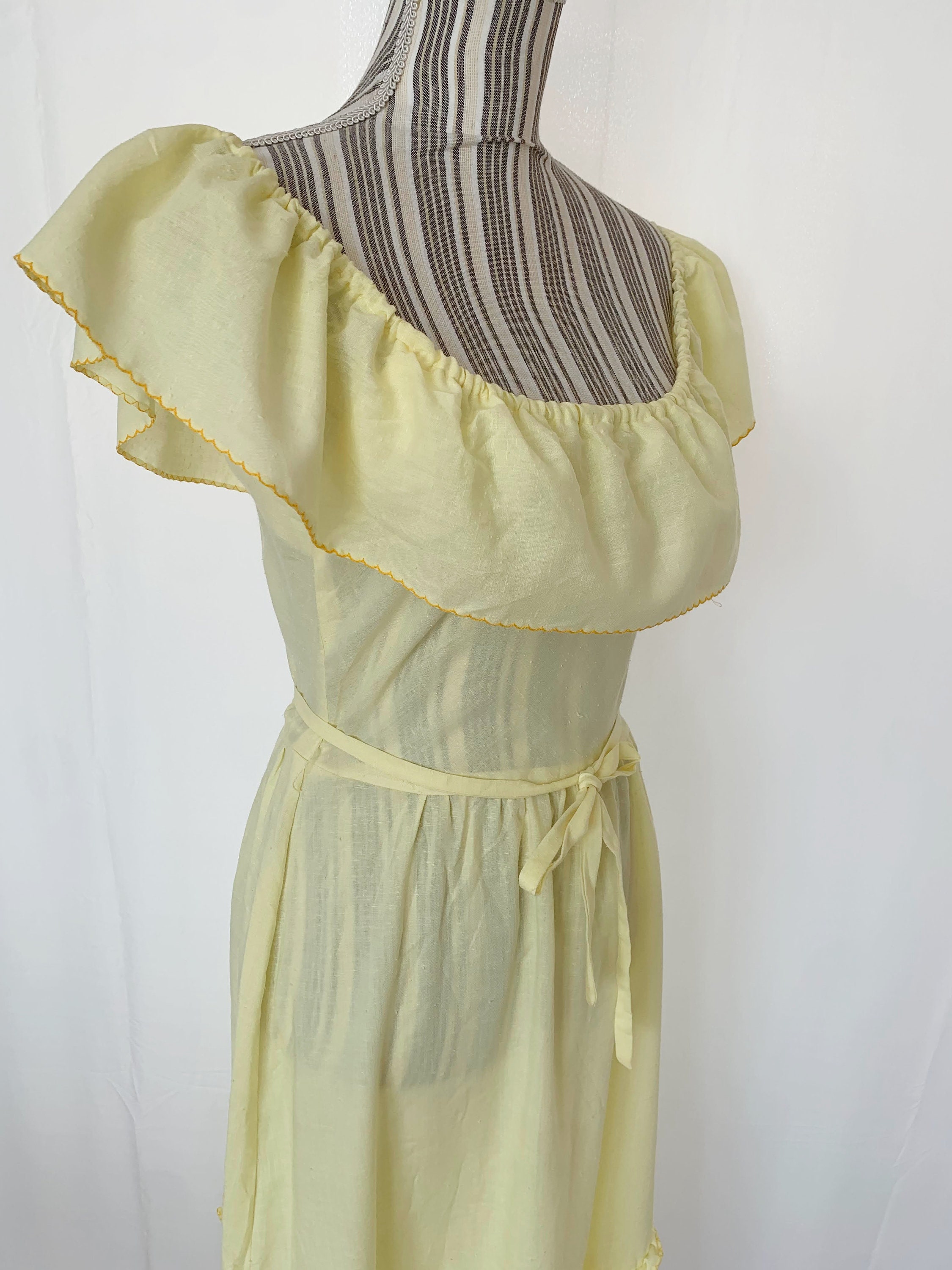 This is a beautiful vintage cotton semi sheer yellow maxi dress with off the shoulder neckline and detachable matching tie belt. This cute romantic summer day dress beautifully cinches your waist and flares at the bottom. This corragecore peasant dress is made of textured lightweight fabric which feels like cotton. It has no stretch. This bohemian 70s dress has back zip closure, so you can easily put it on and take it off.