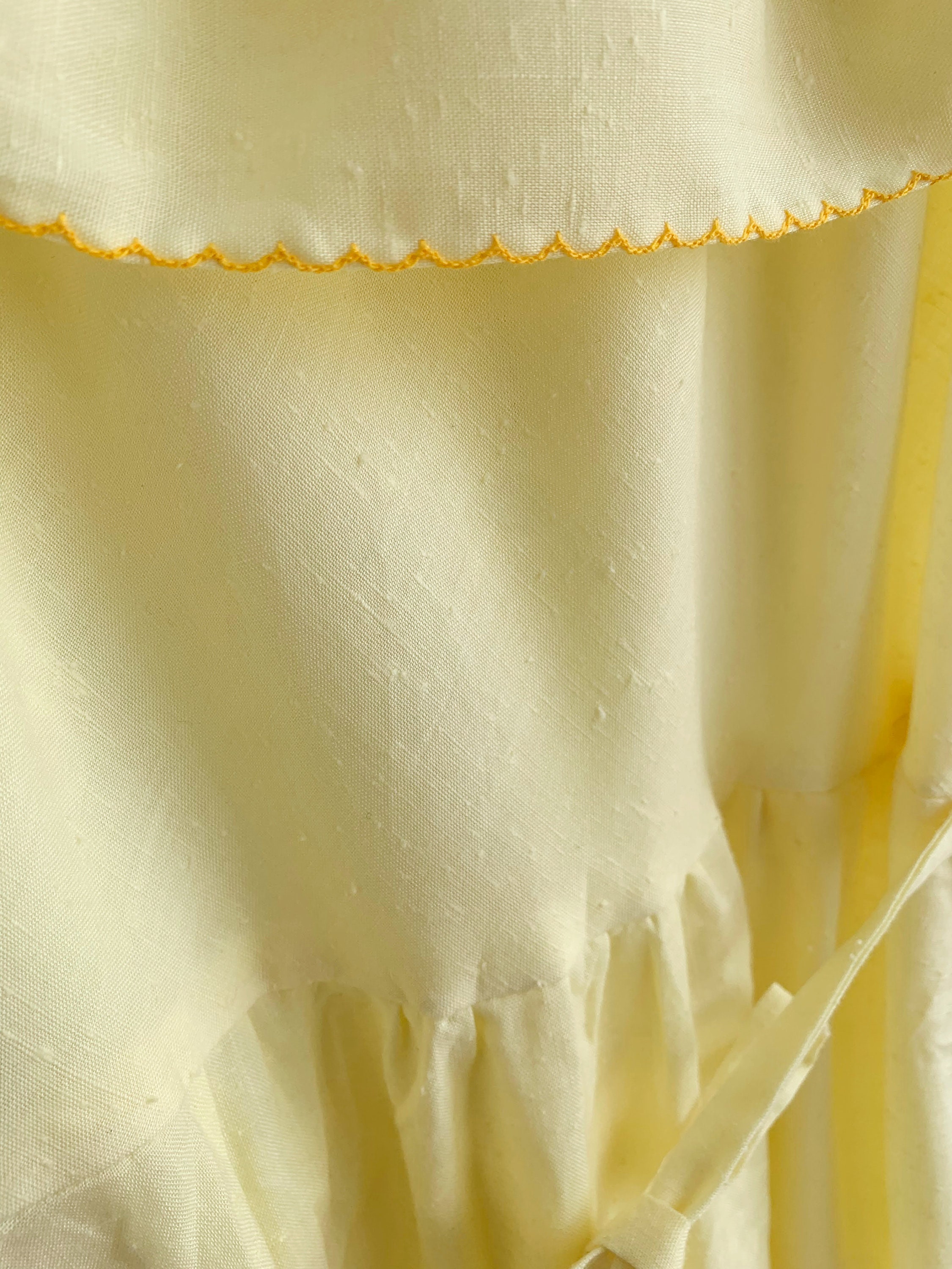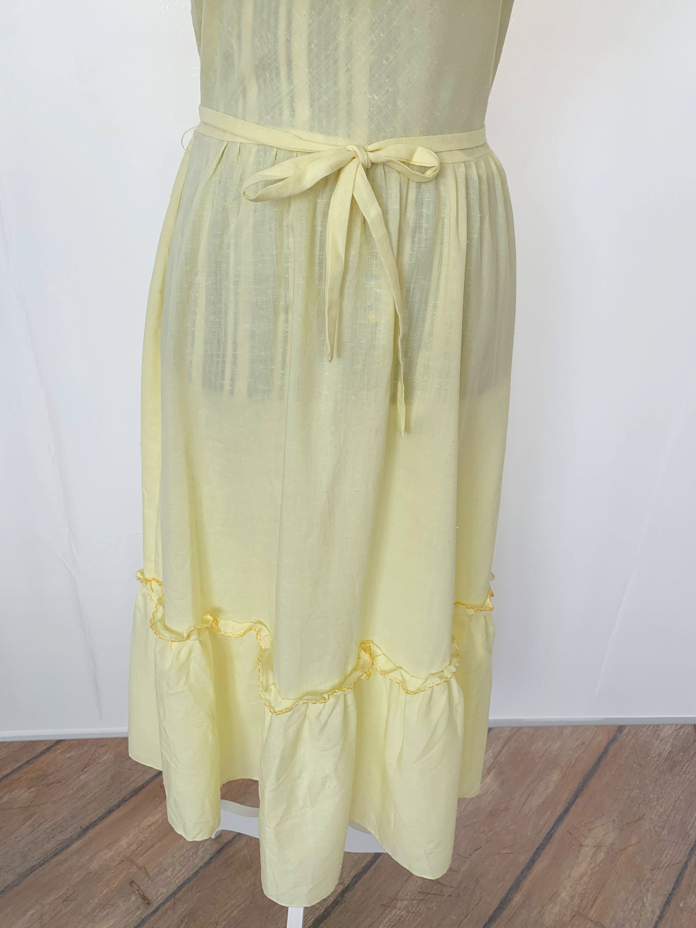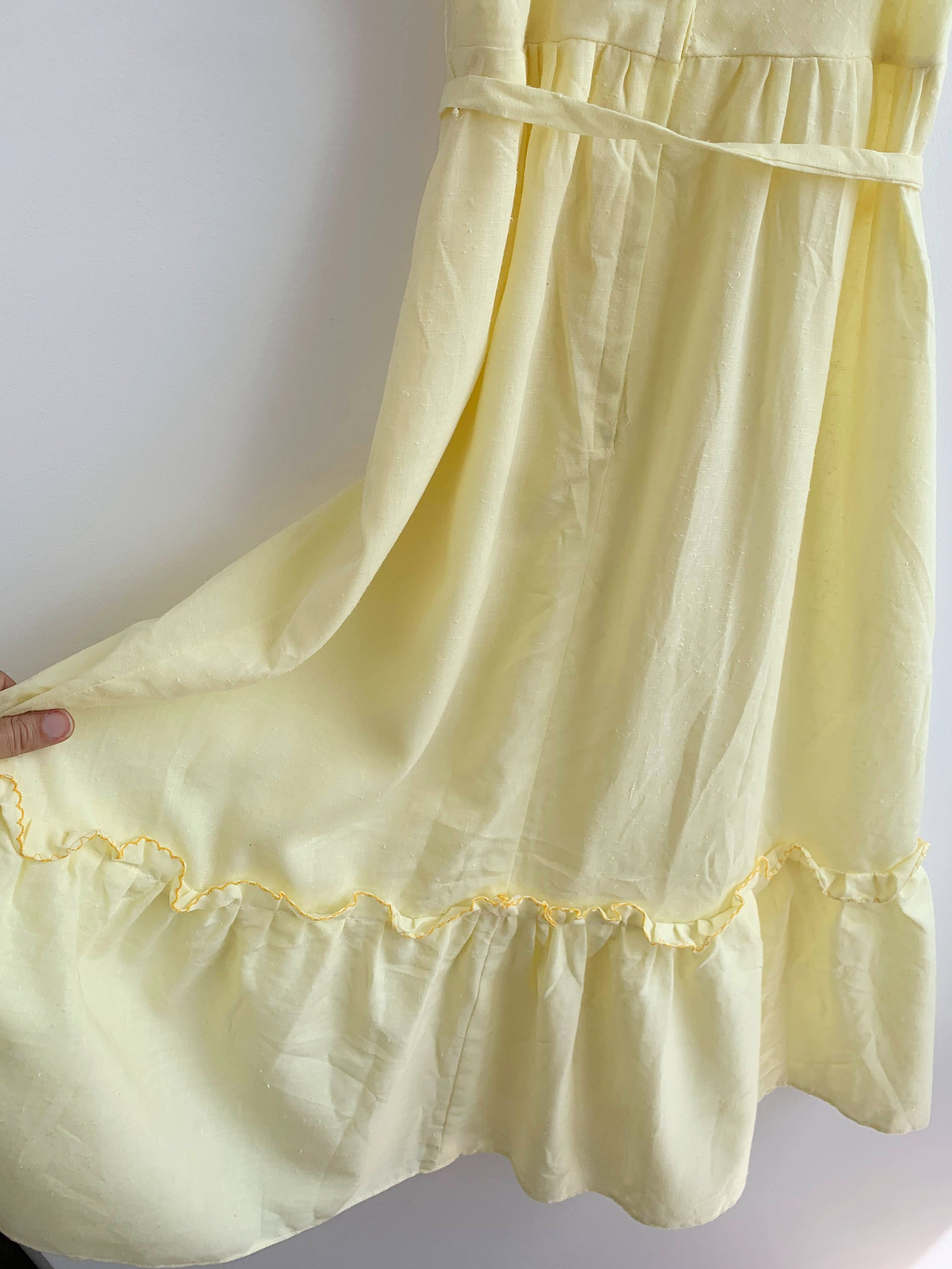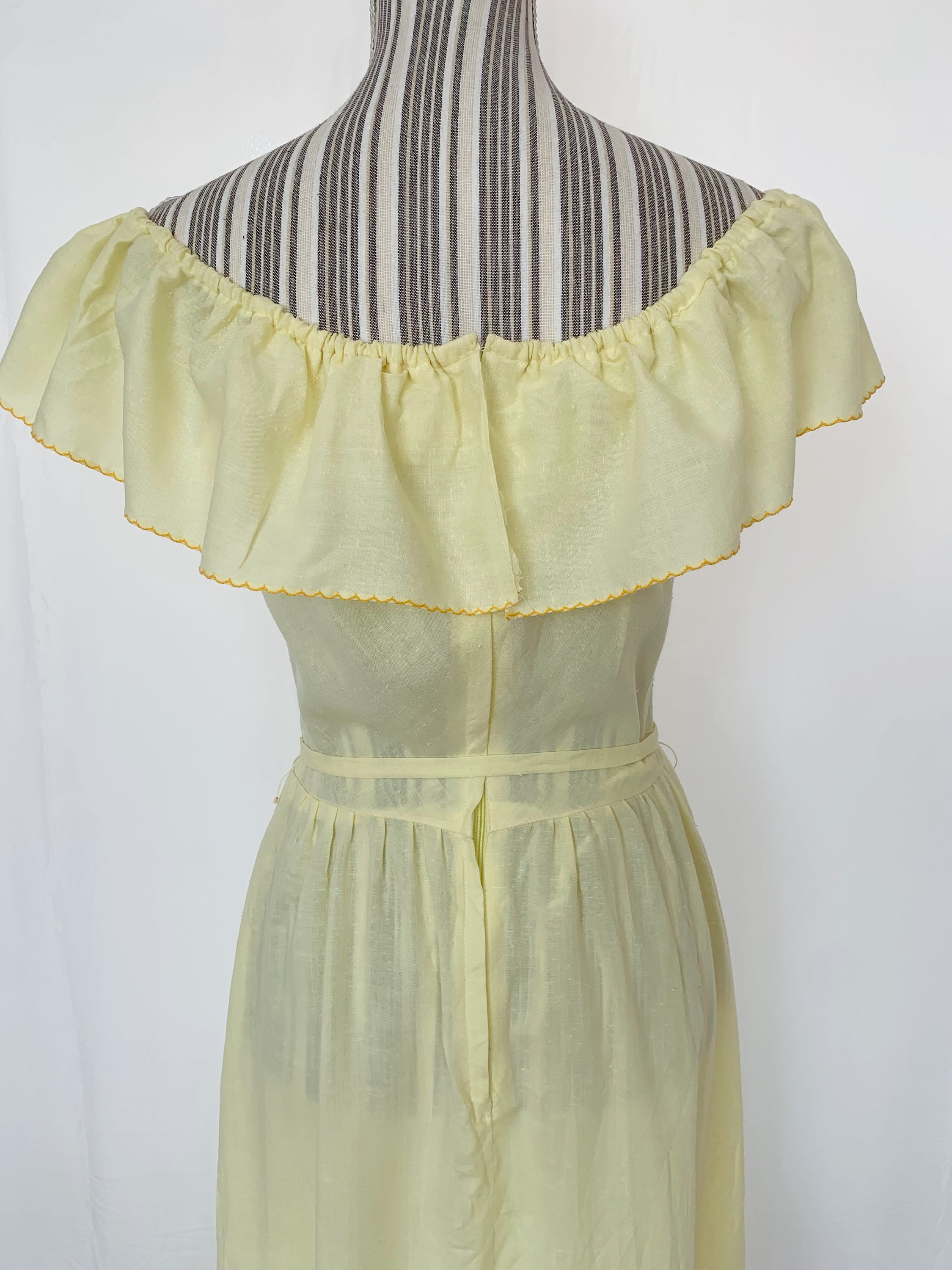 This is a beautiful vintage cotton semi sheer yellow maxi dress with off the shoulder neckline and detachable matching tie belt. This cute romantic summer day dress beautifully cinches your waist and flares at the bottom. This corragecore peasant dress is made of textured lightweight fabric which feels like cotton. It has no stretch. This bohemian 70s dress has back zip closure, so you can easily put it on and take it off.