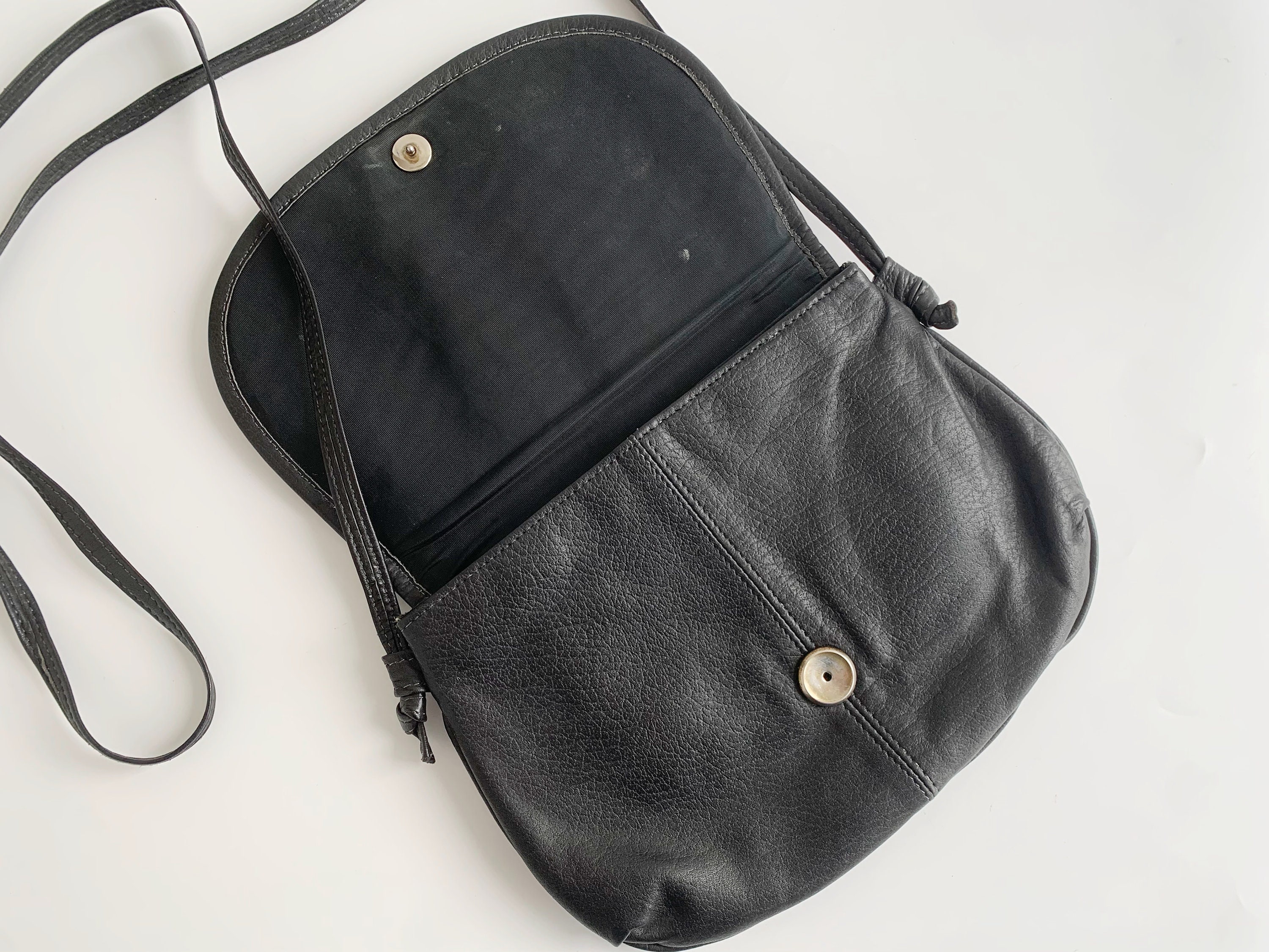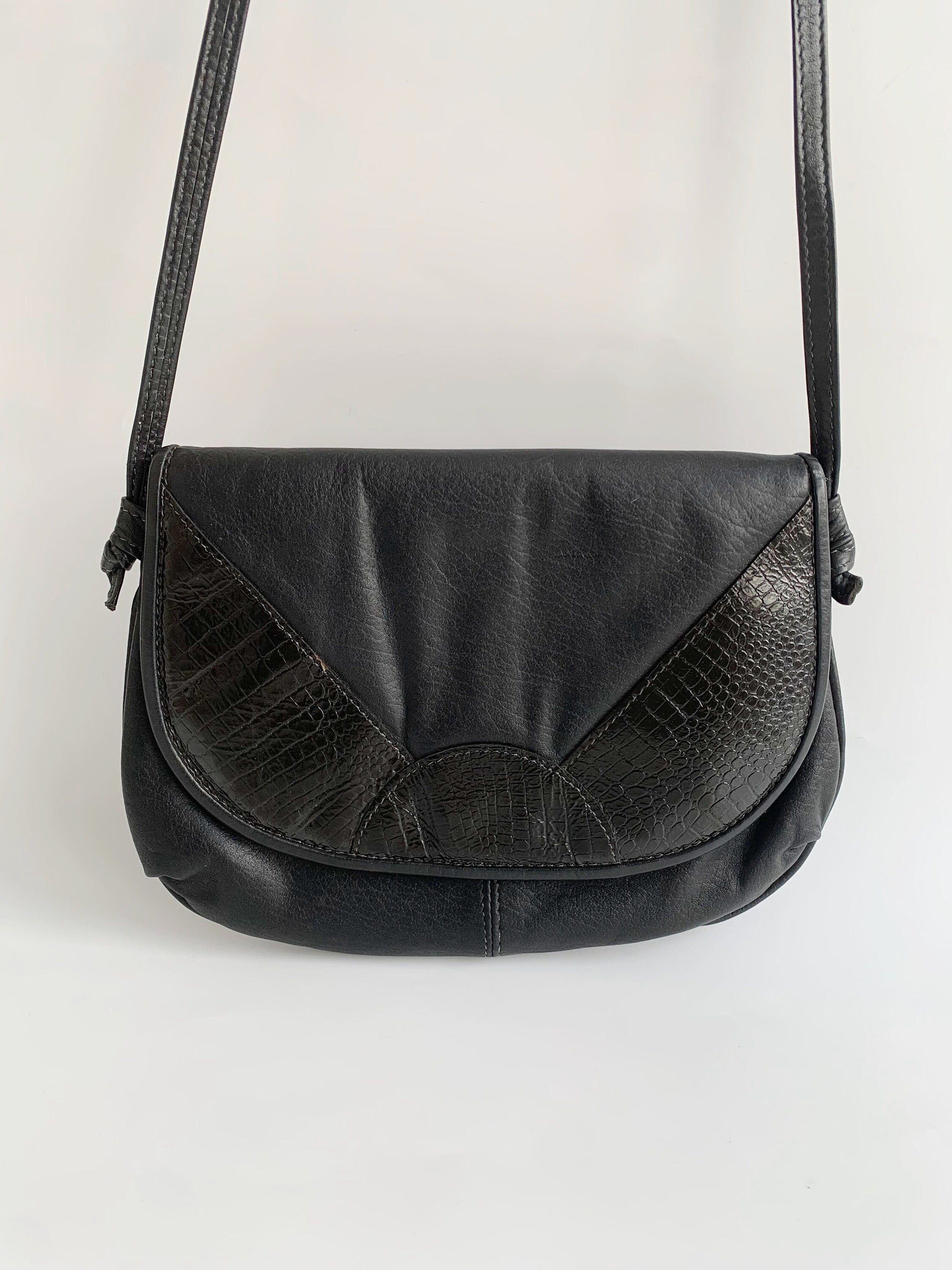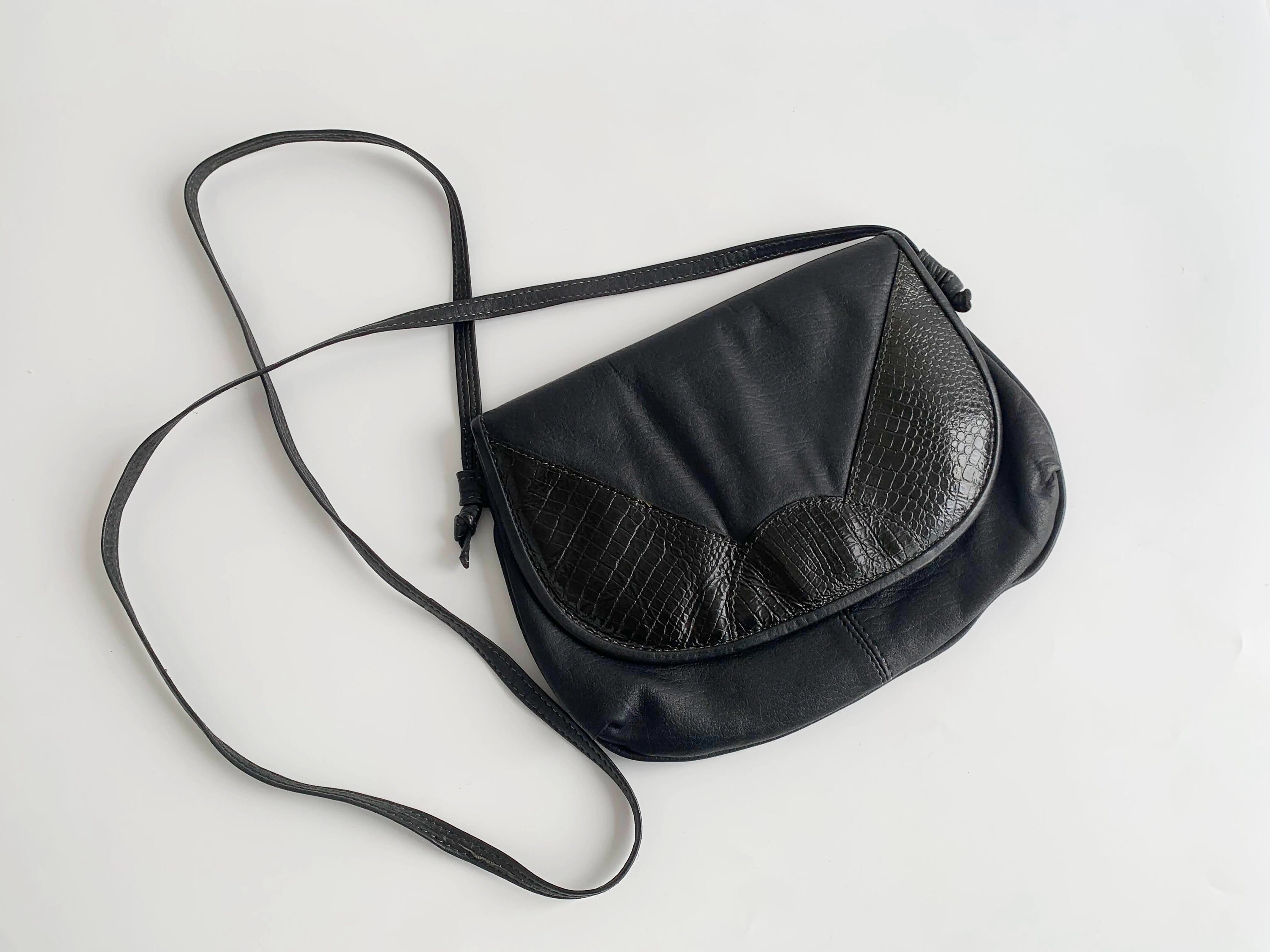 This is a vintage 80s cute and simple black leather crossbody purse. This black leather satchel has U shape and flap over click clasp closure. This small black soft leather satchel purse is made of soft genuine leather and reptile embossed patent leather. It has a slim shoulder strap which can be adjusted when you pull the slip strap and tie the knots so you can wear it as a shoulder or as a crossbody bag. There is one compartments with one slip pocket inside.