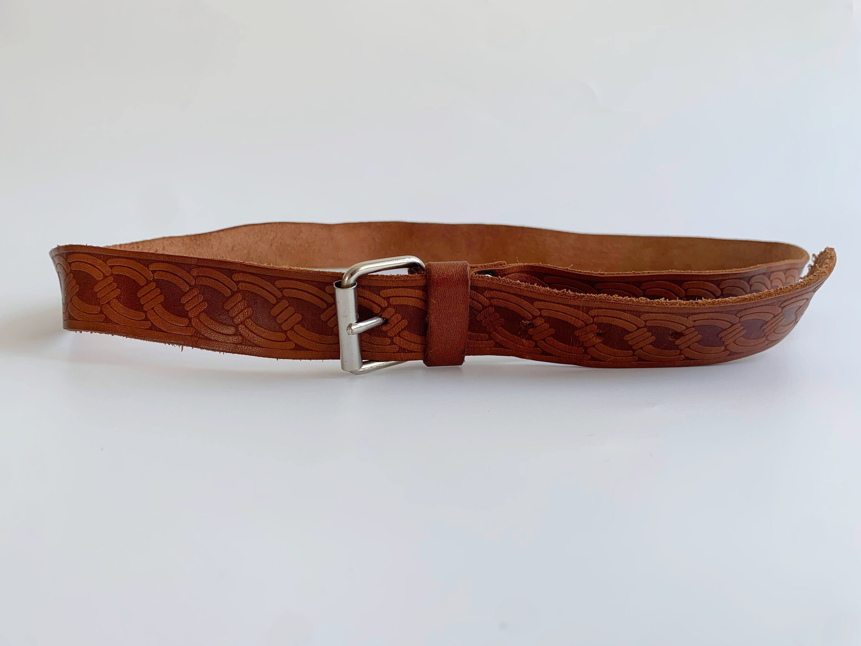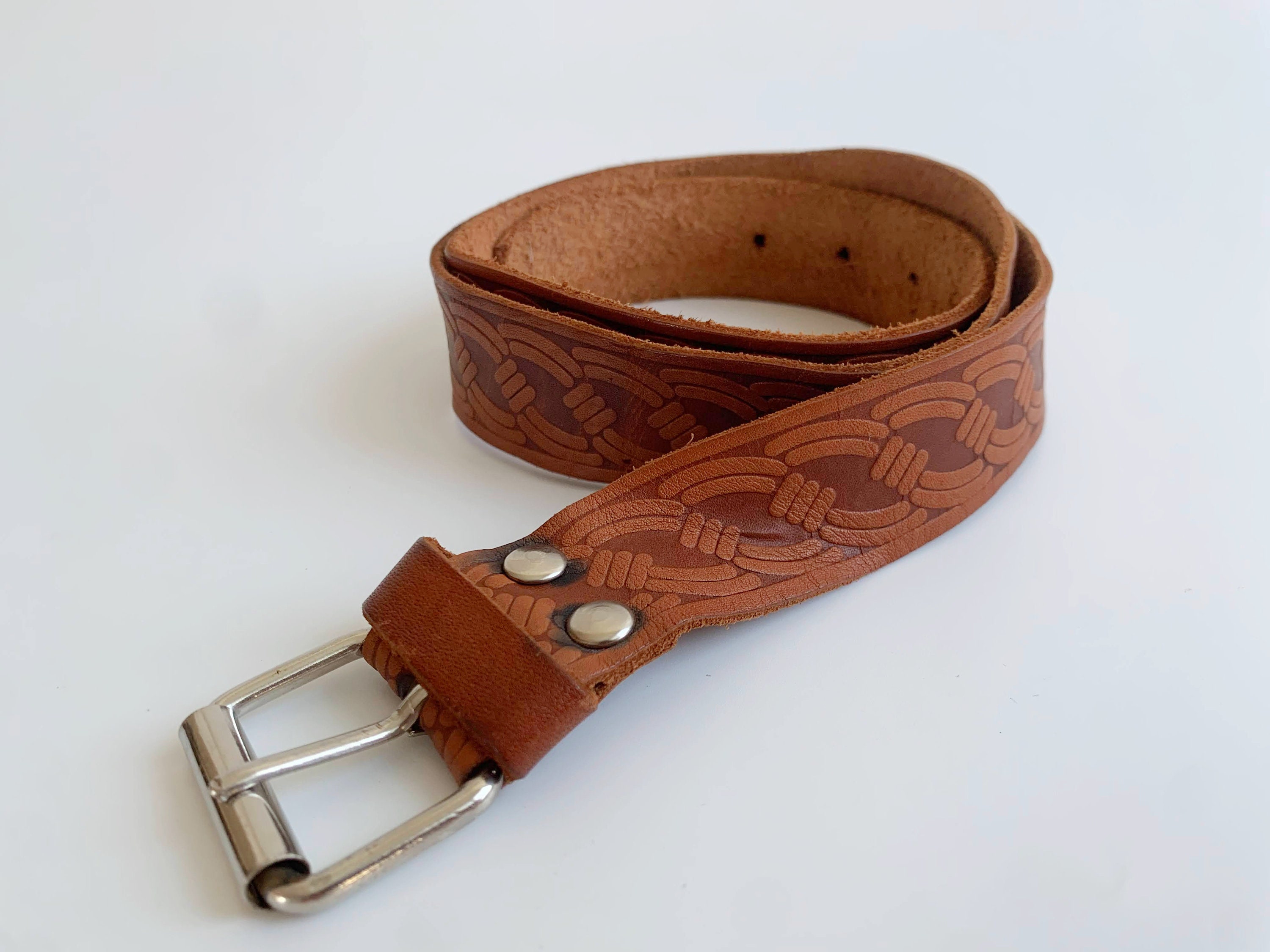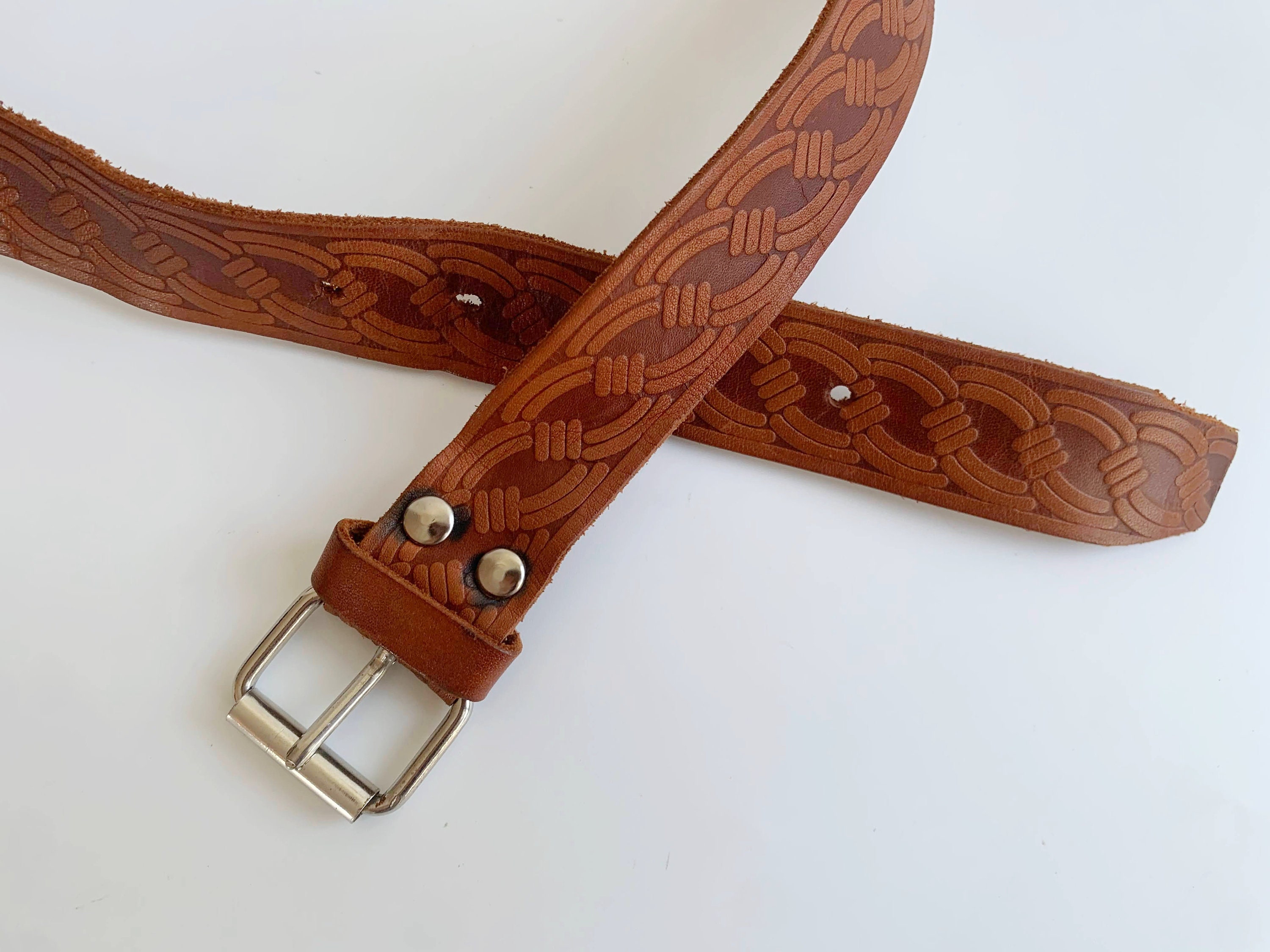 This is a vintage women's brown leather belt form the 70s with beautiful spiral tooled detailing. This skinny leather belt has a small silver tone buckle. It is beautifully carved with beautiful print which represents spirals or chains. This thin belt has a distressed look due to the wear. This slim waist belt is perfect to wear with dresses or turtlenecks.