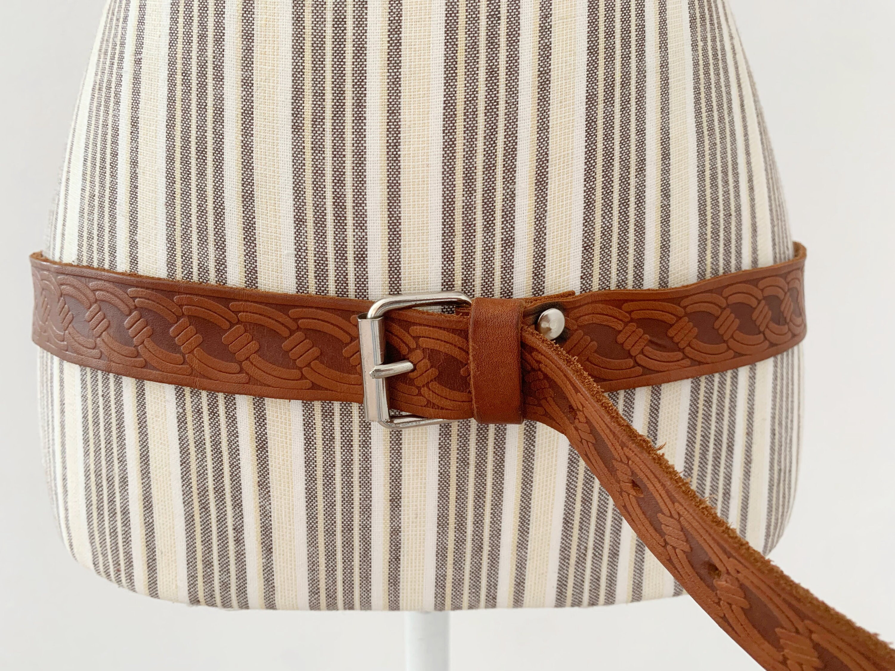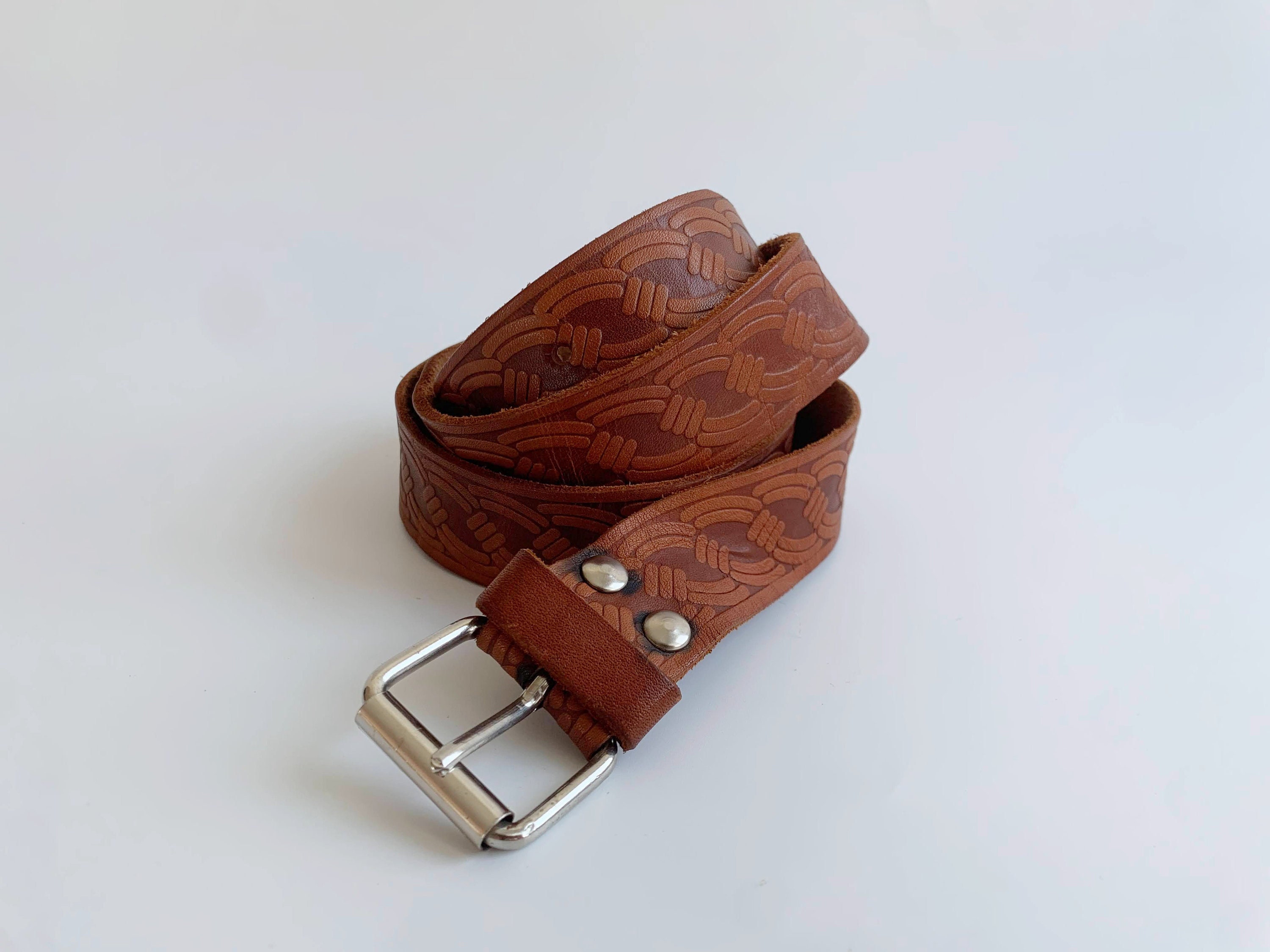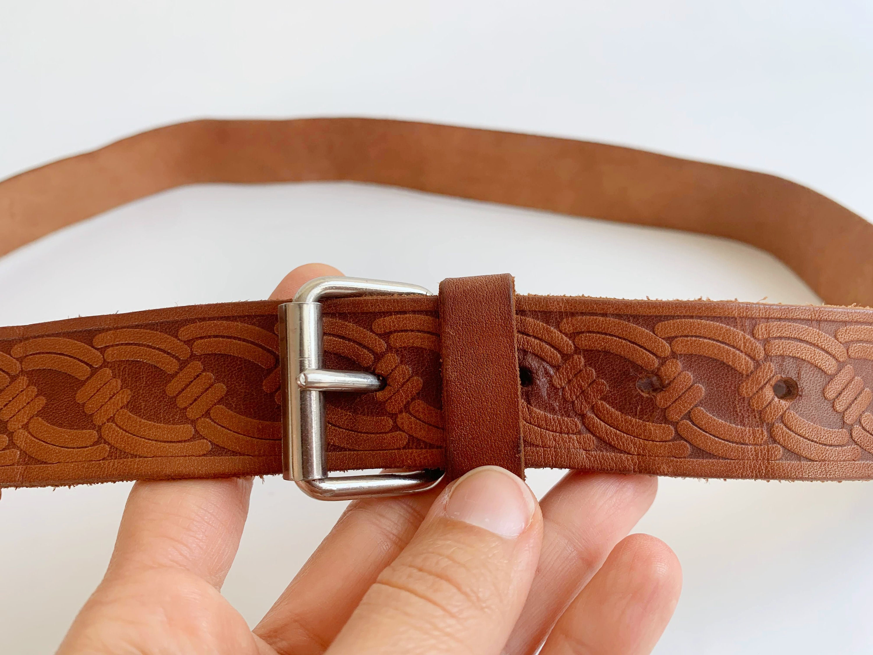 This is a vintage women's brown leather belt form the 70s with beautiful spiral tooled detailing. This skinny leather belt has a small silver tone buckle. It is beautifully carved with beautiful print which represents spirals or chains. This thin belt has a distressed look due to the wear. This slim waist belt is perfect to wear with dresses or turtlenecks.