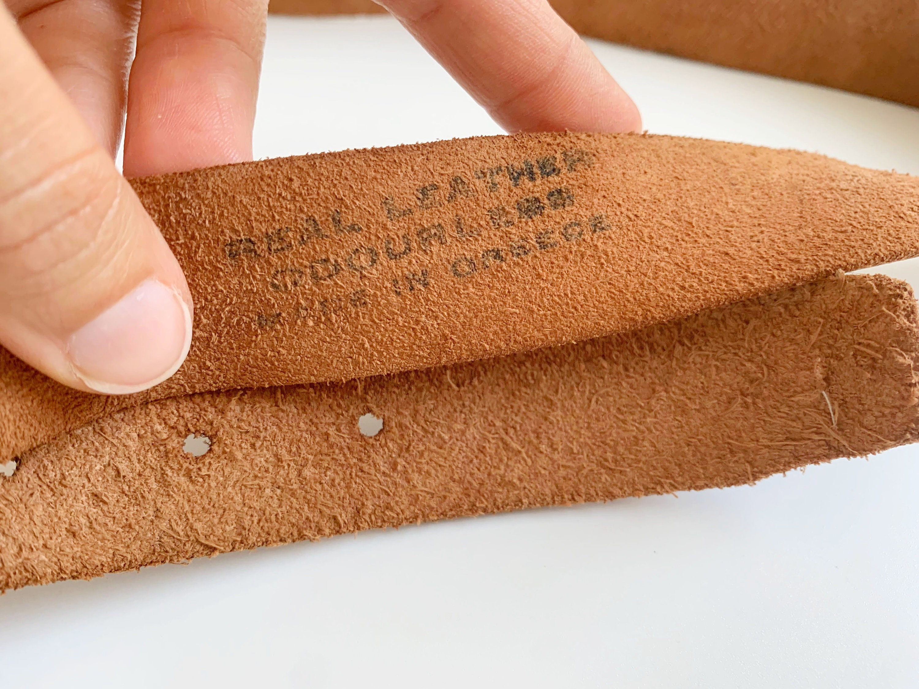 Condition: this brown leather belt was pre-loved and it has a distressed leather look . There are some scratches on the leather surface and some darkening around the edges