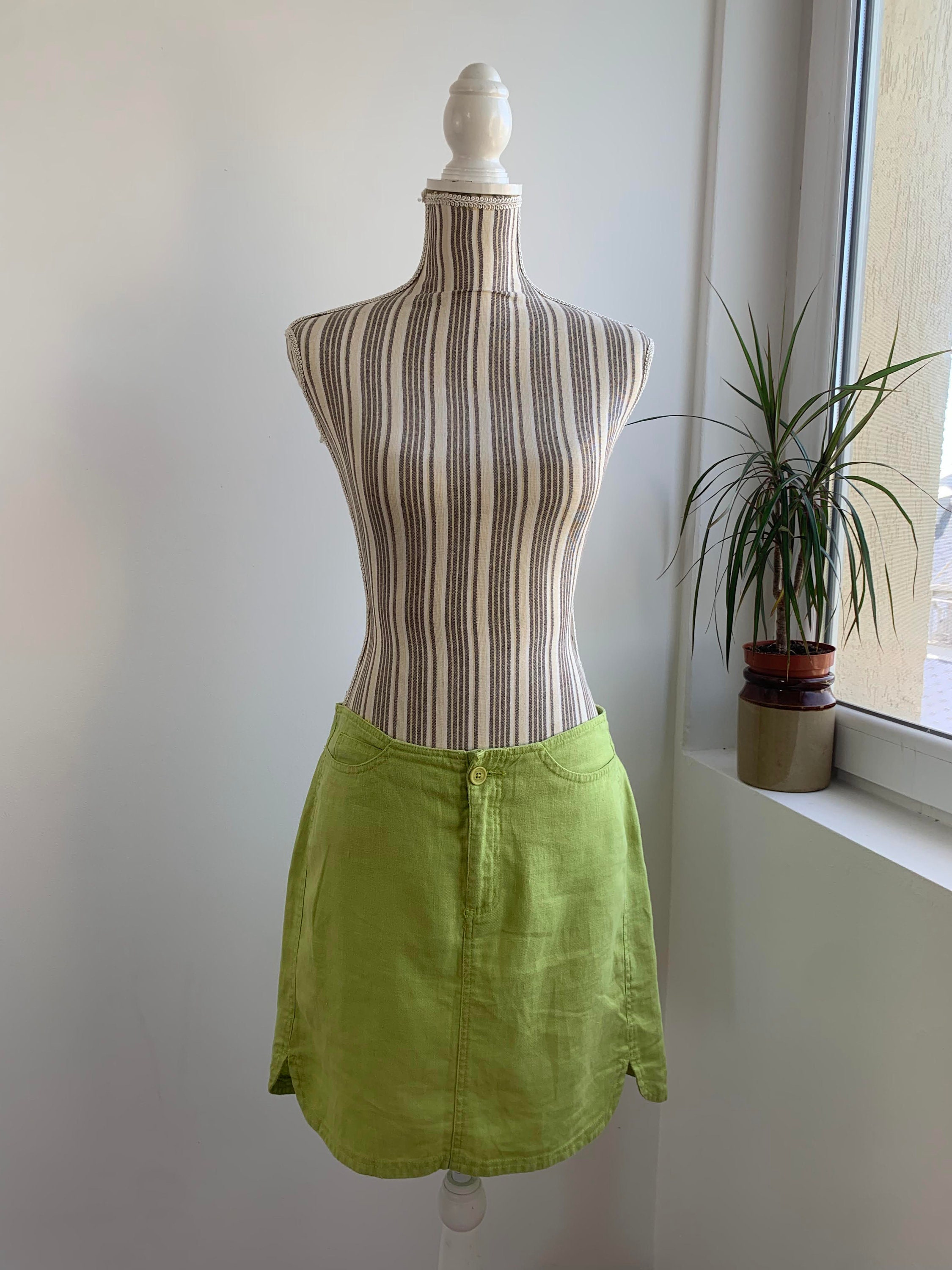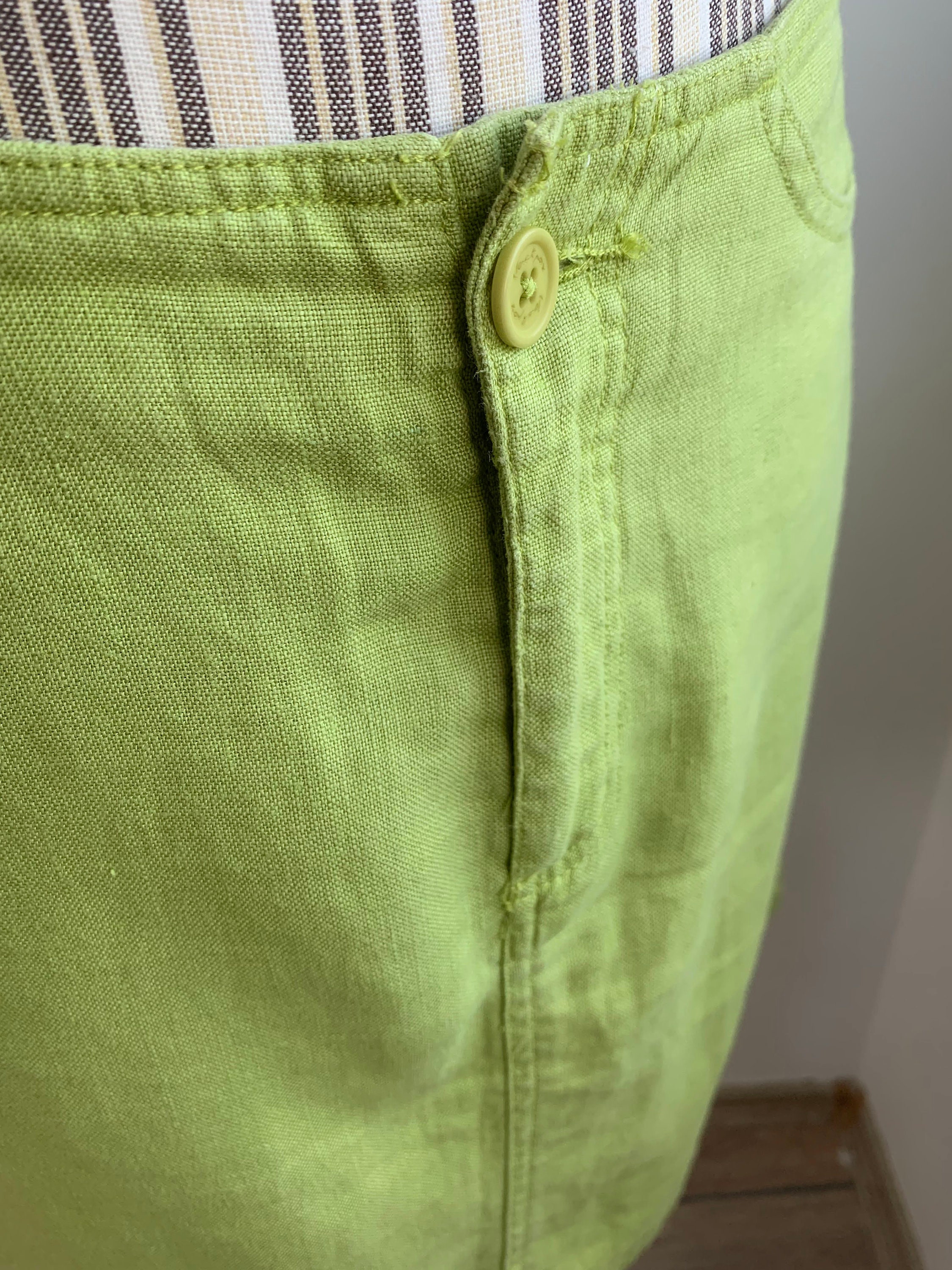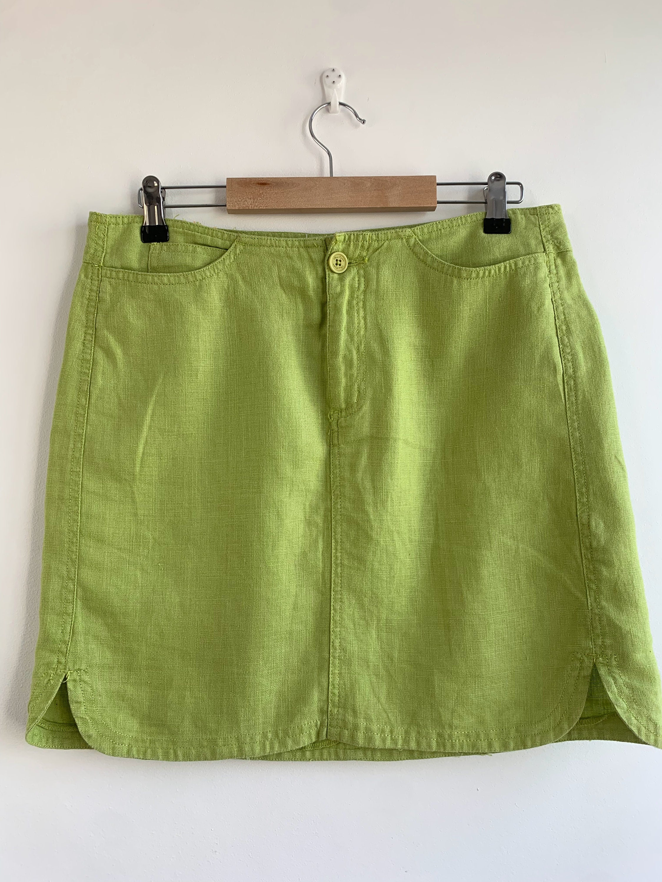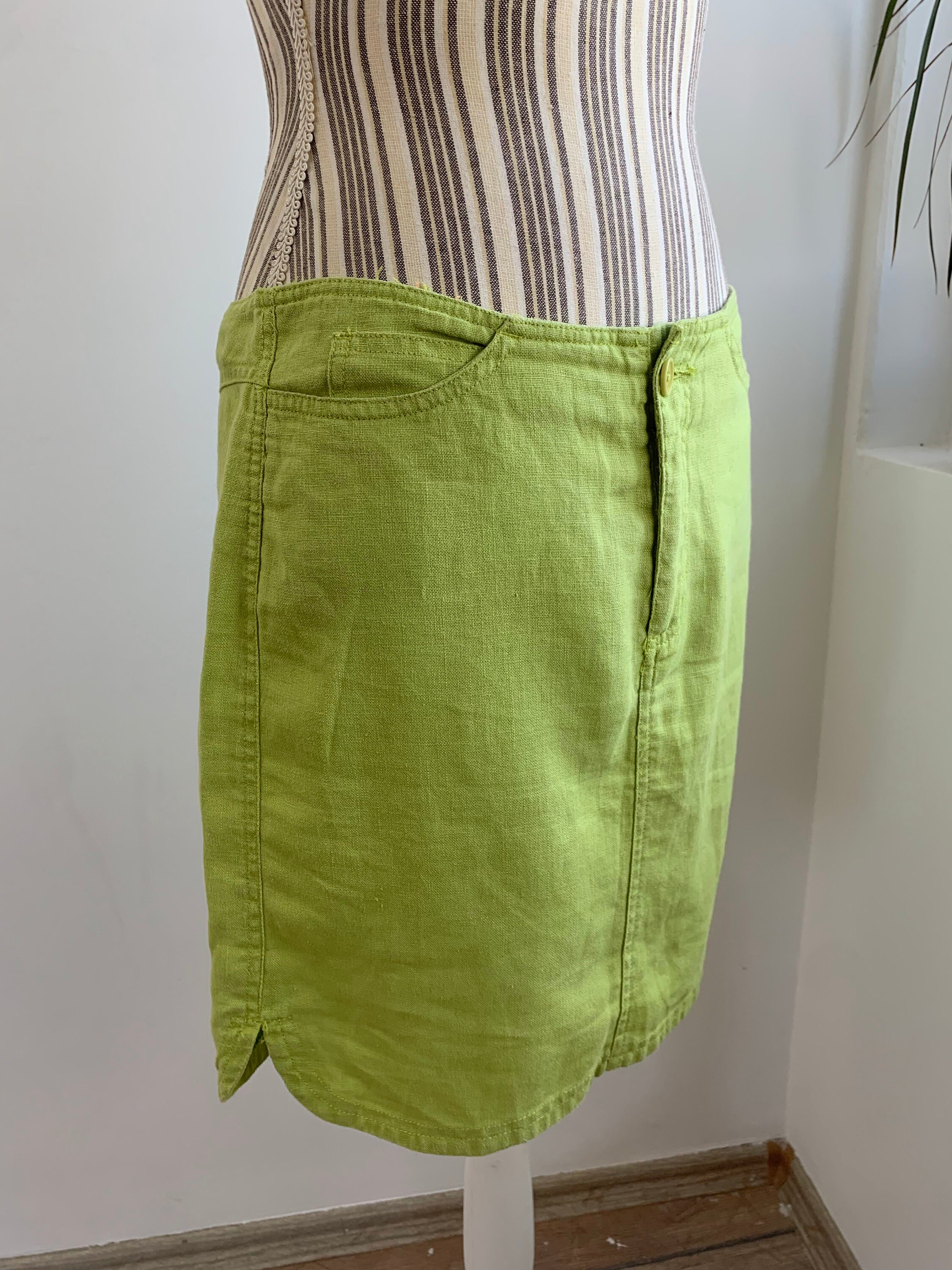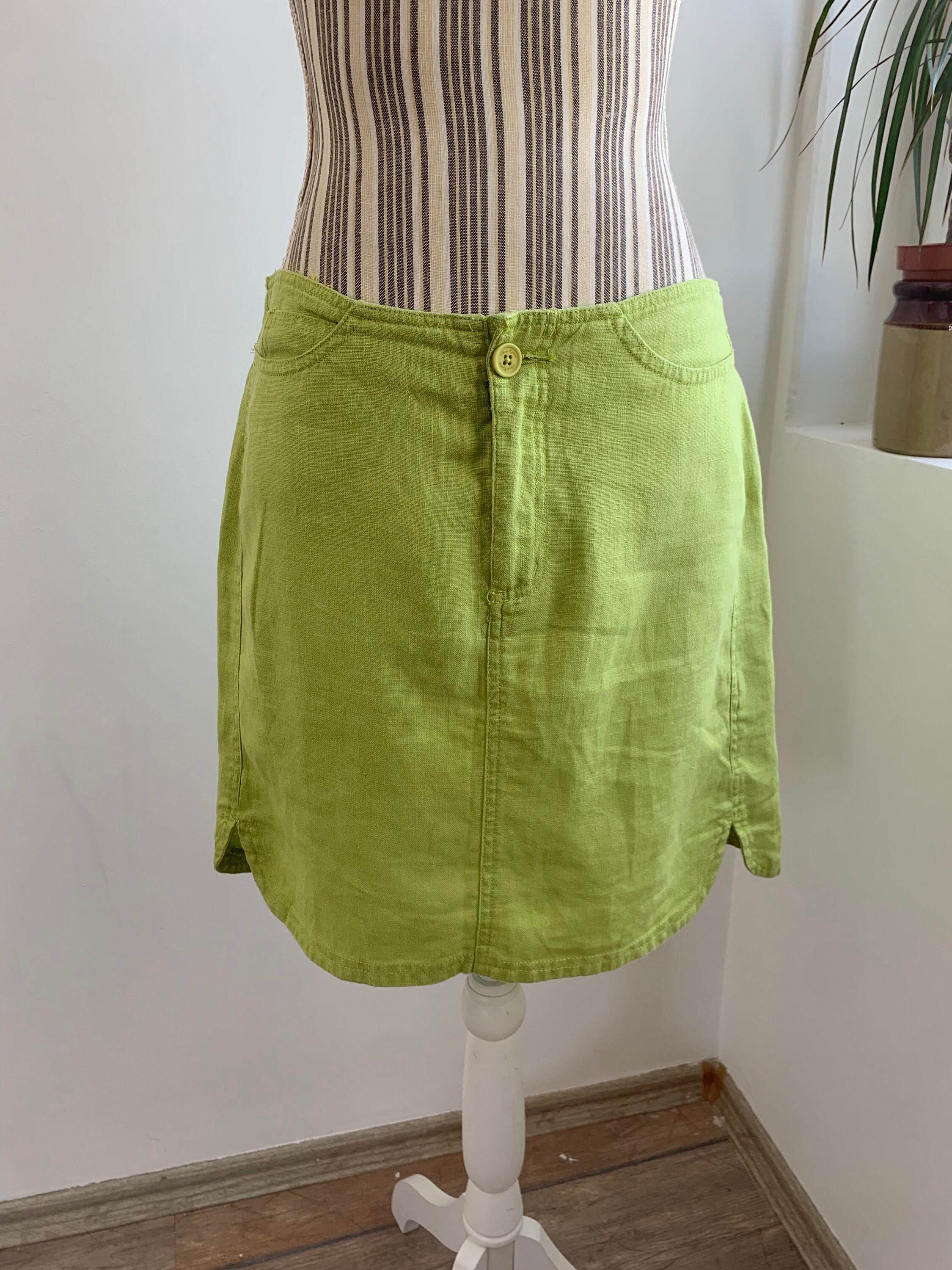 This is a casual pure linen mini skirt in rich lime green color with front pockets and front zipper and button closure. This simple short linen skirt is made of 100% linen fabric, it has no lining underneath. The size marked is 2, it firts like M/L. Please check the measurements below.
