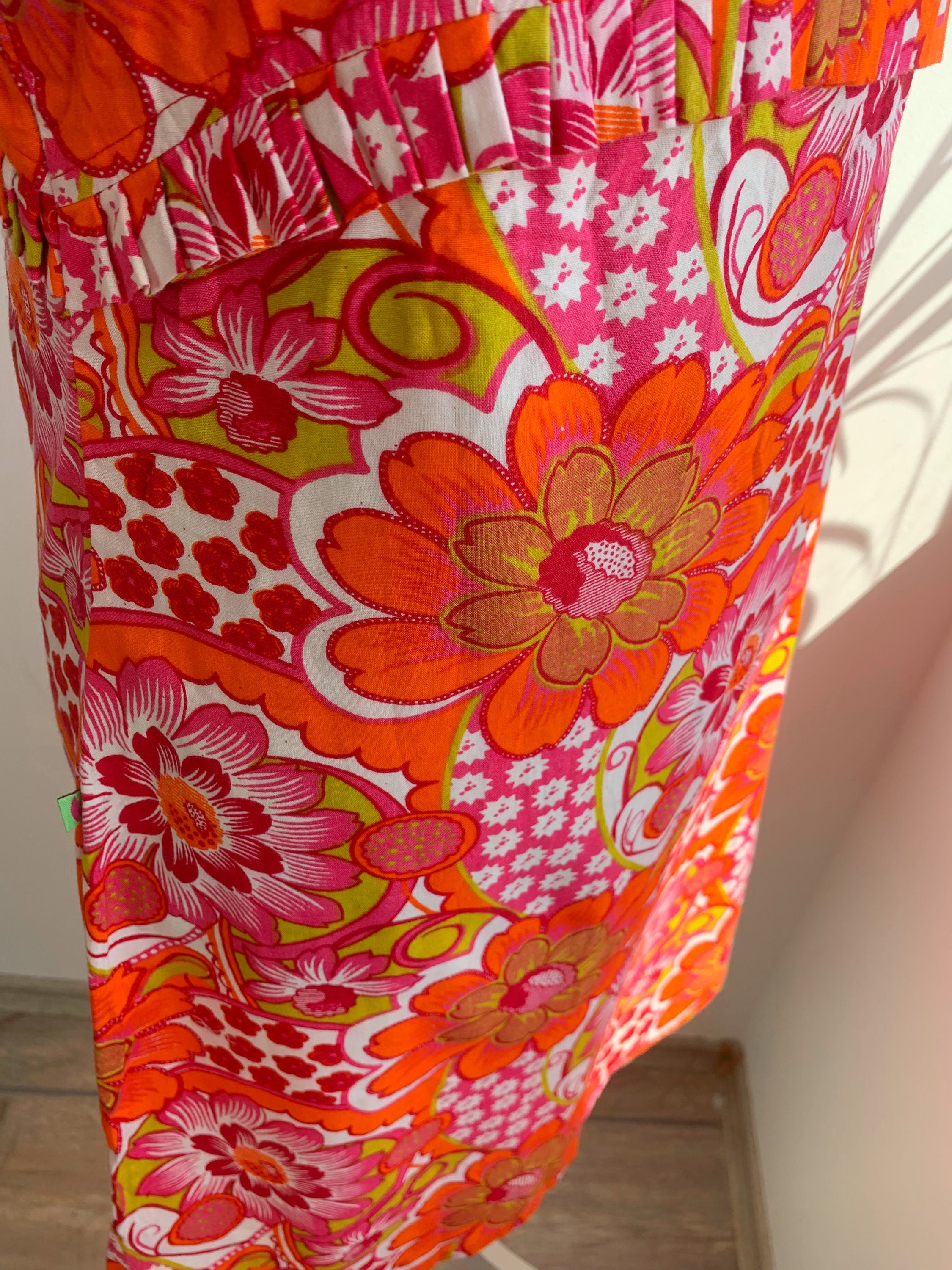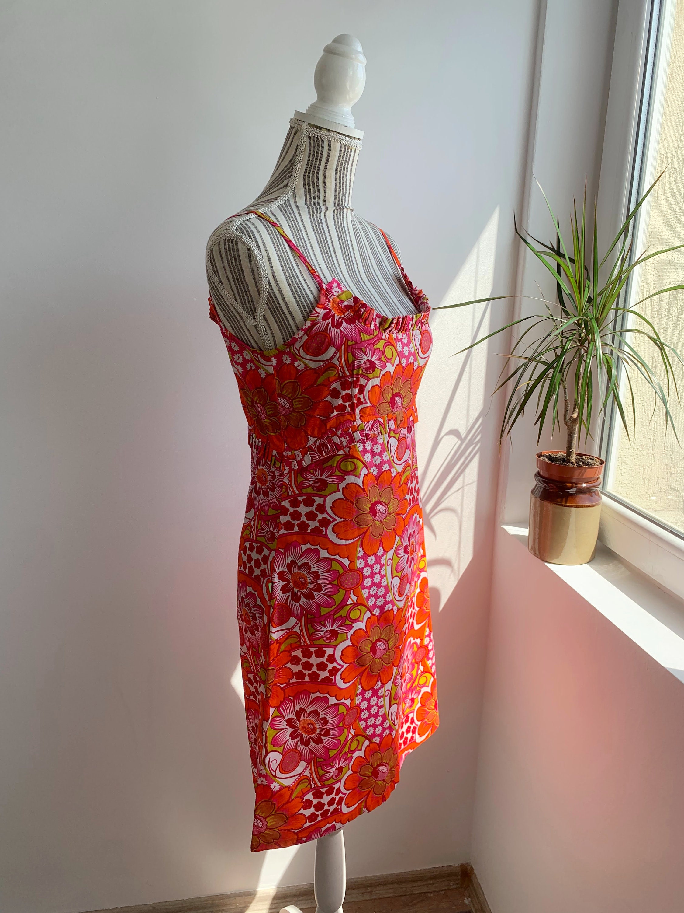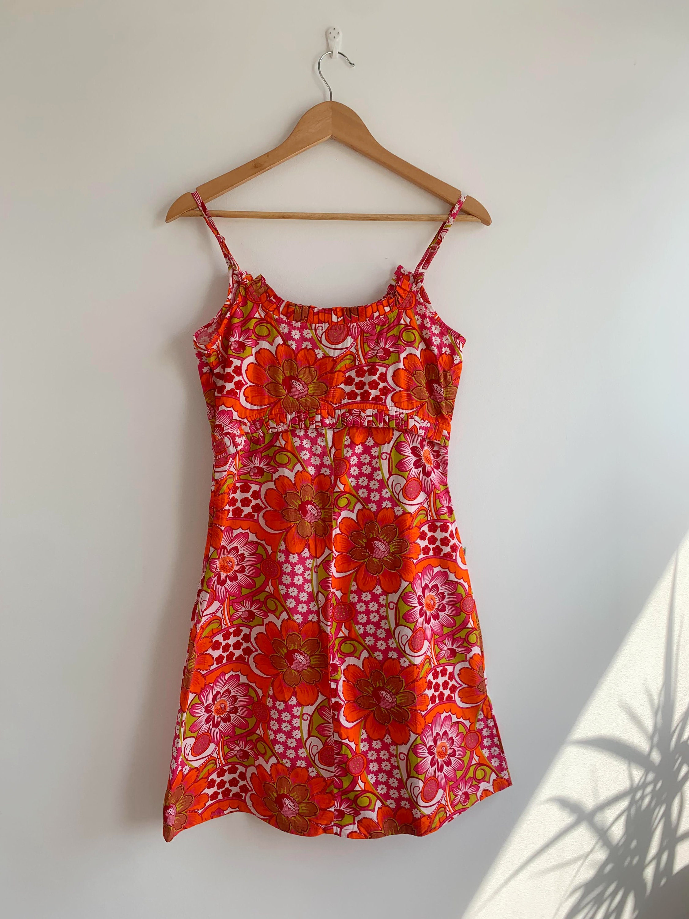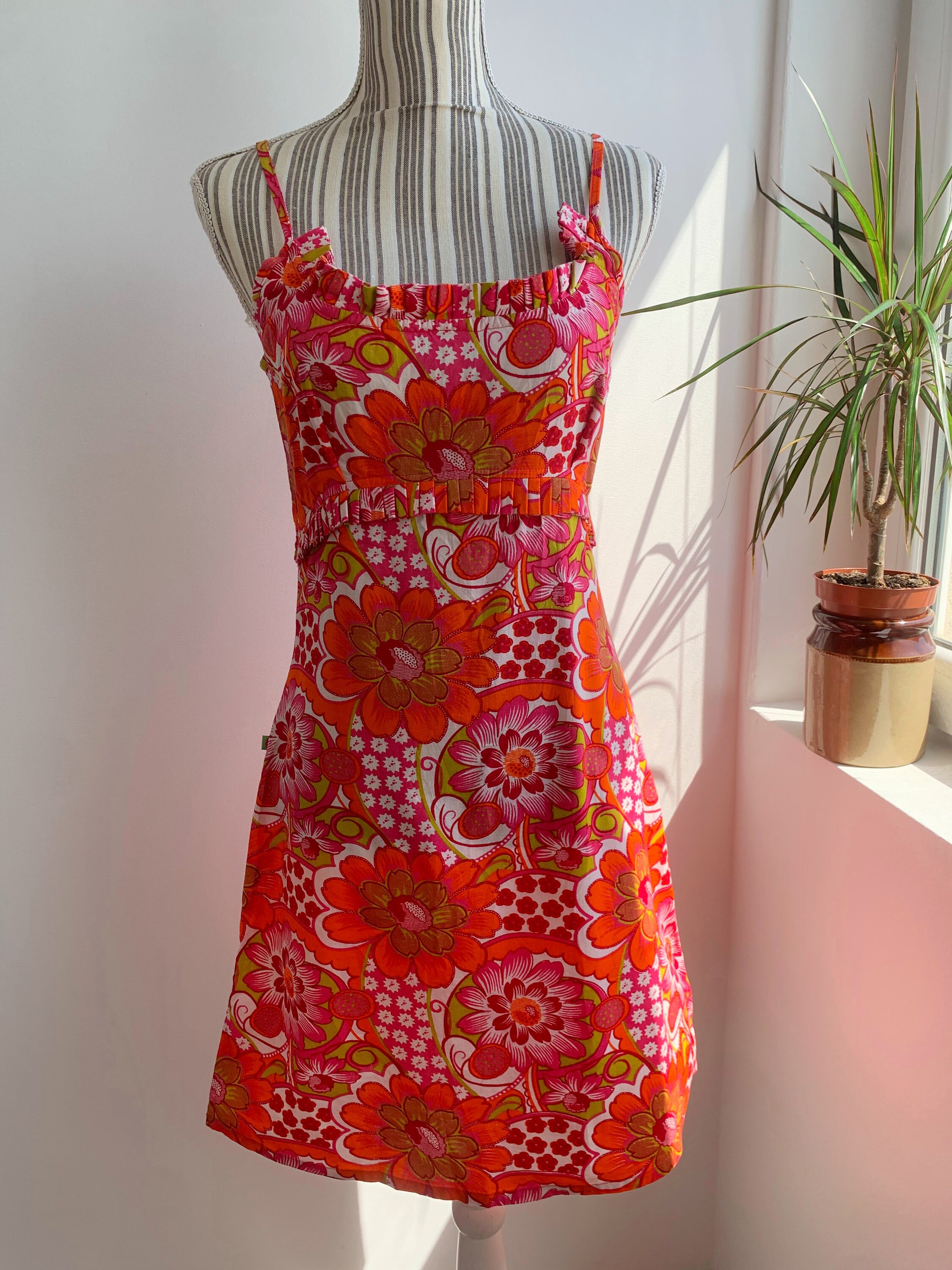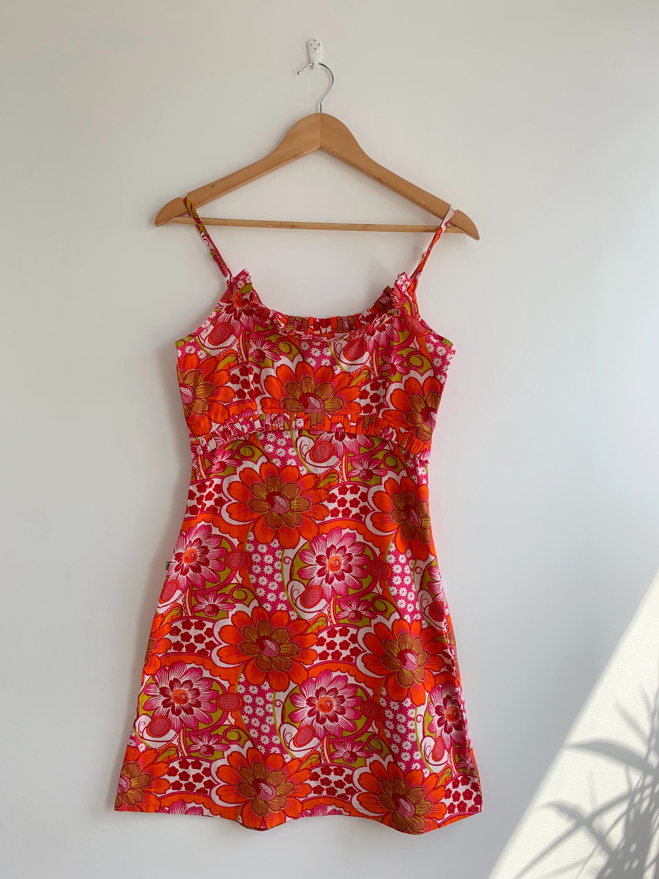 This is a beautiful floral sun dress with adjustable spaghetti straps and side zip closure. This pure cotton grunge dress has adorable ruffle detailing at the chest. It is the perfect garden party dress or beach outfit.
