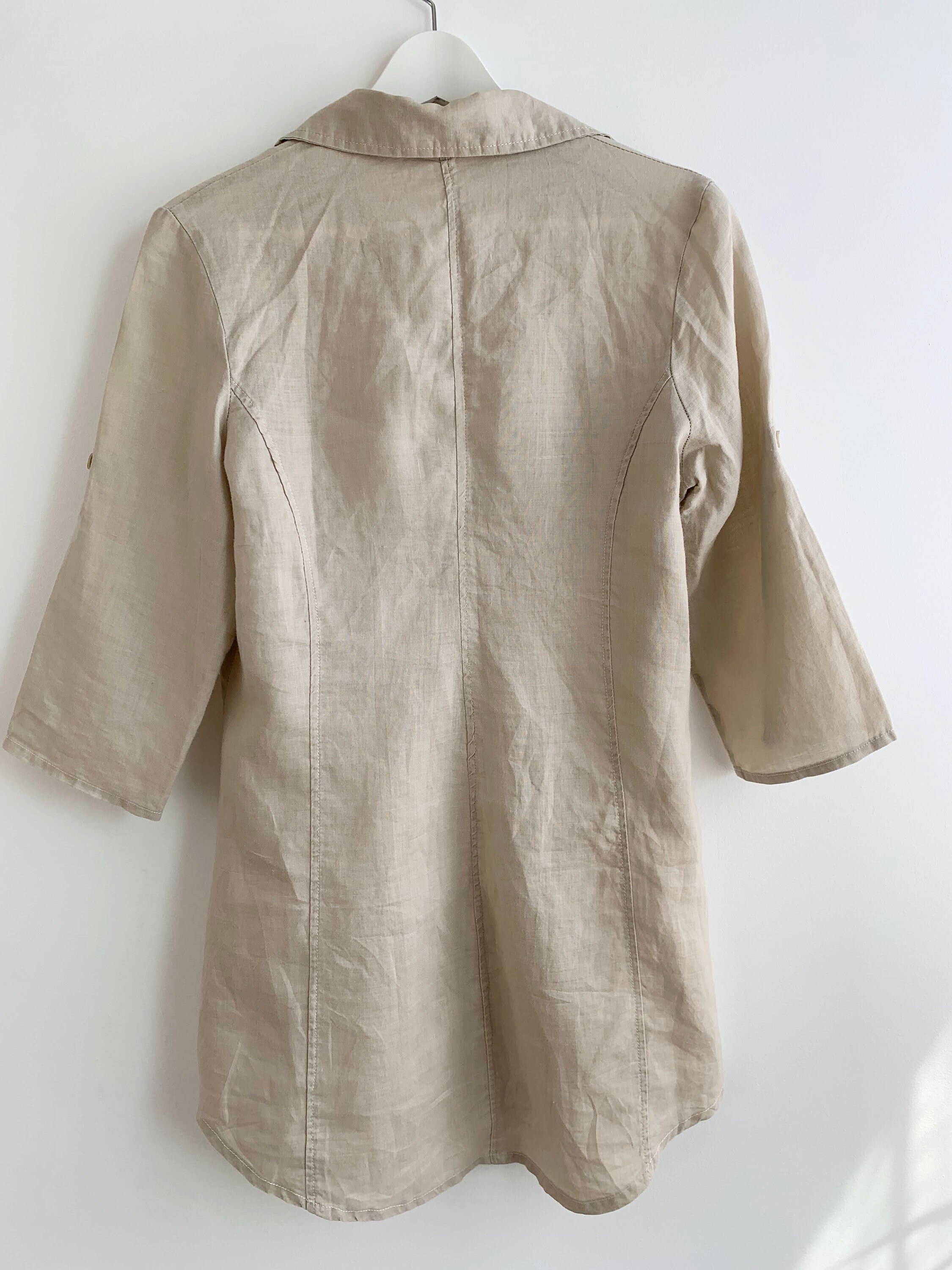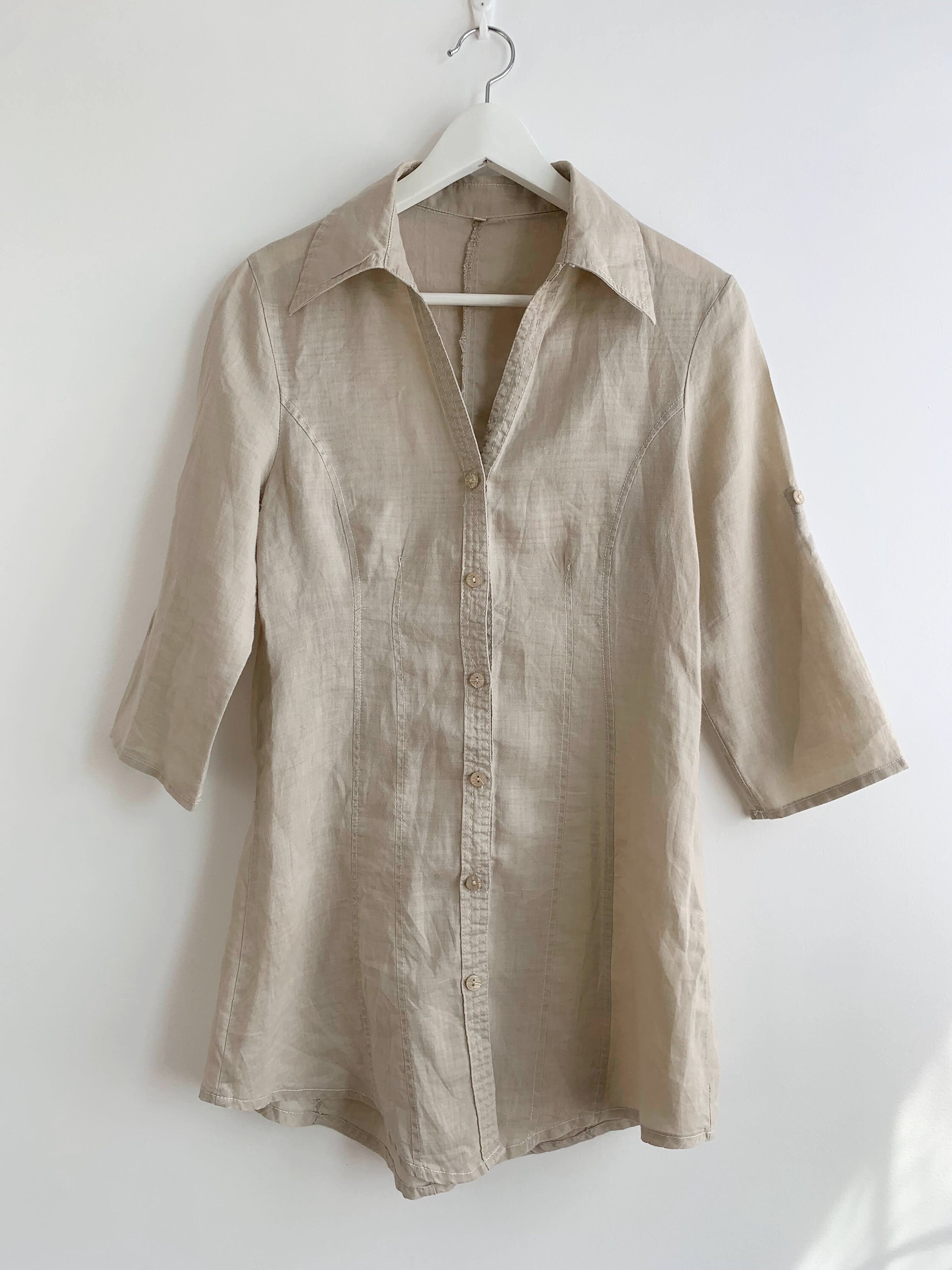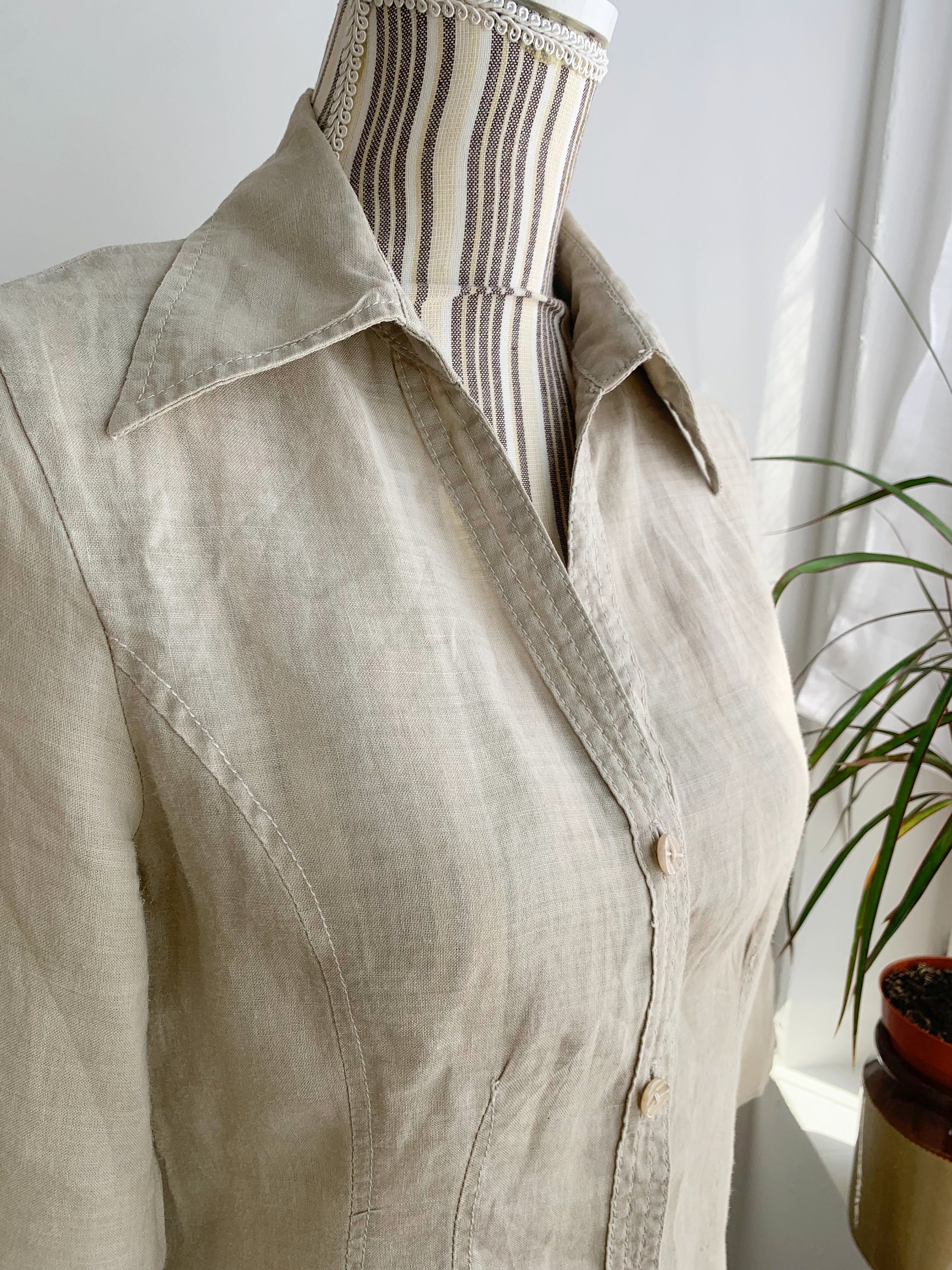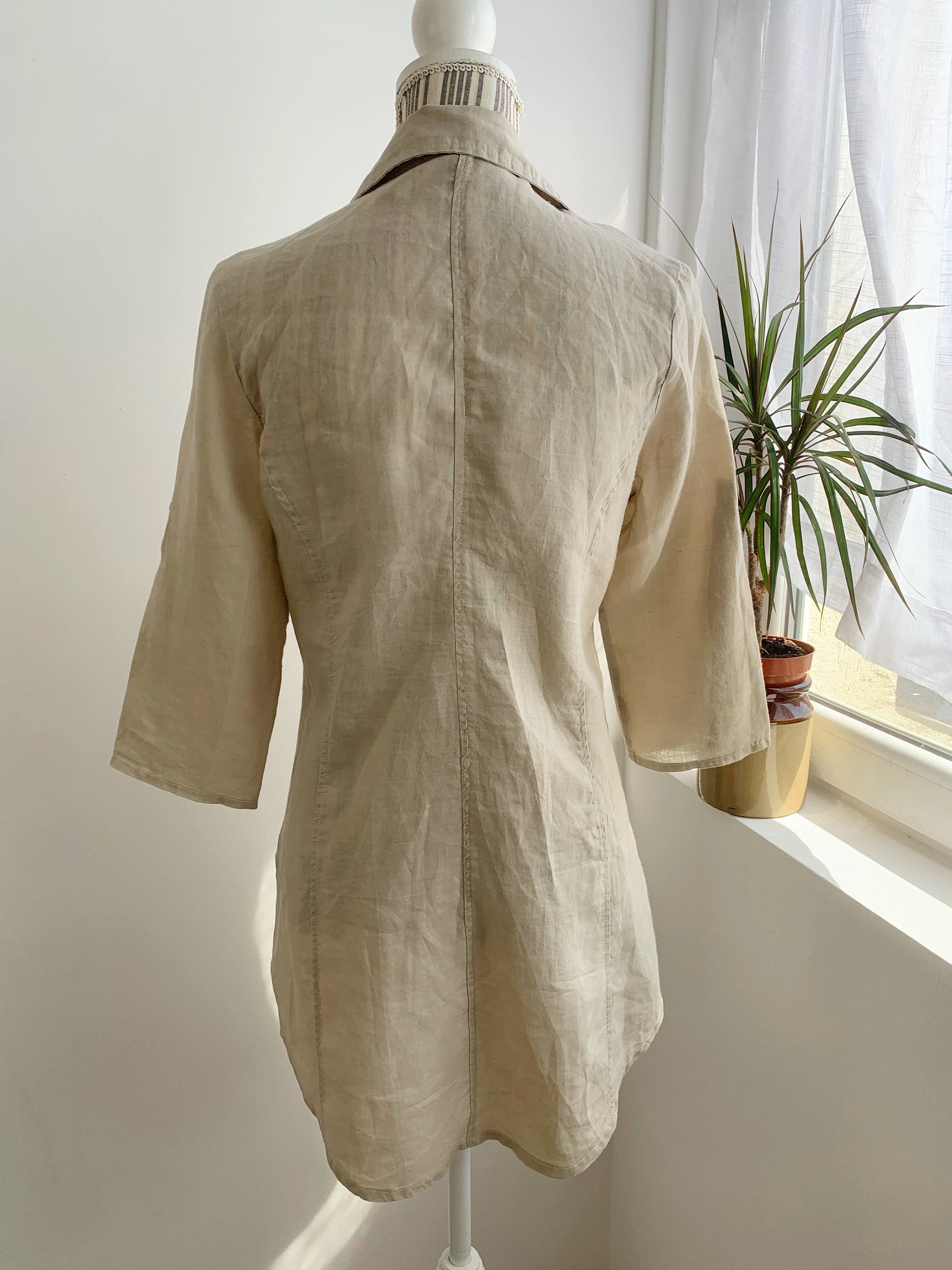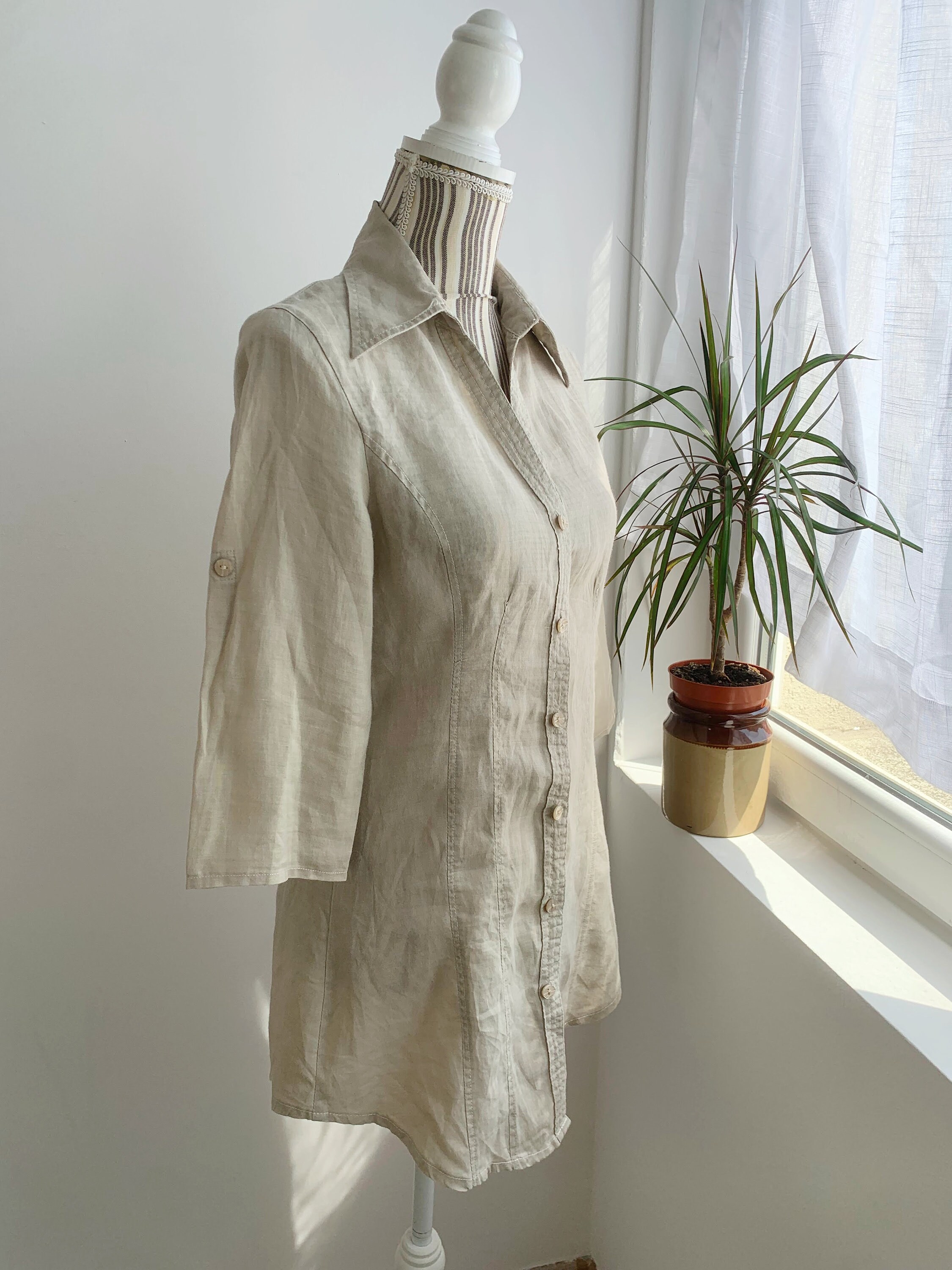 This beautiful vintage long beige linen shirt for women with button front closure and stylish collar. This summer linen mini shirt dress combines effortless-looking style with comfortable wear. This natural linen blouse has 3/4 sleeves. This collared button up linen top is crafted from beautiful semi sheer breathable, pure linen fabric with a fitted cut that flatters the figure and wrinkles beautifully every time it’s worn due to the natural texture of the pure linen fabric. This pure linen tunic is designed to take you from a day at the office to night out with friends, achieving timeless elegance without compromising comfort. The flattering shape and cutaway collar adds a pop of effortless elegance! Complete the classic look with capri pants or a relaxed linen shorts.