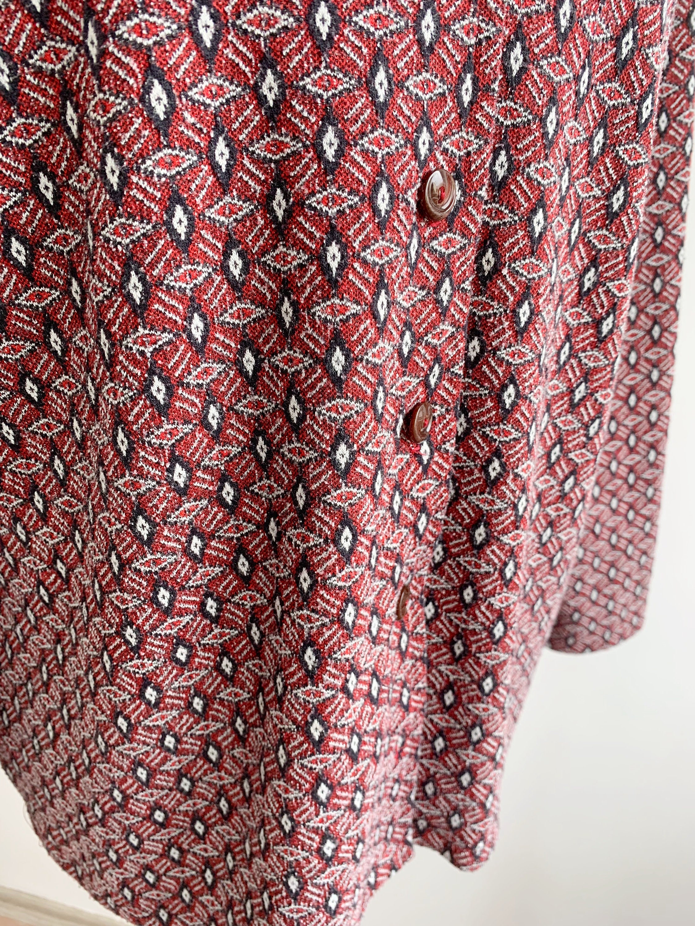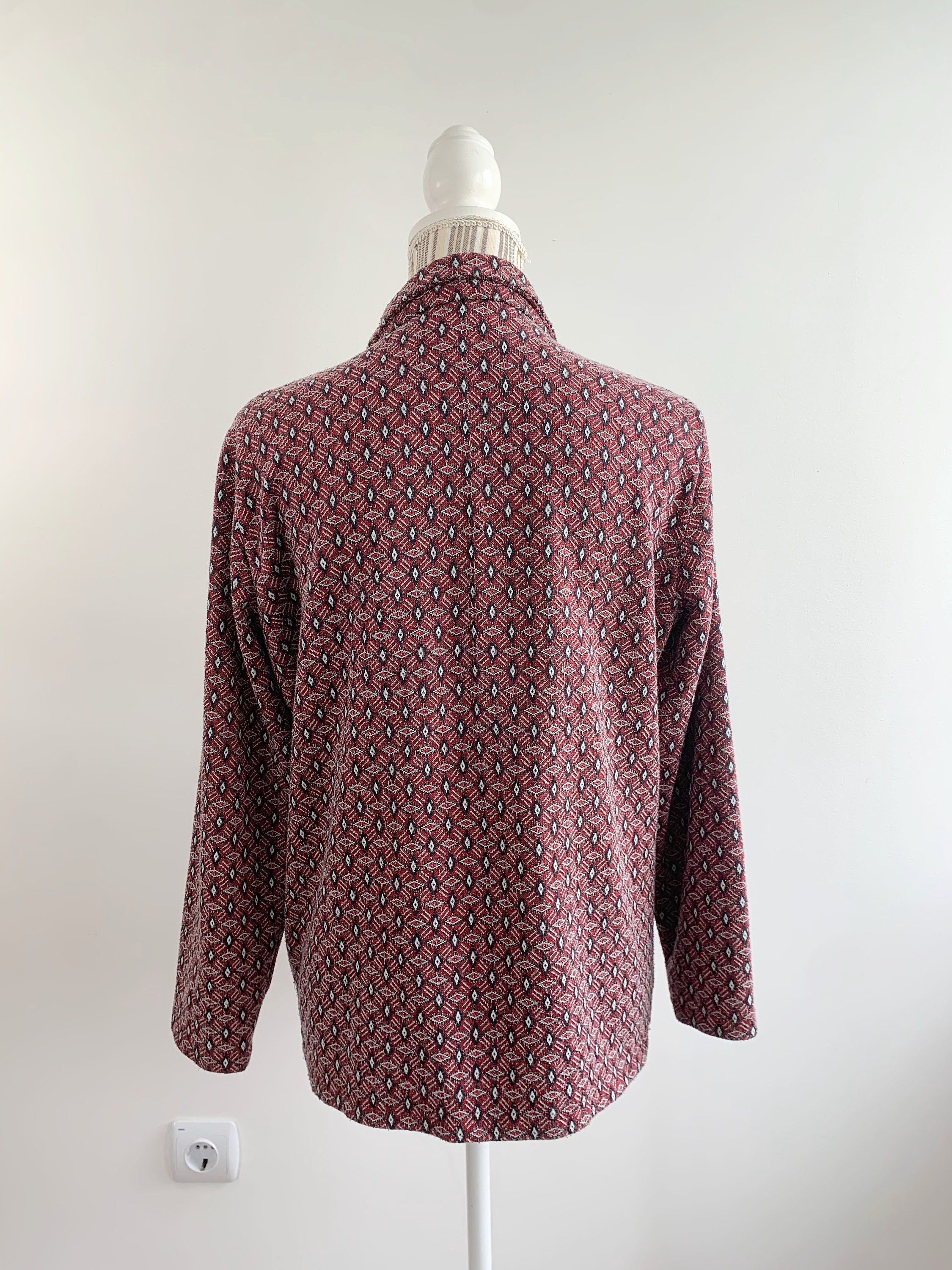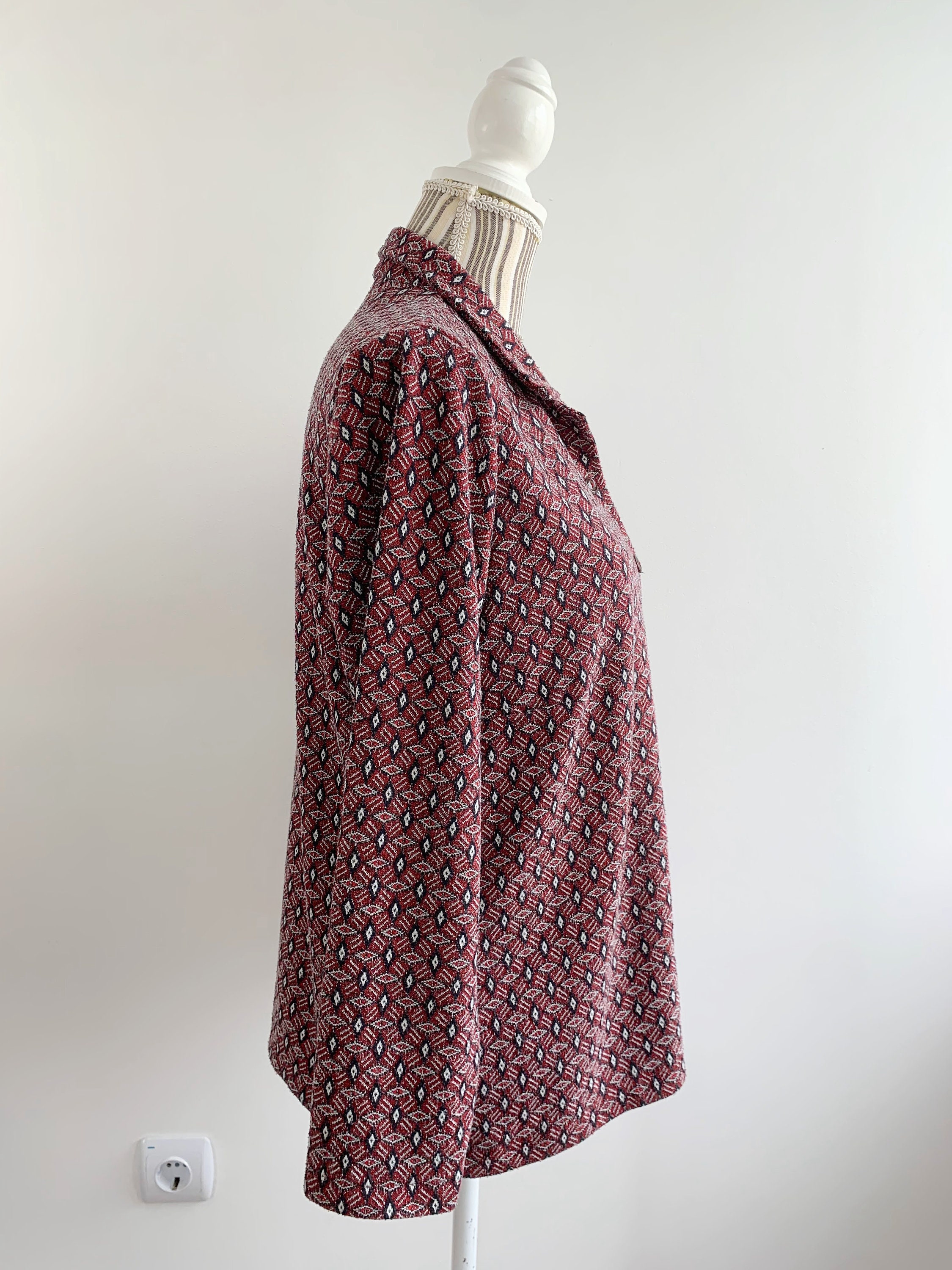 This is s vintage 70s burgundy red geometric tiny print collared button up shirt for women. This groovy seventies shirt is made of thick stretchy jersey fabric. It was handmade and it has no label. It fits like size L. Please check the measurements below.